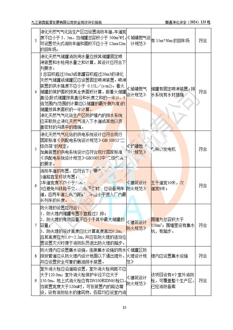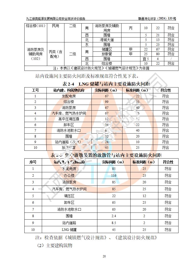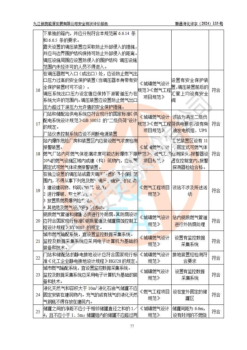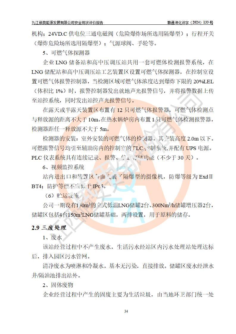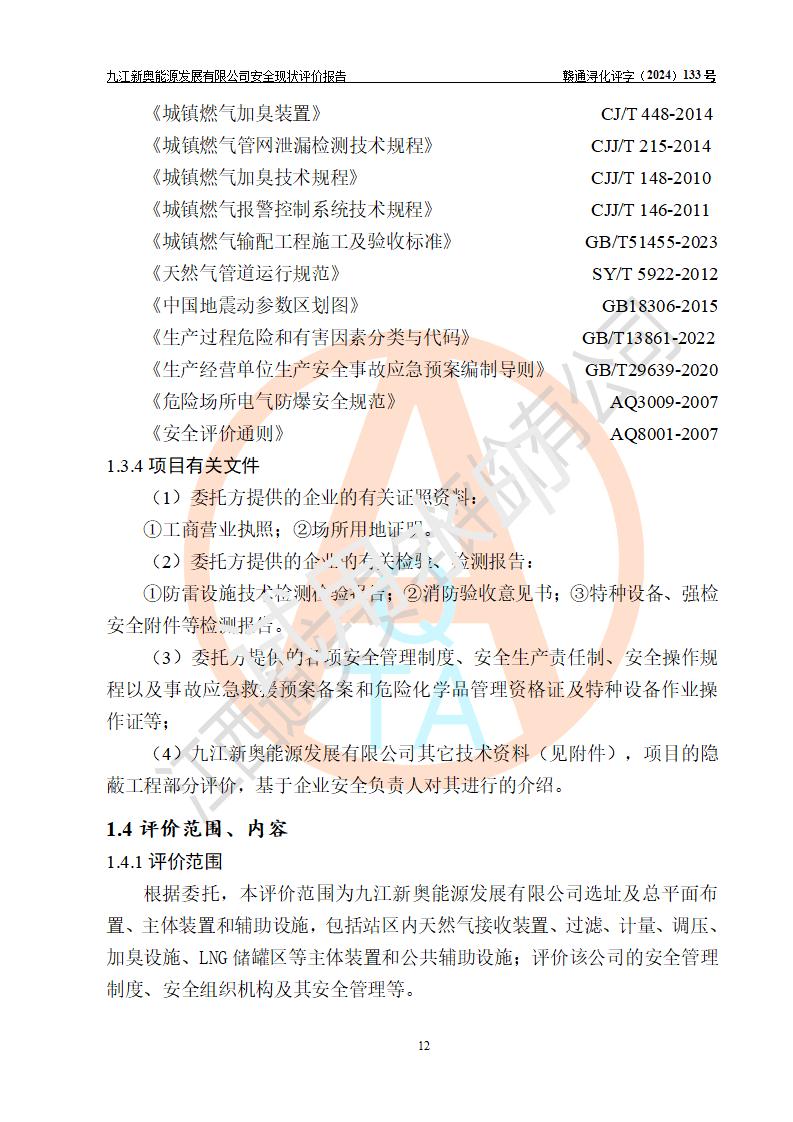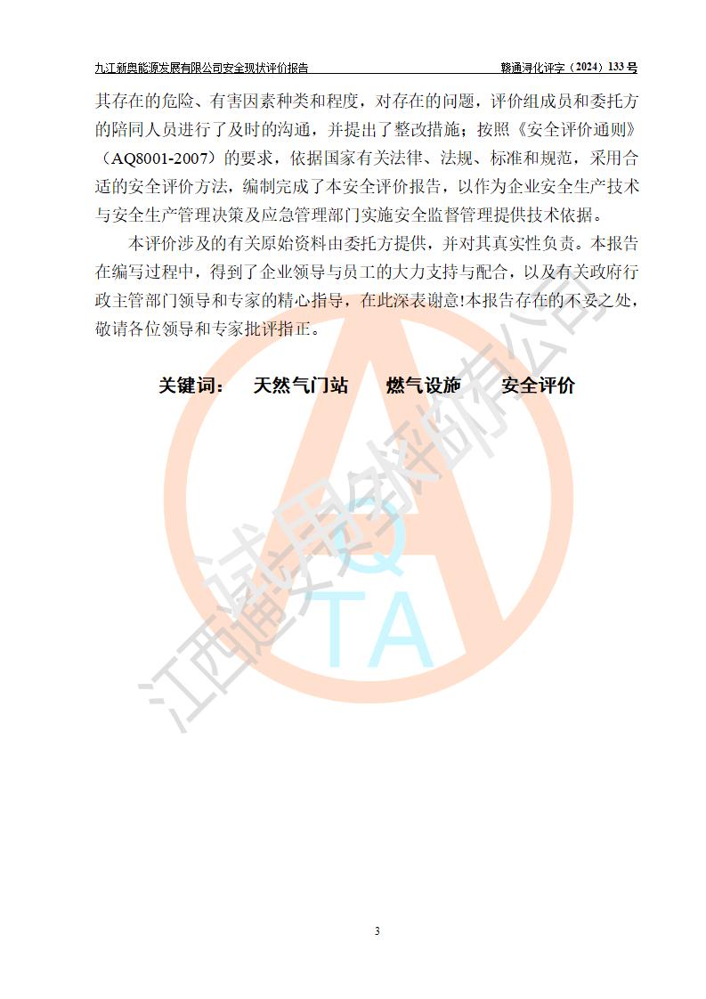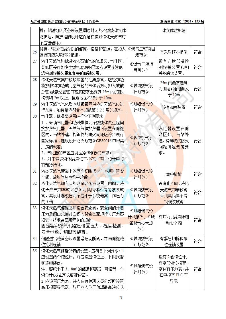 项目简介 | 九江新奥能源发展有限公司,成立于2017年12月6日,位于江西省九江市九江经济技术开发区城西港区港城大道189号,注册资金10000万元,法人**苏莉,属有限责任公司(台港澳法人独资)。经营范围:燃气供应、电力供应、蒸汽供应;分布式能源及新能源利用设施建设及运营管理;燃气管网的建设、供热管网的建设、配电网的建设、运营管理;管网燃气的工程设计及安装;合同能源管理;系能源技术开发、技术咨询、技术**、技术服务;商务信息咨询;能源管理数据库系统开发、管理;机电设备、暖道设备及其他能源利用设备的销售、租赁、技术服务(依法须经批准的项目,经相关部门批准后方可开展经营活动)。 公司在城西港港城大道建设有九江市城西港区泛能站(一期)项目,设有LNG储配站和高中压调压站合建站,LNG储备站作为应急调峰气源,上游门站管输天然气作为气源。高中压调压站建设规模:供气量7672.58万Nm3/年,高峰小时流量1.2×104Nm3/h;LNG气化站规模:总储量2×150m3。 该站2020年完成竣工验收,近三年以来,现场主要工艺装置、安全设施未发生过变化,无设计变更情况发生。 该站在供应天然气过程中,涉及的天然气、四氢噻吩、氮气(压缩的)均属于危险化学品;另外,发电机涉及的柴油也属于危险化学品;涉及的液化天然气属于**重点监管的危险化学品和特别管控危险化学品,不涉及剧毒化学品、高毒物品、易制毒化学品、监控化学品、易制爆化学品。该站LNG储罐区构成四级危险化学品重大危险源。 根据《中华人民共和国安全生产法》以及《城镇燃气管理条例》第四十一条规定,燃气经营者应当建立健全燃气安全评估和风险管理体系,按《九江市燃气管理办法》(**令21号)规定,燃气生产经营单位应当对本单位的燃气设施每三年进行一次安全评价。为此,九江新奥能源发展有限公司委托江西通安安全评价有限公司承担该公司的安全现状评价。 江西通安安全评价有限公司接受委托后,组成了评价小组,于2024年11月进行了现场勘察,对九江新奥能源发展有限公司LNG储配站和高中压调压站合建站的燃气设施的安全条件及安全管理进行了充分的了解,查找了其存在的危险、有害因素种类和程度,对存在的问题,评价组成员和委托方的陪同人员进行了及时的沟通,并提出了整改措施;按照《安全评价通则》(AQ8001-2007)的要求,依据**有关法律、法规、标准和规范,采用合适的安全评价方法,编制完成了本安全评价报告,以作为企业安全生产技术与安全生产管理决策及应急管理部门实施安全监督管理提供技术依据。 本次安全评价范围为:九江新奥能源发展有限公司选址及总平面布置、主体装置和辅助设施,包括站区内天然气接收装置、过滤、计量、调压、加臭设施、LNG储罐区等主体装置和公共辅助设施;评价该公司的安全管理制度、安全组织机构及其安全管理等。 九江新奥能源发展有限公司上、下游的管道及管道输送工程不在评价范围内;项目配套的行政、生活设施除总体布局外,不在评价范围内。本站LNG气化后向用户输送的中压管道及站区外的天然气管网以及站外天然气运输不在本评估范围内。 本评价引用到的**、消防方面的法规标准与安全评价有**的关联,本评价涉及的环境保护与消防评价内容,不****和消防主管部门的意见,环境保护与消防应以其主管部门检查的意见为准;自然灾害方面不包括在本评价范围内,只对涉及部分做一般性评述。 | ||||||