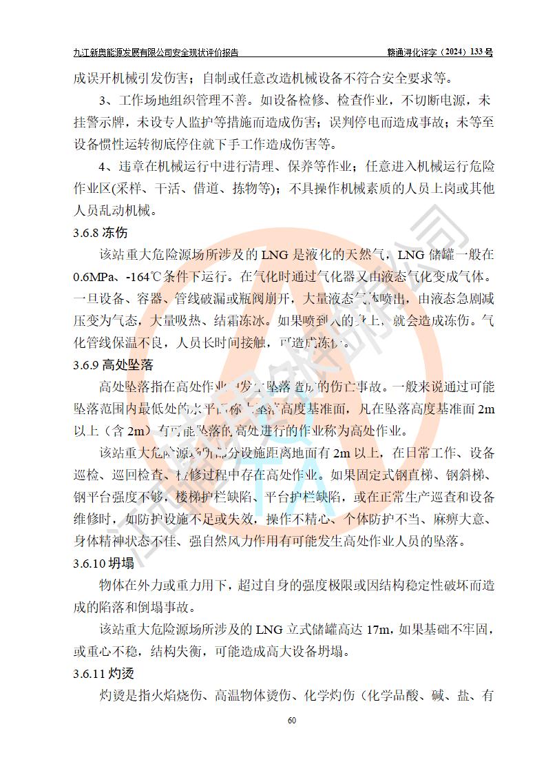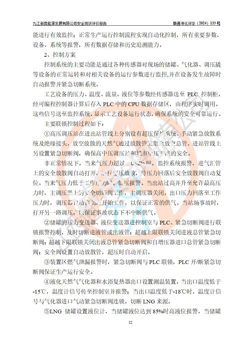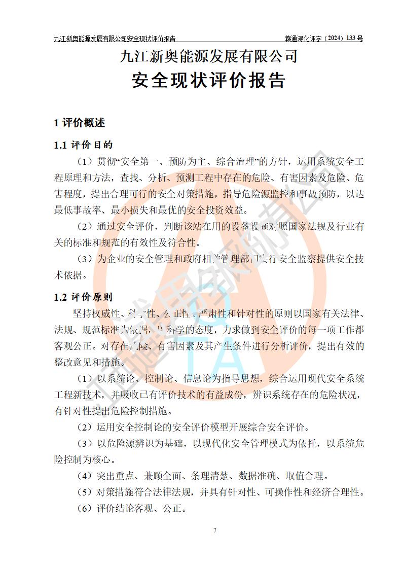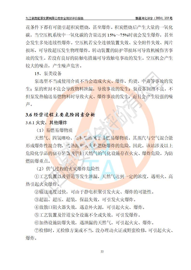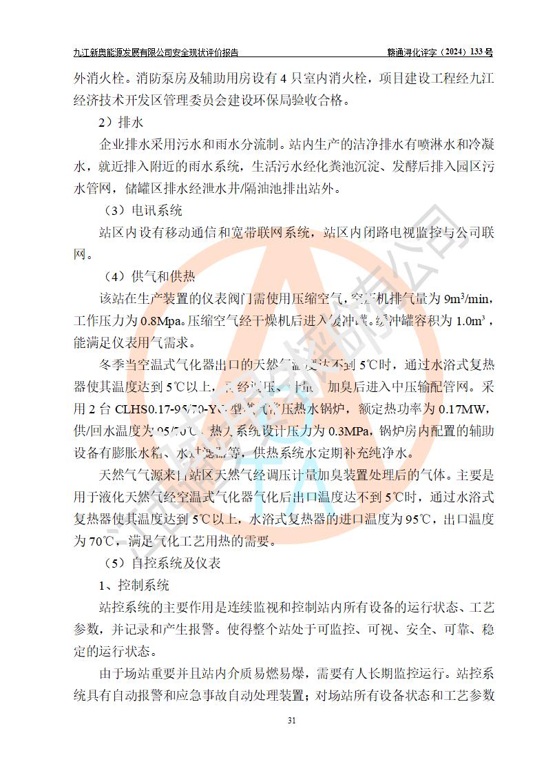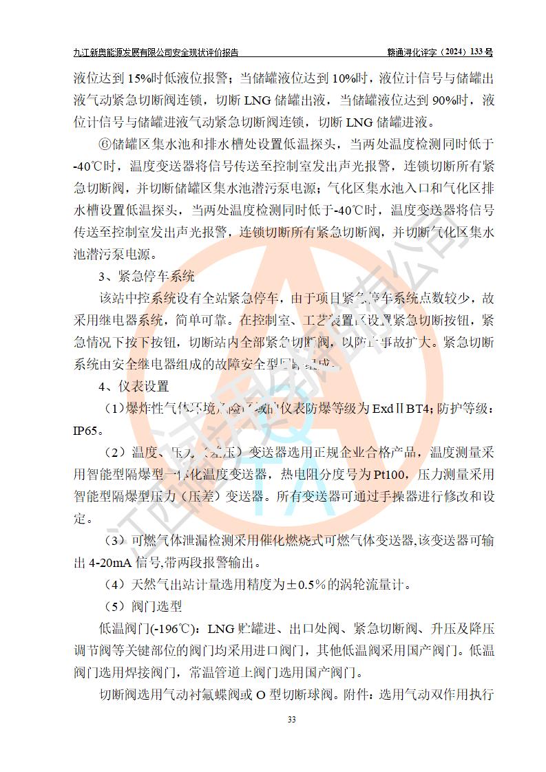 项目简介 | 九江新奥能源发展有限公司,成立于2017年12月6日,位于江西省九江市九江经济技术开发区城西港区港城大道189号,注册资金10000万元,法人**苏莉,属有限责任公司(台港澳法人独资)。经营范围:燃气供应、电力供应、蒸汽供应;分布式能源及新能源利用设施建设及运营管理;燃气管网的建设、供热管网的建设、配电网的建设、运营管理;管网燃气的工程设计及安装;合同能源管理;系能源技术开发、技术咨询、技术**、技术服务;商务信息咨询;能源管理数据库系统开发、管理;机电设备、暖道设备及其他能源利用设备的销售、租赁、技术服务(依法须经批准的项目,经相关部门批准后方可开展经营活动)。 公司在城西港港城大道建设有九江市城西港区泛能站(一期)项目,设有LNG储配站和高中压调压站合建站,LNG储备站作为应急调峰气源,上游门站管输天然气作为气源。高中压调压站建设规模:供气量7672.58万Nm3/年,高峰小时流量1.2×104Nm3/h;LNG气化站规模:总储量2×150m3。 该站2020年完成竣工验收,近三年以来,现场主要工艺装置、安全设施未发生过变化,无设计变更情况发生。 该站在供应天然气过程中,涉及的天然气、四氢噻吩、氮气(压缩的)均属于危险化学品;另外,发电机涉及的柴油也属于危险化学品;涉及的液化天然气属于**重点监管的危险化学品和特别管控危险化学品,不涉及剧毒化学品、高毒物品、易制毒化学品、监控化学品、易制爆化学品。该站LNG储罐区构成四级危险化学品重大危险源。 根据《中华人民共和国安全生产法》以及《城镇燃气管理条例》第四十一条规定,燃气经营者应当建立健全燃气安全评估和风险管理体系,按《九江市燃气管理办法》(**令21号)规定,燃气生产经营单位应当对本单位的燃气设施每三年进行一次安全评价。为此,九江新奥能源发展有限公司委托江西通安安全评价有限公司承担该公司的安全现状评价。 江西通安安全评价有限公司接受委托后,组成了评价小组,于2024年11月进行了现场勘察,对九江新奥能源发展有限公司LNG储配站和高中压调压站合建站的燃气设施的安全条件及安全管理进行了充分的了解,查找了其存在的危险、有害因素种类和程度,对存在的问题,评价组成员和委托方的陪同人员进行了及时的沟通,并提出了整改措施;按照《安全评价通则》(AQ8001-2007)的要求,依据**有关法律、法规、标准和规范,采用合适的安全评价方法,编制完成了本安全评价报告,以作为企业安全生产技术与安全生产管理决策及应急管理部门实施安全监督管理提供技术依据。 本次安全评价范围为:九江新奥能源发展有限公司选址及总平面布置、主体装置和辅助设施,包括站区内天然气接收装置、过滤、计量、调压、加臭设施、LNG储罐区等主体装置和公共辅助设施;评价该公司的安全管理制度、安全组织机构及其安全管理等。 九江新奥能源发展有限公司上、下游的管道及管道输送工程不在评价范围内;项目配套的行政、生活设施除总体布局外,不在评价范围内。本站LNG气化后向用户输送的中压管道及站区外的天然气管网以及站外天然气运输不在本评估范围内。 本评价引用到的**、消防方面的法规标准与安全评价有**的关联,本评价涉及的环境保护与消防评价内容,不****和消防主管部门的意见,环境保护与消防应以其主管部门检查的意见为准;自然灾害方面不包括在本评价范围内,只对涉及部分做一般性评述。 | ||||||