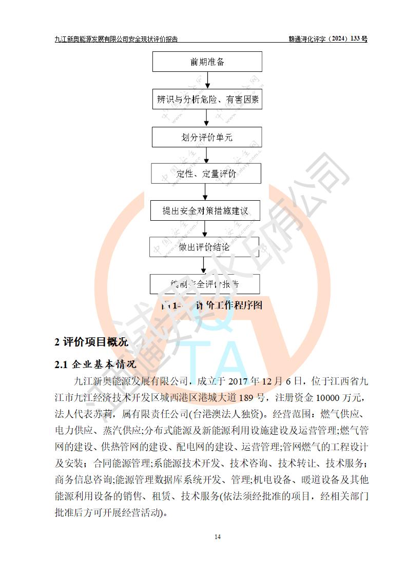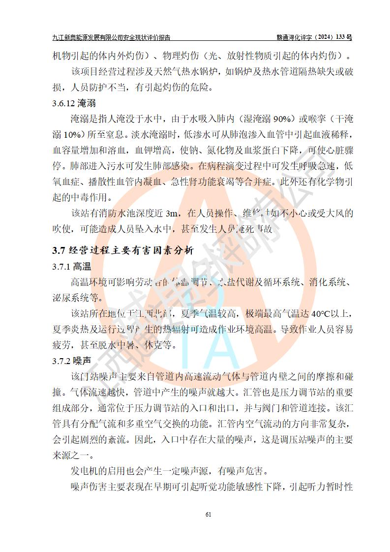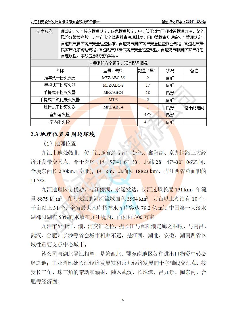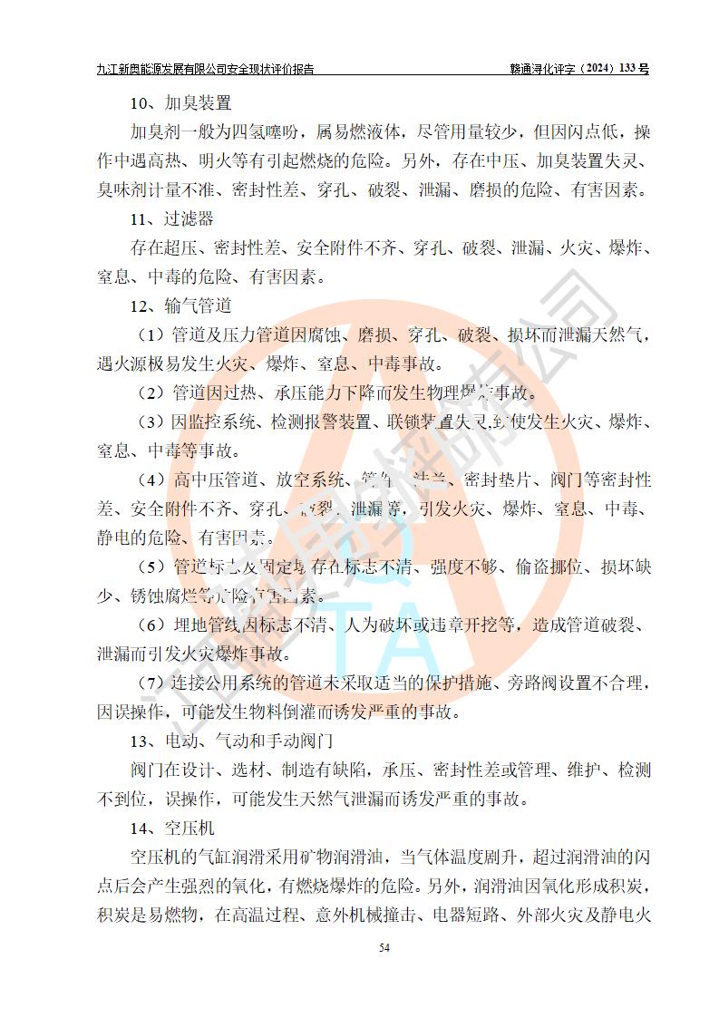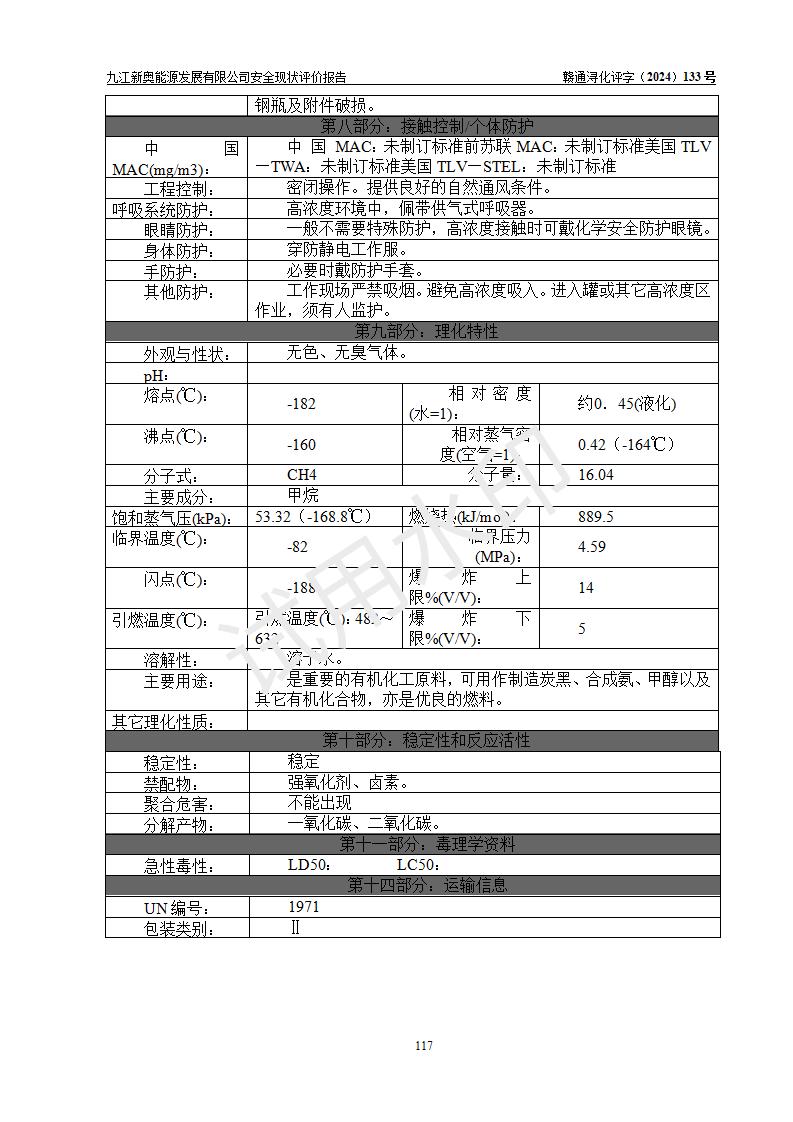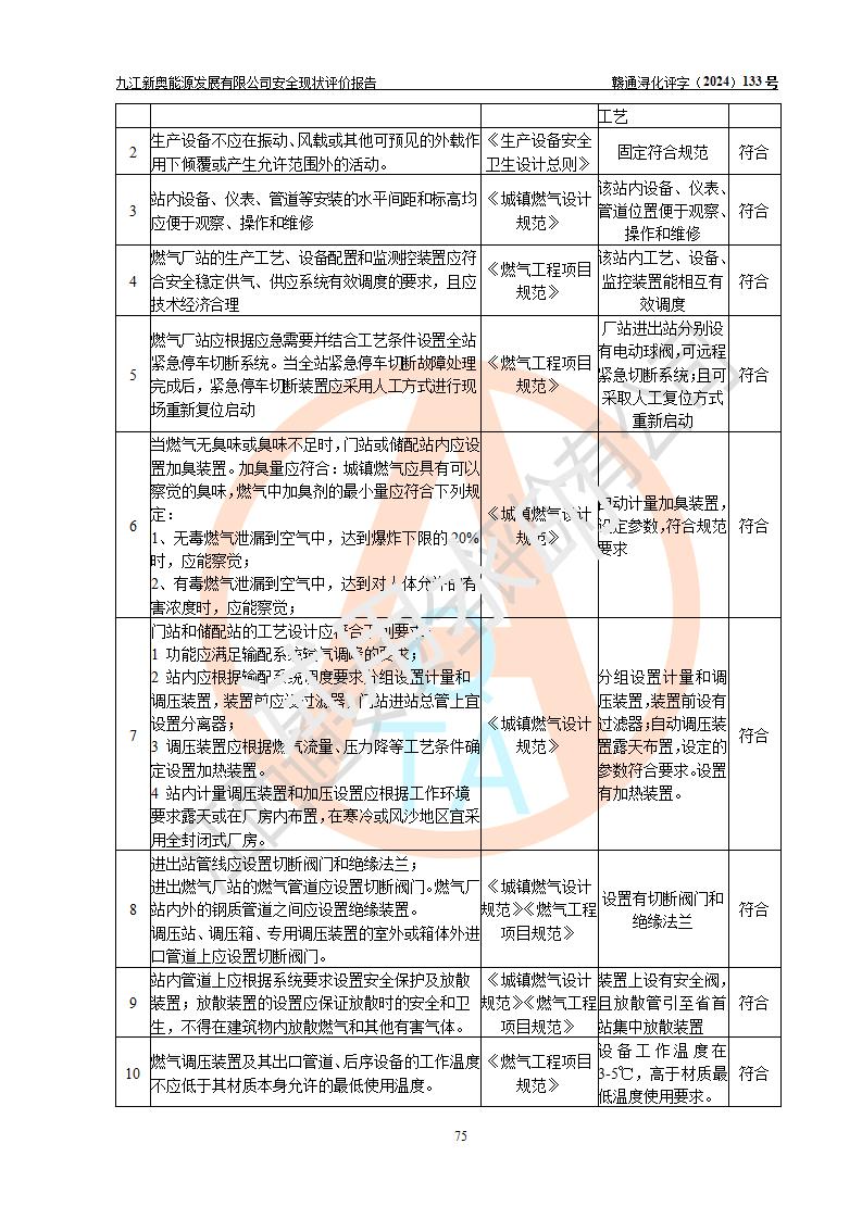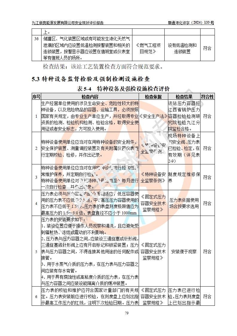 项目简介 | 九江新奥能源发展有限公司,成立于2017年12月6日,位于江西省九江市九江经济技术开发区城西港区港城大道189号,注册资金10000万元,法人**苏莉,属有限责任公司(台港澳法人独资)。经营范围:燃气供应、电力供应、蒸汽供应;分布式能源及新能源利用设施建设及运营管理;燃气管网的建设、供热管网的建设、配电网的建设、运营管理;管网燃气的工程设计及安装;合同能源管理;系能源技术开发、技术咨询、技术**、技术服务;商务信息咨询;能源管理数据库系统开发、管理;机电设备、暖道设备及其他能源利用设备的销售、租赁、技术服务(依法须经批准的项目,经相关部门批准后方可开展经营活动)。 公司在城西港港城大道建设有九江市城西港区泛能站(一期)项目,设有LNG储配站和高中压调压站合建站,LNG储备站作为应急调峰气源,上游门站管输天然气作为气源。高中压调压站建设规模:供气量7672.58万Nm3/年,高峰小时流量1.2×104Nm3/h;LNG气化站规模:总储量2×150m3。 该站2020年完成竣工验收,近三年以来,现场主要工艺装置、安全设施未发生过变化,无设计变更情况发生。 该站在供应天然气过程中,涉及的天然气、四氢噻吩、氮气(压缩的)均属于危险化学品;另外,发电机涉及的柴油也属于危险化学品;涉及的液化天然气属于**重点监管的危险化学品和特别管控危险化学品,不涉及剧毒化学品、高毒物品、易制毒化学品、监控化学品、易制爆化学品。该站LNG储罐区构成四级危险化学品重大危险源。 根据《中华人民共和国安全生产法》以及《城镇燃气管理条例》第四十一条规定,燃气经营者应当建立健全燃气安全评估和风险管理体系,按《九江市燃气管理办法》(**令21号)规定,燃气生产经营单位应当对本单位的燃气设施每三年进行一次安全评价。为此,九江新奥能源发展有限公司委托江西通安安全评价有限公司承担该公司的安全现状评价。 江西通安安全评价有限公司接受委托后,组成了评价小组,于2024年11月进行了现场勘察,对九江新奥能源发展有限公司LNG储配站和高中压调压站合建站的燃气设施的安全条件及安全管理进行了充分的了解,查找了其存在的危险、有害因素种类和程度,对存在的问题,评价组成员和委托方的陪同人员进行了及时的沟通,并提出了整改措施;按照《安全评价通则》(AQ8001-2007)的要求,依据**有关法律、法规、标准和规范,采用合适的安全评价方法,编制完成了本安全评价报告,以作为企业安全生产技术与安全生产管理决策及应急管理部门实施安全监督管理提供技术依据。 本次安全评价范围为:九江新奥能源发展有限公司选址及总平面布置、主体装置和辅助设施,包括站区内天然气接收装置、过滤、计量、调压、加臭设施、LNG储罐区等主体装置和公共辅助设施;评价该公司的安全管理制度、安全组织机构及其安全管理等。 九江新奥能源发展有限公司上、下游的管道及管道输送工程不在评价范围内;项目配套的行政、生活设施除总体布局外,不在评价范围内。本站LNG气化后向用户输送的中压管道及站区外的天然气管网以及站外天然气运输不在本评估范围内。 本评价引用到的**、消防方面的法规标准与安全评价有**的关联,本评价涉及的环境保护与消防评价内容,不****和消防主管部门的意见,环境保护与消防应以其主管部门检查的意见为准;自然灾害方面不包括在本评价范围内,只对涉及部分做一般性评述。 | ||||||