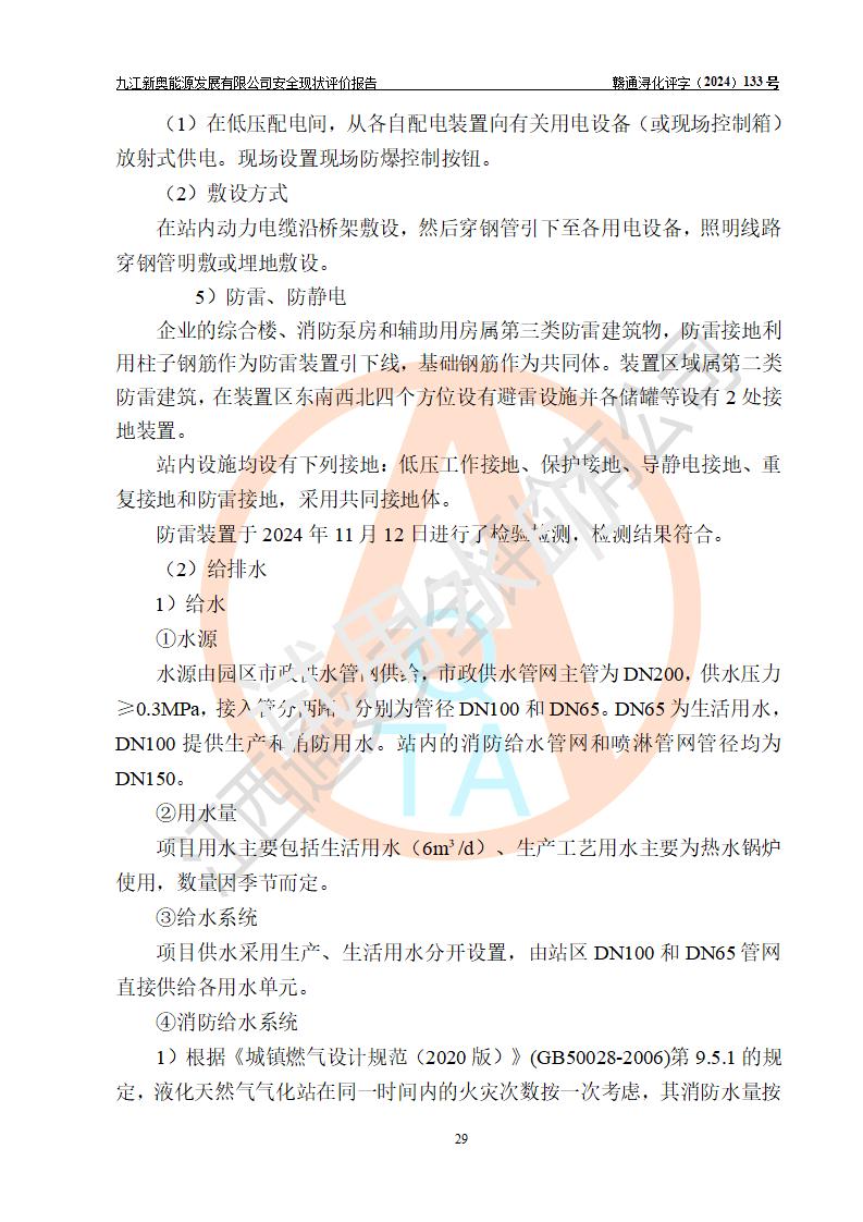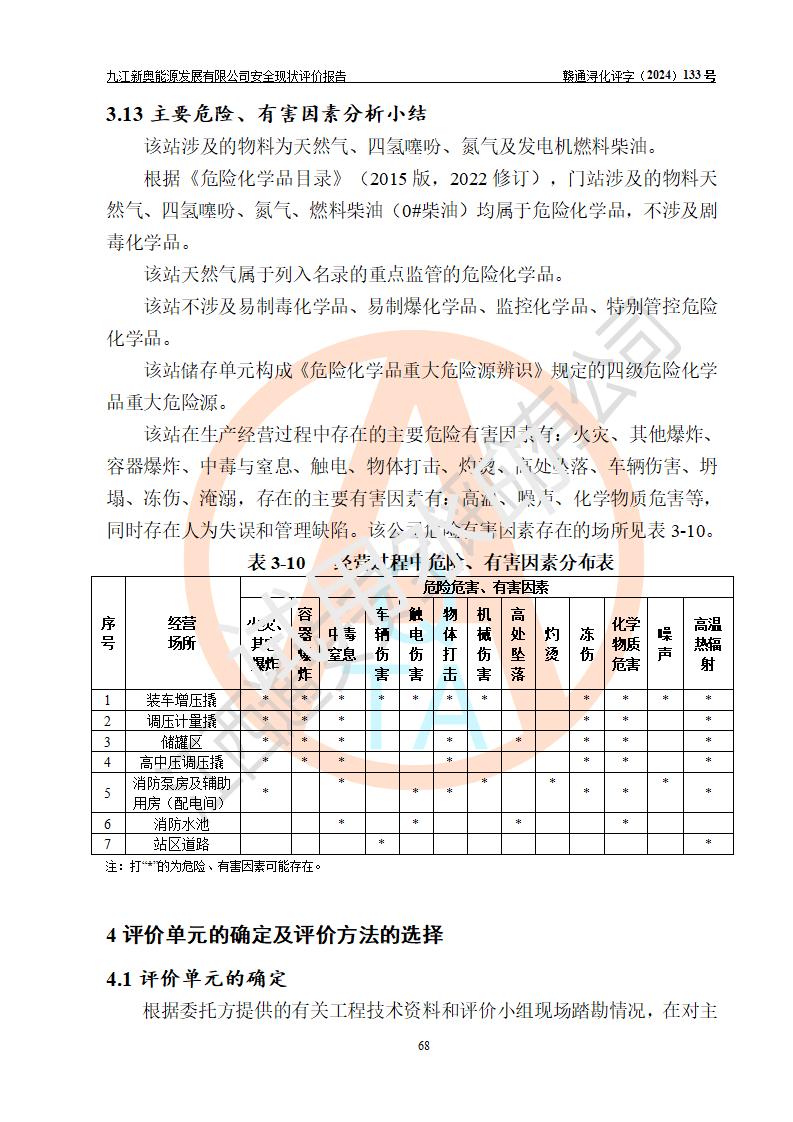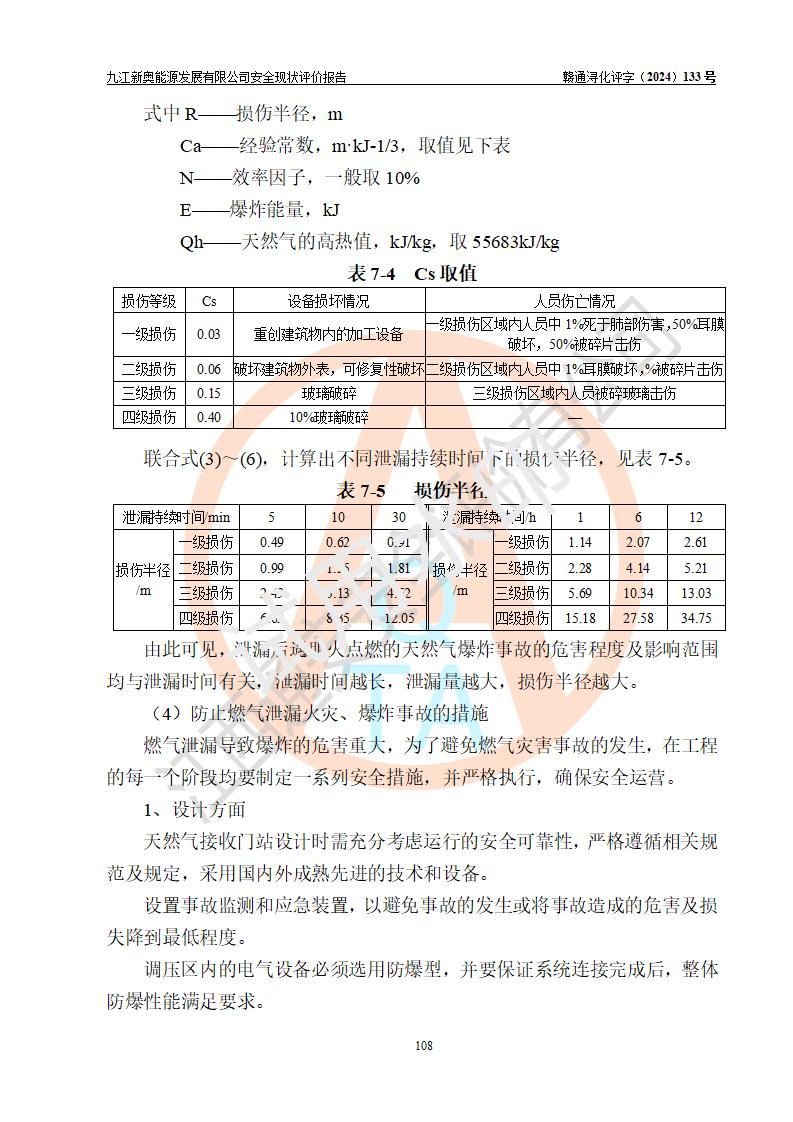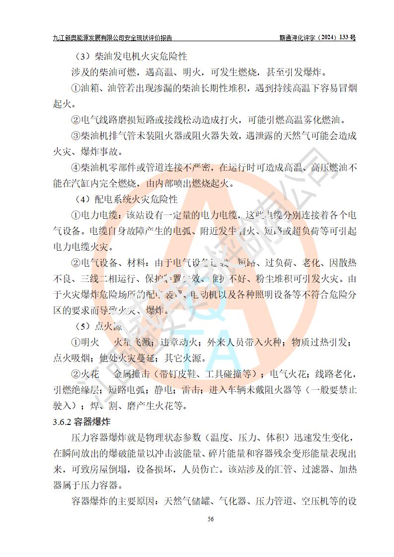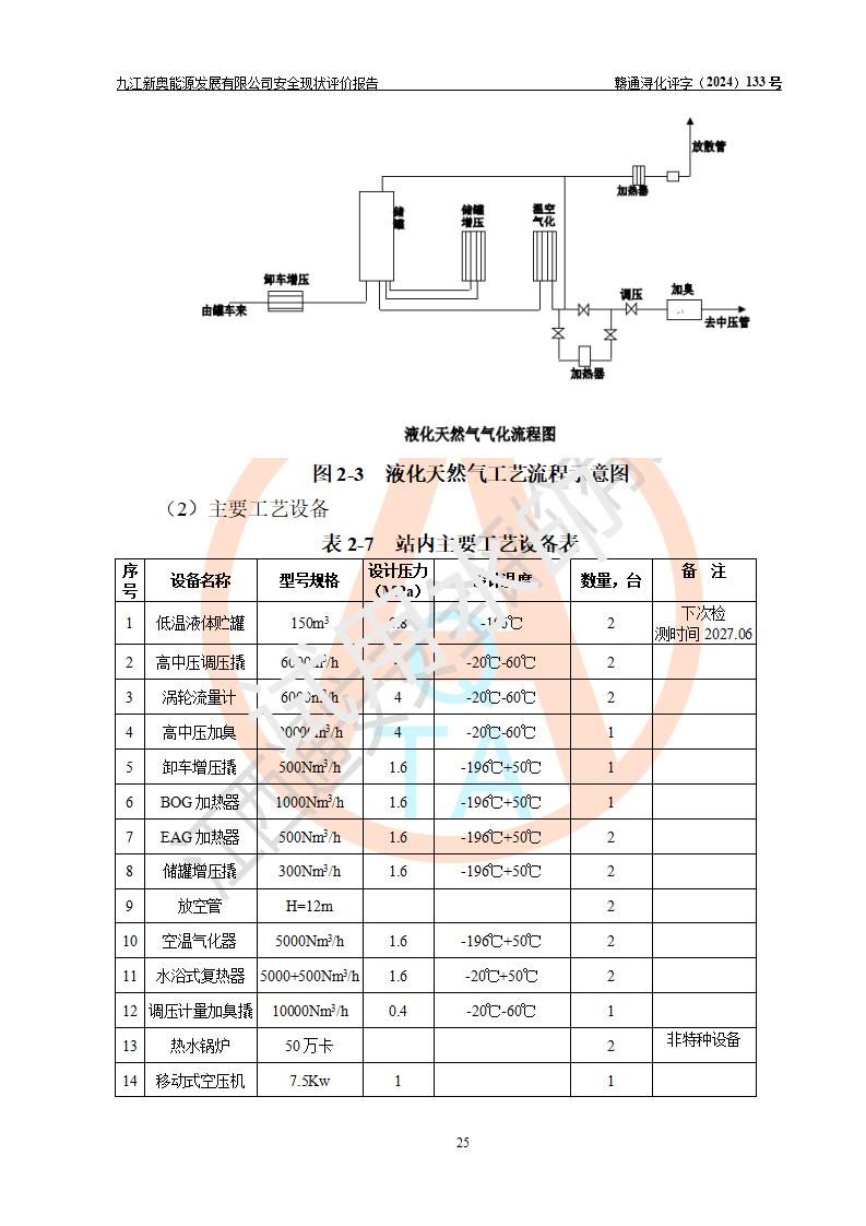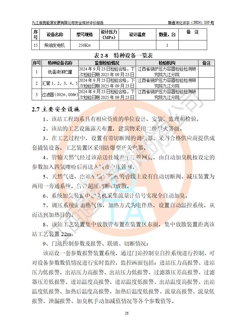 项目简介 | 九江新奥能源发展有限公司,成立于2017年12月6日,位于江西省九江市九江经济技术开发区城西港区港城大道189号,注册资金10000万元,法人**苏莉,属有限责任公司(台港澳法人独资)。经营范围:燃气供应、电力供应、蒸汽供应;分布式能源及新能源利用设施建设及运营管理;燃气管网的建设、供热管网的建设、配电网的建设、运营管理;管网燃气的工程设计及安装;合同能源管理;系能源技术开发、技术咨询、技术**、技术服务;商务信息咨询;能源管理数据库系统开发、管理;机电设备、暖道设备及其他能源利用设备的销售、租赁、技术服务(依法须经批准的项目,经相关部门批准后方可开展经营活动)。 公司在城西港港城大道建设有九江市城西港区泛能站(一期)项目,设有LNG储配站和高中压调压站合建站,LNG储备站作为应急调峰气源,上游门站管输天然气作为气源。高中压调压站建设规模:供气量7672.58万Nm3/年,高峰小时流量1.2×104Nm3/h;LNG气化站规模:总储量2×150m3。 该站2020年完成竣工验收,近三年以来,现场主要工艺装置、安全设施未发生过变化,无设计变更情况发生。 该站在供应天然气过程中,涉及的天然气、四氢噻吩、氮气(压缩的)均属于危险化学品;另外,发电机涉及的柴油也属于危险化学品;涉及的液化天然气属于**重点监管的危险化学品和特别管控危险化学品,不涉及剧毒化学品、高毒物品、易制毒化学品、监控化学品、易制爆化学品。该站LNG储罐区构成四级危险化学品重大危险源。 根据《中华人民共和国安全生产法》以及《城镇燃气管理条例》第四十一条规定,燃气经营者应当建立健全燃气安全评估和风险管理体系,按《九江市燃气管理办法》(**令21号)规定,燃气生产经营单位应当对本单位的燃气设施每三年进行一次安全评价。为此,九江新奥能源发展有限公司委托江西通安安全评价有限公司承担该公司的安全现状评价。 江西通安安全评价有限公司接受委托后,组成了评价小组,于2024年11月进行了现场勘察,对九江新奥能源发展有限公司LNG储配站和高中压调压站合建站的燃气设施的安全条件及安全管理进行了充分的了解,查找了其存在的危险、有害因素种类和程度,对存在的问题,评价组成员和委托方的陪同人员进行了及时的沟通,并提出了整改措施;按照《安全评价通则》(AQ8001-2007)的要求,依据**有关法律、法规、标准和规范,采用合适的安全评价方法,编制完成了本安全评价报告,以作为企业安全生产技术与安全生产管理决策及应急管理部门实施安全监督管理提供技术依据。 本次安全评价范围为:九江新奥能源发展有限公司选址及总平面布置、主体装置和辅助设施,包括站区内天然气接收装置、过滤、计量、调压、加臭设施、LNG储罐区等主体装置和公共辅助设施;评价该公司的安全管理制度、安全组织机构及其安全管理等。 九江新奥能源发展有限公司上、下游的管道及管道输送工程不在评价范围内;项目配套的行政、生活设施除总体布局外,不在评价范围内。本站LNG气化后向用户输送的中压管道及站区外的天然气管网以及站外天然气运输不在本评估范围内。 本评价引用到的**、消防方面的法规标准与安全评价有**的关联,本评价涉及的环境保护与消防评价内容,不****和消防主管部门的意见,环境保护与消防应以其主管部门检查的意见为准;自然灾害方面不包括在本评价范围内,只对涉及部分做一般性评述。 | ||||||