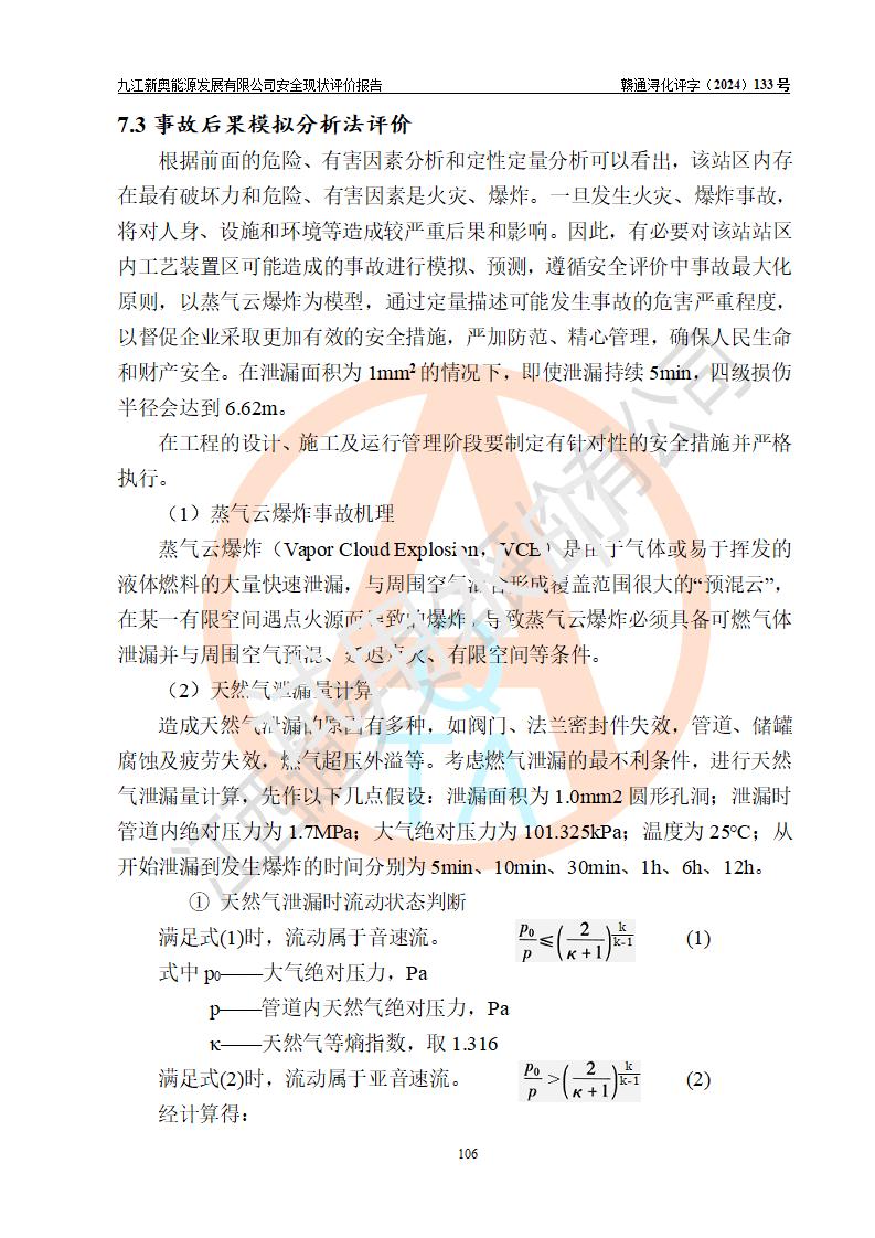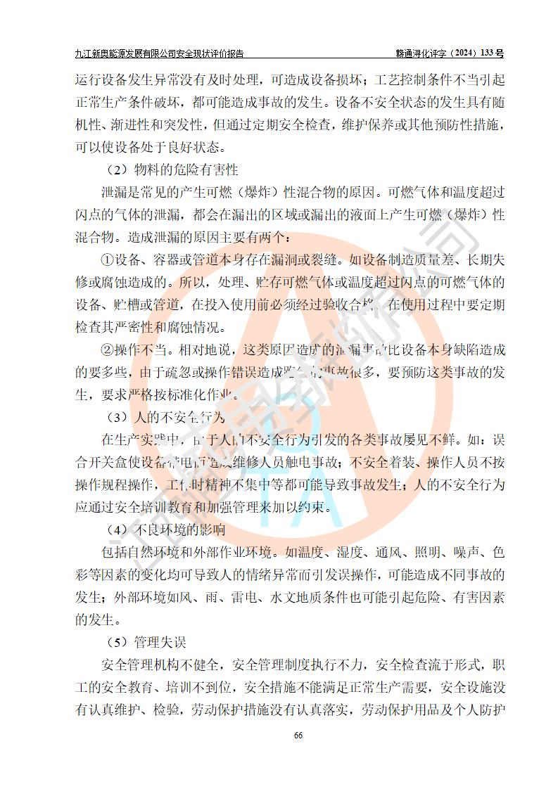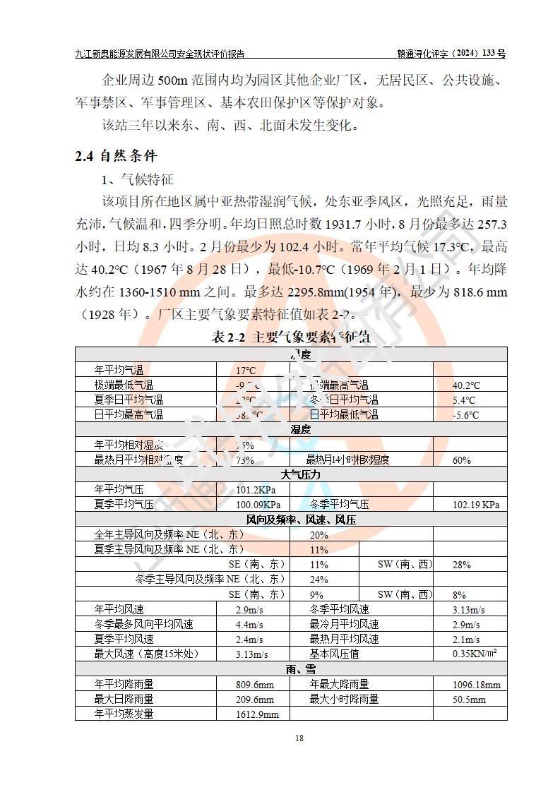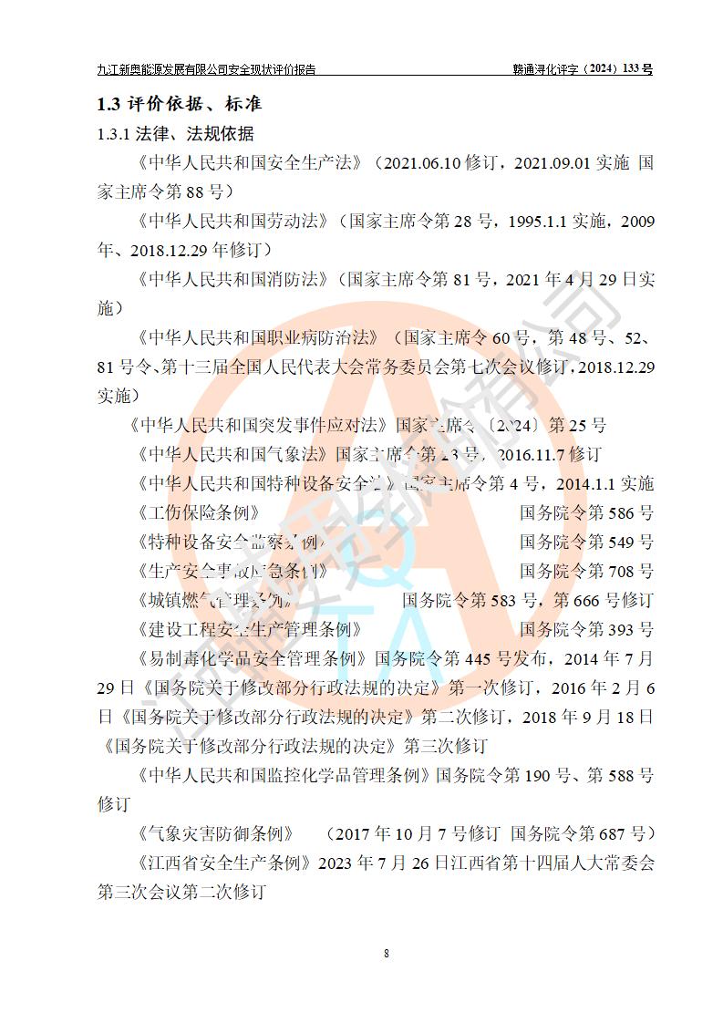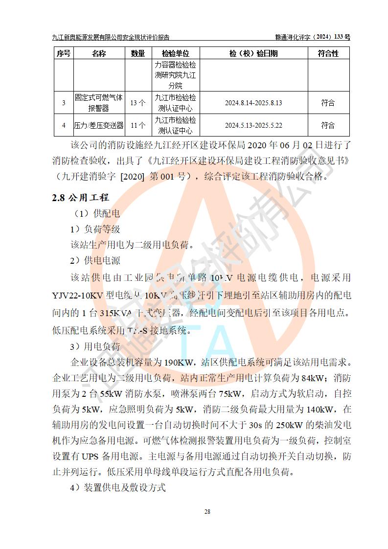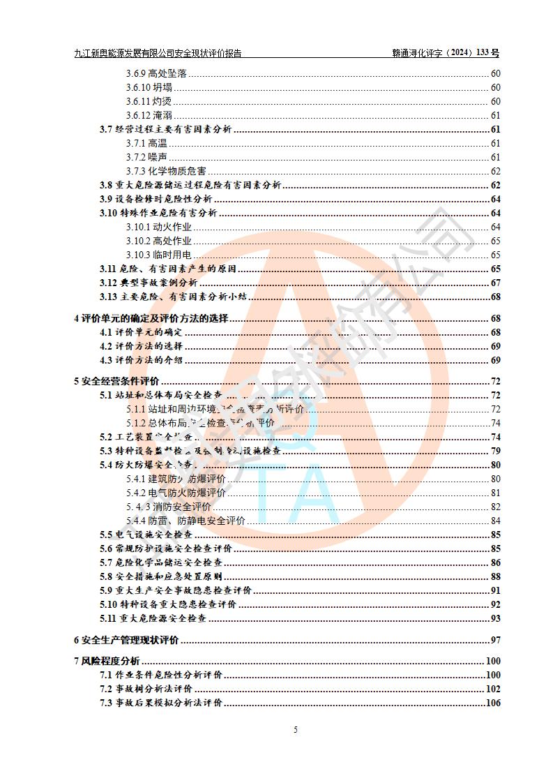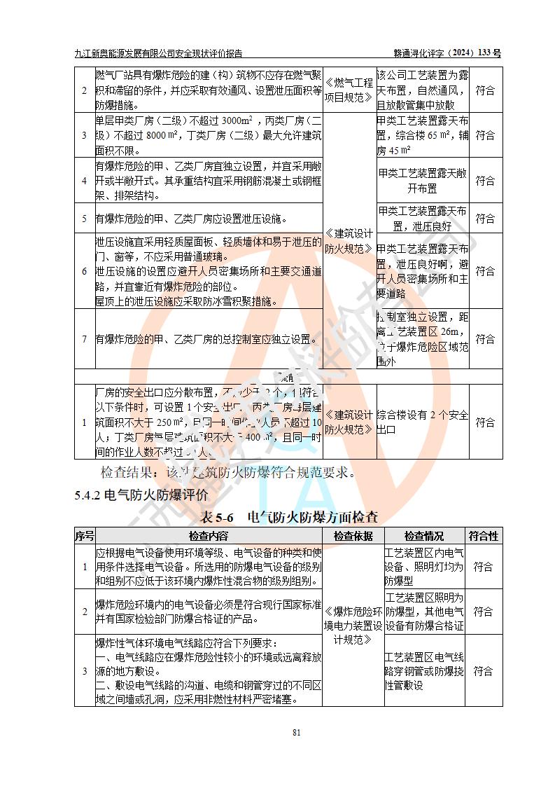 项目简介 | 九江新奥能源发展有限公司,成立于2017年12月6日,位于江西省九江市九江经济技术开发区城西港区港城大道189号,注册资金10000万元,法人**苏莉,属有限责任公司(台港澳法人独资)。经营范围:燃气供应、电力供应、蒸汽供应;分布式能源及新能源利用设施建设及运营管理;燃气管网的建设、供热管网的建设、配电网的建设、运营管理;管网燃气的工程设计及安装;合同能源管理;系能源技术开发、技术咨询、技术**、技术服务;商务信息咨询;能源管理数据库系统开发、管理;机电设备、暖道设备及其他能源利用设备的销售、租赁、技术服务(依法须经批准的项目,经相关部门批准后方可开展经营活动)。 公司在城西港港城大道建设有九江市城西港区泛能站(一期)项目,设有LNG储配站和高中压调压站合建站,LNG储备站作为应急调峰气源,上游门站管输天然气作为气源。高中压调压站建设规模:供气量7672.58万Nm3/年,高峰小时流量1.2×104Nm3/h;LNG气化站规模:总储量2×150m3。 该站2020年完成竣工验收,近三年以来,现场主要工艺装置、安全设施未发生过变化,无设计变更情况发生。 该站在供应天然气过程中,涉及的天然气、四氢噻吩、氮气(压缩的)均属于危险化学品;另外,发电机涉及的柴油也属于危险化学品;涉及的液化天然气属于**重点监管的危险化学品和特别管控危险化学品,不涉及剧毒化学品、高毒物品、易制毒化学品、监控化学品、易制爆化学品。该站LNG储罐区构成四级危险化学品重大危险源。 根据《中华人民共和国安全生产法》以及《城镇燃气管理条例》第四十一条规定,燃气经营者应当建立健全燃气安全评估和风险管理体系,按《九江市燃气管理办法》(**令21号)规定,燃气生产经营单位应当对本单位的燃气设施每三年进行一次安全评价。为此,九江新奥能源发展有限公司委托江西通安安全评价有限公司承担该公司的安全现状评价。 江西通安安全评价有限公司接受委托后,组成了评价小组,于2024年11月进行了现场勘察,对九江新奥能源发展有限公司LNG储配站和高中压调压站合建站的燃气设施的安全条件及安全管理进行了充分的了解,查找了其存在的危险、有害因素种类和程度,对存在的问题,评价组成员和委托方的陪同人员进行了及时的沟通,并提出了整改措施;按照《安全评价通则》(AQ8001-2007)的要求,依据**有关法律、法规、标准和规范,采用合适的安全评价方法,编制完成了本安全评价报告,以作为企业安全生产技术与安全生产管理决策及应急管理部门实施安全监督管理提供技术依据。 本次安全评价范围为:九江新奥能源发展有限公司选址及总平面布置、主体装置和辅助设施,包括站区内天然气接收装置、过滤、计量、调压、加臭设施、LNG储罐区等主体装置和公共辅助设施;评价该公司的安全管理制度、安全组织机构及其安全管理等。 九江新奥能源发展有限公司上、下游的管道及管道输送工程不在评价范围内;项目配套的行政、生活设施除总体布局外,不在评价范围内。本站LNG气化后向用户输送的中压管道及站区外的天然气管网以及站外天然气运输不在本评估范围内。 本评价引用到的**、消防方面的法规标准与安全评价有**的关联,本评价涉及的环境保护与消防评价内容,不****和消防主管部门的意见,环境保护与消防应以其主管部门检查的意见为准;自然灾害方面不包括在本评价范围内,只对涉及部分做一般性评述。 | ||||||