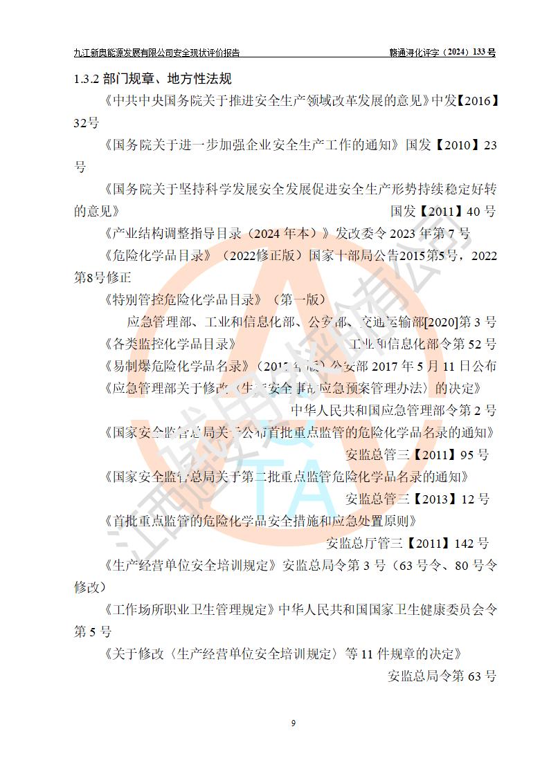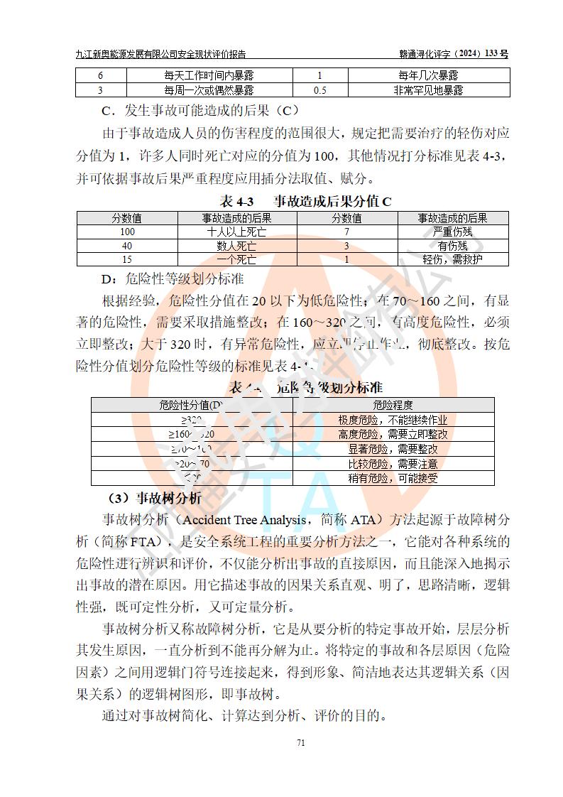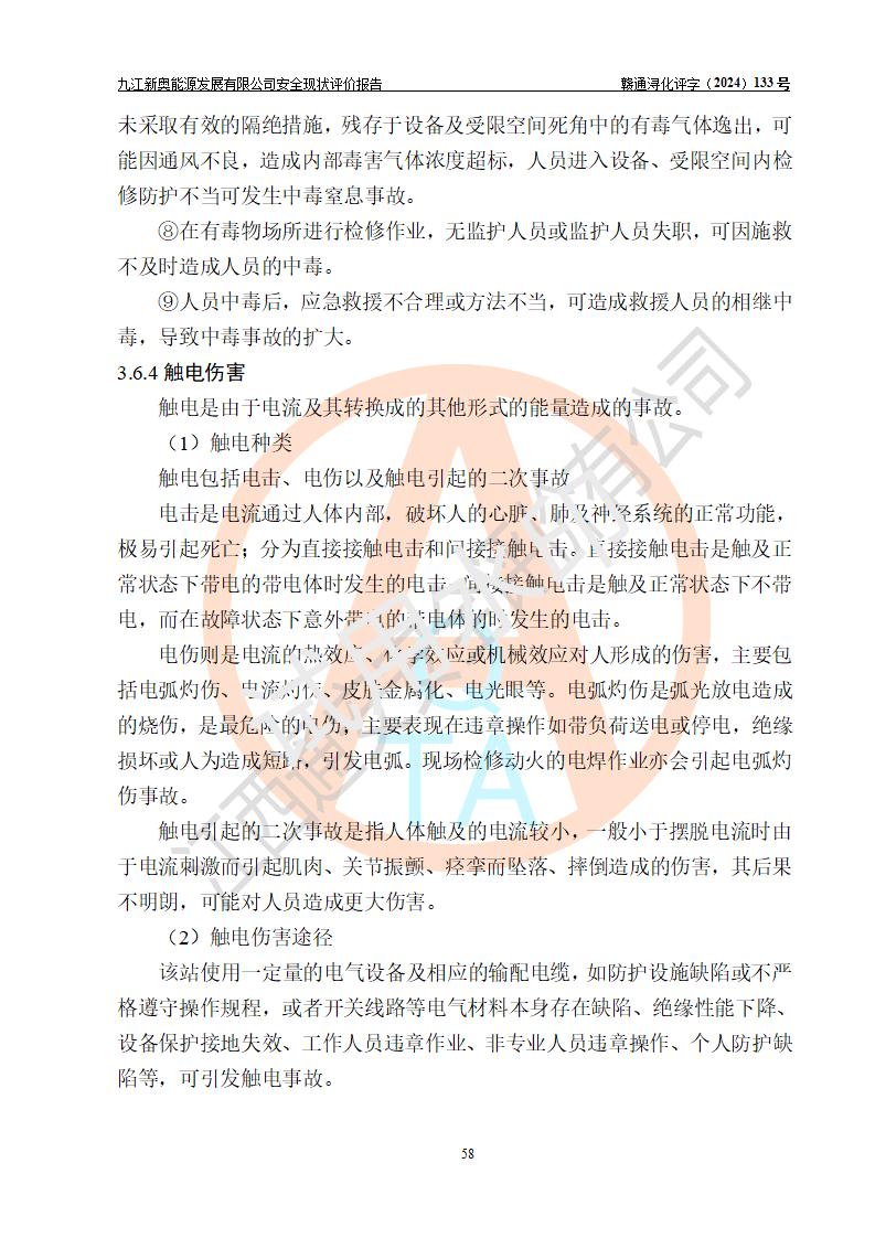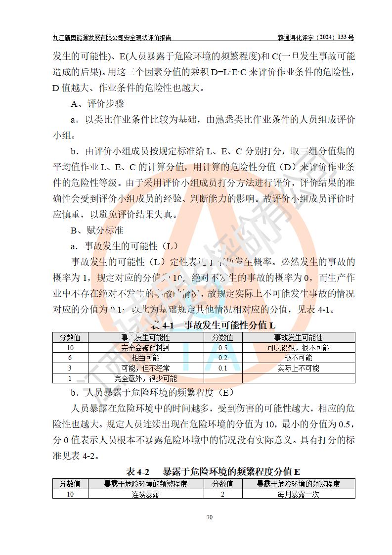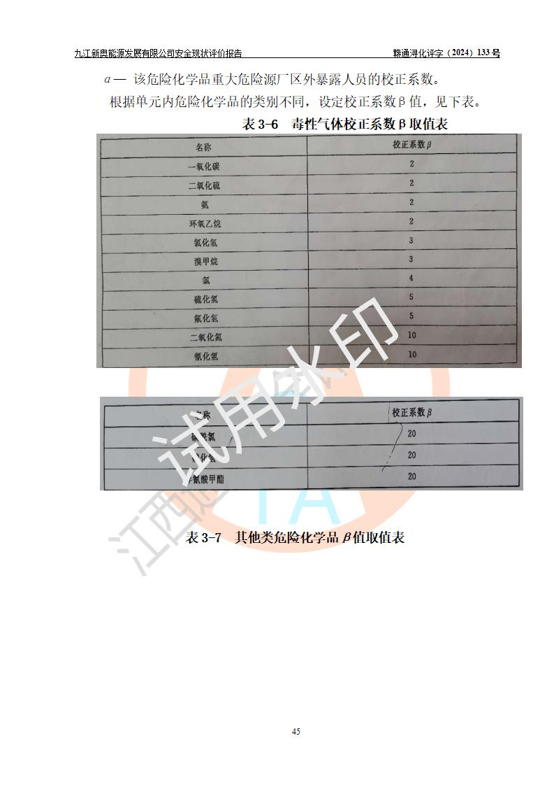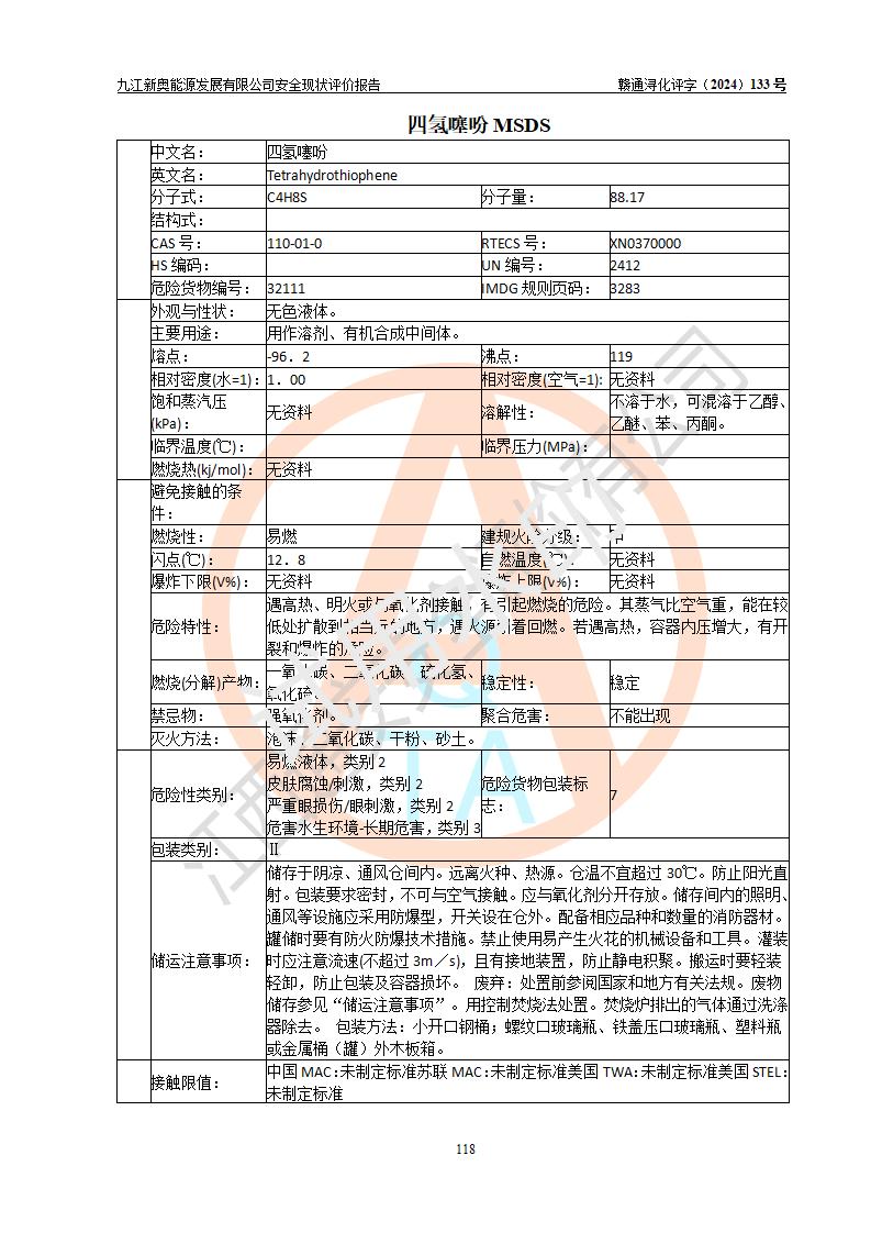 项目简介 | 九江新奥能源发展有限公司,成立于2017年12月6日,位于江西省九江市九江经济技术开发区城西港区港城大道189号,注册资金10000万元,法人**苏莉,属有限责任公司(台港澳法人独资)。经营范围:燃气供应、电力供应、蒸汽供应;分布式能源及新能源利用设施建设及运营管理;燃气管网的建设、供热管网的建设、配电网的建设、运营管理;管网燃气的工程设计及安装;合同能源管理;系能源技术开发、技术咨询、技术**、技术服务;商务信息咨询;能源管理数据库系统开发、管理;机电设备、暖道设备及其他能源利用设备的销售、租赁、技术服务(依法须经批准的项目,经相关部门批准后方可开展经营活动)。 公司在城西港港城大道建设有九江市城西港区泛能站(一期)项目,设有LNG储配站和高中压调压站合建站,LNG储备站作为应急调峰气源,上游门站管输天然气作为气源。高中压调压站建设规模:供气量7672.58万Nm3/年,高峰小时流量1.2×104Nm3/h;LNG气化站规模:总储量2×150m3。 该站2020年完成竣工验收,近三年以来,现场主要工艺装置、安全设施未发生过变化,无设计变更情况发生。 该站在供应天然气过程中,涉及的天然气、四氢噻吩、氮气(压缩的)均属于危险化学品;另外,发电机涉及的柴油也属于危险化学品;涉及的液化天然气属于**重点监管的危险化学品和特别管控危险化学品,不涉及剧毒化学品、高毒物品、易制毒化学品、监控化学品、易制爆化学品。该站LNG储罐区构成四级危险化学品重大危险源。 根据《中华人民共和国安全生产法》以及《城镇燃气管理条例》第四十一条规定,燃气经营者应当建立健全燃气安全评估和风险管理体系,按《九江市燃气管理办法》(**令21号)规定,燃气生产经营单位应当对本单位的燃气设施每三年进行一次安全评价。为此,九江新奥能源发展有限公司委托江西通安安全评价有限公司承担该公司的安全现状评价。 江西通安安全评价有限公司接受委托后,组成了评价小组,于2024年11月进行了现场勘察,对九江新奥能源发展有限公司LNG储配站和高中压调压站合建站的燃气设施的安全条件及安全管理进行了充分的了解,查找了其存在的危险、有害因素种类和程度,对存在的问题,评价组成员和委托方的陪同人员进行了及时的沟通,并提出了整改措施;按照《安全评价通则》(AQ8001-2007)的要求,依据**有关法律、法规、标准和规范,采用合适的安全评价方法,编制完成了本安全评价报告,以作为企业安全生产技术与安全生产管理决策及应急管理部门实施安全监督管理提供技术依据。 本次安全评价范围为:九江新奥能源发展有限公司选址及总平面布置、主体装置和辅助设施,包括站区内天然气接收装置、过滤、计量、调压、加臭设施、LNG储罐区等主体装置和公共辅助设施;评价该公司的安全管理制度、安全组织机构及其安全管理等。 九江新奥能源发展有限公司上、下游的管道及管道输送工程不在评价范围内;项目配套的行政、生活设施除总体布局外,不在评价范围内。本站LNG气化后向用户输送的中压管道及站区外的天然气管网以及站外天然气运输不在本评估范围内。 本评价引用到的**、消防方面的法规标准与安全评价有**的关联,本评价涉及的环境保护与消防评价内容,不****和消防主管部门的意见,环境保护与消防应以其主管部门检查的意见为准;自然灾害方面不包括在本评价范围内,只对涉及部分做一般性评述。 | ||||||
