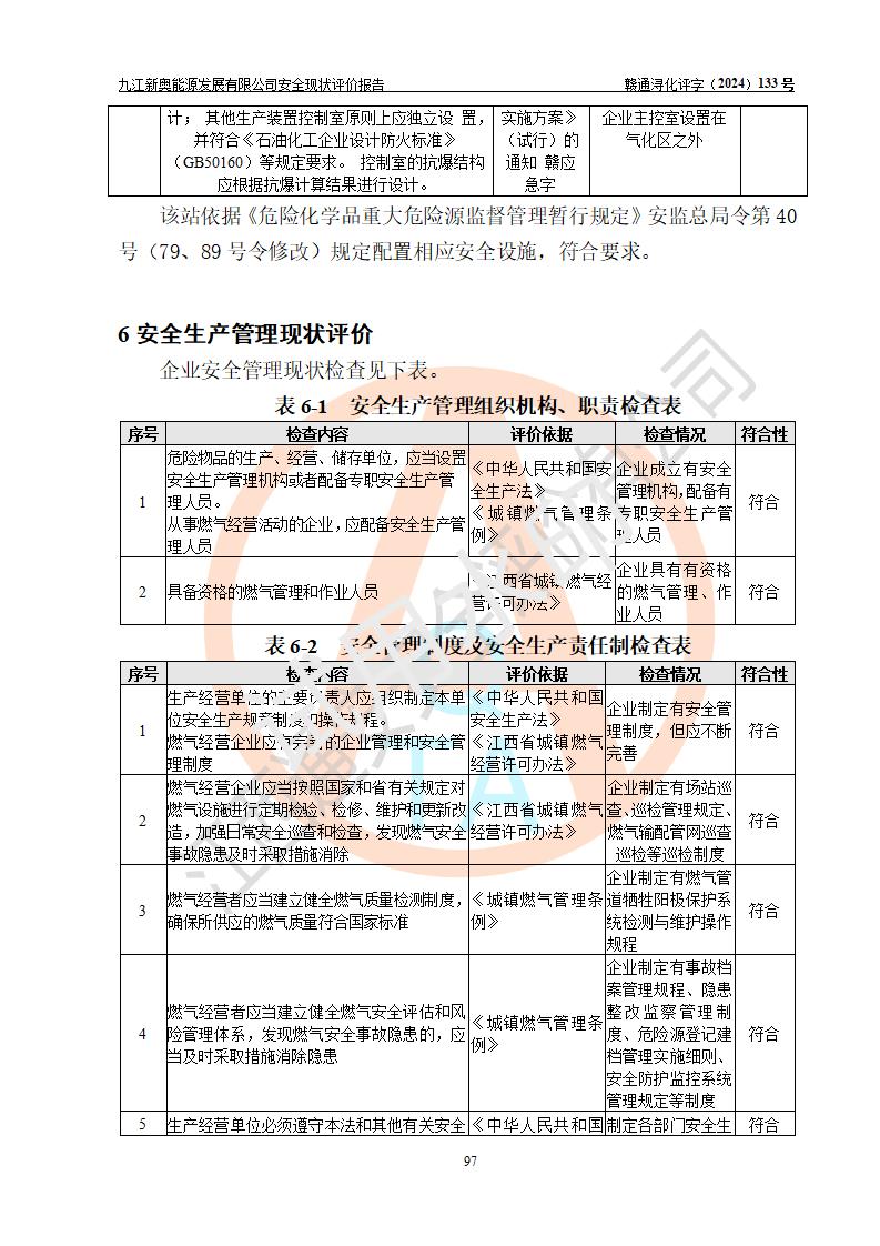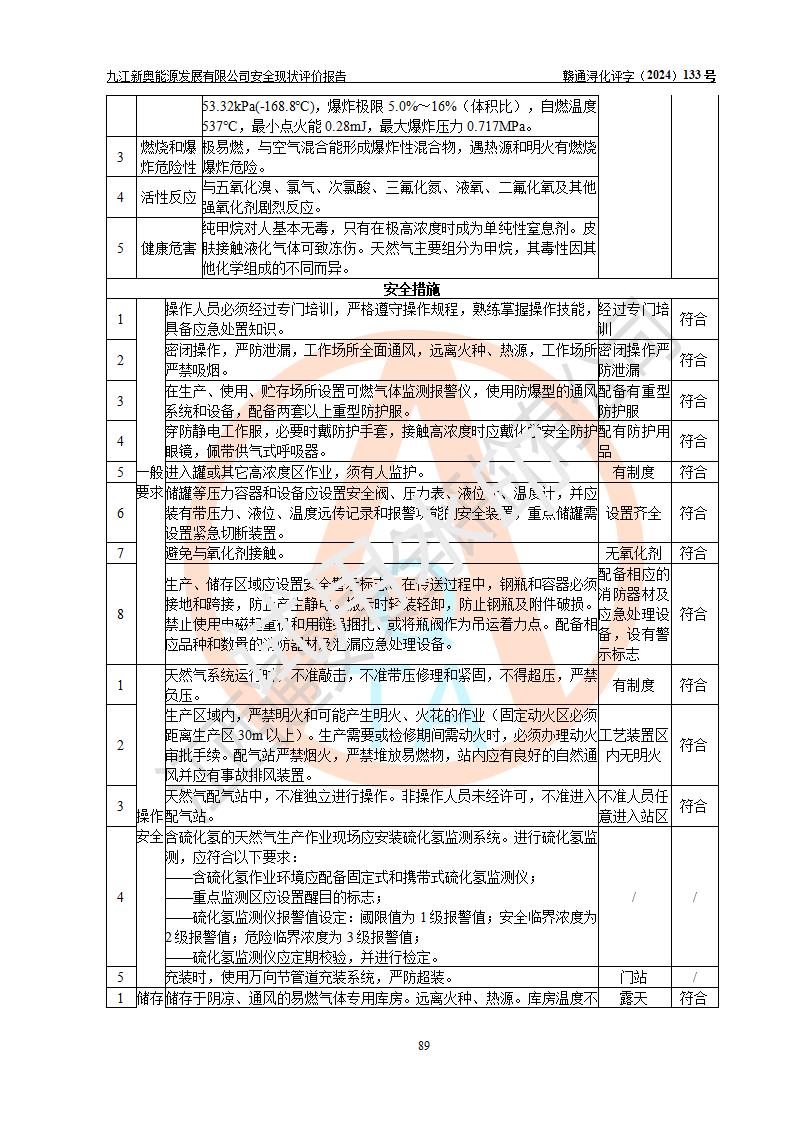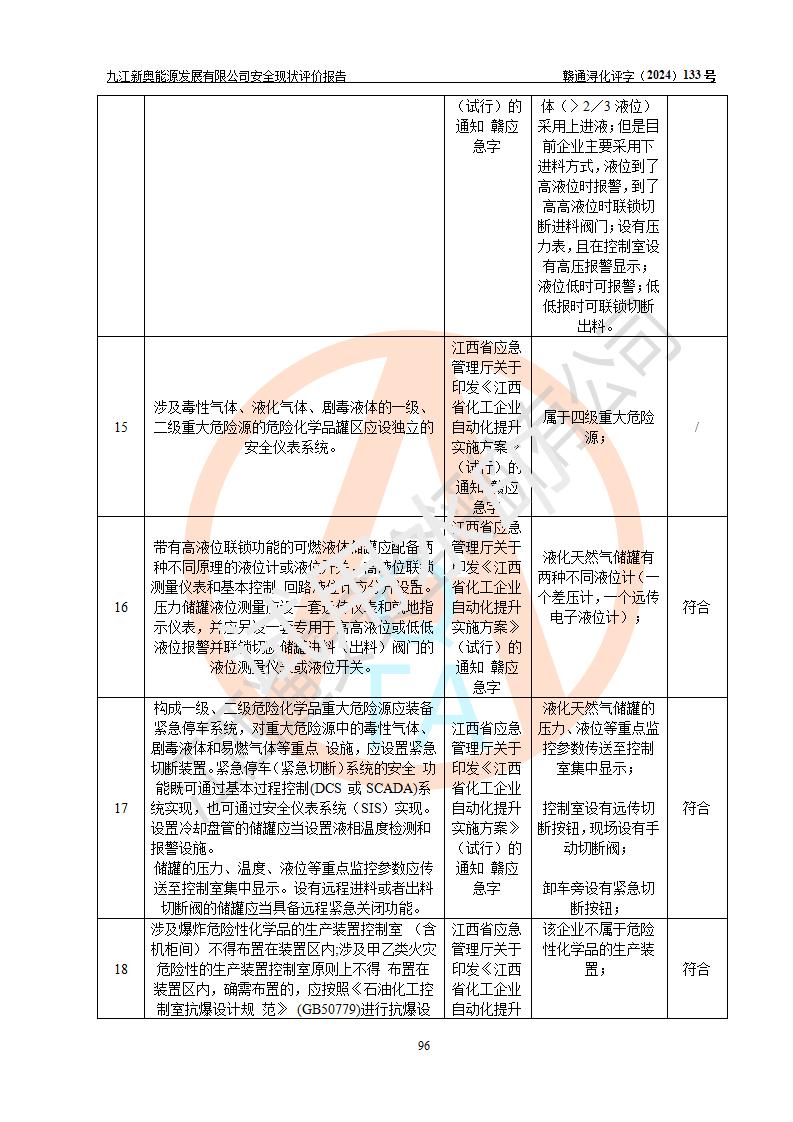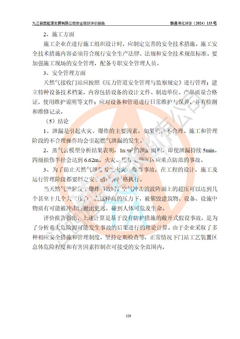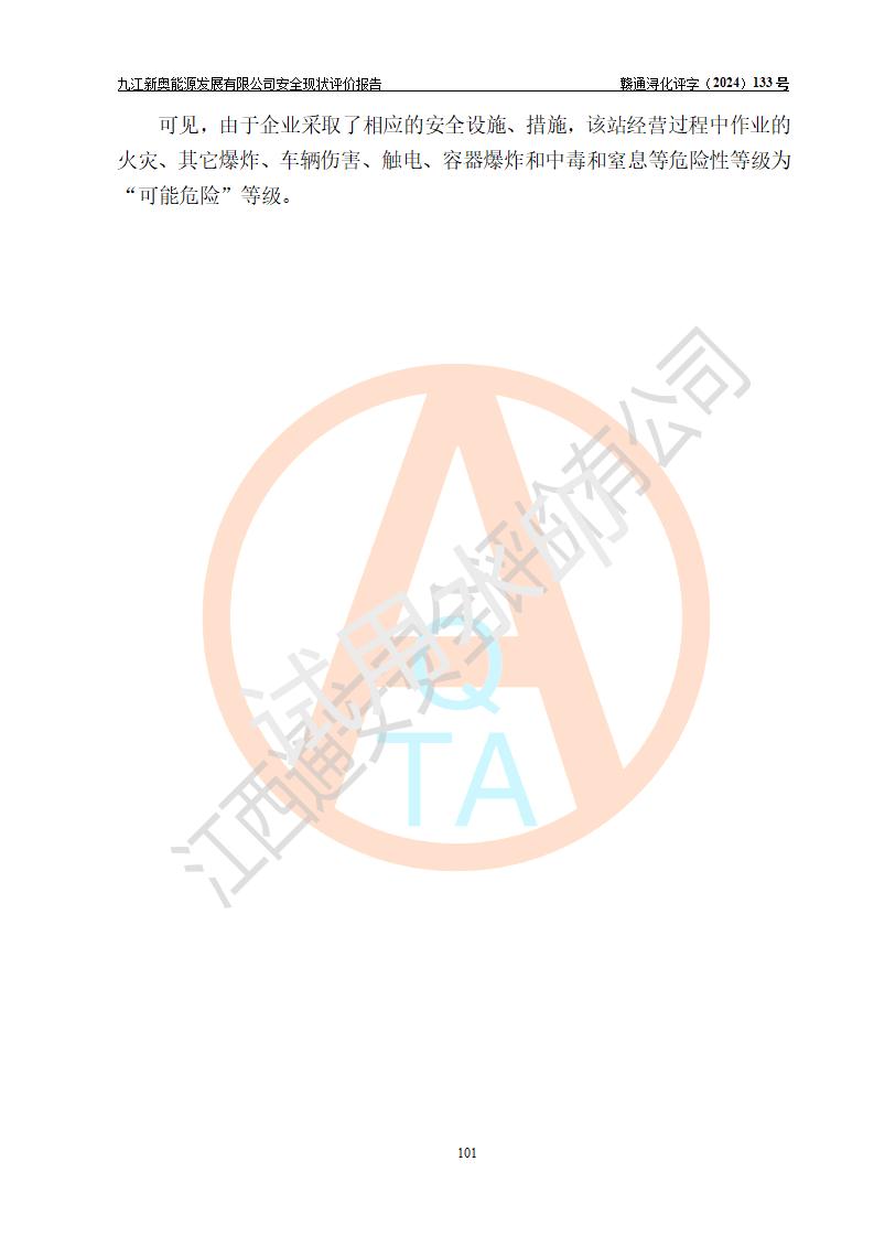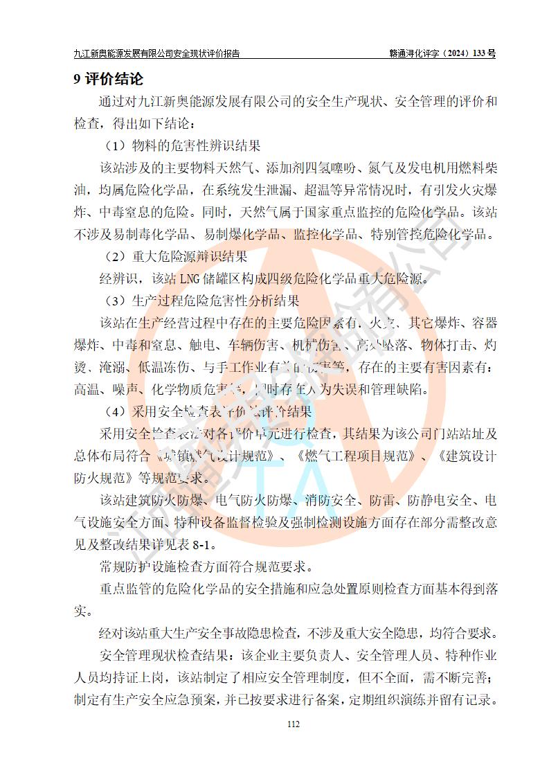 评价结论 | 九江新奥能源发展有限公司配套的安全设施及安全生产管理符合有关法规、标准规范要求,在落实本报告提出的安全对策措施与建议后,其风险可控,能达到可以接受的程度,可满足安全生产条件。 | ||||||