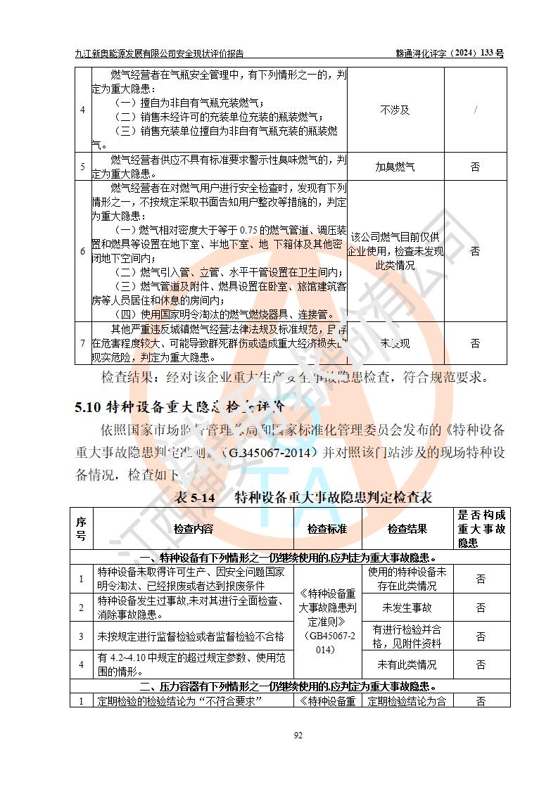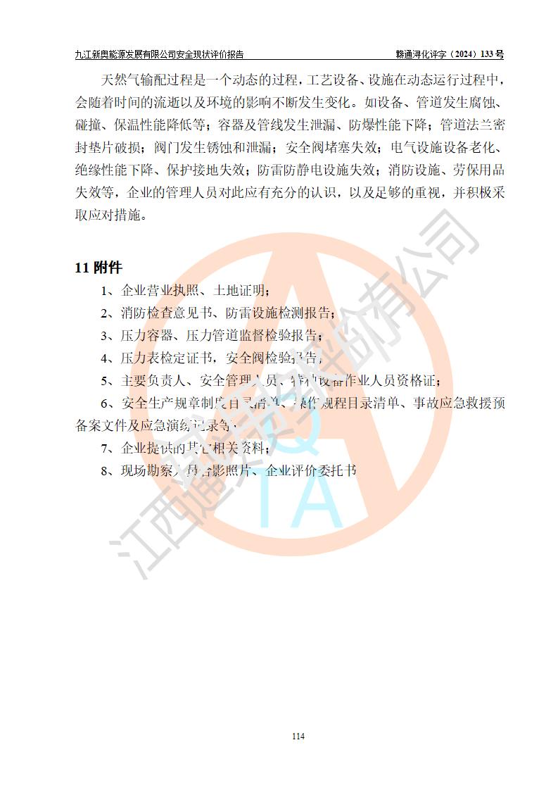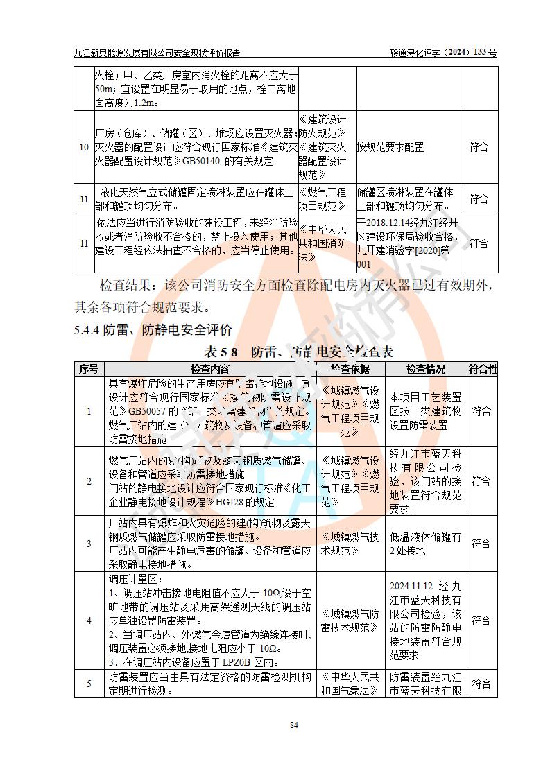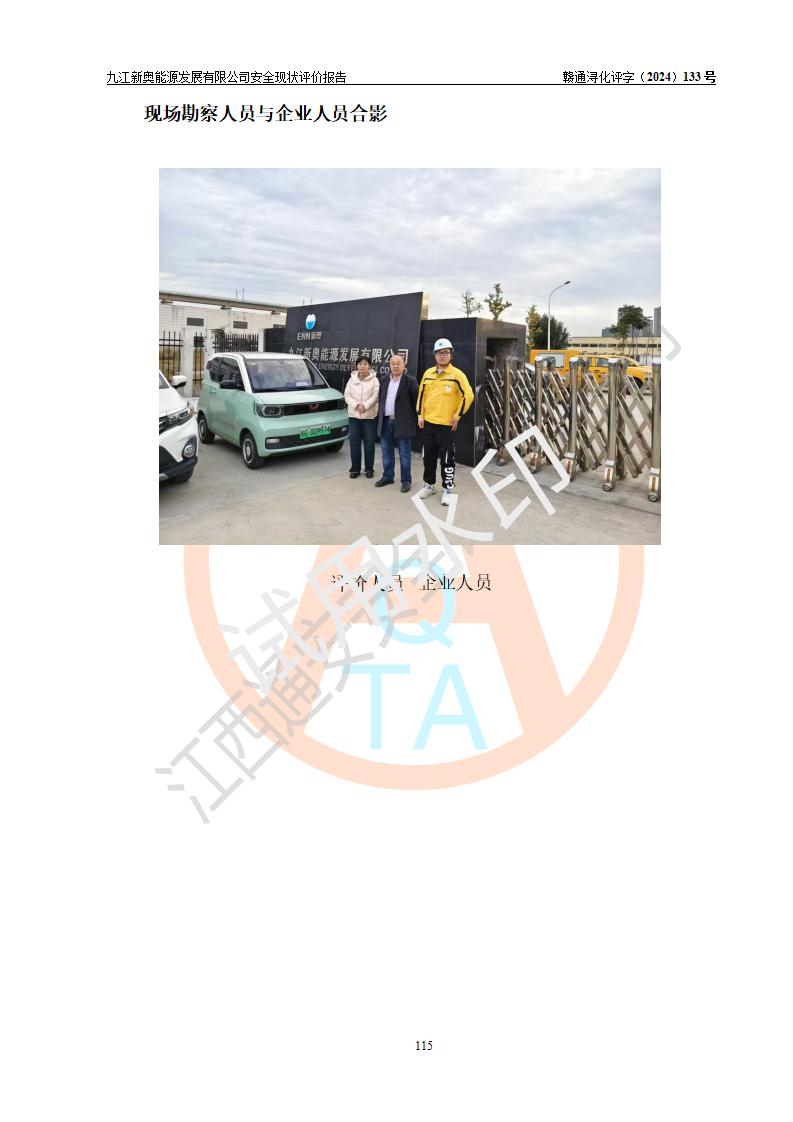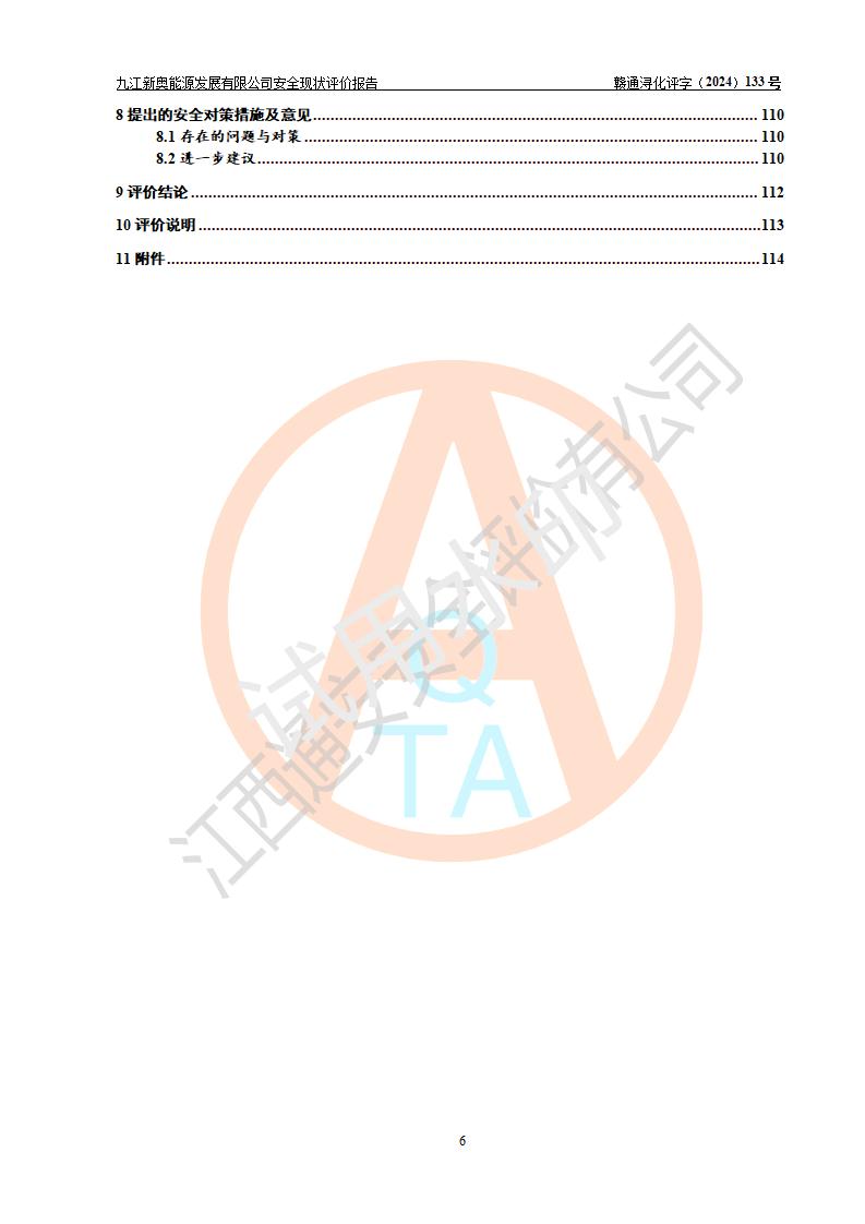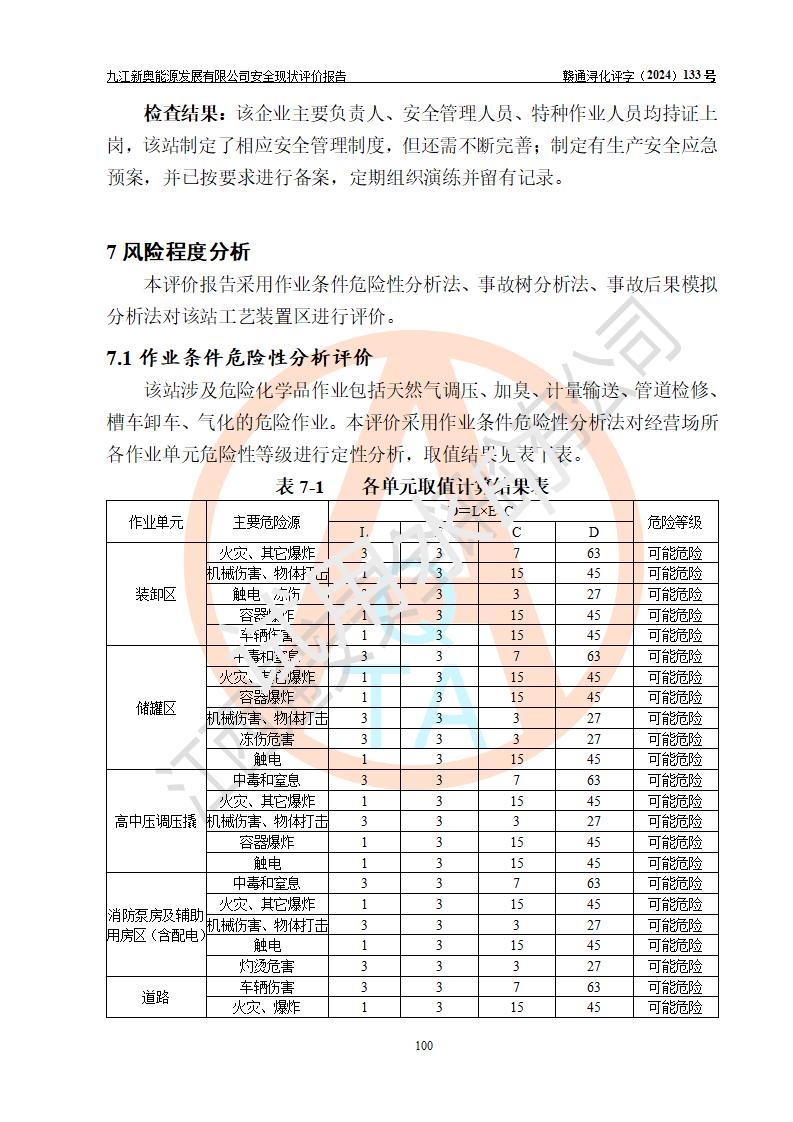 评价结论 | 九江新奥能源发展有限公司配套的安全设施及安全生产管理符合有关法规、标准规范要求,在落实本报告提出的安全对策措施与建议后,其风险可控,能达到可以接受的程度,可满足安全生产条件。 | ||||||