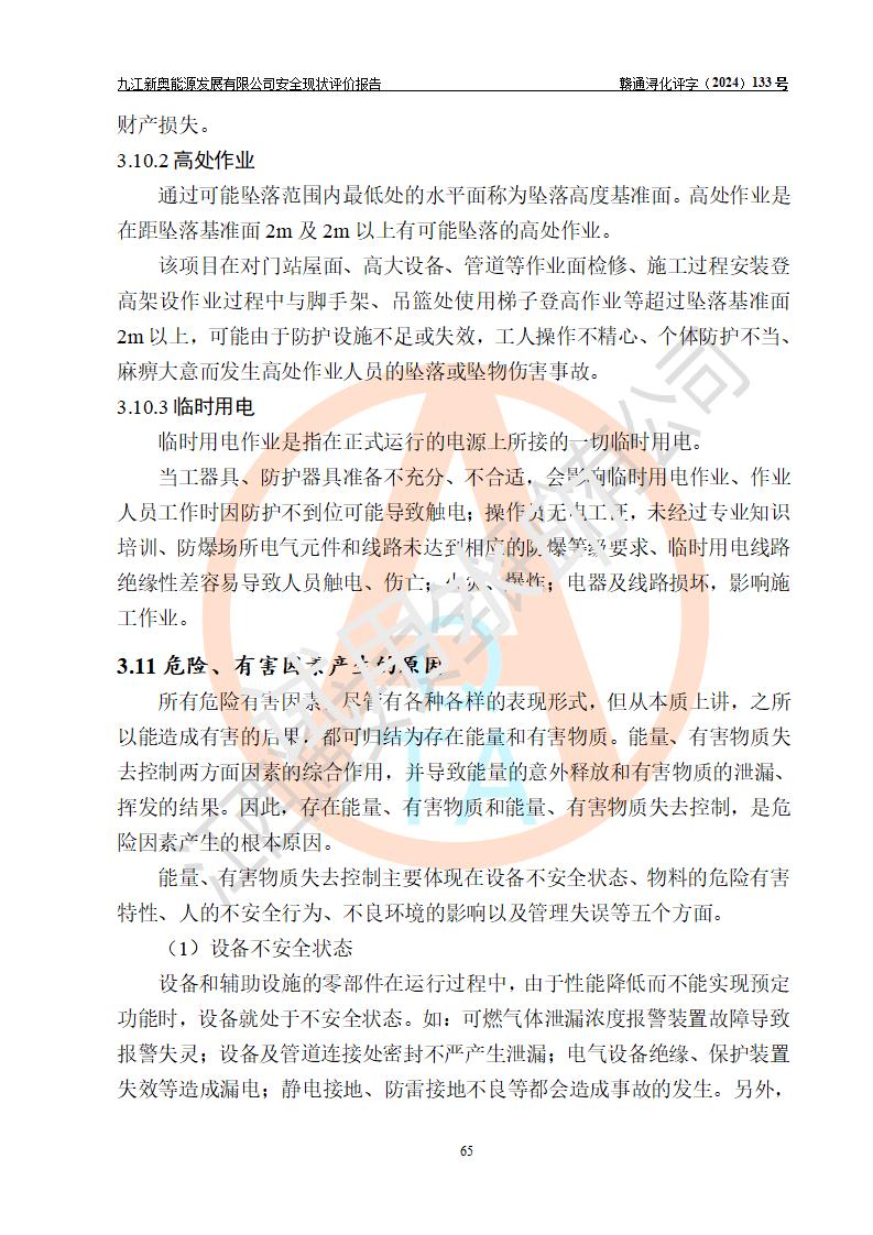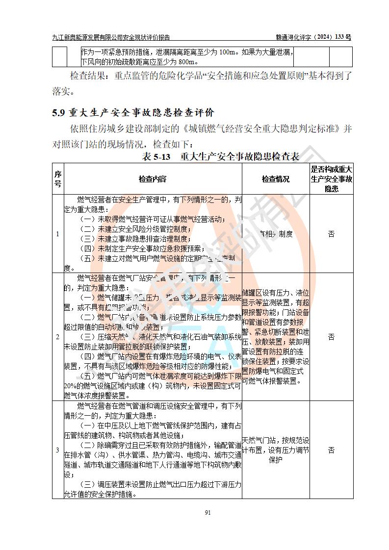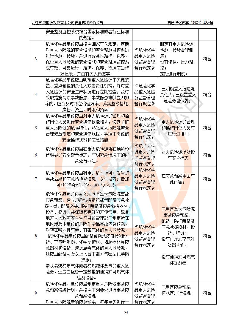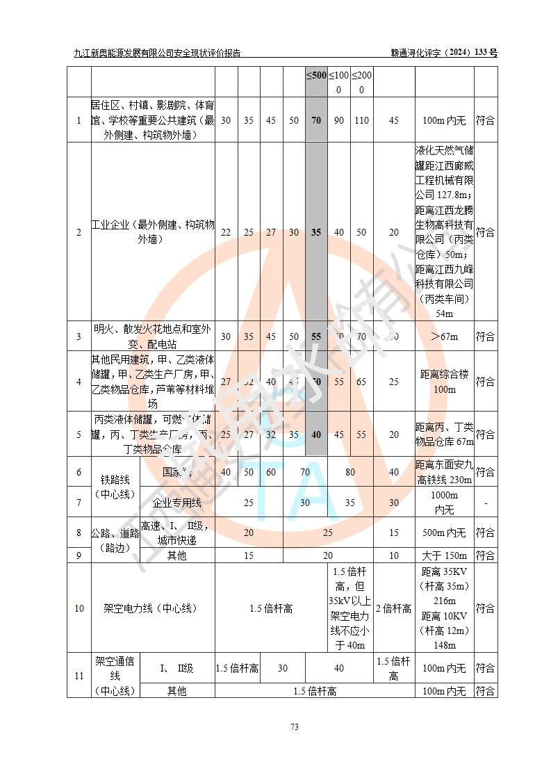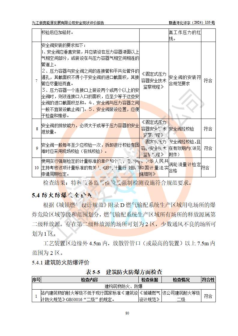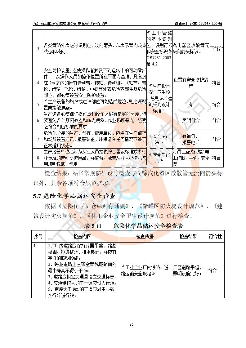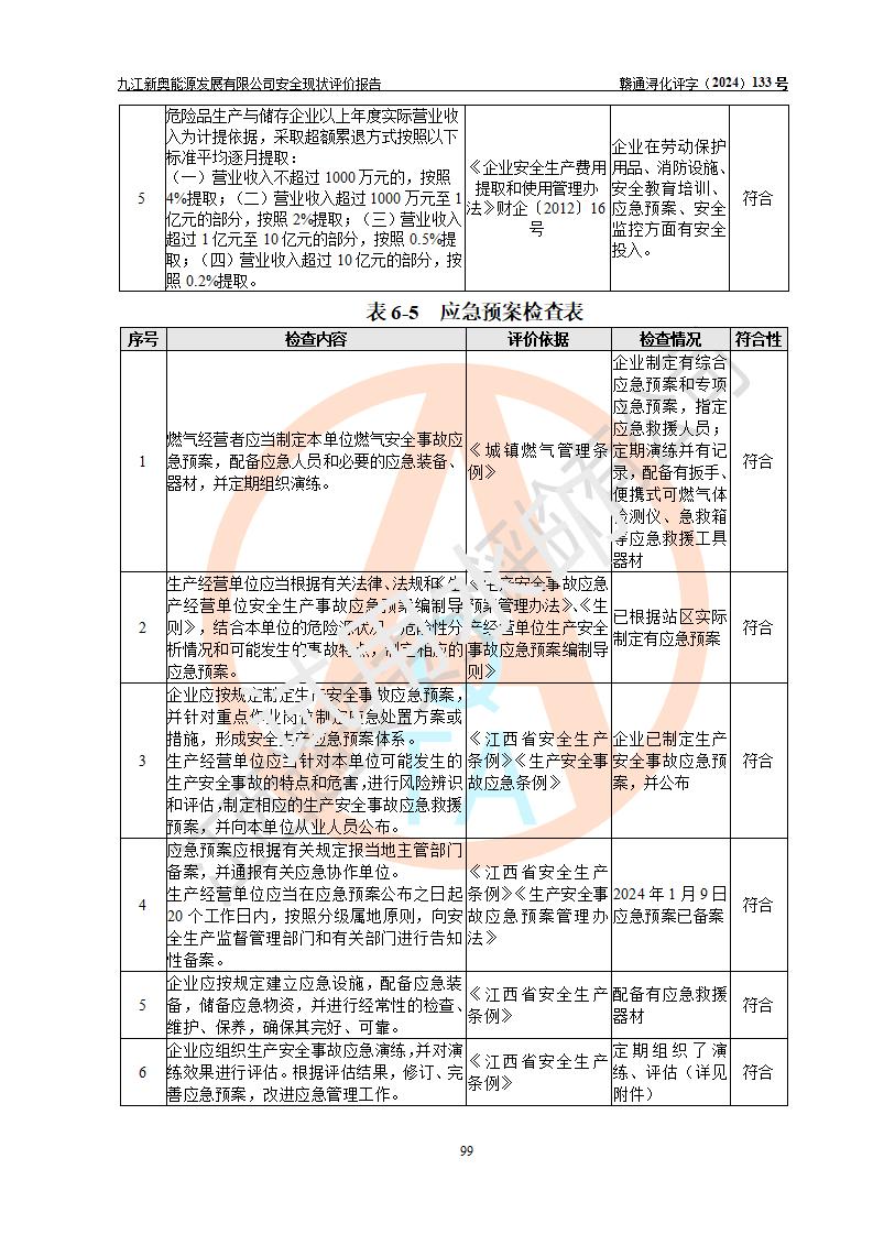 评价结论 | 九江新奥能源发展有限公司配套的安全设施及安全生产管理符合有关法规、标准规范要求,在落实本报告提出的安全对策措施与建议后,其风险可控,能达到可以接受的程度,可满足安全生产条件。 | ||||||