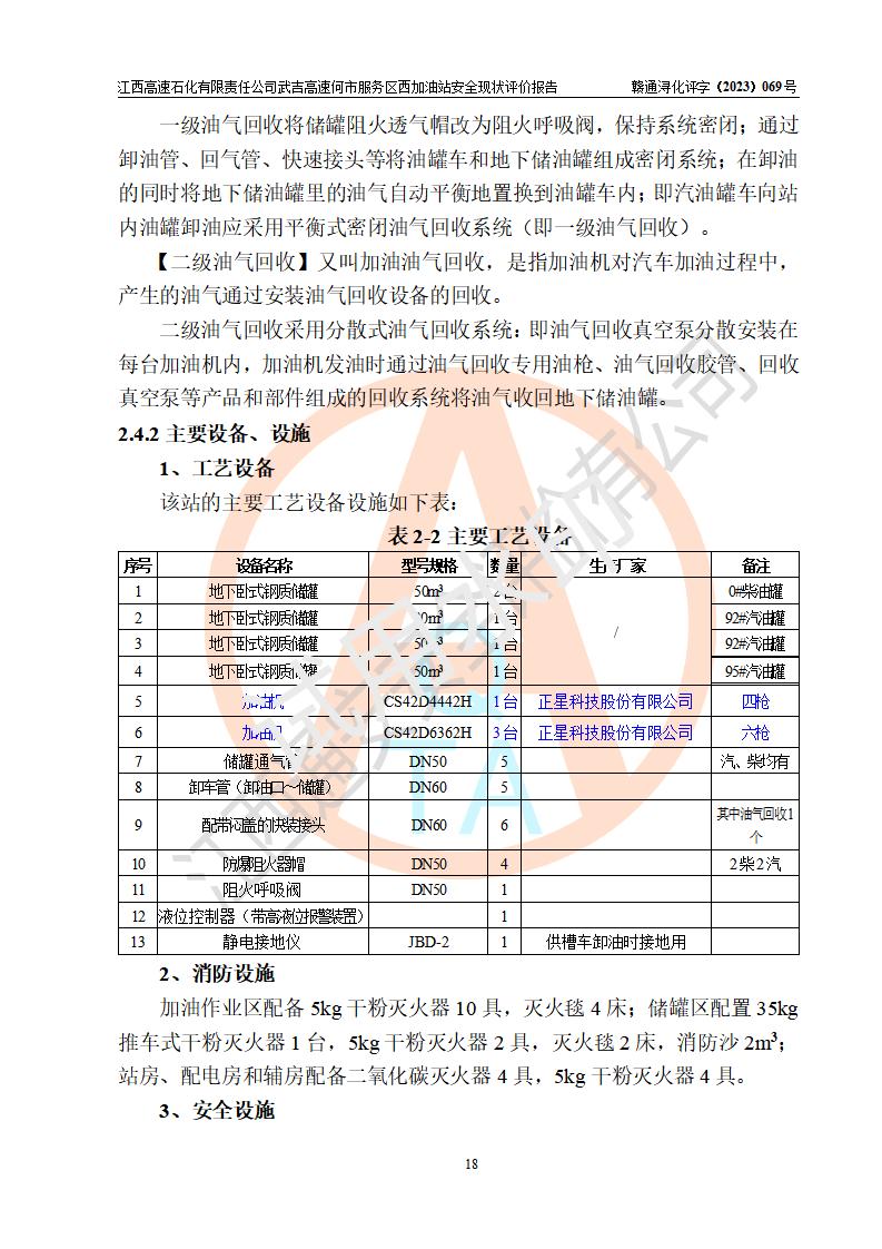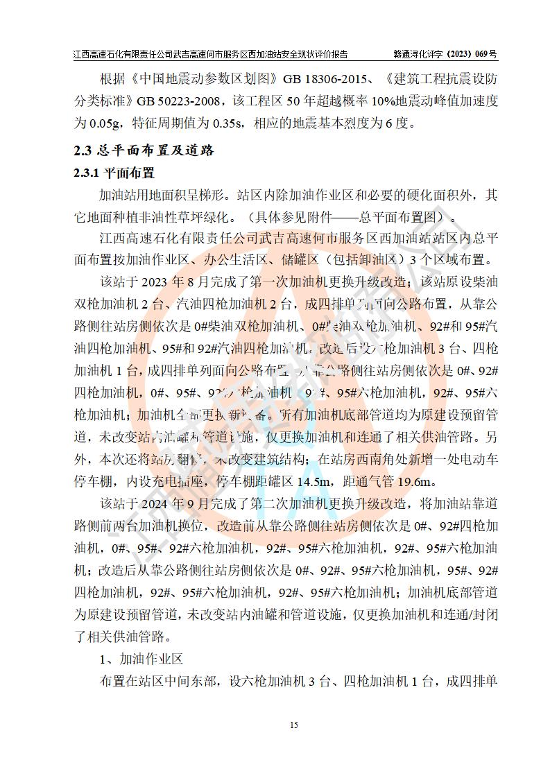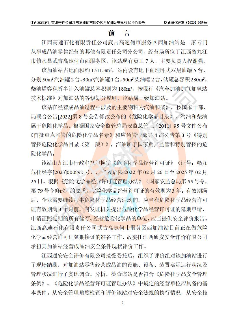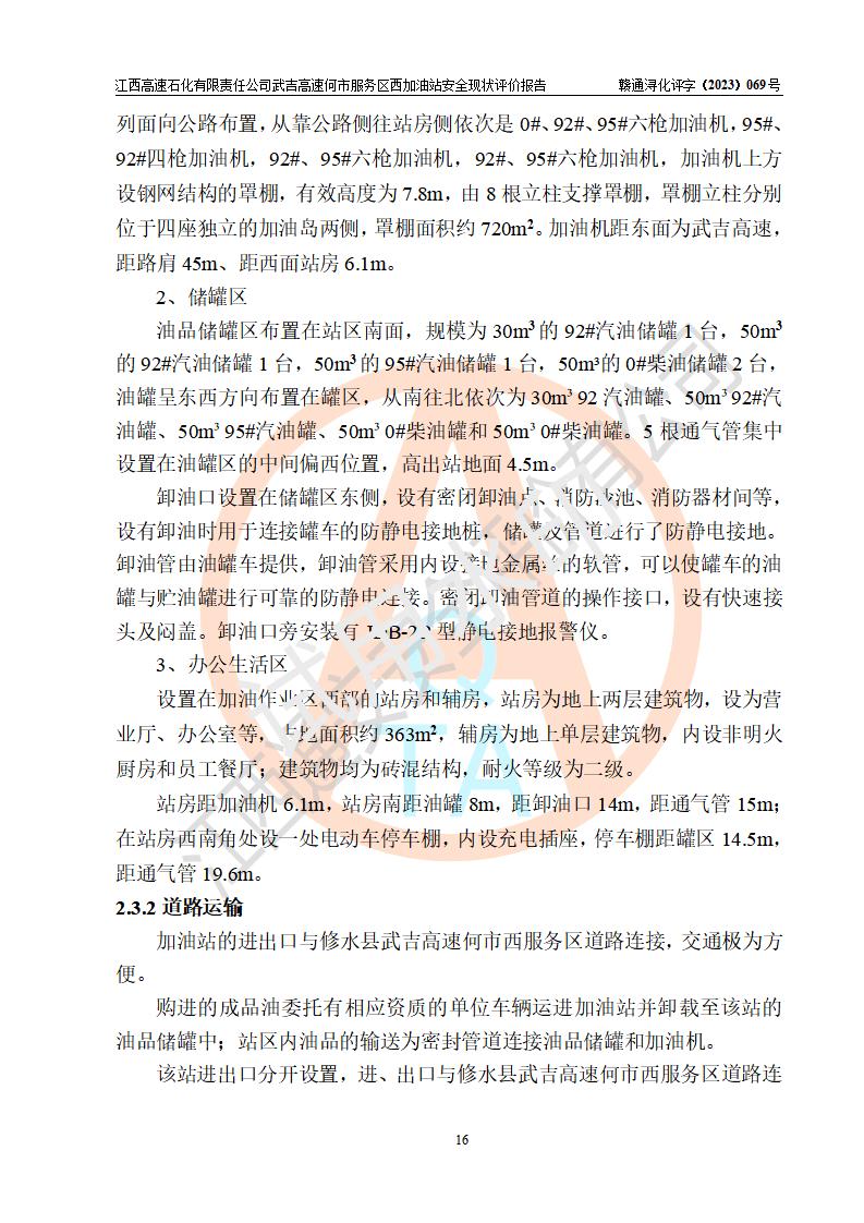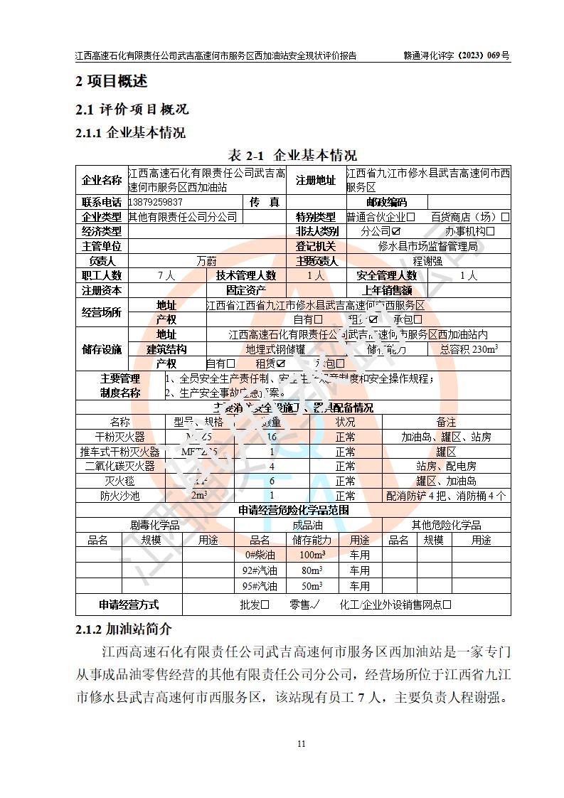 项目简介 | 江西高速石化有限责任公司武吉高速何市服务区西加油站是一家专门从事成品油零售经营的其他有限责任公司分公司,经营场所位于江西省九江市修水县武吉高速何市西服务区,该站现有员工7人,主要负责人程谢强。 该加油站占地面积约1511.3m2,站内设有地下直埋卧式双层油罐5台,分别50m3汽油罐2台、30m³汽油罐1台,50m3柴油罐2台,储罐总容积230m3,柴油罐容积折半计入油罐总容积则为180m³,按现行《汽车加油加气加氢站技术标准》对加油站的等级划分原则,该站属一级加油站。 该站由九江市行政审批局换发《危险化学品经营许可证》(证号:赣九危化经字[2023]000093号),**期限2022年02月26日至2025年02月25日。 | |||