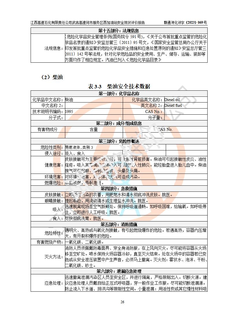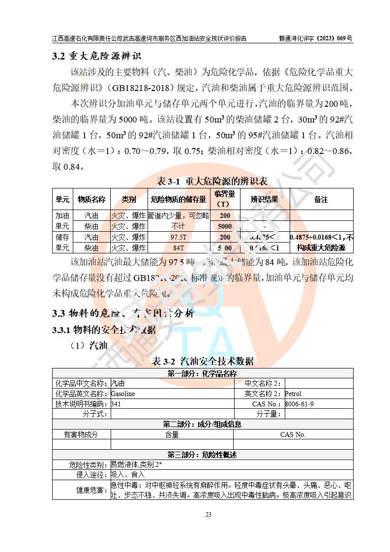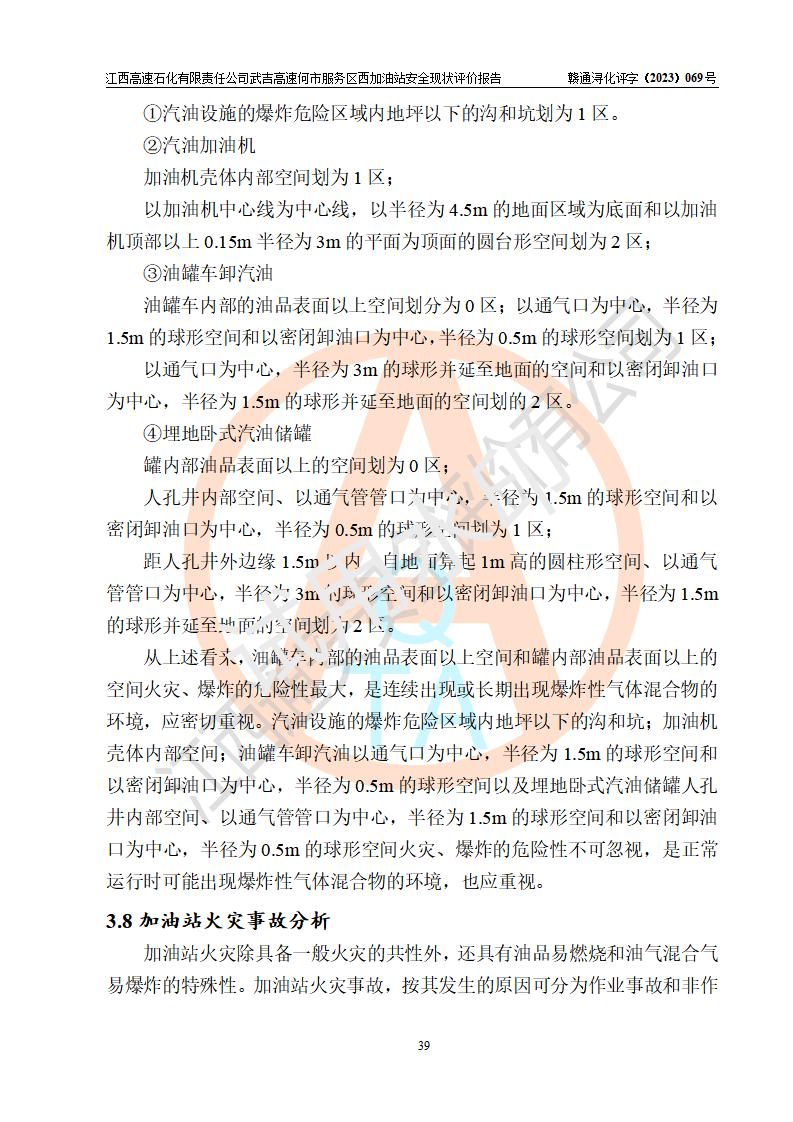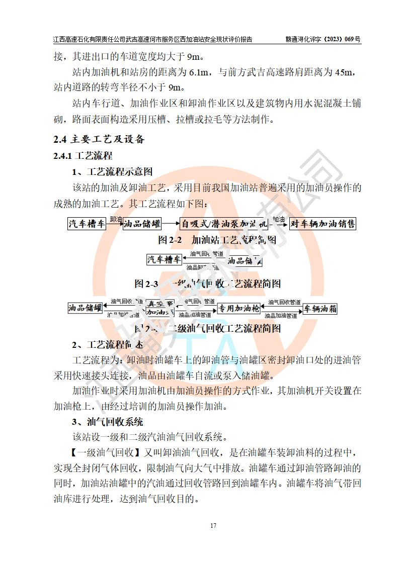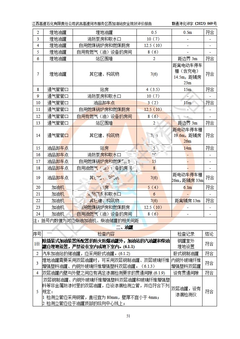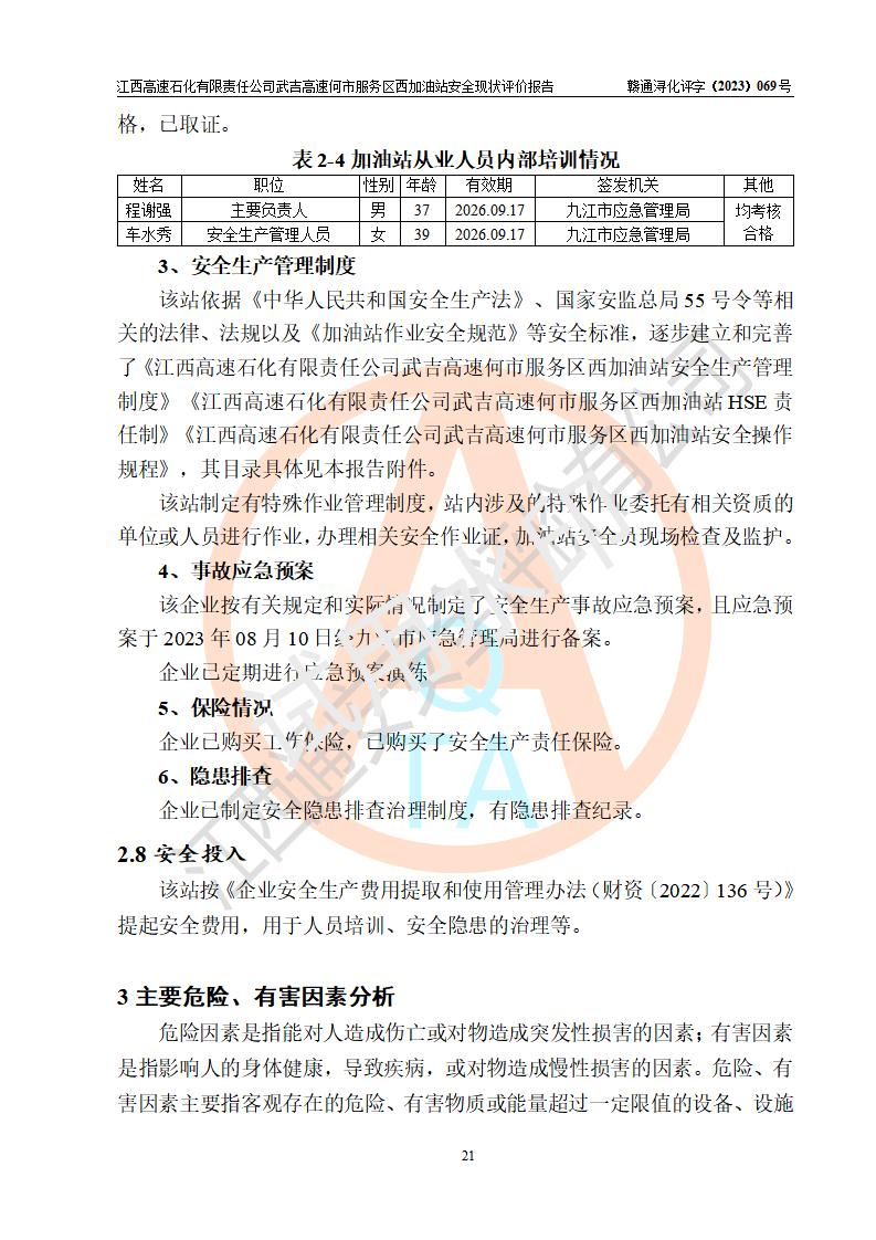 项目简介 | 江西高速石化有限责任公司武吉高速何市服务区西加油站是一家专门从事成品油零售经营的其他有限责任公司分公司,经营场所位于江西省九江市修水县武吉高速何市西服务区,该站现有员工7人,主要负责人程谢强。 该加油站占地面积约1511.3m2,站内设有地下直埋卧式双层油罐5台,分别50m3汽油罐2台、30m³汽油罐1台,50m3柴油罐2台,储罐总容积230m3,柴油罐容积折半计入油罐总容积则为180m³,按现行《汽车加油加气加氢站技术标准》对加油站的等级划分原则,该站属一级加油站。 该站由九江市行政审批局换发《危险化学品经营许可证》(证号:赣九危化经字[2023]000093号),**期限2022年02月26日至2025年02月25日。 | |||
