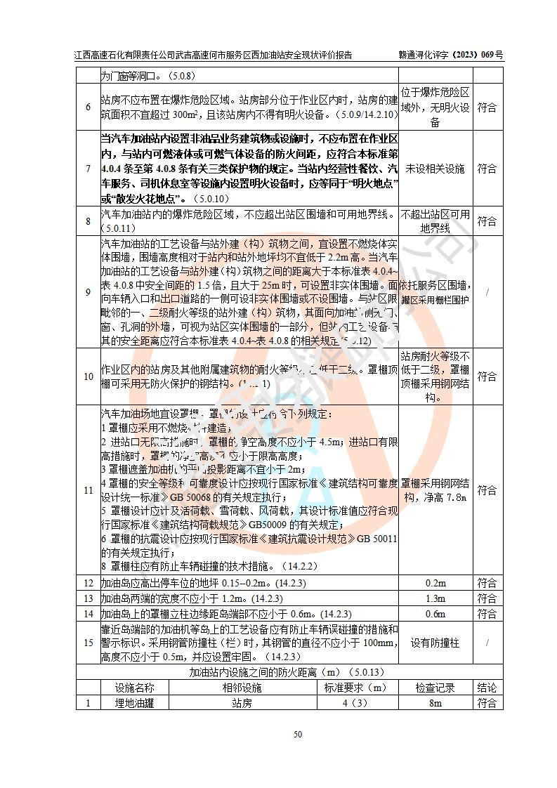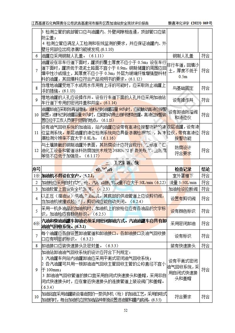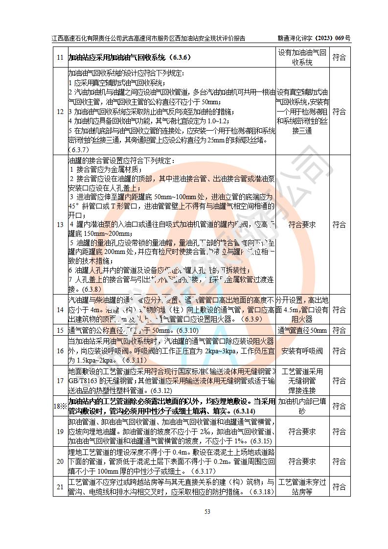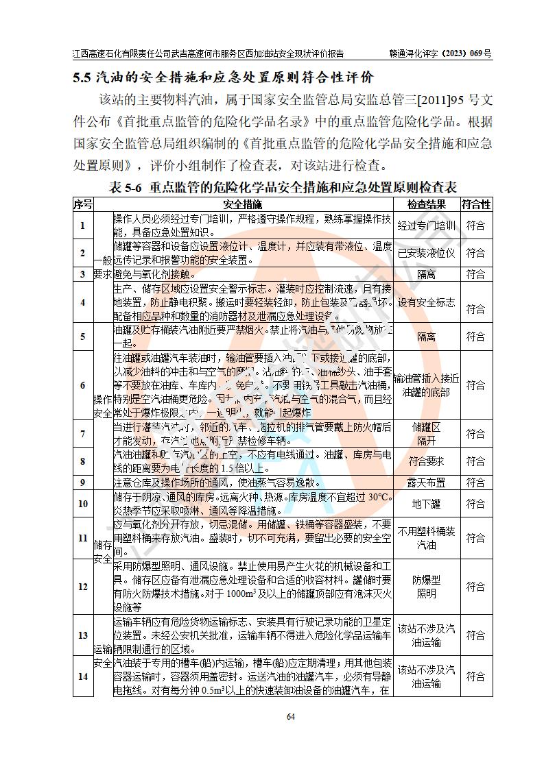评价结论 | 江西高速石化有限责任公司武吉高速何市服务区西加油站涉及的安全条件、安全经营条件、安全生产管理符合《危险化学品经营许可证管理办法》、《汽车加油加气加氢站技术标准》等**有关法规、标准、规范要求,能满足危险化学品经营安全条件。 | |||