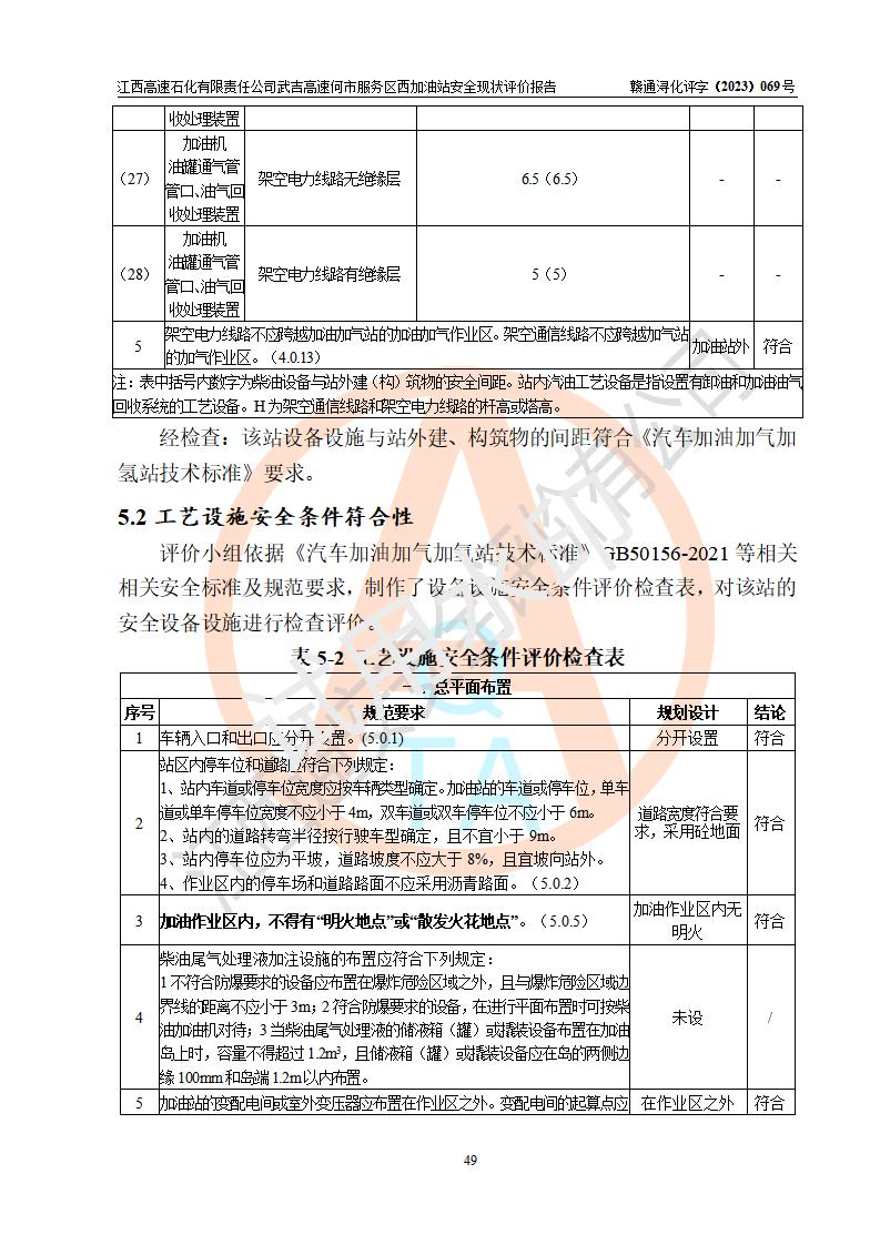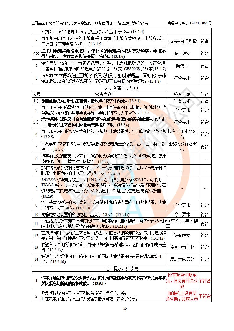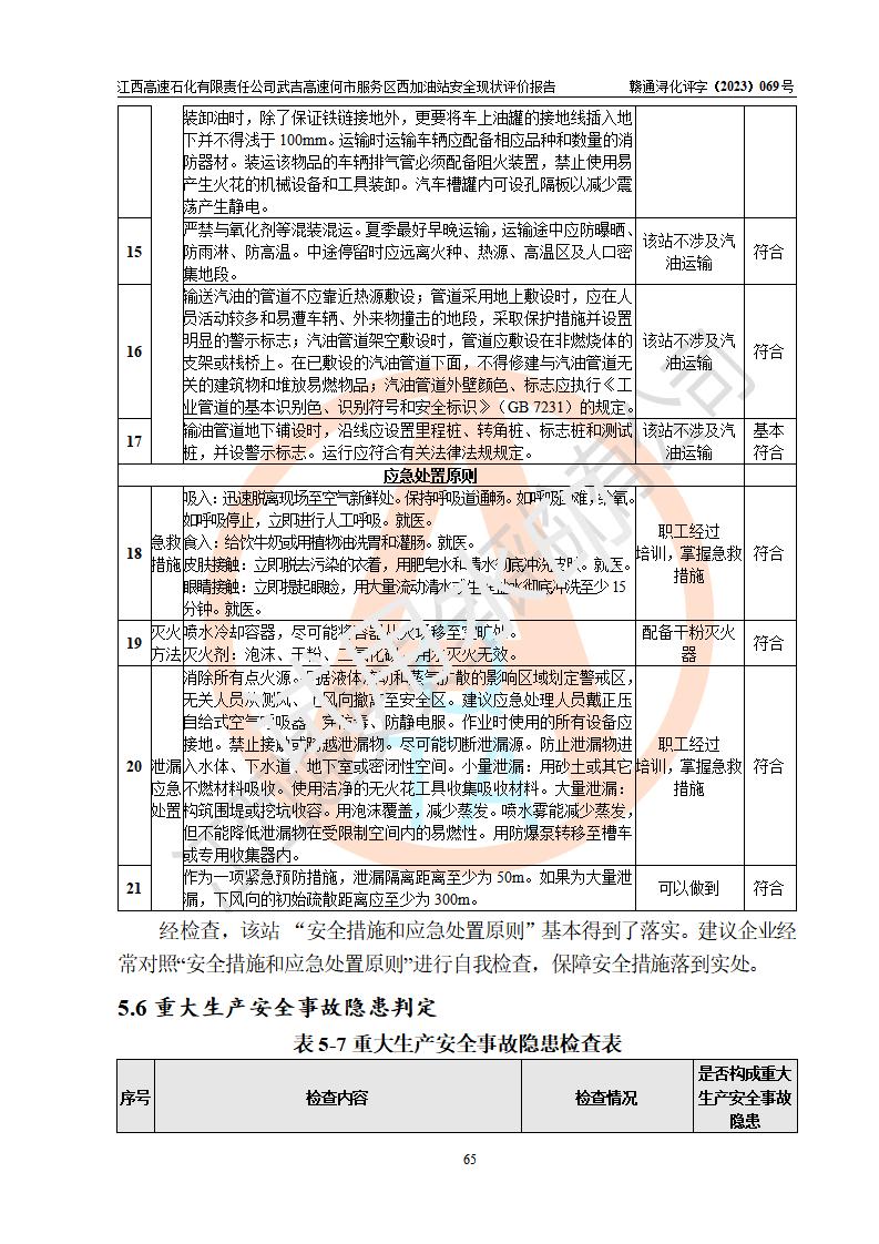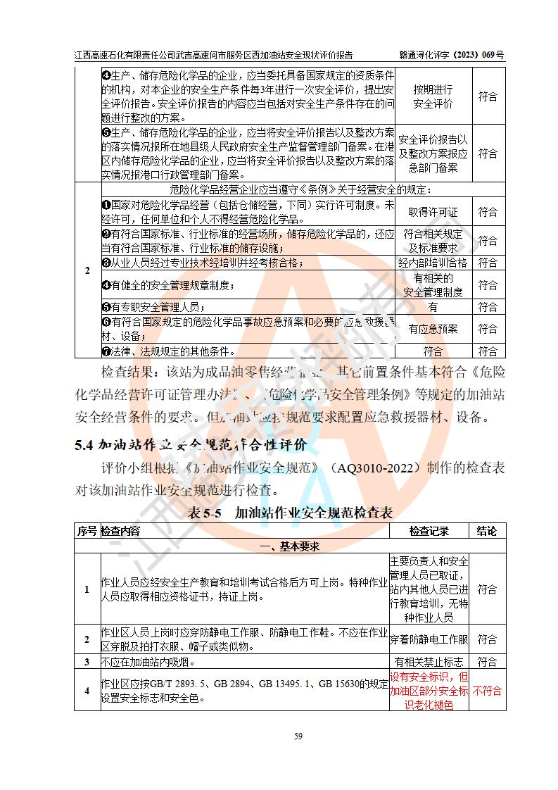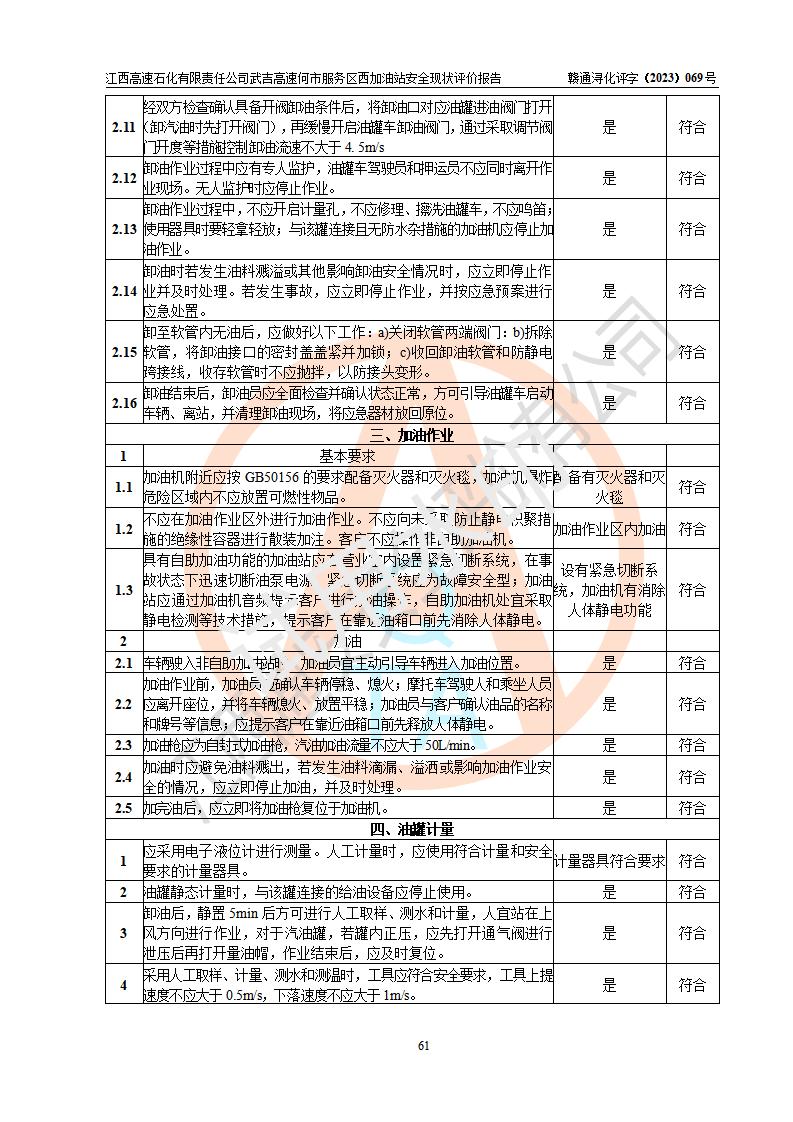 评价结论 | 江西高速石化有限责任公司武吉高速何市服务区西加油站涉及的安全条件、安全经营条件、安全生产管理符合《危险化学品经营许可证管理办法》、《汽车加油加气加氢站技术标准》等**有关法规、标准、规范要求,能满足危险化学品经营安全条件。 | |||