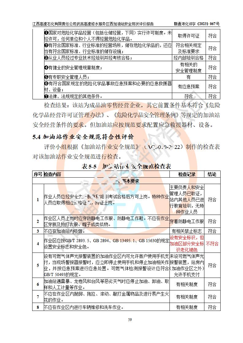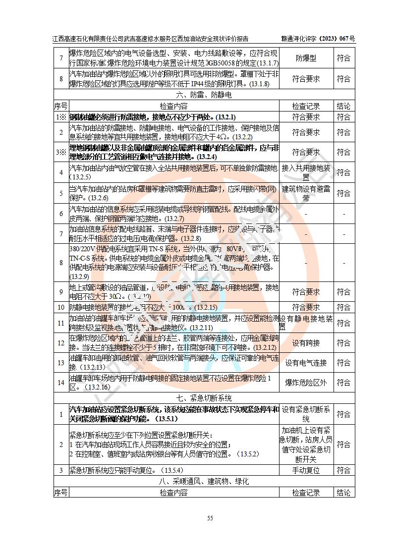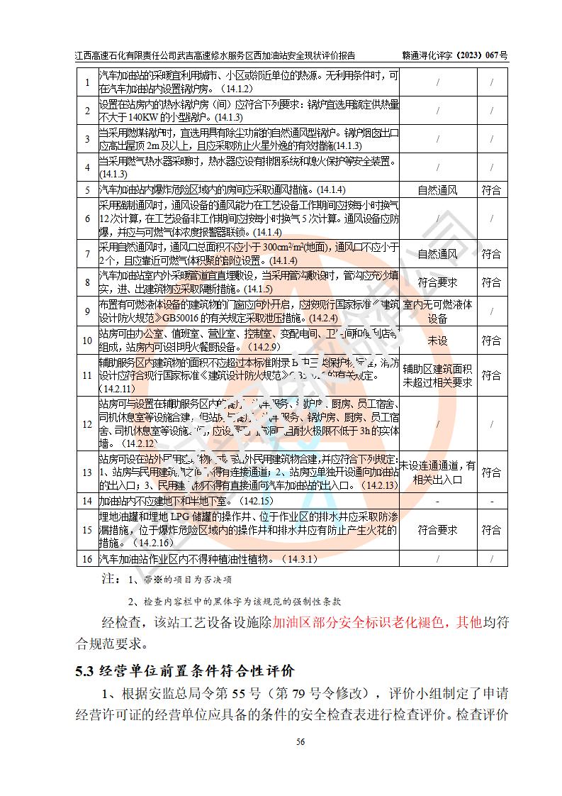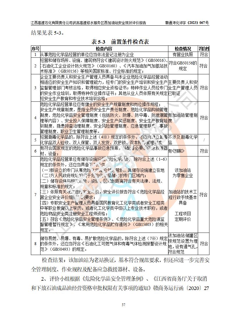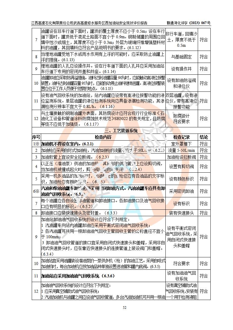 评价结论 | 江西高速石化有限责任公司武吉高速修水服务区西加油站涉及的安全条件、安全经营条件、安全生产管理符合《危险化学品经营许可证管理办法》、《汽车加油加气加氢站技术标准》等**有关法规、标准、规范要求,能满足危险化学品经营安全条件。 | |||