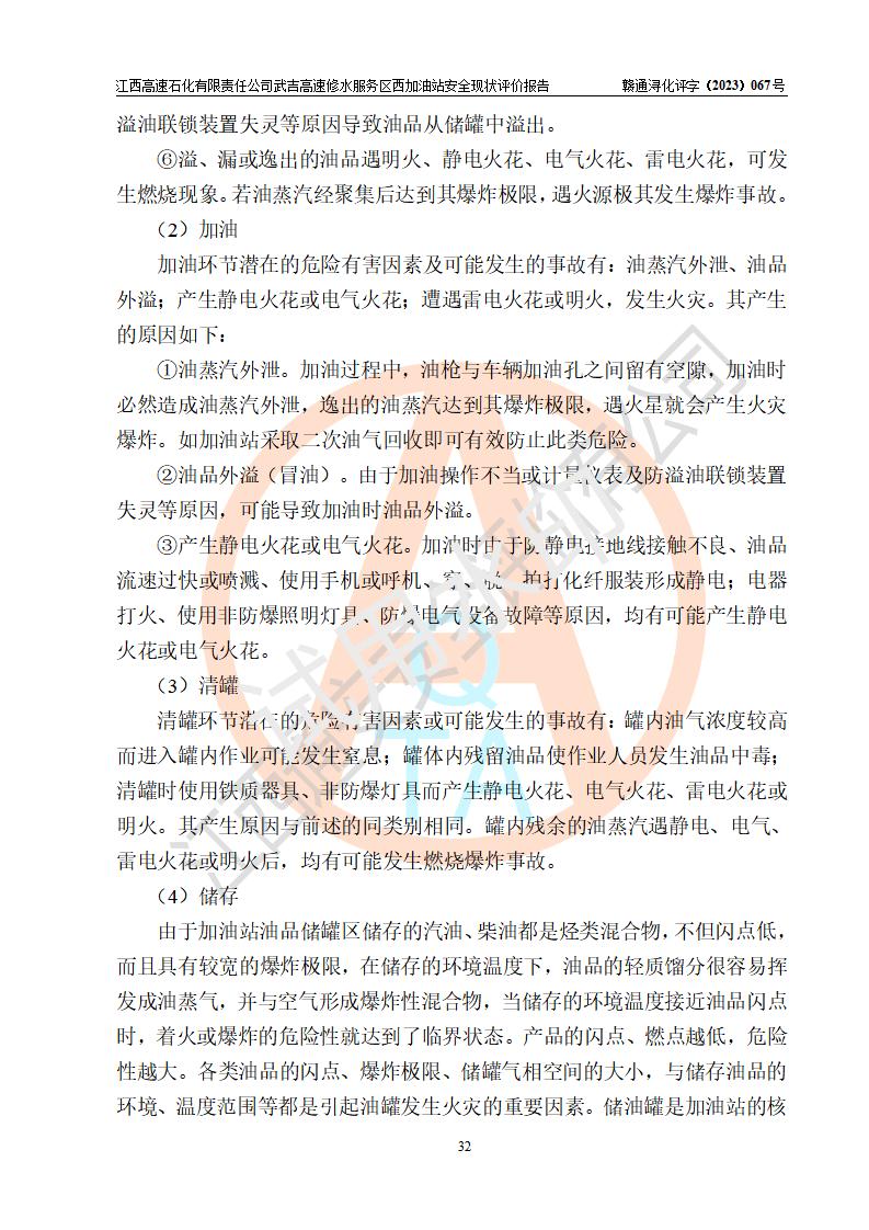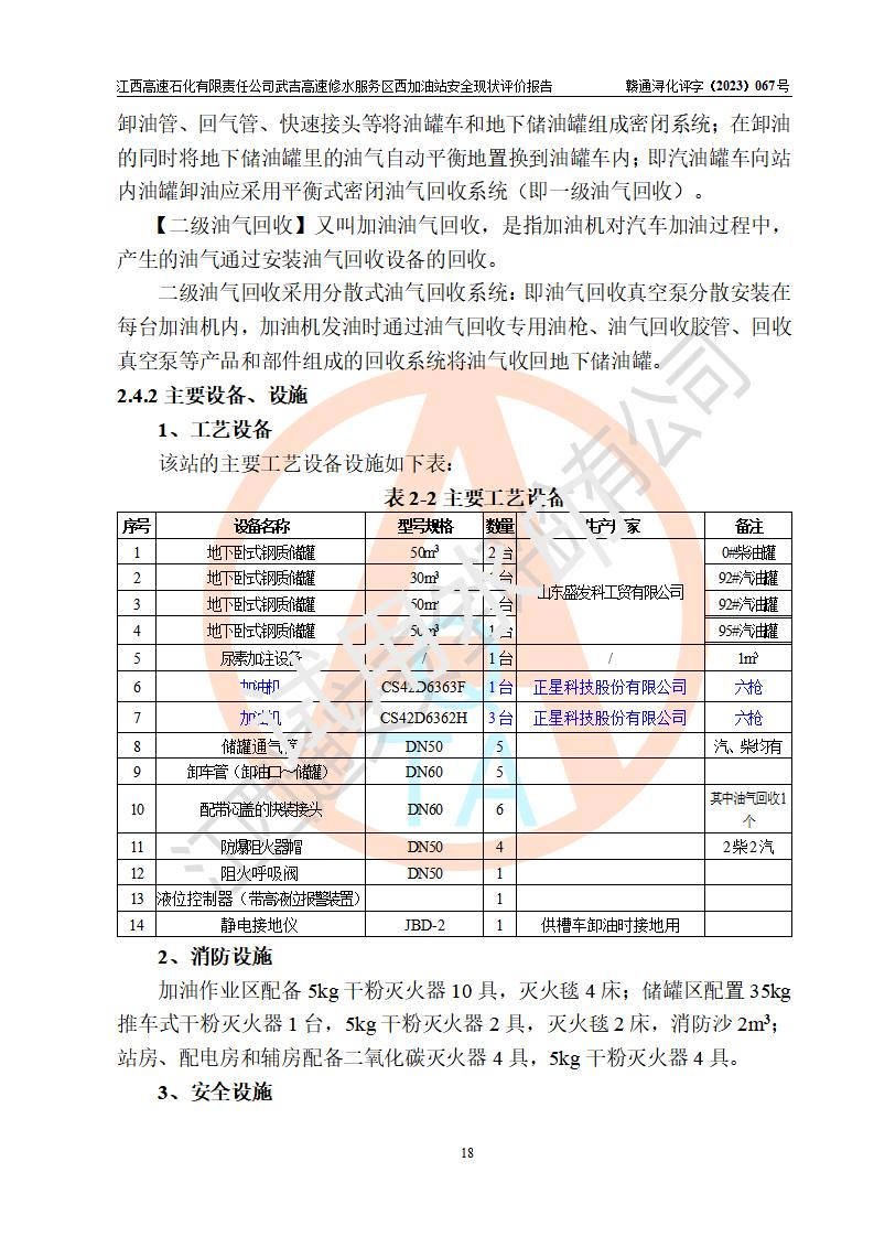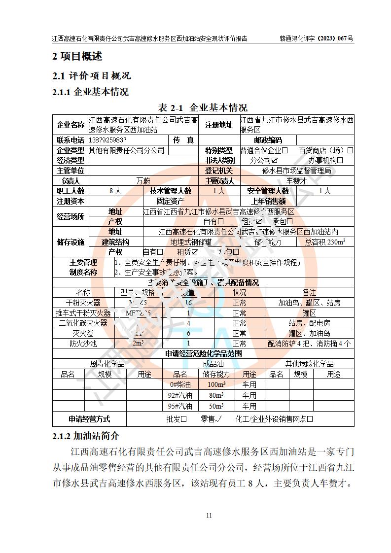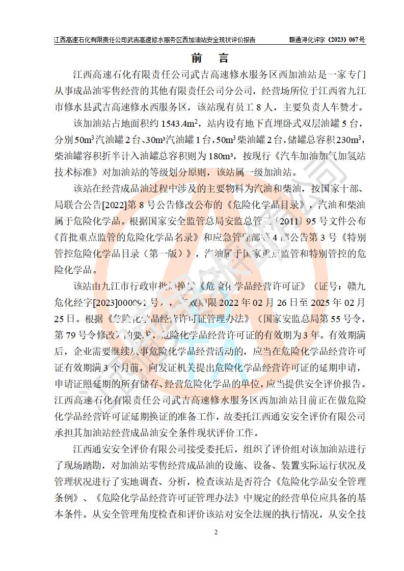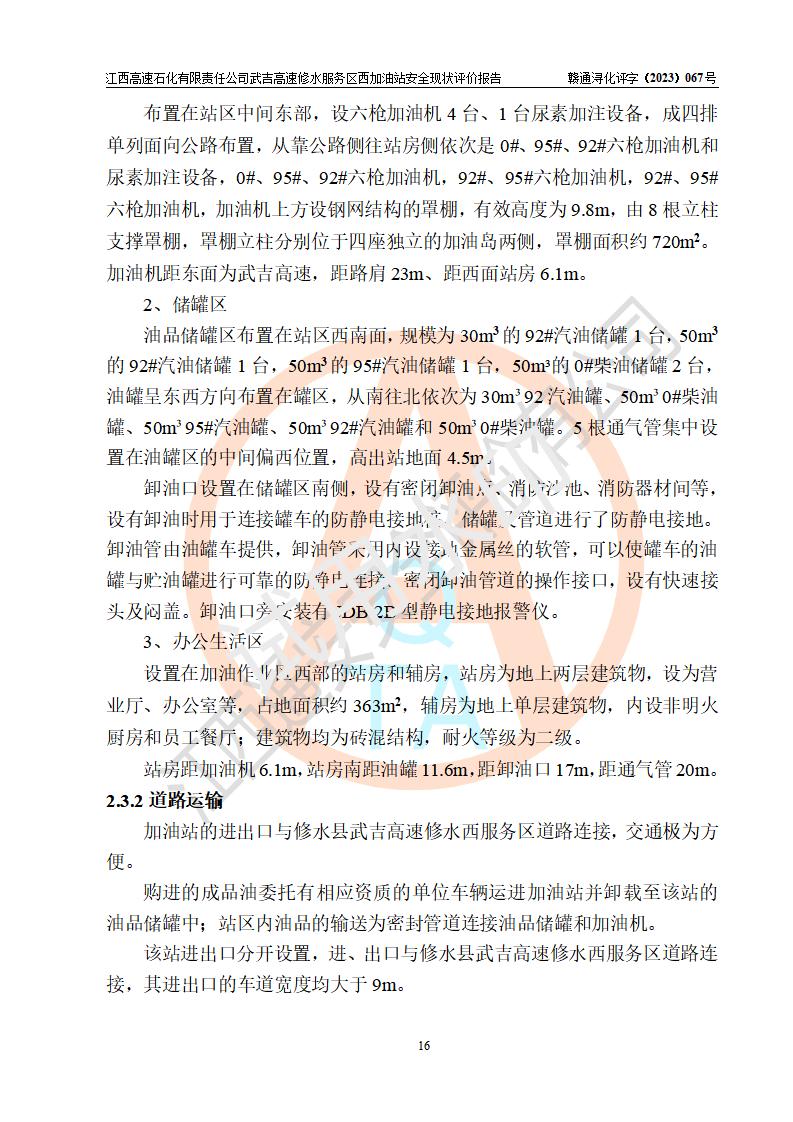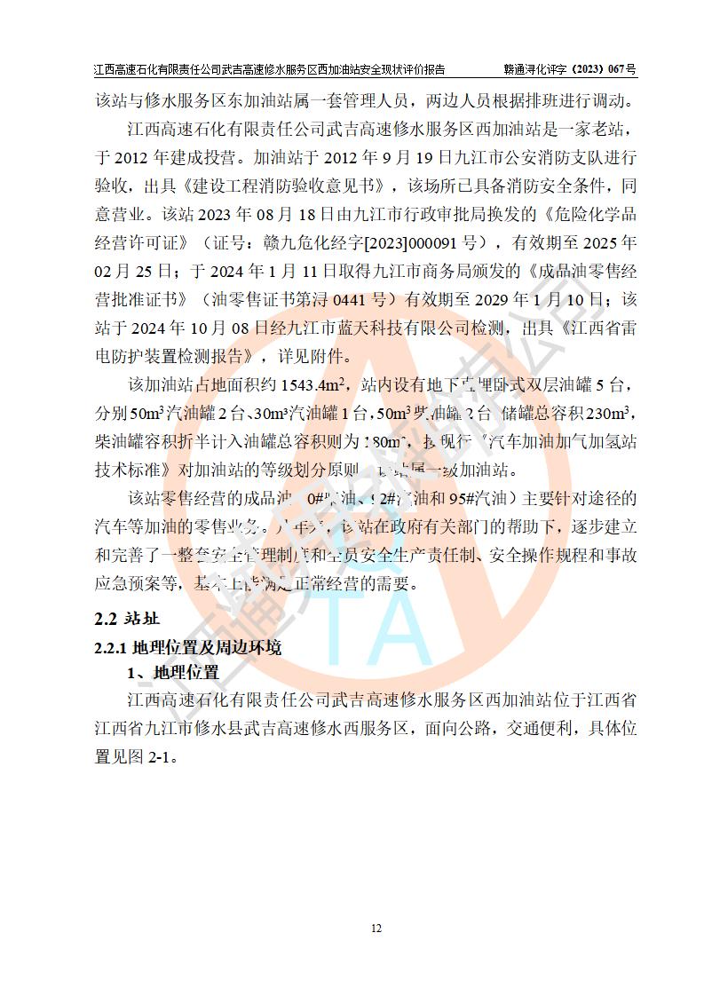 项目简介 | 江西高速石化有限责任公司武吉高速修水服务区西加油站是一家专门从事成品油零售经营的其他有限责任公司分公司,经营场所位于江西省九江市修水县武吉高速修水西服务区,该站现有员工8人,主要负责人车赞才。 该加油站占地面积约1543.4m2,站内设有地下直埋卧式双层油罐5台,分别50m3汽油罐2台、30m³汽油罐1台,50m3柴油罐2台,储罐总容积230m3,柴油罐容积折半计入油罐总容积则为180m³,按现行《汽车加油加气加氢站技术标准》对加油站的等级划分原则,该站属**加油站。 该站由九江市行政审批局换发《危险化学品经营许可证》(证号:赣九危化经字[2023]000091号),**期限2022年02月26日至2025年02月25日。 | |||