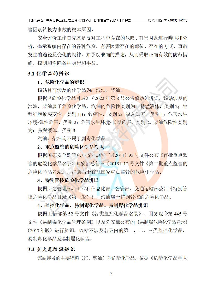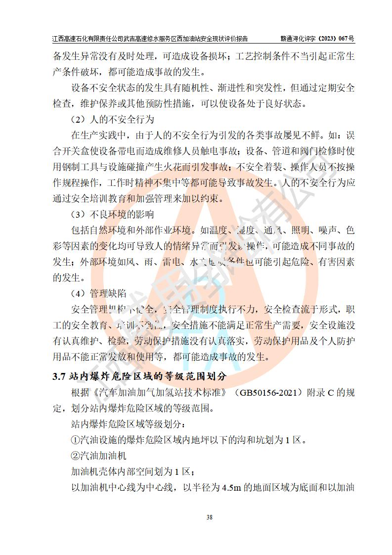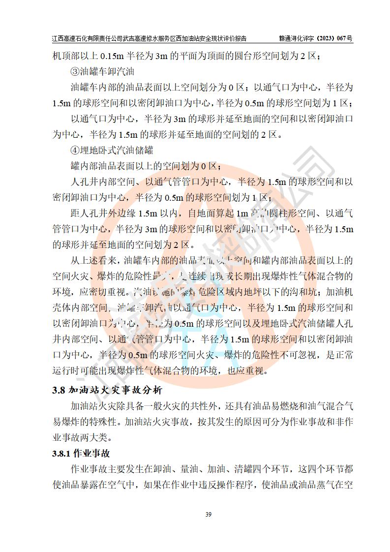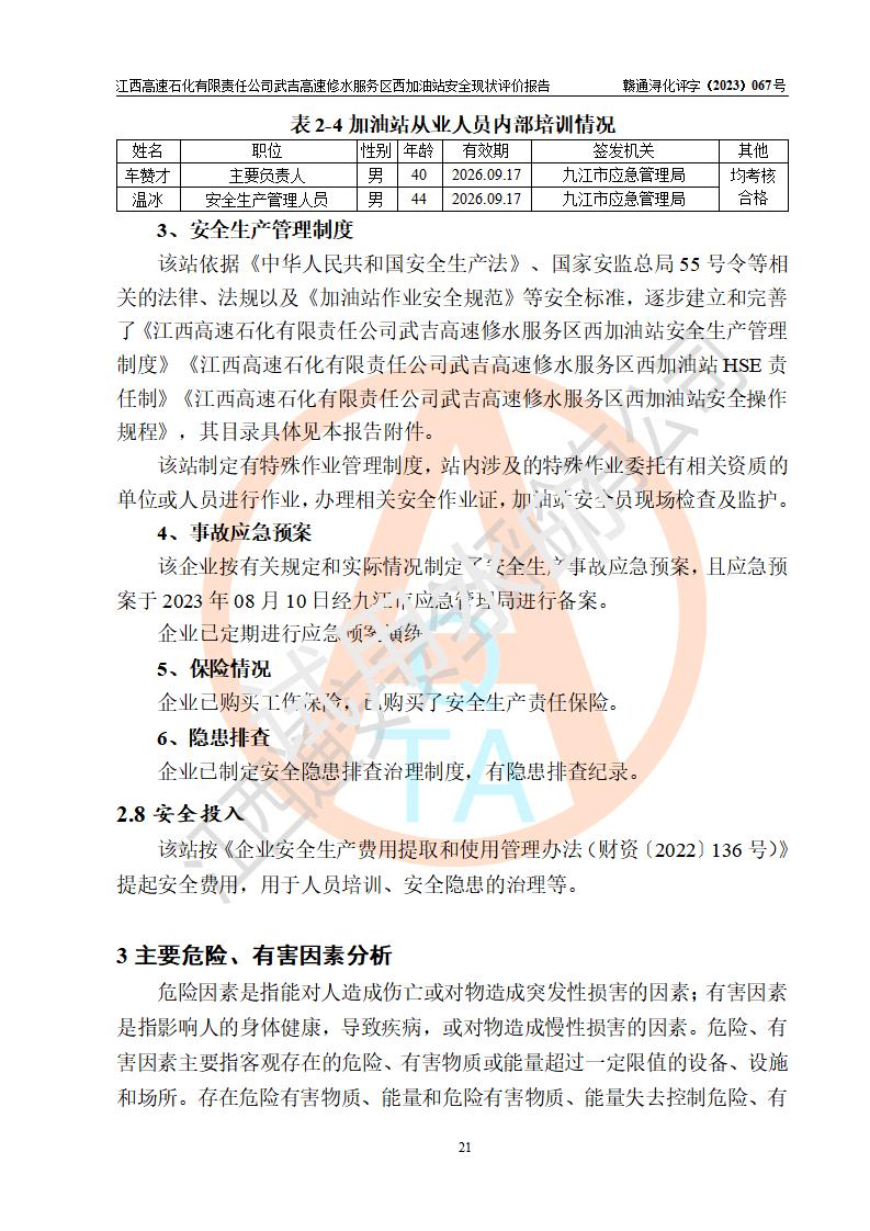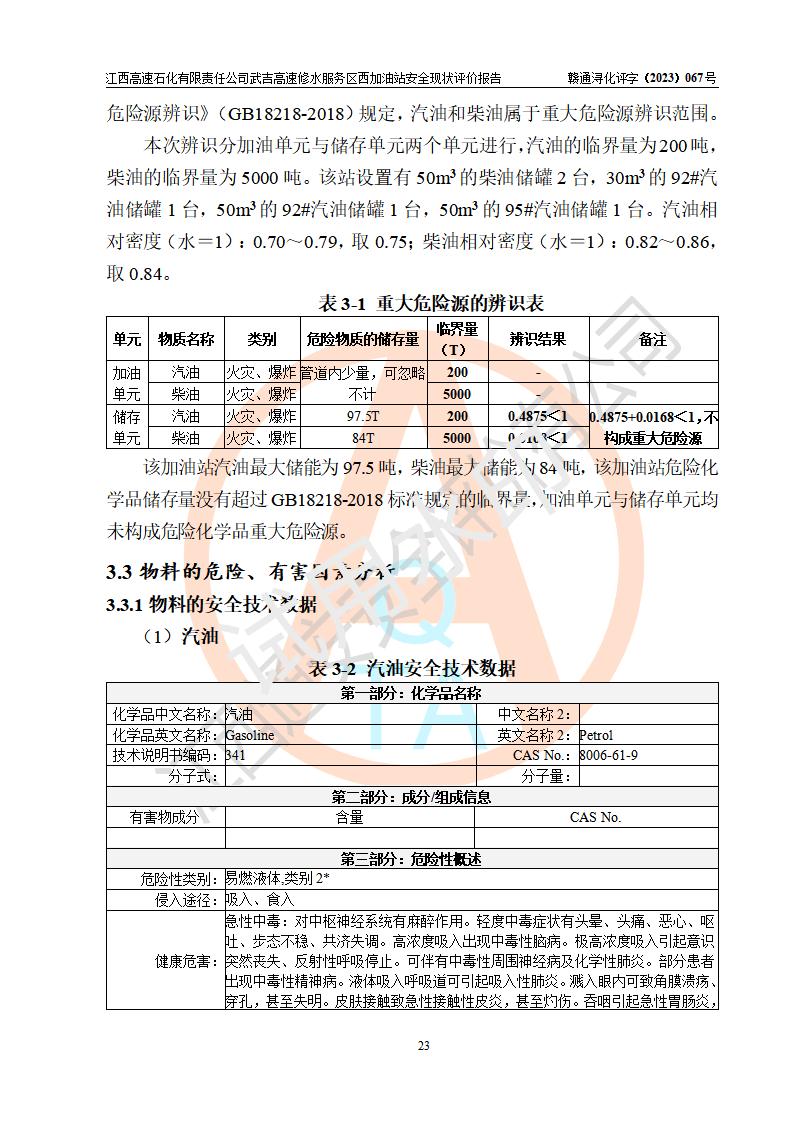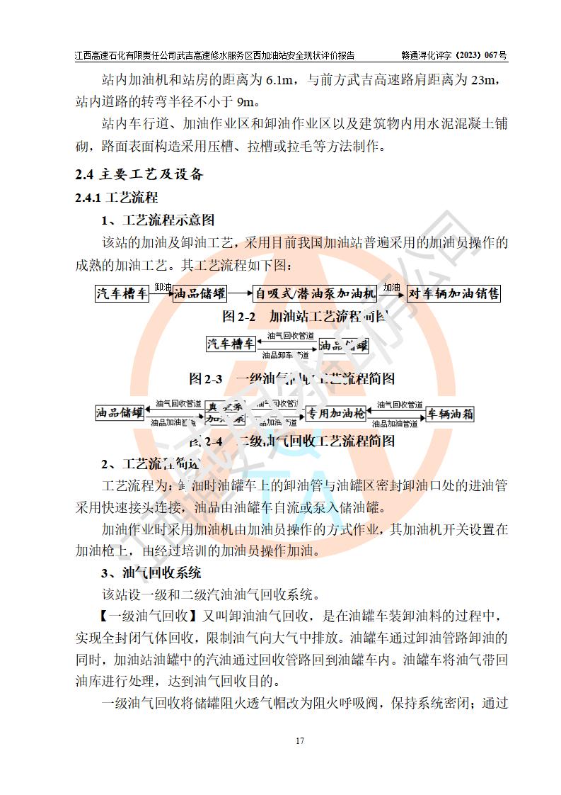 项目简介 | 江西高速石化有限责任公司武吉高速修水服务区西加油站是一家专门从事成品油零售经营的其他有限责任公司分公司,经营场所位于江西省九江市修水县武吉高速修水西服务区,该站现有员工8人,主要负责人车赞才。 该加油站占地面积约1543.4m2,站内设有地下直埋卧式双层油罐5台,分别50m3汽油罐2台、30m³汽油罐1台,50m3柴油罐2台,储罐总容积230m3,柴油罐容积折半计入油罐总容积则为180m³,按现行《汽车加油加气加氢站技术标准》对加油站的等级划分原则,该站属**加油站。 该站由九江市行政审批局换发《危险化学品经营许可证》(证号:赣九危化经字[2023]000091号),**期限2022年02月26日至2025年02月25日。 | |||