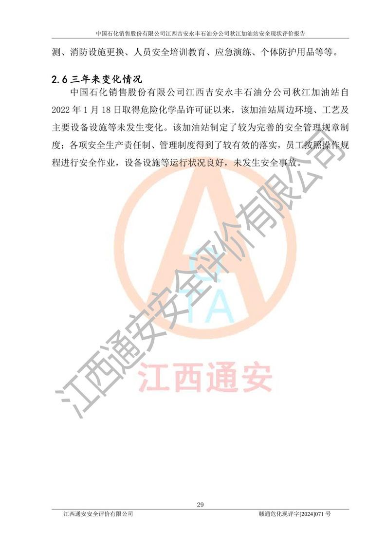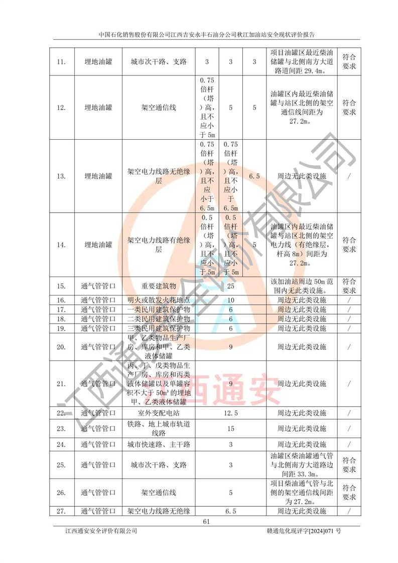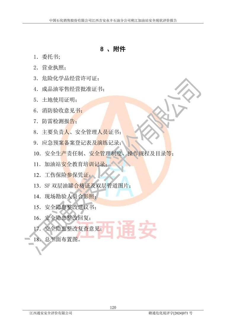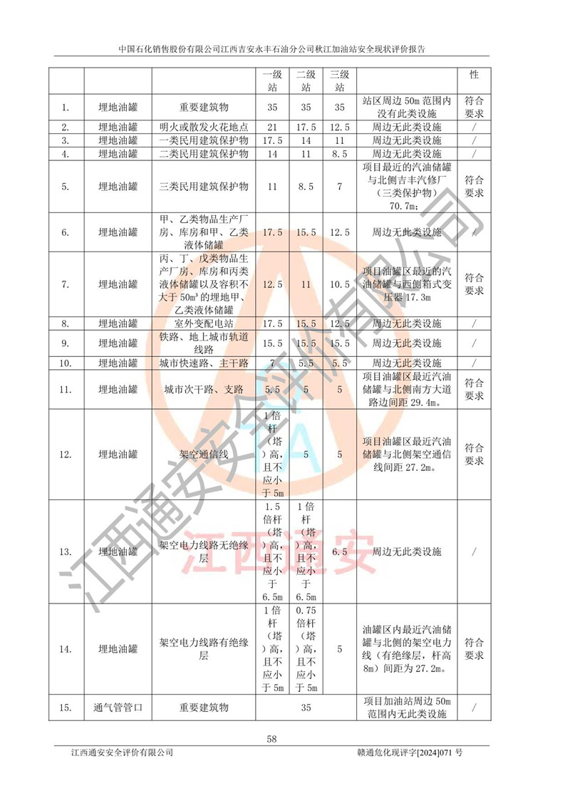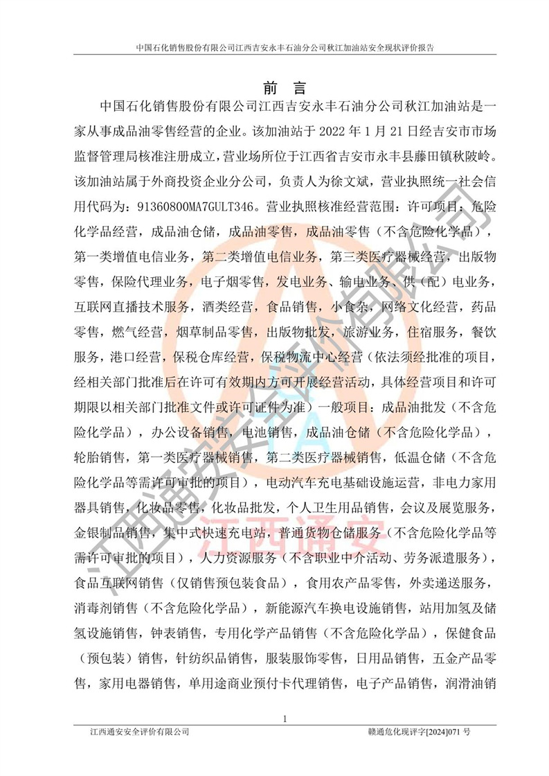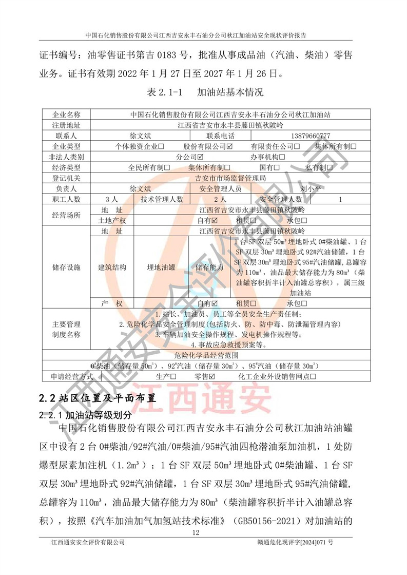 评价报告名称 | 中国石化销售股份有限公司江西吉安永丰石油分公司秋江加油站安全现状评价报告 | |||