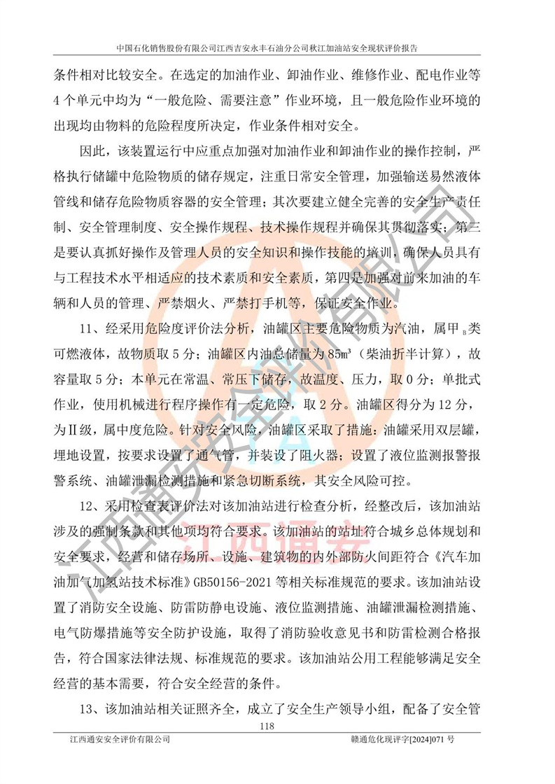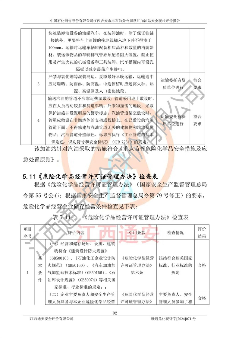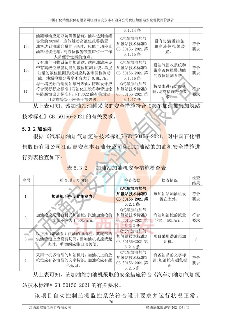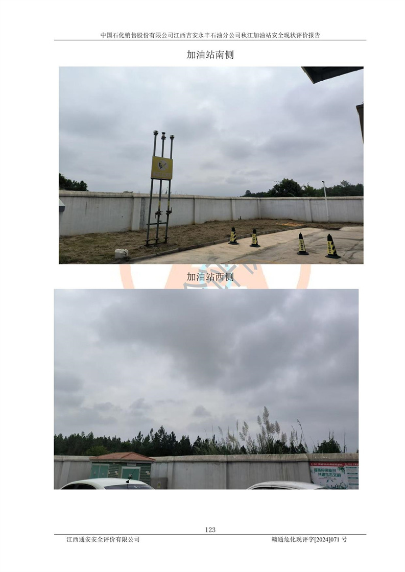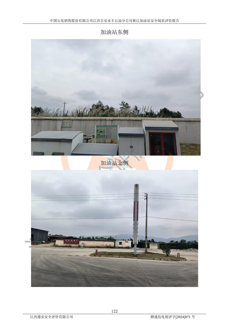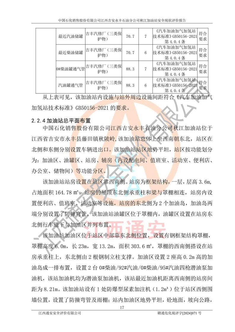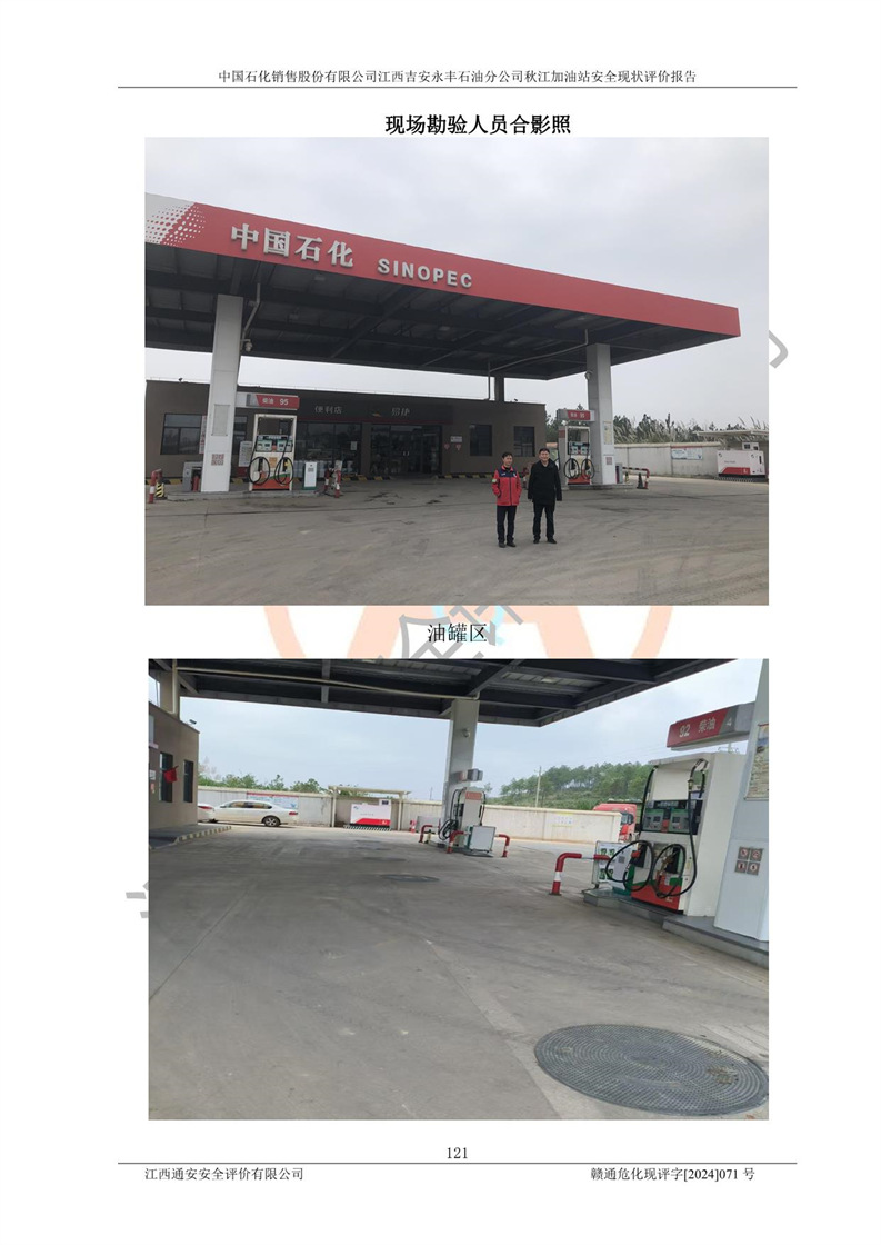 评价结论 | 中国石化销售股份有限公司江西吉安永丰石油分公司秋江加油站符合《汽车加油加气加氢站技术标准》GB50156-2021等标准规范的要求,安全风险可控,满足危险化学品经营的安全条件。 | |||