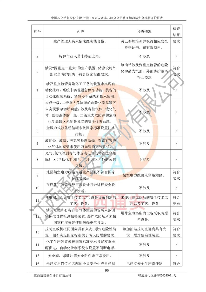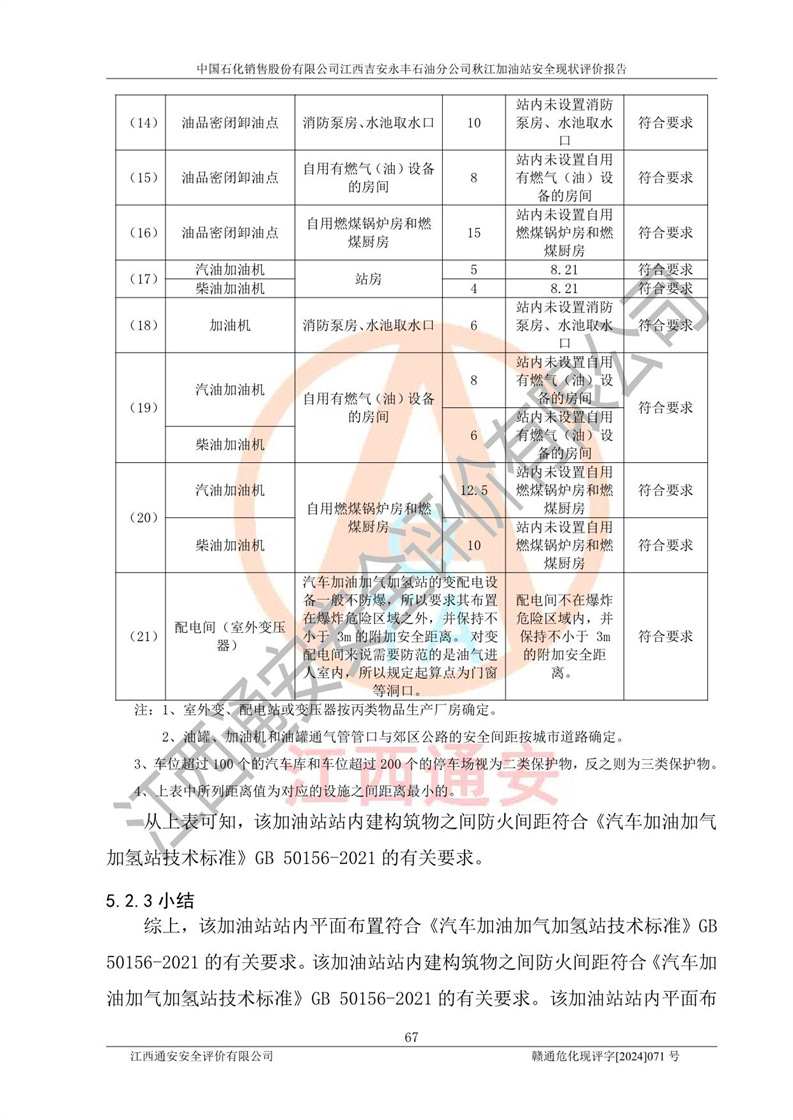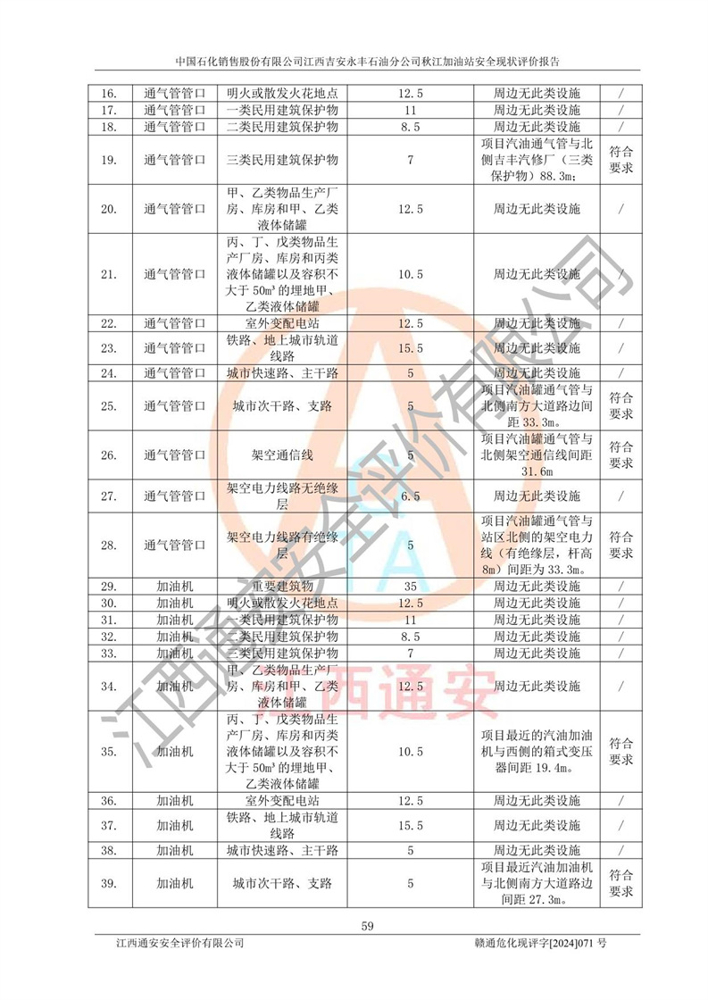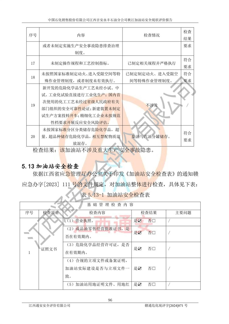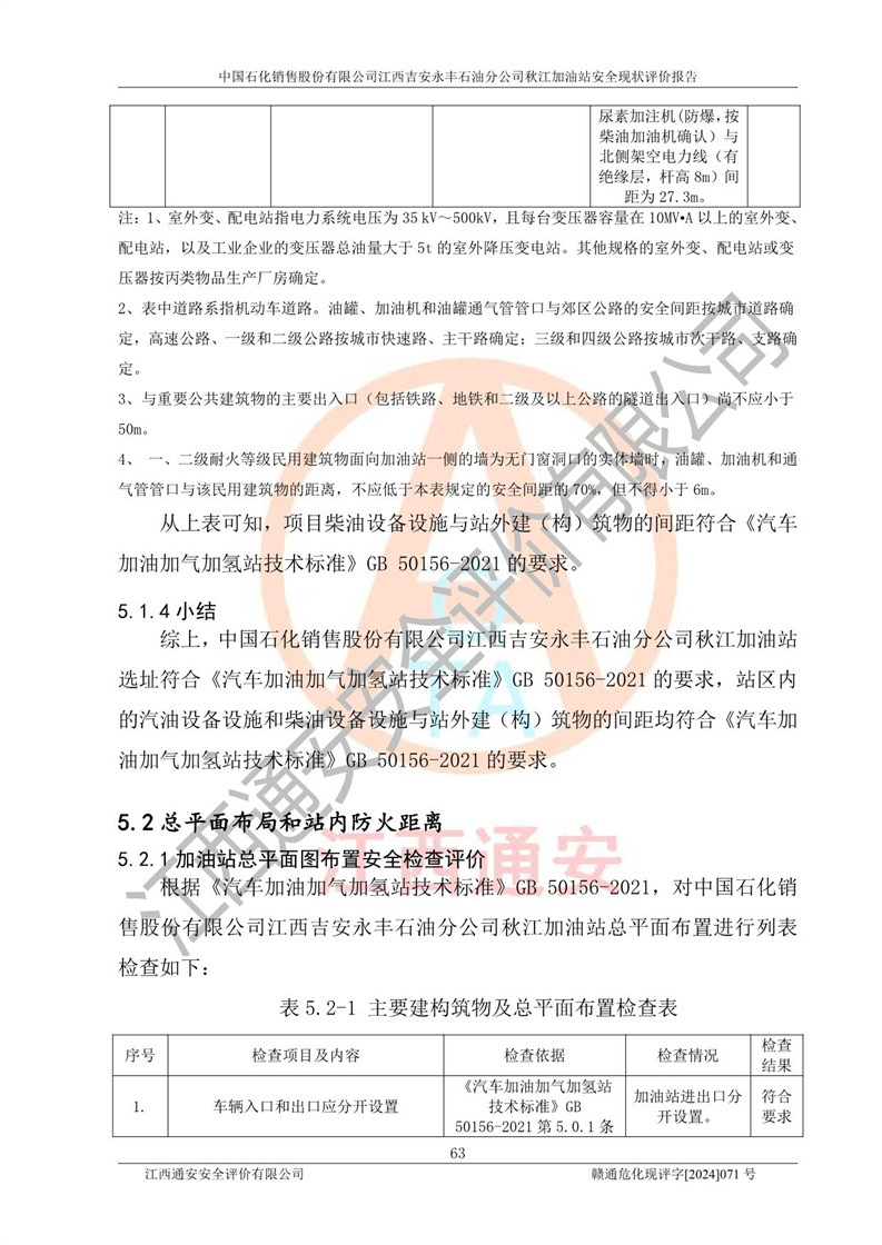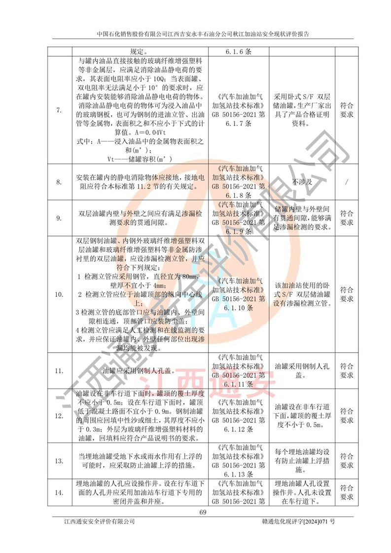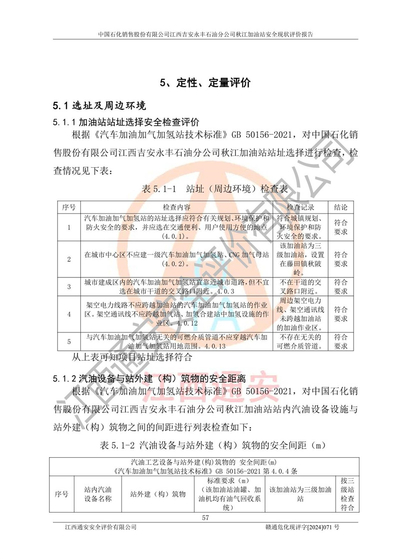 评价结论 | 中国石化销售股份有限公司江西吉安永丰石油分公司秋江加油站符合《汽车加油加气加氢站技术标准》GB50156-2021等标准规范的要求,安全风险可控,满足危险化学品经营的安全条件。 | |||