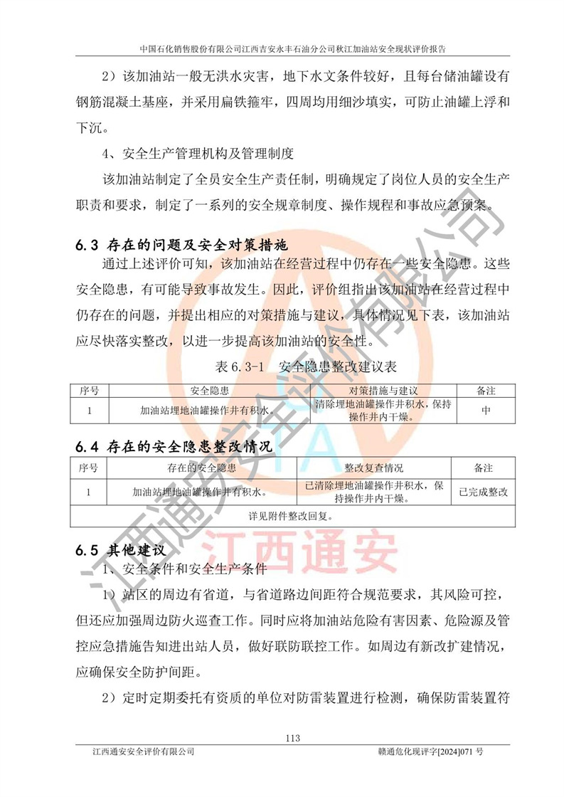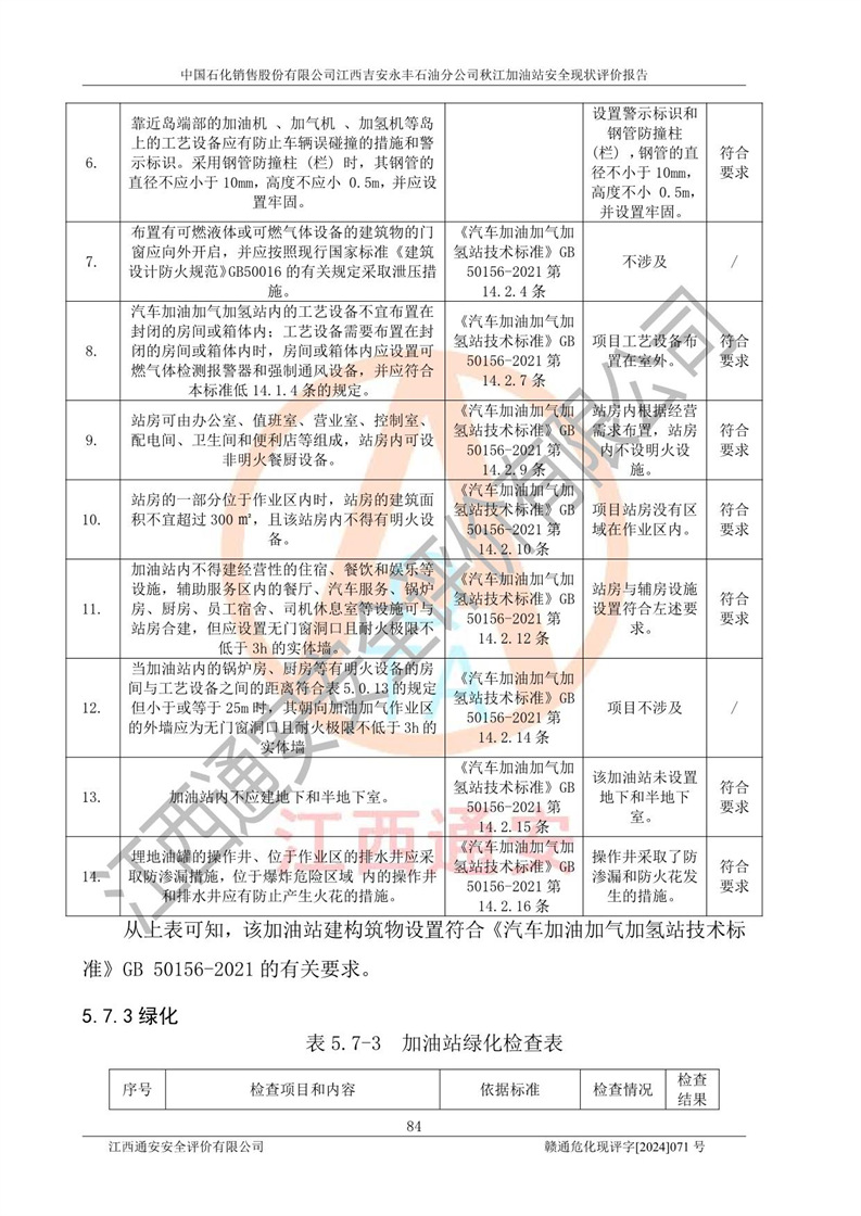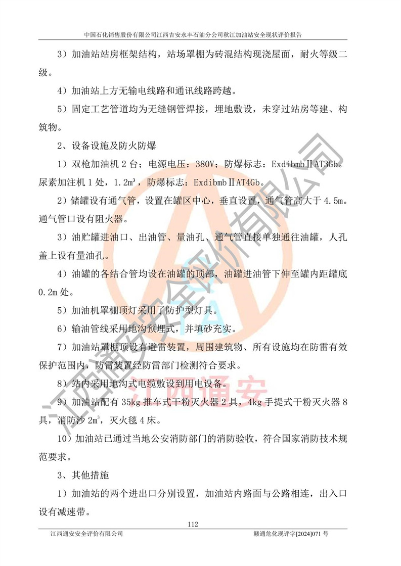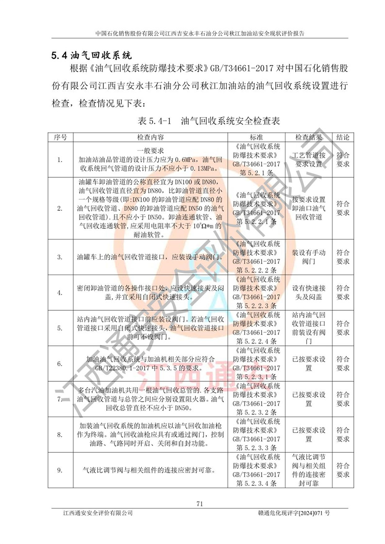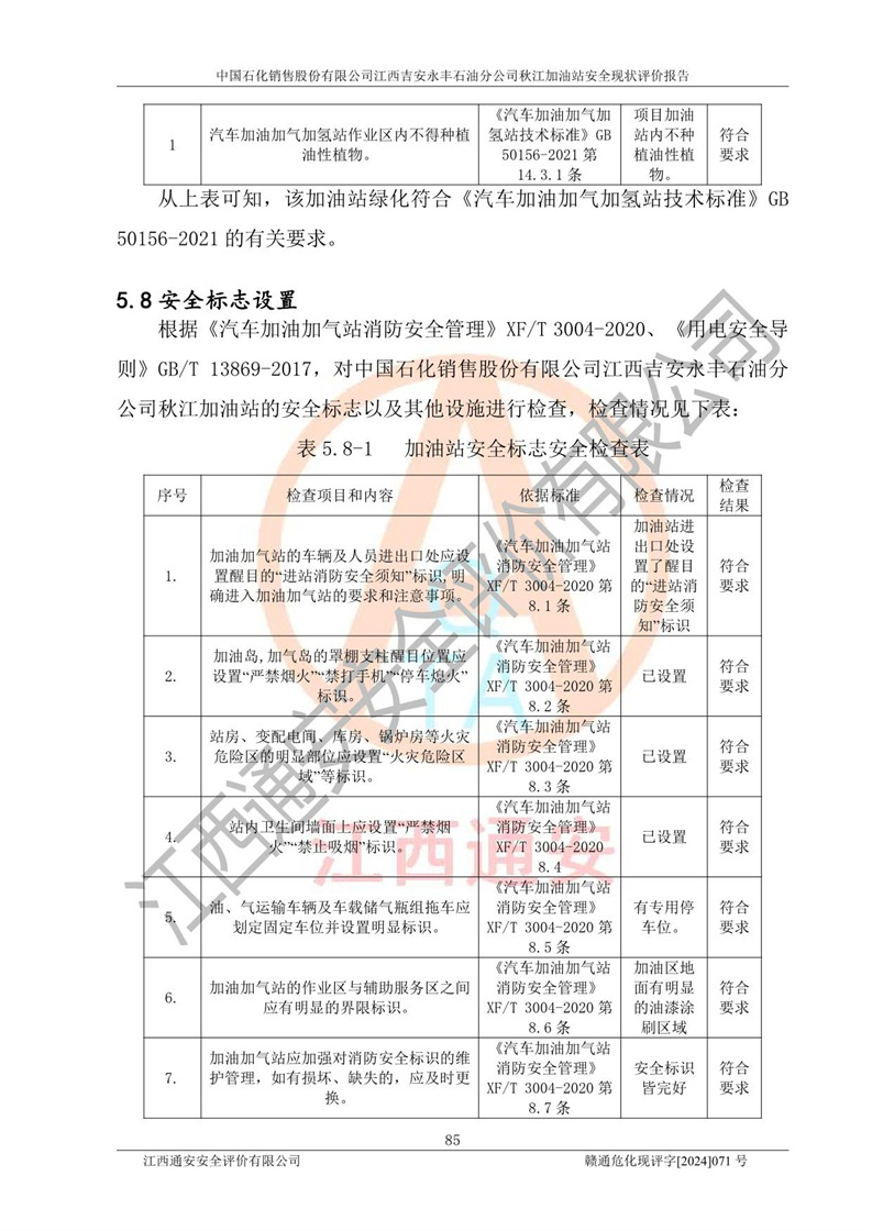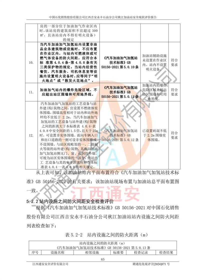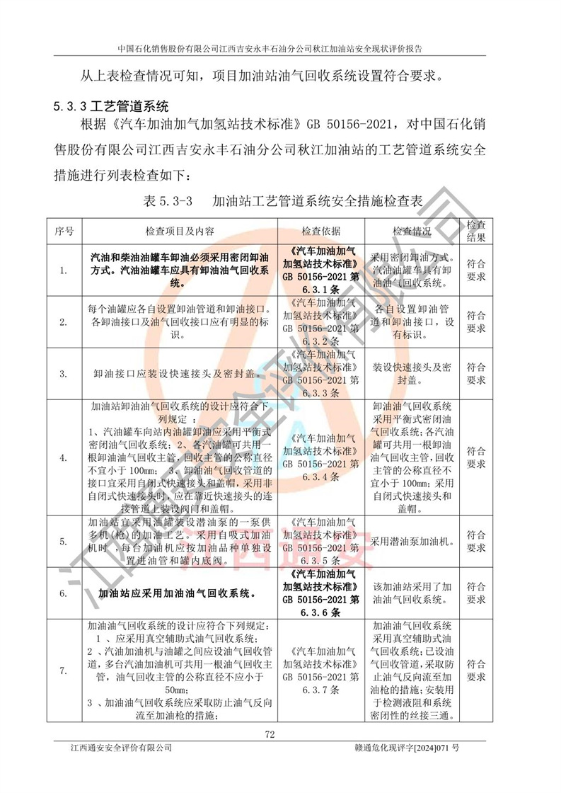 评价结论 | 中国石化销售股份有限公司江西吉安永丰石油分公司秋江加油站符合《汽车加油加气加氢站技术标准》GB50156-2021等标准规范的要求,安全风险可控,满足危险化学品经营的安全条件。 | |||