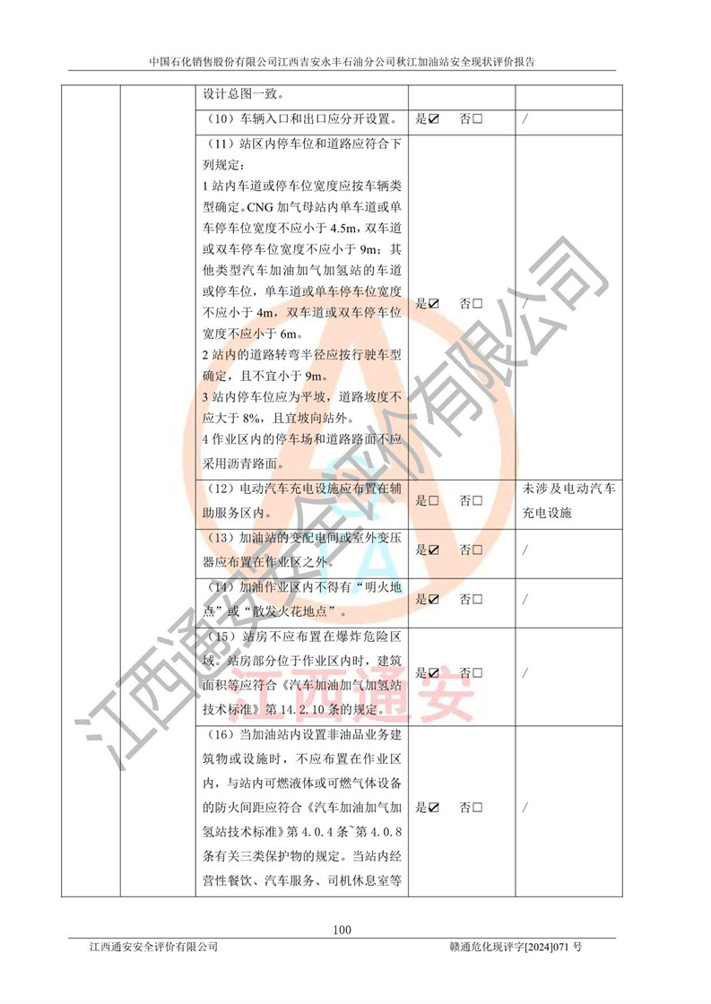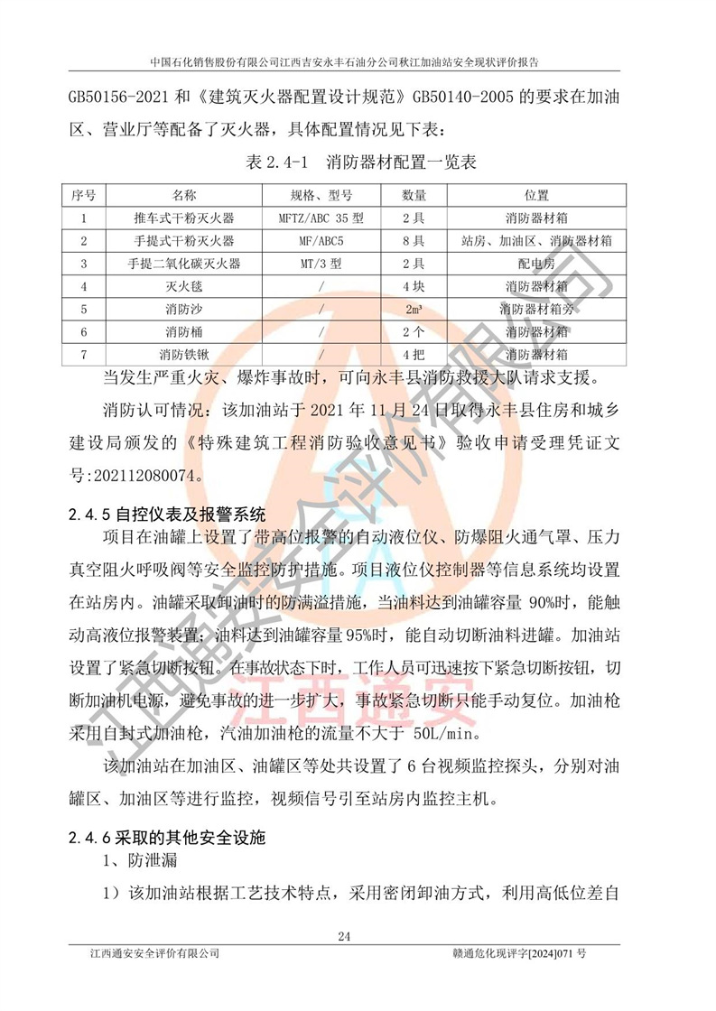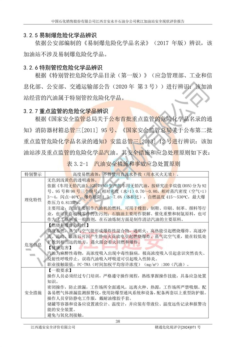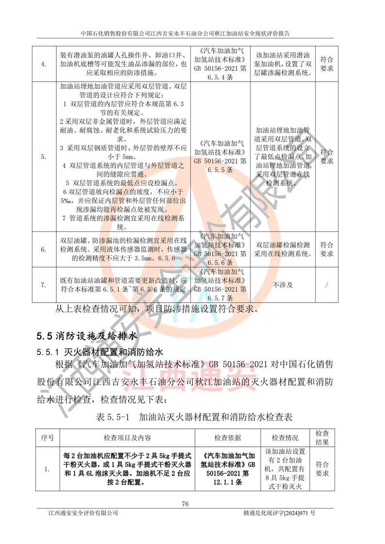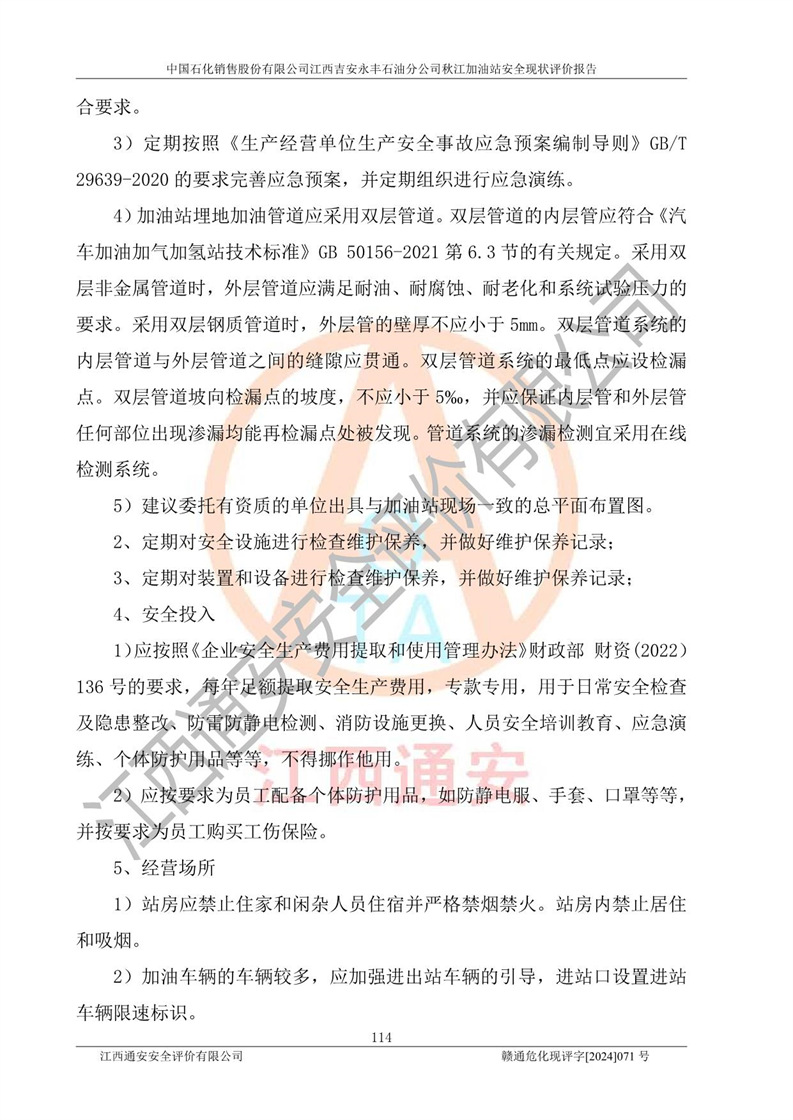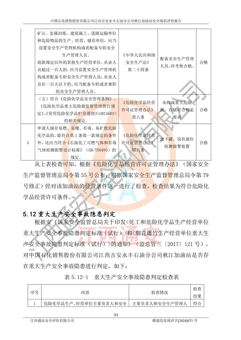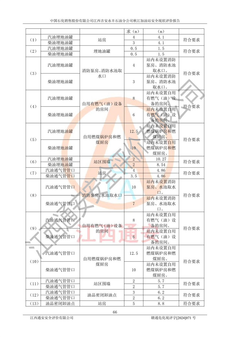 评价结论 | 中国石化销售股份有限公司江西吉安永丰石油分公司秋江加油站符合《汽车加油加气加氢站技术标准》GB50156-2021等标准规范的要求,安全风险可控,满足危险化学品经营的安全条件。 | |||