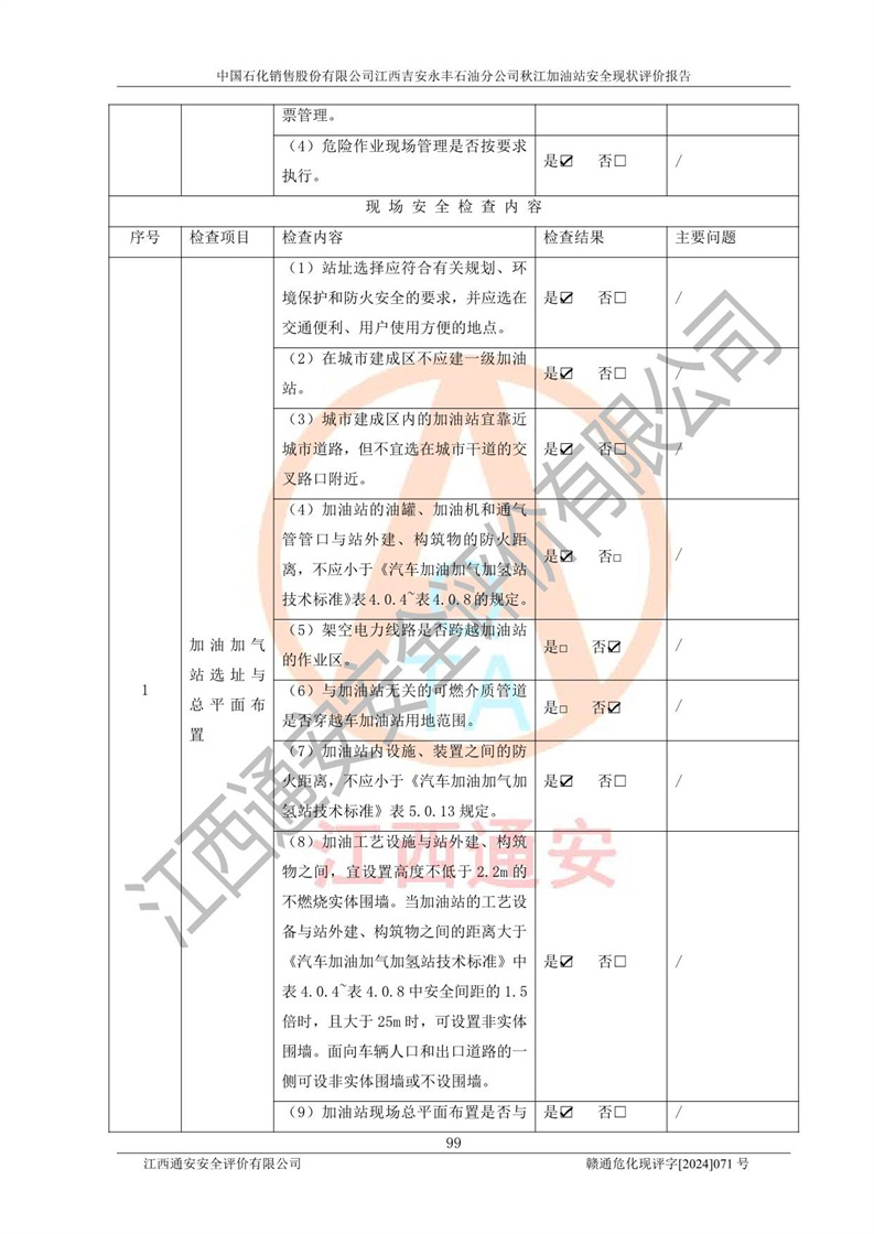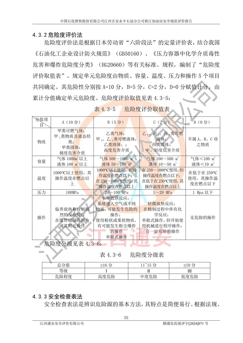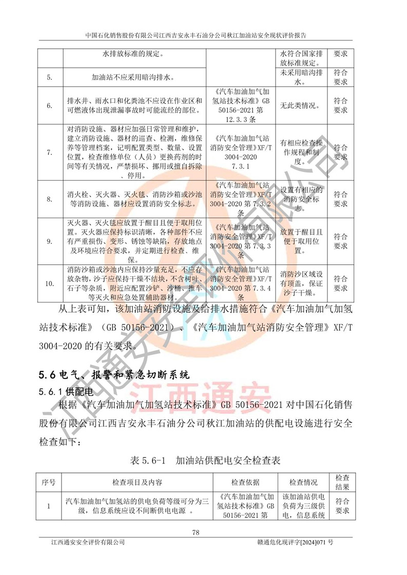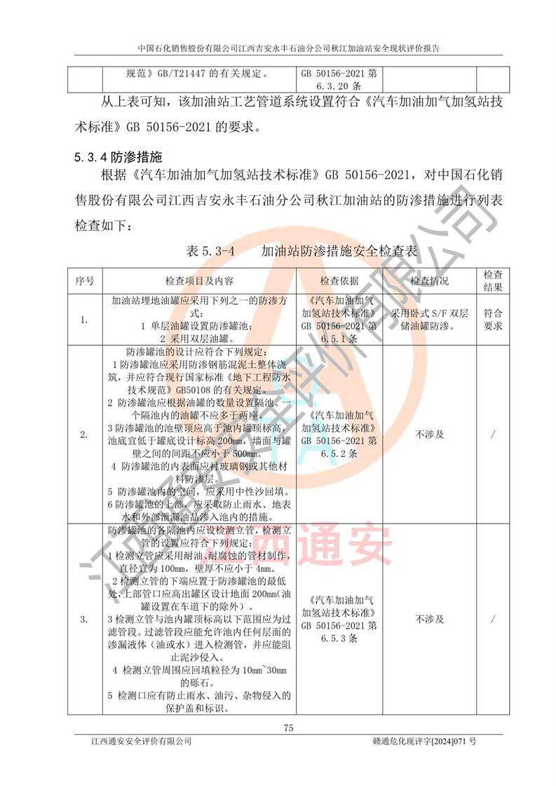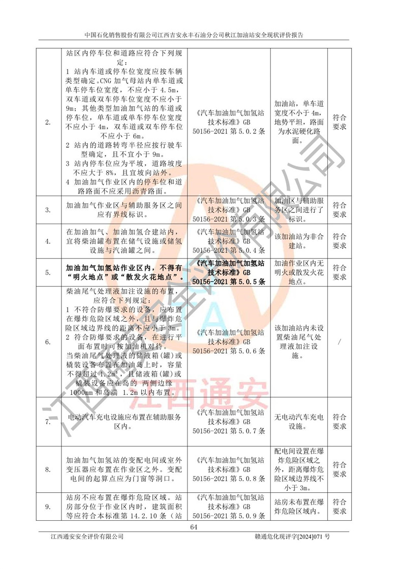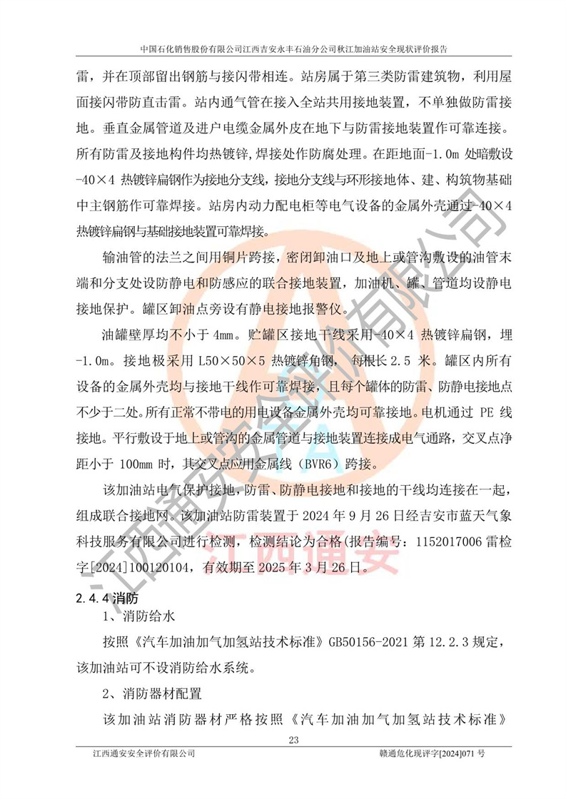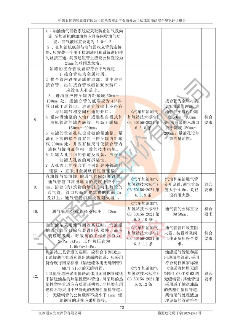 评价结论 | 中国石化销售股份有限公司江西吉安永丰石油分公司秋江加油站符合《汽车加油加气加氢站技术标准》GB50156-2021等标准规范的要求,安全风险可控,满足危险化学品经营的安全条件。 | |||