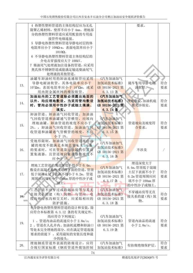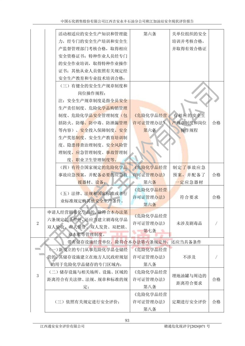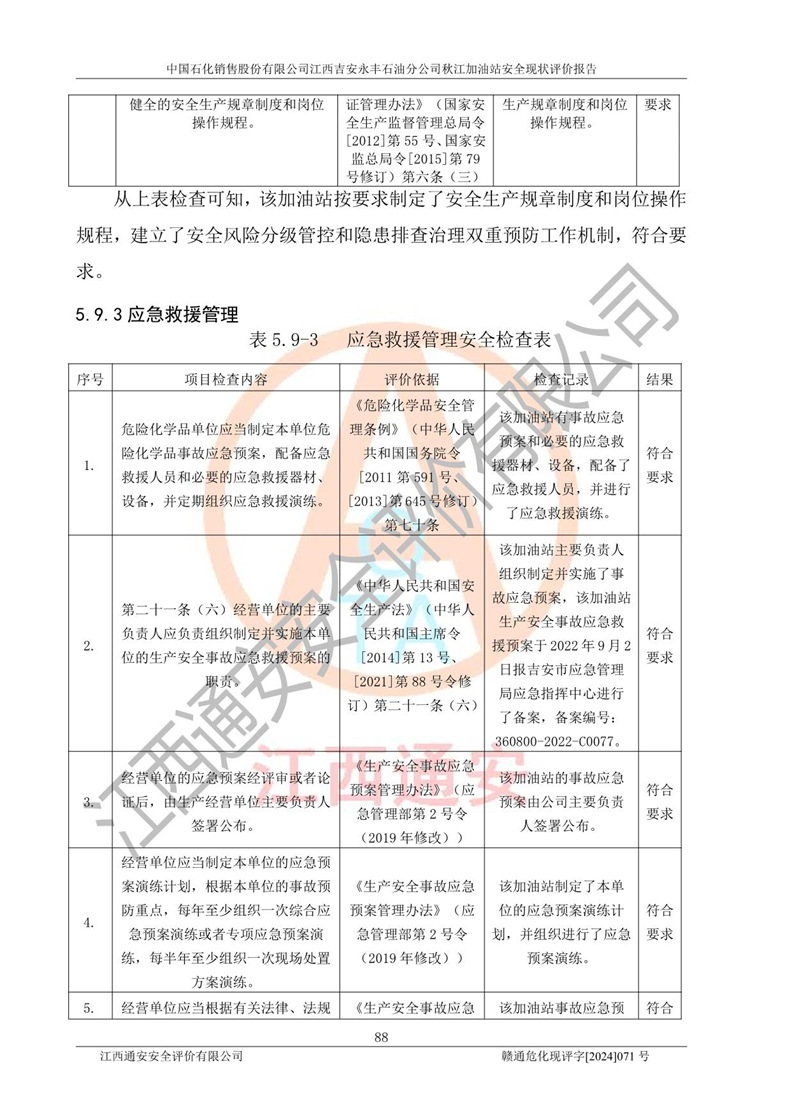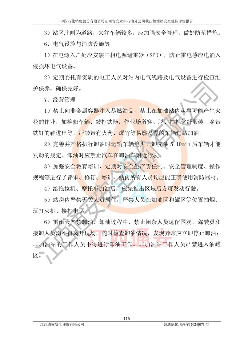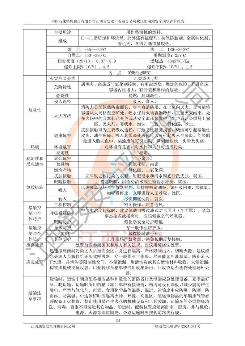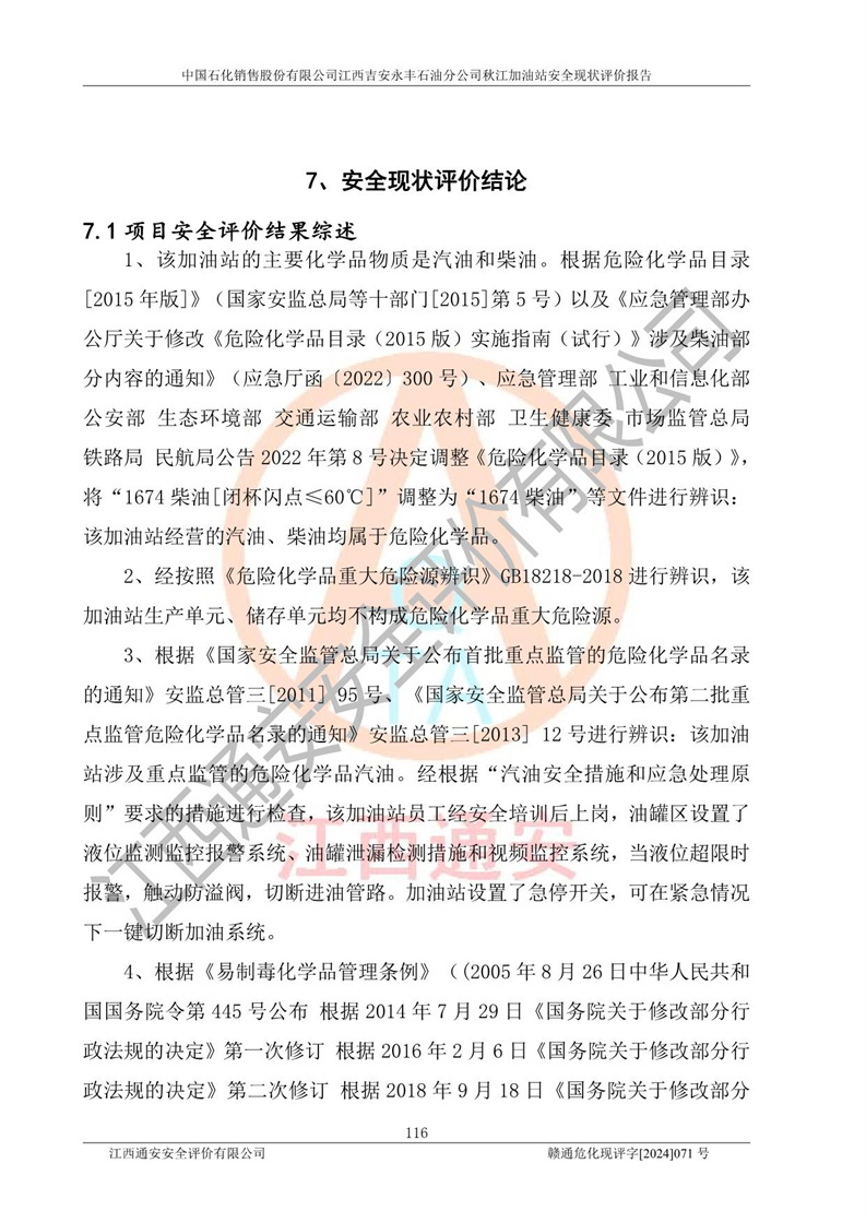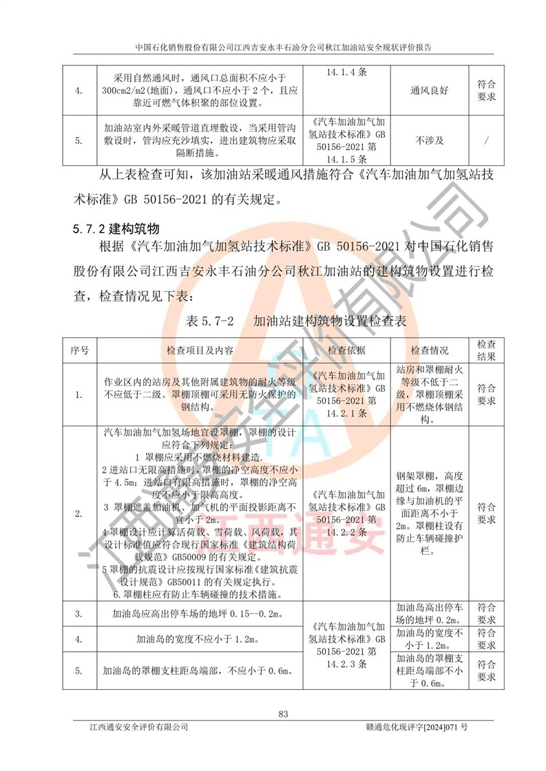 评价结论 | 中国石化销售股份有限公司江西吉安永丰石油分公司秋江加油站符合《汽车加油加气加氢站技术标准》GB50156-2021等标准规范的要求,安全风险可控,满足危险化学品经营的安全条件。 | |||