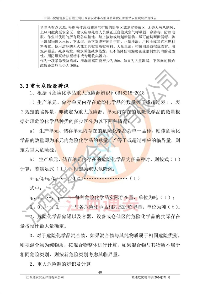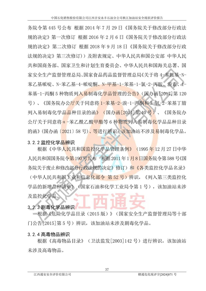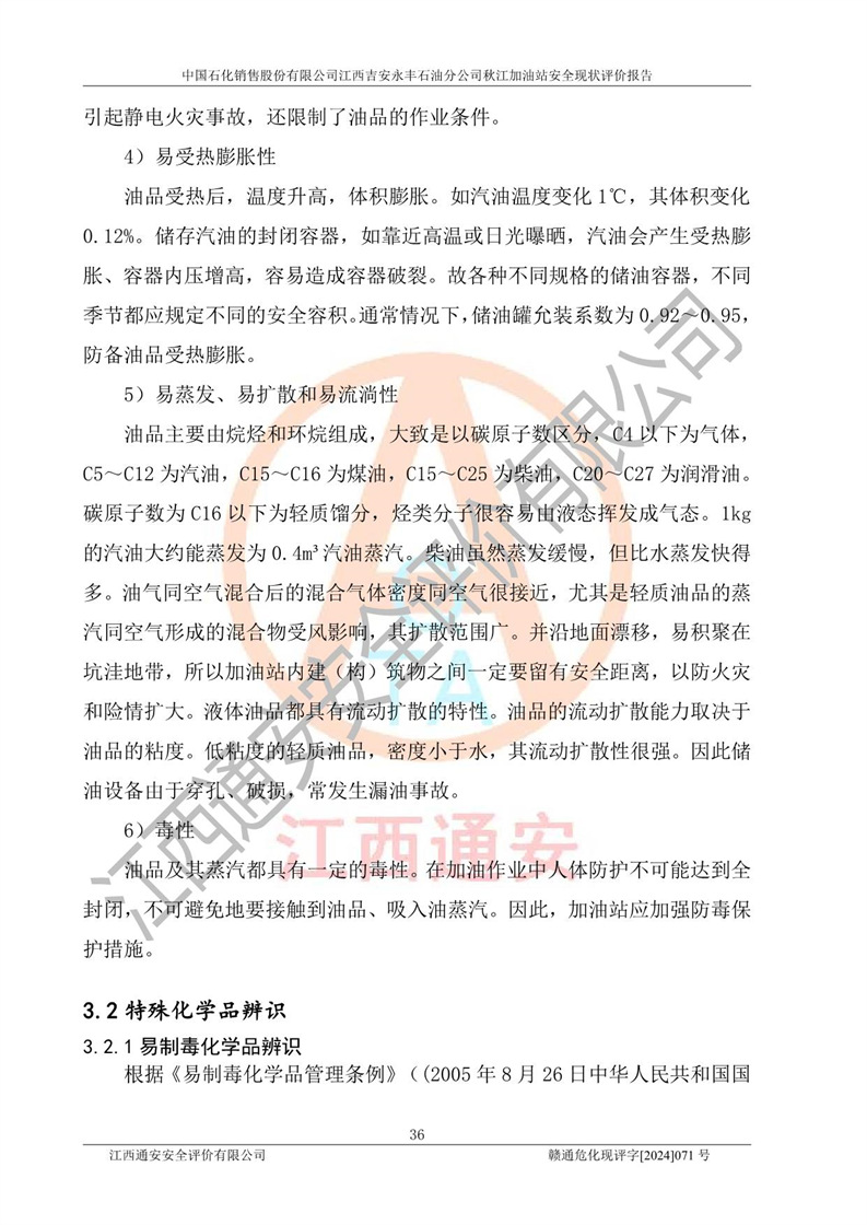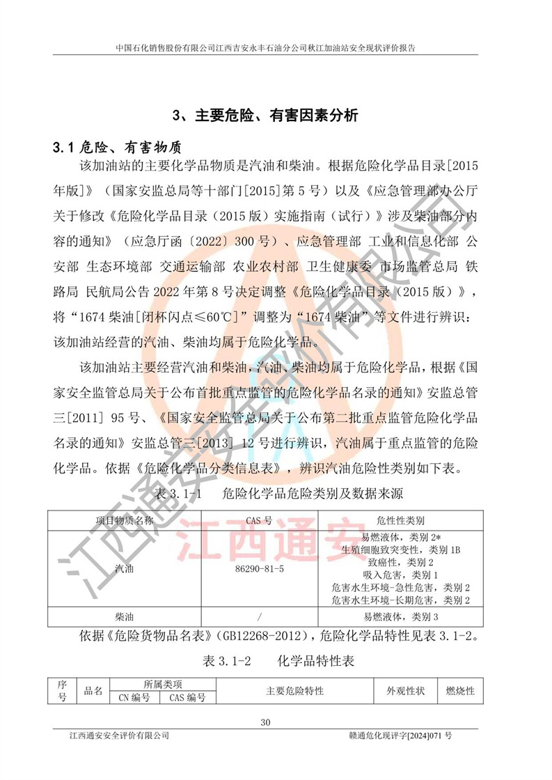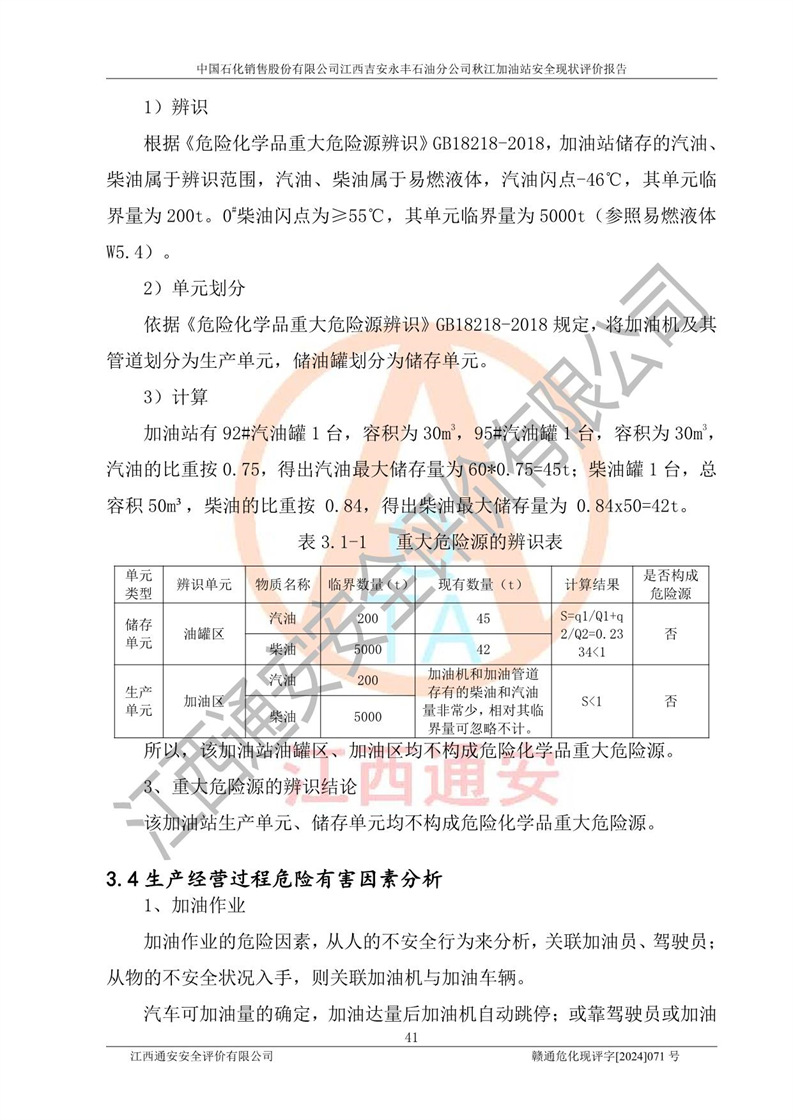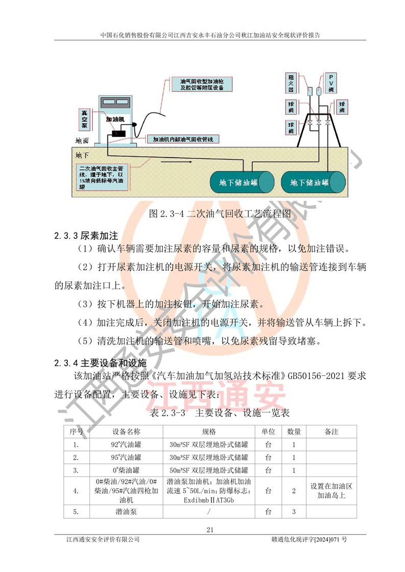 项目简介 | 中国石化销售股份有限公司江西吉安永丰石油分公司秋江加油站是一家从事成品油零售经营的企业。该加油站于2022年1月21日经吉安市市场监督管理局核准注册成立,营业场所位于江西省吉安市永丰县藤田镇秋陂岭。该加油站属于外商投资企业分公司,负责人为徐文斌,营业执照统一社会信用代码为:91360800MA7GULT346。营业执照核准经营范围:许可项目:危险化学品经营,成品油仓储,成品油零售,成品油零售(不含危险化学品),**类增值电信业务,第二类增值电信业务,第三类医疗器械经营,出版物零售,**代理业务,***零售,发电业务、输电业务、供(配)电业务,互联网直播技术服务,酒类经营,食品销售,小食杂,网络文化经营,药品零售,燃气经营,烟草制品零售,出版物批发,旅游业务,住宿服务,餐饮服务,港口经营,保税仓库经营,保税物流中心经营(依法须经批准的项目,经相关部门批准后在许可**期内方可开展经营活动,具体经营项目和许可期限以相关部门批准文件或许可证件为准)一般项目:成品油批发(不含危险化学品),办公设备销售,电池销售,成品油仓储(不含危险化学品),轮胎销售,**类医疗器械销售,第二类医疗器械销售,低温仓储(不含危险化学品等需许可审批的项目),电动汽车充电基础设施运营,非电力家用器具销售,化妆品零售,化妆品批发,个人卫生用品销售,会议及展览服务,金银制品销售,集中式**充电站,普通货物仓储服务(不含危险化学品等需许可审批的项目),人力资源服务(不含职业中介活动、劳务派遣服务),食品互联网销售(仅销售预包装食品),食用农产品零售,外卖递送服务,消毒剂销售(不含危险化学品),新能源汽车换电设施销售,站用加氢及储氢设施销售,钟表销售,**化学产品销售(不含危险化学品),保健食品(预包装)销售,针纺织品销售,服装服饰零售,日用品销售,五金产品零售,家用电器销售,单用途商业预付卡代理销售,电子产品销售,润滑油销售,石油制品销售(不含危险化学品),户外用品销售,汽车销售,摩托车及零配件批发,摩托车及零配件零售,农副产品销售,化肥销售,农用薄膜销售,安防设备销售,礼品花卉销售,计算机软硬件及辅助设备零售,橡胶制品销售,机械设备销售,珠宝首饰零售,玩具销售,乐器批发,乐器零售,家具销售,建筑材料销售,机动车充电销售,技术服务、技术开发、技术咨询、技术交流、技术**、技术推广,机动车修理和维护,物业管理,停车场服务,居民日常生活服务,票务代理服务,广告制作,广告发布,广告设计、代理,洗车服务,信息咨询服务(不含许可类信息咨询服务),软件开发,货物进出口,食品进出口,技术进出口,进出口代理,汽车装饰用品销售,租赁服务(不含许可类租赁服务),小微型客车租赁经营服务(除依法须经批准的项目外,凭营业执照依法自主开展经营活动) 中国石化销售股份有限公司江西吉安永丰石油分公司秋江加油站占地面积1373.13㎡,加油站中设有2台0#柴油/92#汽油/0#柴油/95#汽油四枪潜油泵加油机,设1台SF双层50m³埋地卧式0#柴油罐、1台SF双层30m³埋地卧式92#汽油储罐,1台SF双层30m³埋地卧式95#汽油储罐,总罐容为110m³,折合油罐容积为85m³(柴油罐容积折半计入油罐总容积),属三级加油站,汽油卸油、加油设置了油气回收系统。 中国石化销售股份有限公司江西吉安永丰石油分公司秋江加油站于2022年1月18日经吉安市应急管理局核准,取得了《危险化学品经营许可证》,证书编号:赣吉危化经字[2022]360800000003,许可经营范围:成品油。**期2022年1月18日2025年1月17日。 中国石化销售股份有限公司江西吉安永丰石油分公司秋江加油站2022年1月27日经吉安市商务局核准,取得了《成品油零售经营批准证书》,证书编号:油零售证书第吉0183号,批准从事成品油(汽油、柴油)零售业务。证书**期2022年1月27日至2027年1月26日。 项目生产过程中涉及的危险化学品有:汽油、柴油等。 项目各生产和储存单元均未构成危险化学品重大危险源。 | |||