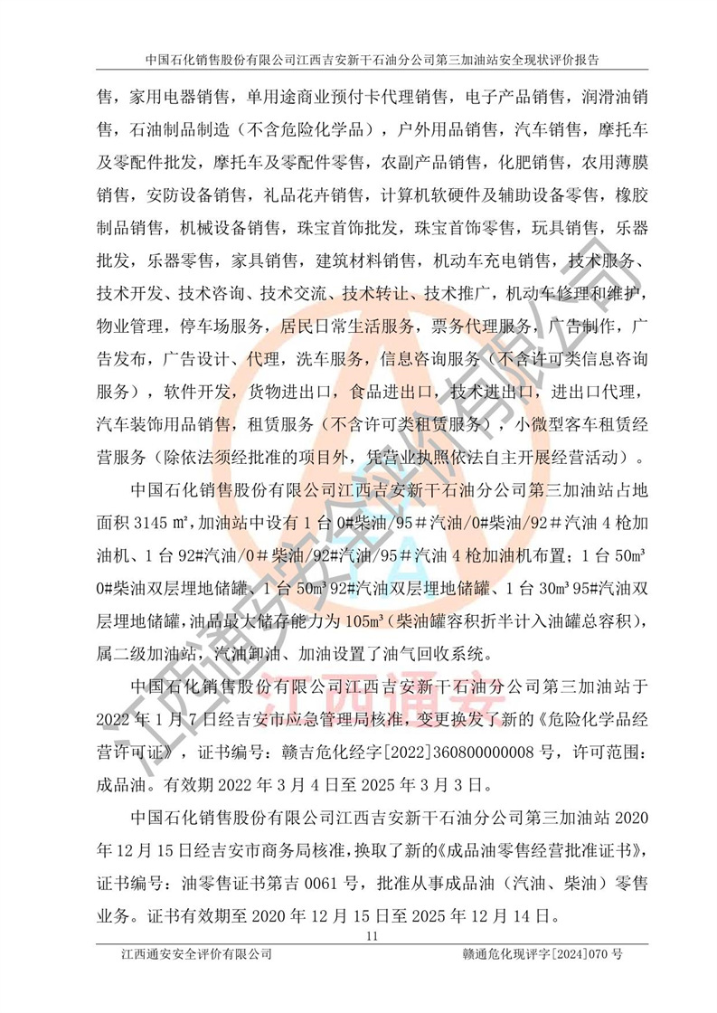 项目简介 | 中国石化销售股份有限公司江西吉安新干石油分公司第三加油站于2013年4月16日经吉安市市场监督管理局核准注册成立,营业场所位于新干县沂江乡历上村105国道。类型:外商投资企业分公司,该加油站于2024年7月30日变更负责人,现负责人:肖伟华,营业执照统一社会信用代码为:91360824065389264J。营业执照核准经营范围:许可项目:危险化学品经营,成品油仓储,成品油零售,成品油零售(不含危险化学品),**类增值电信业务,第二类增值电信业务,第三类医疗器械经营,出版物零售,**代理业务,***零售,发电业务、输电业务、供(配)电业务,互联网直播技术服务,酒类经营,食品销售,小食杂,网络文化经营,药品零售,燃气经营,烟草制品零售,出版物批发,旅游业务,住宿服务,餐饮服务,港口经营,保税仓库经营,保税物流中心经营(依法须经批准的项目,经相关部门批准后在许可**期内方可开展经营活动,具体经营项目和许可期限以相关部门批准文件或许可证件为准) 一般项目:成品油批发(不含危险化学品),办公设备销售,电池销售,成品油仓储(不含危险化学品),轮胎销售,**类医疗器械销售,第二类医疗器械销售,低温仓储(不含危险化学品等需许可审批的项目),电动自行车销售,宠物食品及用品批发,电动汽车充电基础设施运营,非电力家用器具销售,化妆品批发,化妆品零售,个人卫生用品销售,会议及展览服务,金银制品销售,集中式**充电站,普通货物仓储服务(不含危险化学品等需许可审批的项目),人力资源服务(不含职业中介活动、劳务派遣服务),食品互联网销售(仅销售预包装食品),食用农产品零售,外卖递送服务,消毒剂销售(不含危险化学品),新能源汽车换电设施销售,站用加氢及储氢设施销售,钟表销售,保健食品(预包装)销售,针纺织品销售,服装服饰零售,日用品销售,五金产品零售,家用电器销售,单用途商业预付卡代理销售,电子产品销售,润滑油销售,石油制品制造(不含危险化学品),户外用品销售,汽车销售,摩托车及零配件批发,摩托车及零配件零售,农副产品销售,化肥销售,农用薄膜销售,安防设备销售,礼品花卉销售,计算机软硬件及辅助设备零售,橡胶制品销售,机械设备销售,珠宝首饰批发,珠宝首饰零售,玩具销售,乐器批发,乐器零售,家具销售,建筑材料销售,机动车充电销售,技术服务、技术开发、技术咨询、技术交流、技术**、技术推广,机动车修理和维护,物业管理,停车场服务,居民日常生活服务,票务代理服务,广告制作,广告发布,广告设计、代理,洗车服务,信息咨询服务(不含许可类信息咨询服务),软件开发,货物进出口,食品进出口,技术进出口,进出口代理,汽车装饰用品销售,租赁服务(不含许可类租赁服务),小微型客车租赁经营服务(除依法须经批准的项目外,凭营业执照依法自主开展经营活动)。 中国石化销售股份有限公司江西吉安新干石油分公司第三加油站占地面积3145㎡,加油站中设有1台0#柴油/95#汽油/0#柴油/92#汽油4枪加油机、1台92#汽油/0#柴油/92#汽油/95#汽油4枪加油机布置;1台50m³0#柴油双层埋地储罐、1台50m³92#汽油双层埋地储罐、1台30m³95#汽油双层埋地储罐,油品*大储存能力为105m³(柴油罐容积折半计入油罐总容积),属二级加油站,汽油卸油、加油设置了油气回收系统。 中国石化销售股份有限公司江西吉安新干石油分公司第三加油站于2022年1月7日经吉安市应急管理局核准,变更换发了新的《危险化学品经营许可证》,证书编号:赣吉危化经字[2022]360800000008号,许可范围:成品油。**期2022年3月4日至2025年3月3日。 中国石化销售股份有限公司江西吉安新干石油分公司第三加油站2020年12月15日经吉安市商务局核准,换取了新的《成品油零售经营批准证书》,证书编号:油零售证书第吉0061号,批准从事成品油(汽油、柴油)零售业务。证书**期至2020年12月15日至2025年12月14日。 | ||||