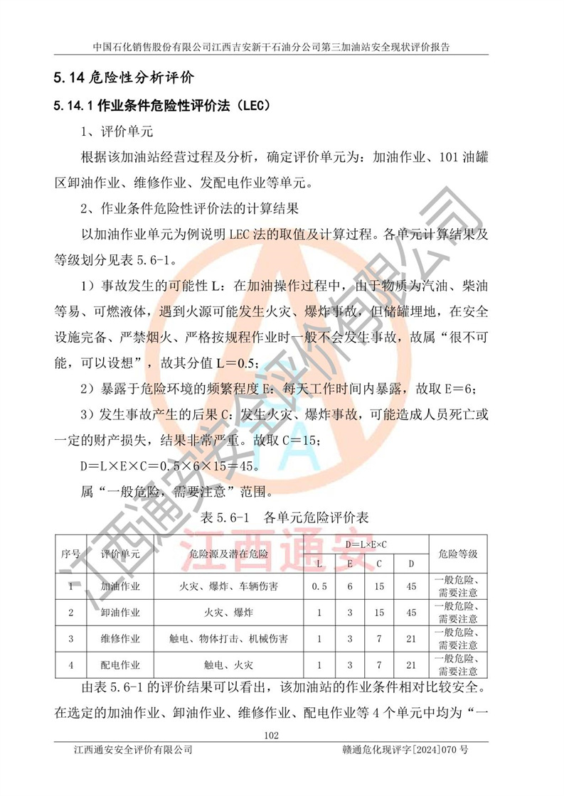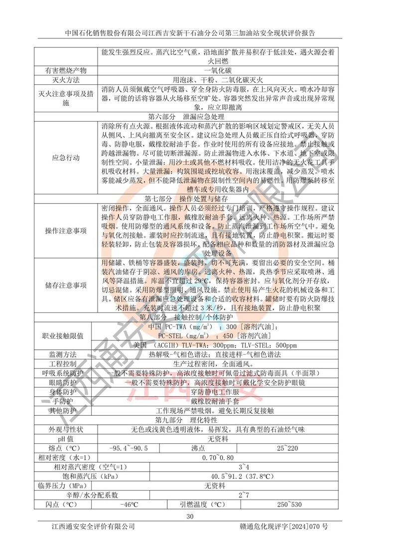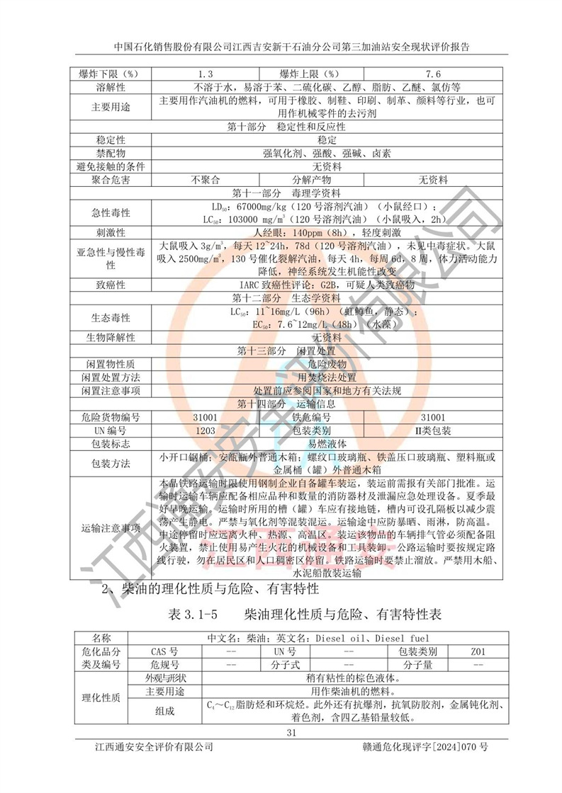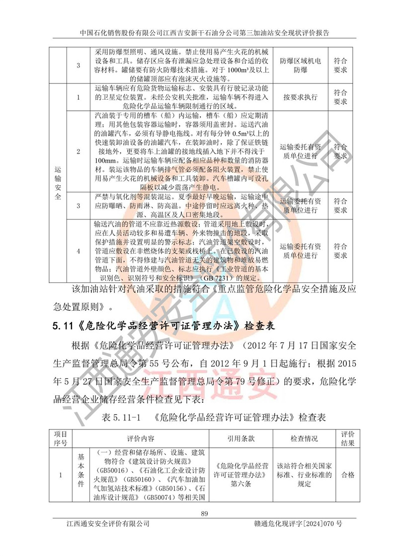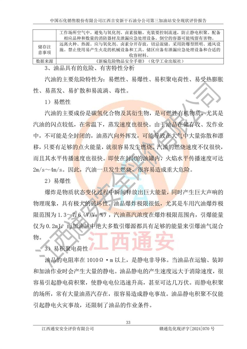 其它 | 在对该项目危险、有害因素辨识分析的基础上,运用安全检查表、预作业条件危险性分析法、危险度评价、重大事故后果分析结果等评价方法对该项目进行了分析评价,评价结果如下: 1、该项目位于新干县沂江乡历上村105国道,符合当地规划,与周边环境的距离符合有关标准、规范的要求。 2、总图布置分区明确,布局合理,各建构筑物的防火间距满足规范要求。 3、该项目无**明令淘汰的工艺,设备、设施与工艺条件、内部介质相适应,特种设备及设施较齐全,按规定设置防雷、防静电接地,爆炸危险环境加油机按要求采用防爆型,符合相关标准规范要求。 5、企业设置了安全生产管理机构,配备了专职安全生产管理人员,建立了安全生产责任制和安全生产管理制度,编制了岗位操作规程,编制了生产安全事故应急预案,人员经过相应的培训,企业的安全生产管理正常。 6、作业条件危险性评价结果:在选定的评价单元中,作业危险程度均为“一般危险,需要注意”,作业条件相对安全。 7、危险度评价结果:汽油储罐的危险程度为**危险。其设置了高液位远传报警系统,渗漏检测报警系统,埋地加油管道采用了双层管道等,可以满足安全生产条件要求。 评价结论: 中国石化销售股份有限公司江西吉安新干石油分公司第三加油站符合《汽车加油加气加氢站技术标准》GB50156-2021等标准规范的要求,安全风险可控,满足危险化学品经营的安全条件。 | ||||