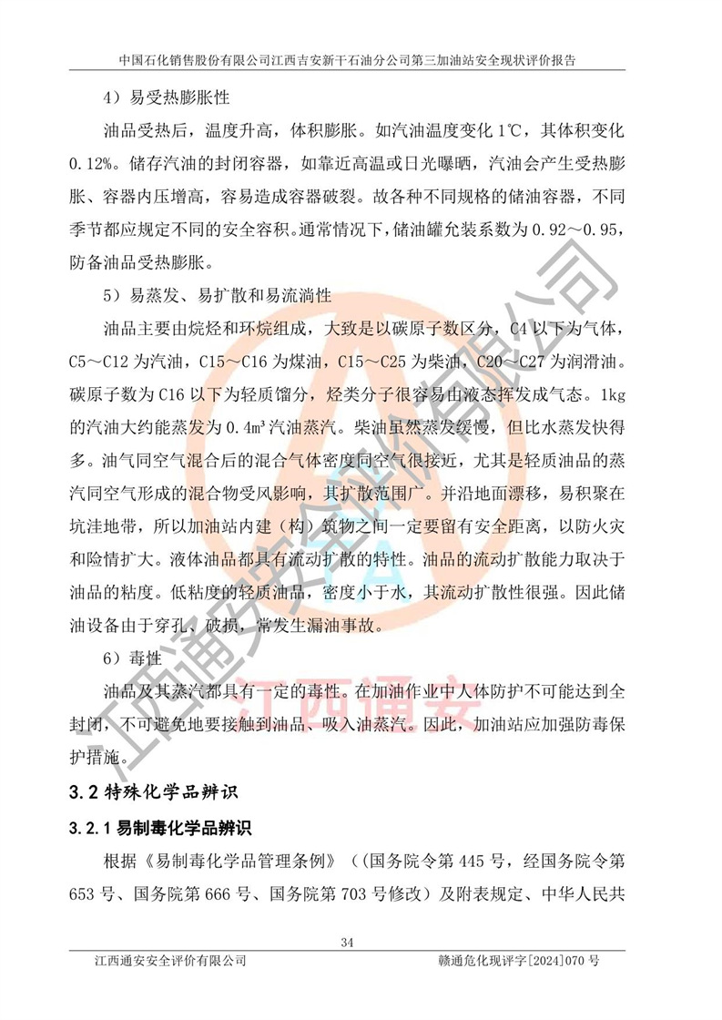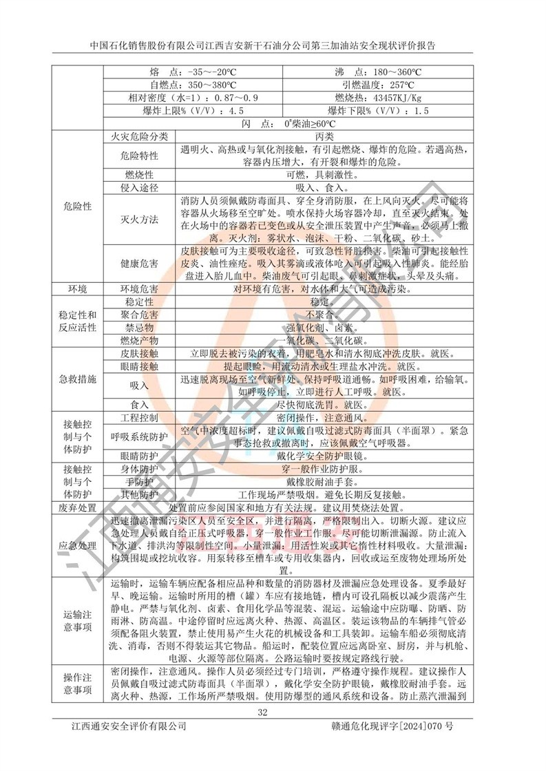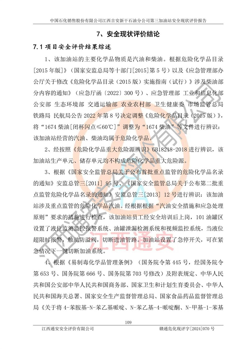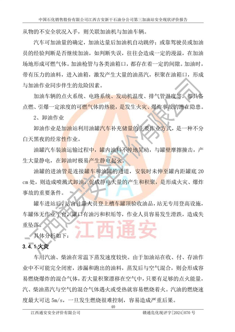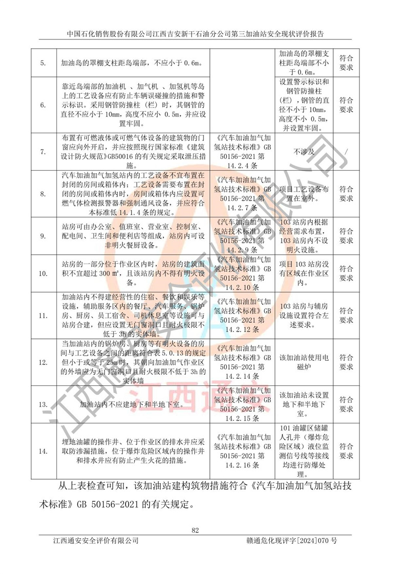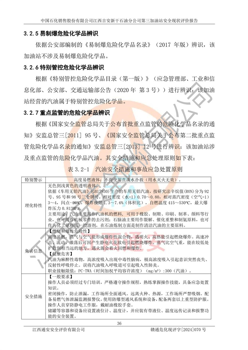 其它 | 在对该项目危险、有害因素辨识分析的基础上,运用安全检查表、预作业条件危险性分析法、危险度评价、重大事故后果分析结果等评价方法对该项目进行了分析评价,评价结果如下: 1、该项目位于新干县沂江乡历上村105国道,符合当地规划,与周边环境的距离符合有关标准、规范的要求。 2、总图布置分区明确,布局合理,各建构筑物的防火间距满足规范要求。 3、该项目无**明令淘汰的工艺,设备、设施与工艺条件、内部介质相适应,特种设备及设施较齐全,按规定设置防雷、防静电接地,爆炸危险环境加油机按要求采用防爆型,符合相关标准规范要求。 5、企业设置了安全生产管理机构,配备了专职安全生产管理人员,建立了安全生产责任制和安全生产管理制度,编制了岗位操作规程,编制了生产安全事故应急预案,人员经过相应的培训,企业的安全生产管理正常。 6、作业条件危险性评价结果:在选定的评价单元中,作业危险程度均为“一般危险,需要注意”,作业条件相对安全。 7、危险度评价结果:汽油储罐的危险程度为**危险。其设置了高液位远传报警系统,渗漏检测报警系统,埋地加油管道采用了双层管道等,可以满足安全生产条件要求。 评价结论: 中国石化销售股份有限公司江西吉安新干石油分公司第三加油站符合《汽车加油加气加氢站技术标准》GB50156-2021等标准规范的要求,安全风险可控,满足危险化学品经营的安全条件。 | ||||