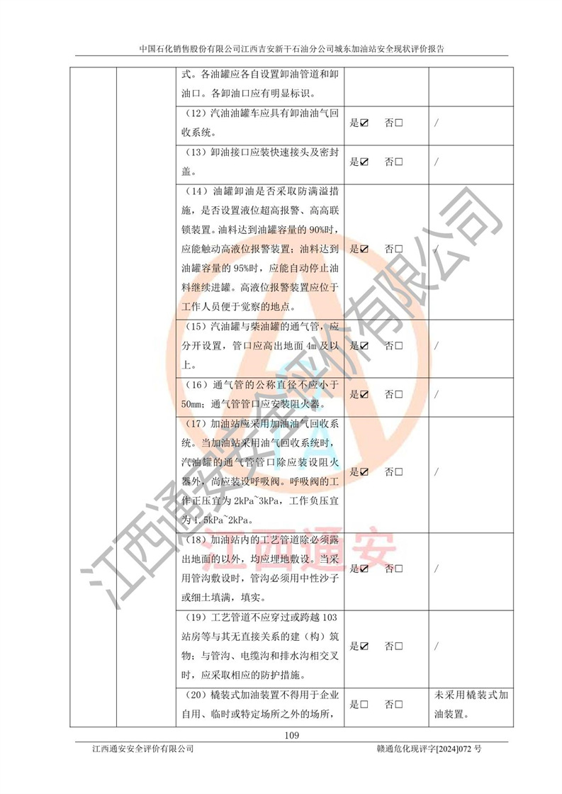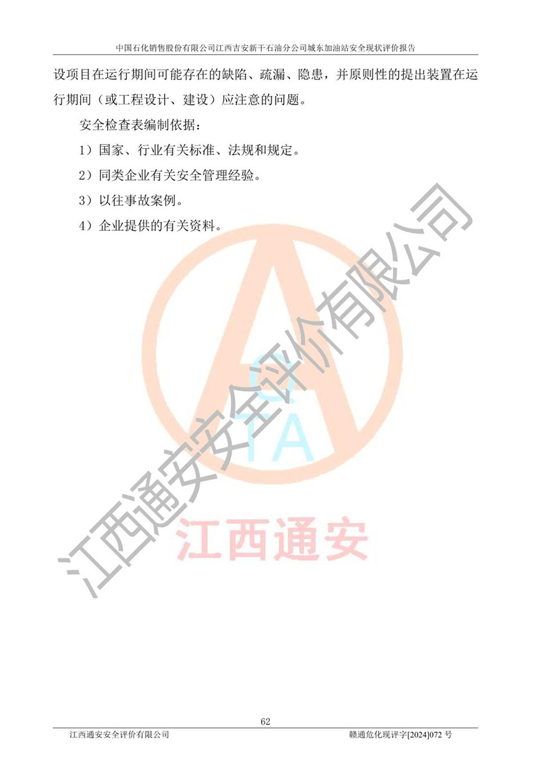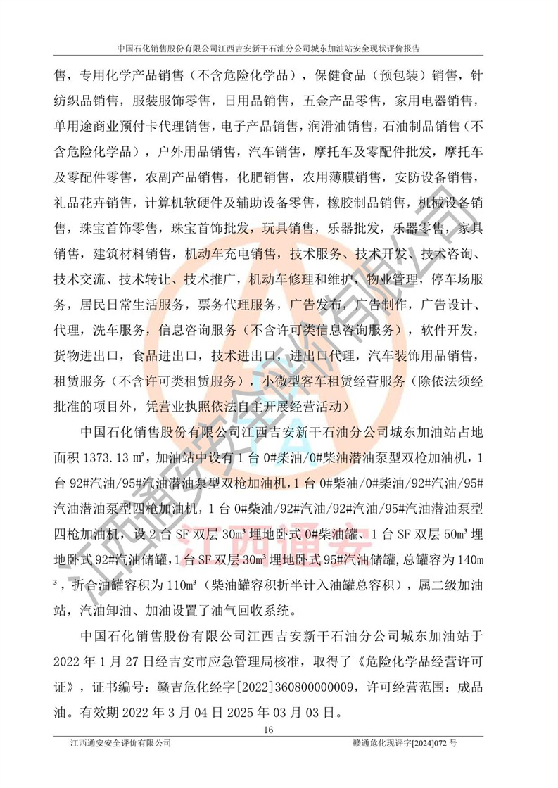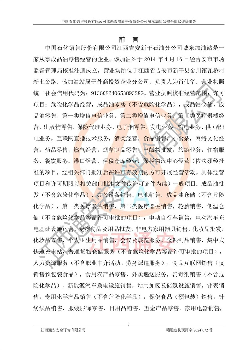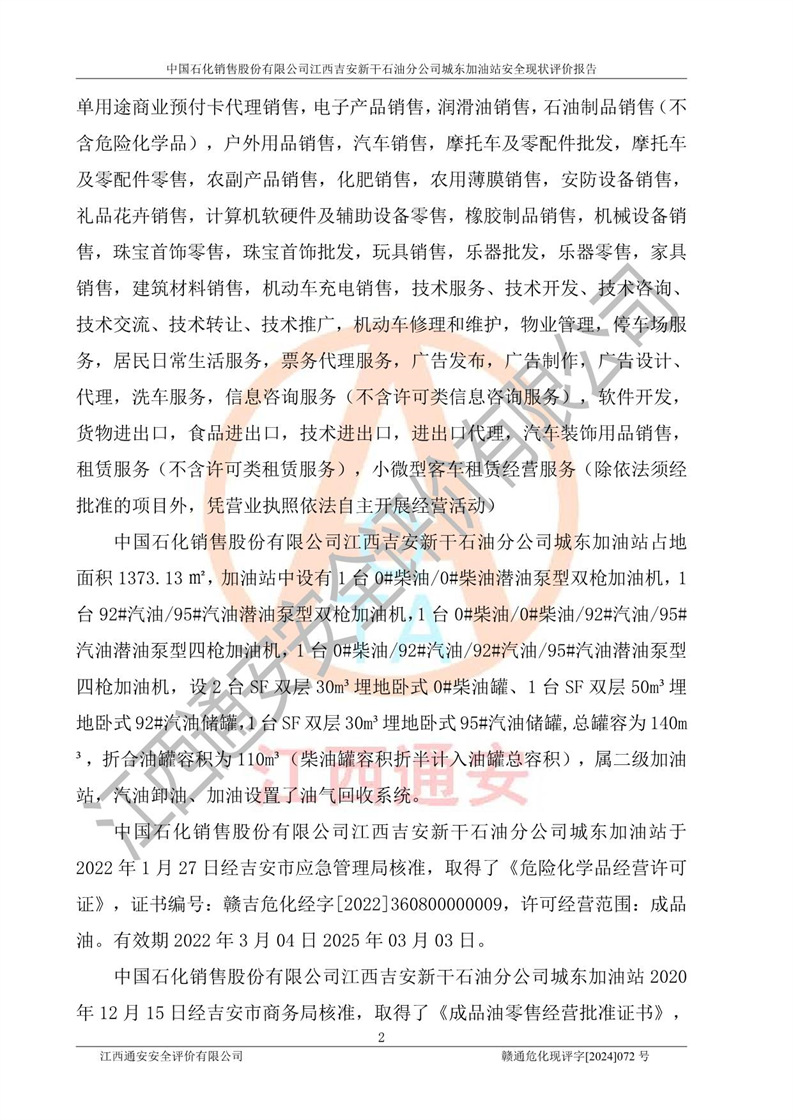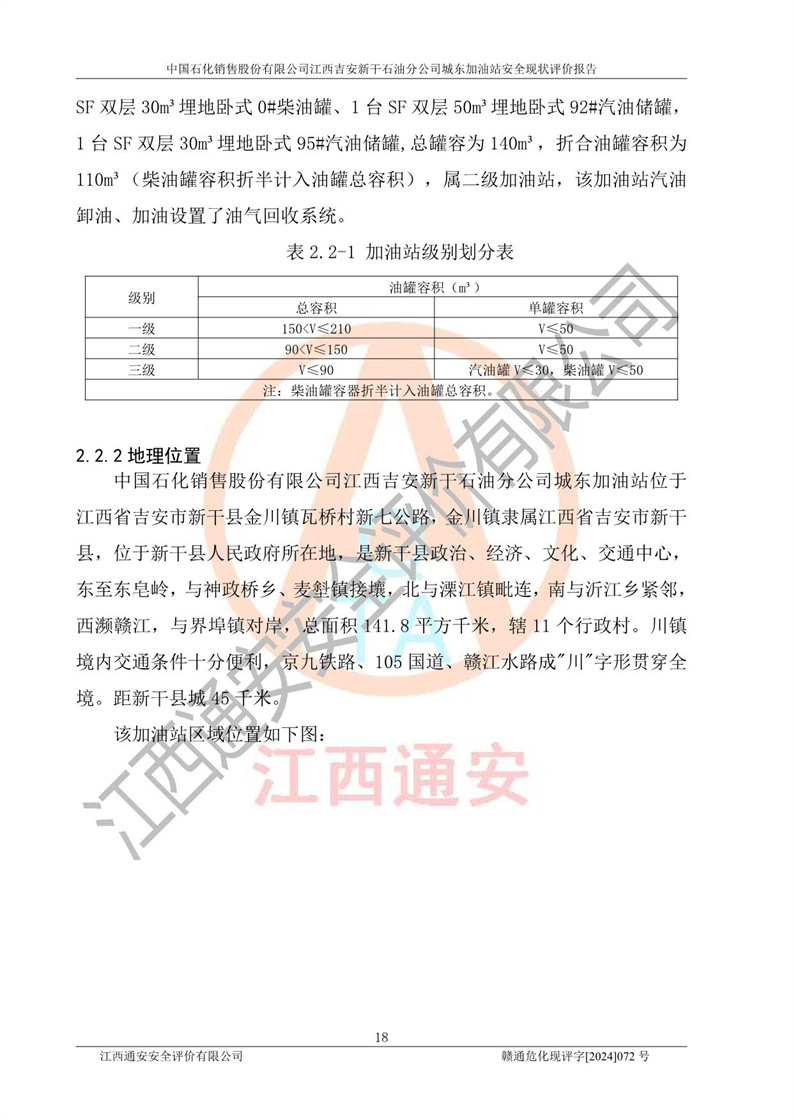 评价报告名称 | 中国石化销售股份有限公司江西吉安新干石油分公司城东加油站安全现状评价报告 | |||