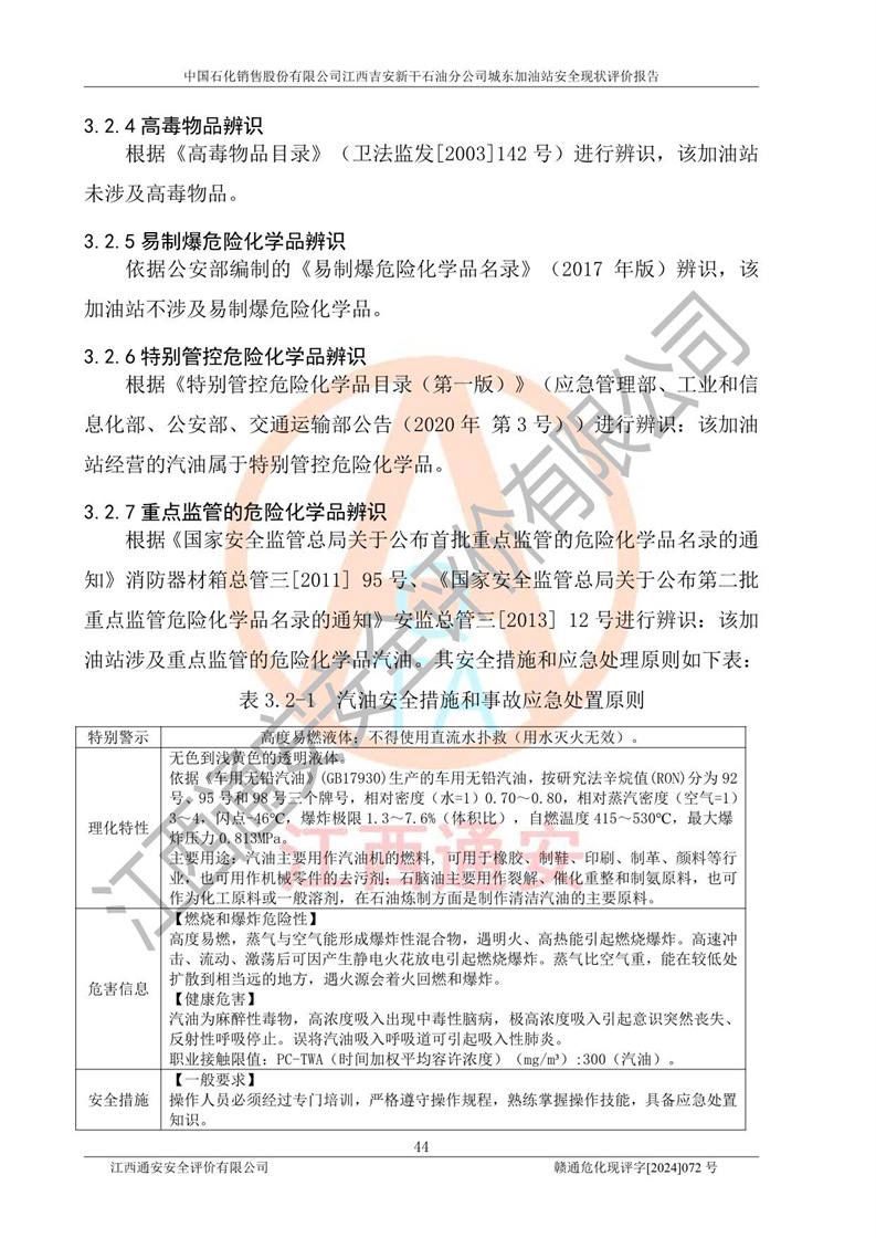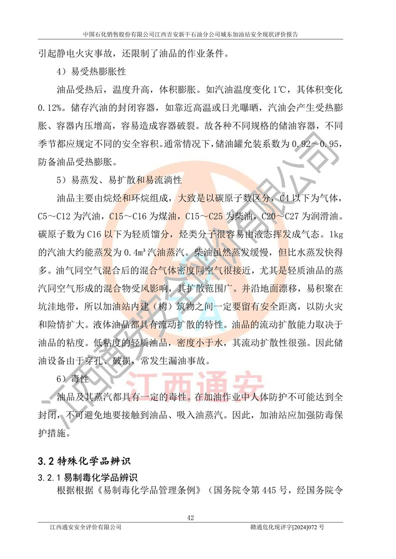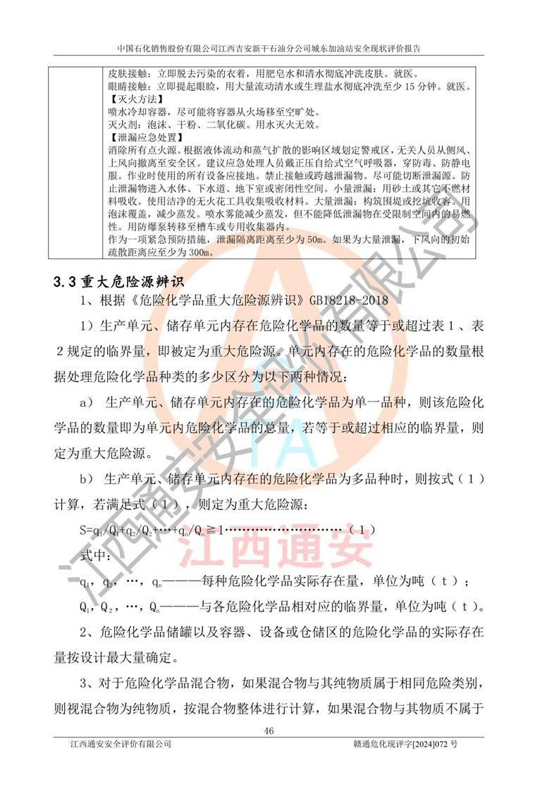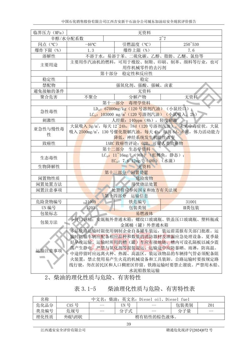 项目简介 | 中国石化销售股份有限公司江西吉安新干石油分公司城东加油站是一家从事成品油零售经营的企业。该加油站于2014年4月16日经吉安市市场监督管理局核准注册成立,营业场所位于江西省吉安市新干县金川镇瓦桥村新七公路。该加油站属于外商投资企业分公司,负责人为肖伟华,营业执照统一社会信用代码为:91360824065389328G。营业执照核准经营范围:许可项目:危险化学品经营,成品油零售(不含危险化学品),成品油仓储,成品油零售,**类增值电信业务,第二类增值电信业务,第三类医疗器械经营,出版物零售,**代理业务,***零售,发电业务、输电业务、供(配)电业务,互联网直播技术服务,酒类经营,食品销售,小食杂,网络文化经营,药品零售,燃气经营,烟草制品零售,出版物批发,旅游业务,住宿服务,餐饮服务,港口经营,保税仓库经营,保税物流中心经营(依法须经批准的项目,经相关部门批准后在许可**期内方可开展经营活动,具体经营项目和许可期限以相关部门批准文件或许可证件为准)一般项目:成品油批发(不含危险化学品),办公设备销售,电池销售,成品油仓储(不含危险化学品),**类医疗器械销售,第二类医疗器械销售,轮胎销售,低温仓储(不含危险化学品等需许可审批的项目),电动自行车销售,电动汽车充电基础设施运营,宠物食品及用品批发,非电力家用器具销售,化妆品批发,化妆品零售,个人卫生用品销售,会议及展览服务,金银制品销售,集中式**充电站,普通货物仓储服务(不含危险化学品等需许可审批的项目),人力资源服务(不含职业中介活动、劳务派遣服务),食品互联网销售(仅销售预包装食品),食用农产品零售,外卖递送服务,消毒剂销售(不含危险化学品),新能源汽车换电设施销售,站用加氢及储氢设施销售,钟表销售,**化学产品销售(不含危险化学品),保健食品(预包装)销售,针纺织品销售,服装服饰零售,日用品销售,五金产品零售,家用电器销售,单用途商业预付卡代理销售,电子产品销售,润滑油销售,石油制品销售(不含危险化学品),户外用品销售,汽车销售,摩托车及零配件批发,摩托车及零配件零售,农副产品销售,化肥销售,农用薄膜销售,安防设备销售,礼品花卉销售,计算机软硬件及辅助设备零售,橡胶制品销售,机械设备销售,珠宝首饰零售,珠宝首饰批发,玩具销售,乐器批发,乐器零售,家具销售,建筑材料销售,机动车充电销售,技术服务、技术开发、技术咨询、技术交流、技术**、技术推广,机动车修理和维护,物业管理,停车场服务,居民日常生活服务,票务代理服务,广告发布,广告制作,广告设计、代理,洗车服务,信息咨询服务(不含许可类信息咨询服务),软件开发,货物进出口,食品进出口,技术进出口,进出口代理,汽车装饰用品销售,租赁服务(不含许可类租赁服务),小微型客车租赁经营服务(除依法须经批准的项目外,凭营业执照依法自主开展经营活动) 中国石化销售股份有限公司江西吉安新干石油分公司城东加油站占地面积1373.13㎡,加油站中设有1台0#柴油/0#柴油潜油泵型双枪加油机,1台92#汽油/95#汽油潜油泵型双枪加油机,1台0#柴油/0#柴油/92#汽油/95#汽油潜油泵型四枪加油机,1台0#柴油/92#汽油/92#汽油/95#汽油潜油泵型四枪加油机,设2台SF双层30m³埋地卧式0#柴油罐、1台SF双层50m³埋地卧式92#汽油储罐,1台SF双层30m³埋地卧式95#汽油储罐,总罐容为140m³,折合油罐容积为110m³(柴油罐容积折半计入油罐总容积),属二级加油站,汽油卸油、加油设置了油气回收系统。 中国石化销售股份有限公司江西吉安新干石油分公司城东加油站于2022年1月27日经吉安市应急管理局核准,取得了《危险化学品经营许可证》,证书编号:赣吉危化经字[2022]360800000009,许可经营范围:成品油。**期2022年3月04日2025年03月03日。 中国石化销售股份有限公司江西吉安新干石油分公司城东加油站2020年12月15日经吉安市商务局核准,取得了《成品油零售经营批准证书》,证书编号:油零售证书第吉0060号,批准从事成品油(汽油、柴油)零售业务。证书**期2020年12月15日至2025年12月14日。 项目生产过程中涉及的危险化学品有:汽油、柴油等。 项目各生产和储存单元均未构成危险化学品重大危险源。 | |||