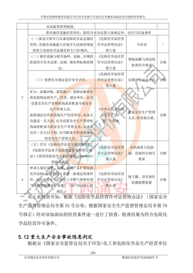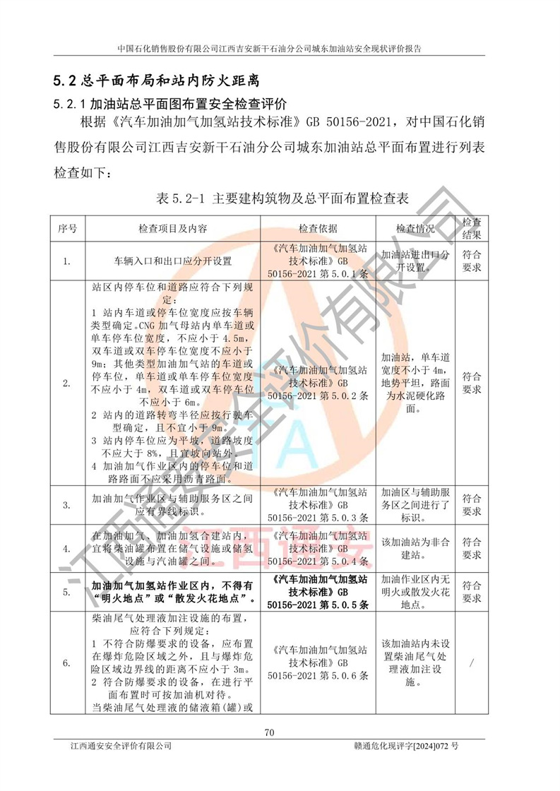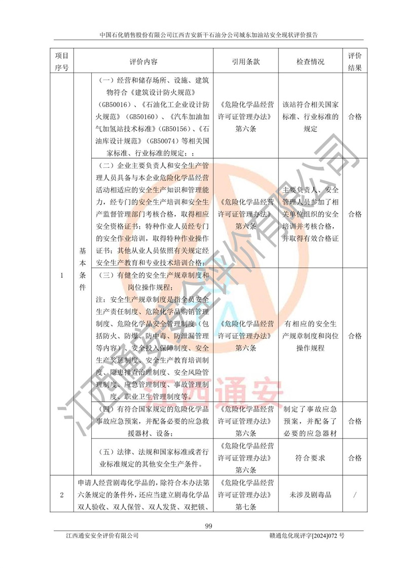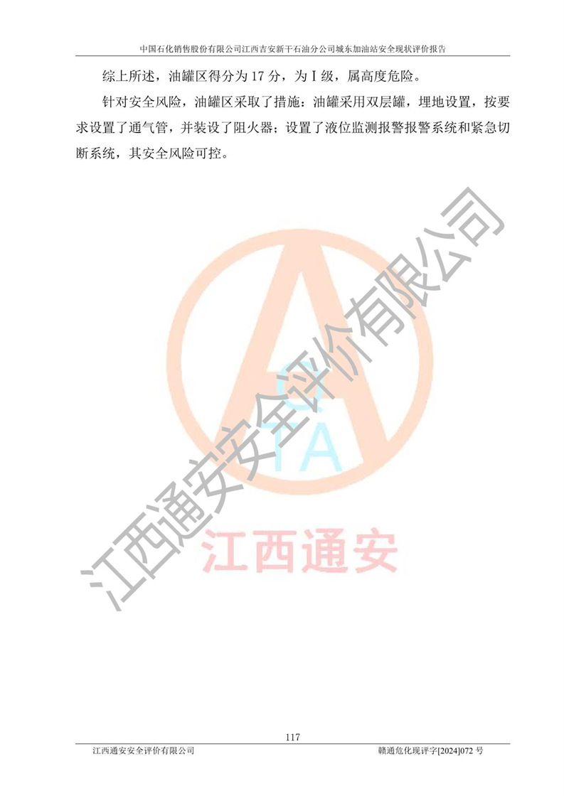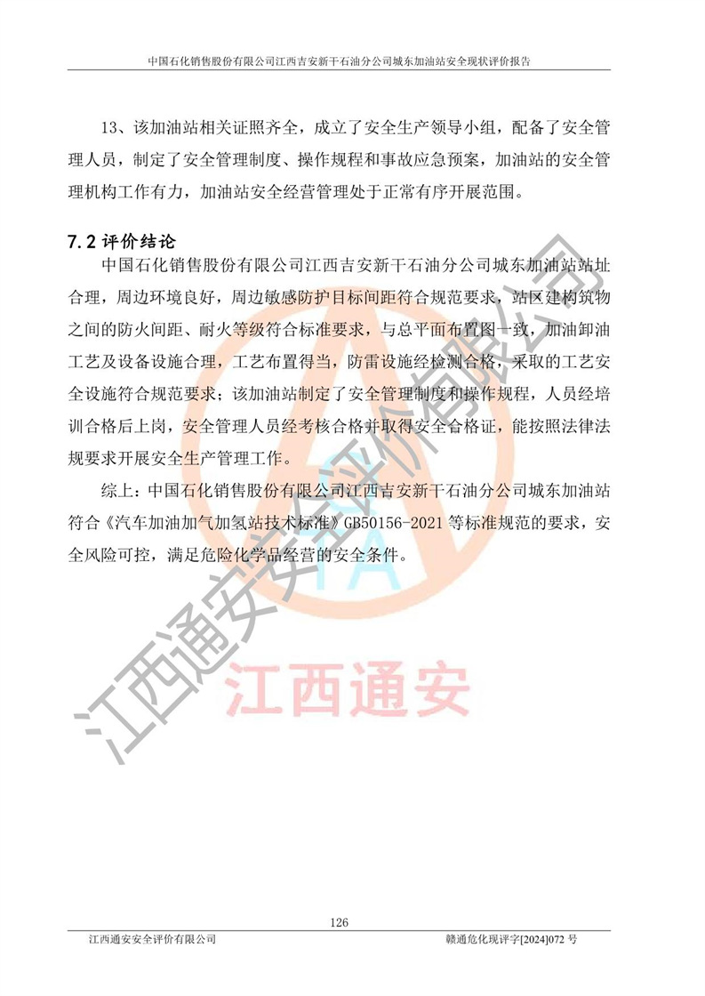 评价结论 | 中国石化销售股份有限公司江西吉安新干石油分公司城东加油站符合《汽车加油加气加氢站技术标准》GB50156-2021等标准规范的要求,安全风险可控,满足危险化学品经营的安全条件。 | |||