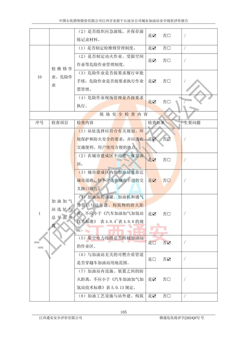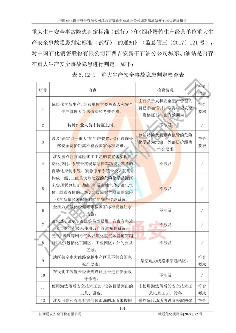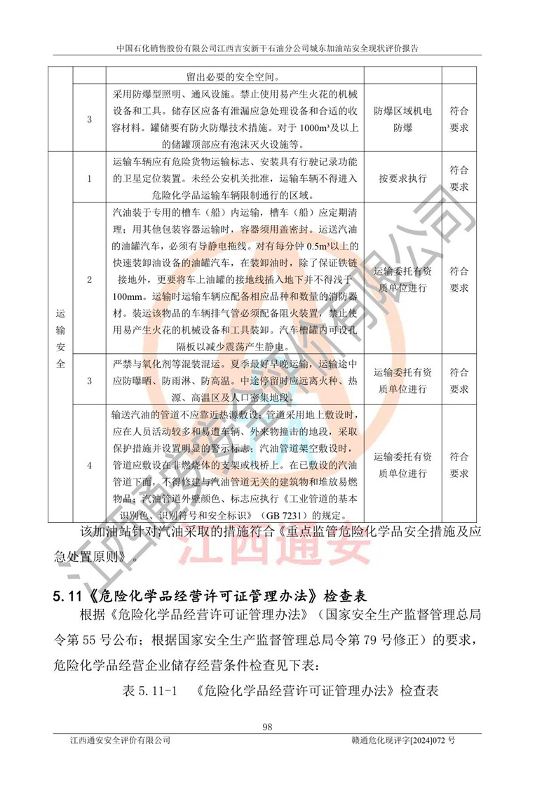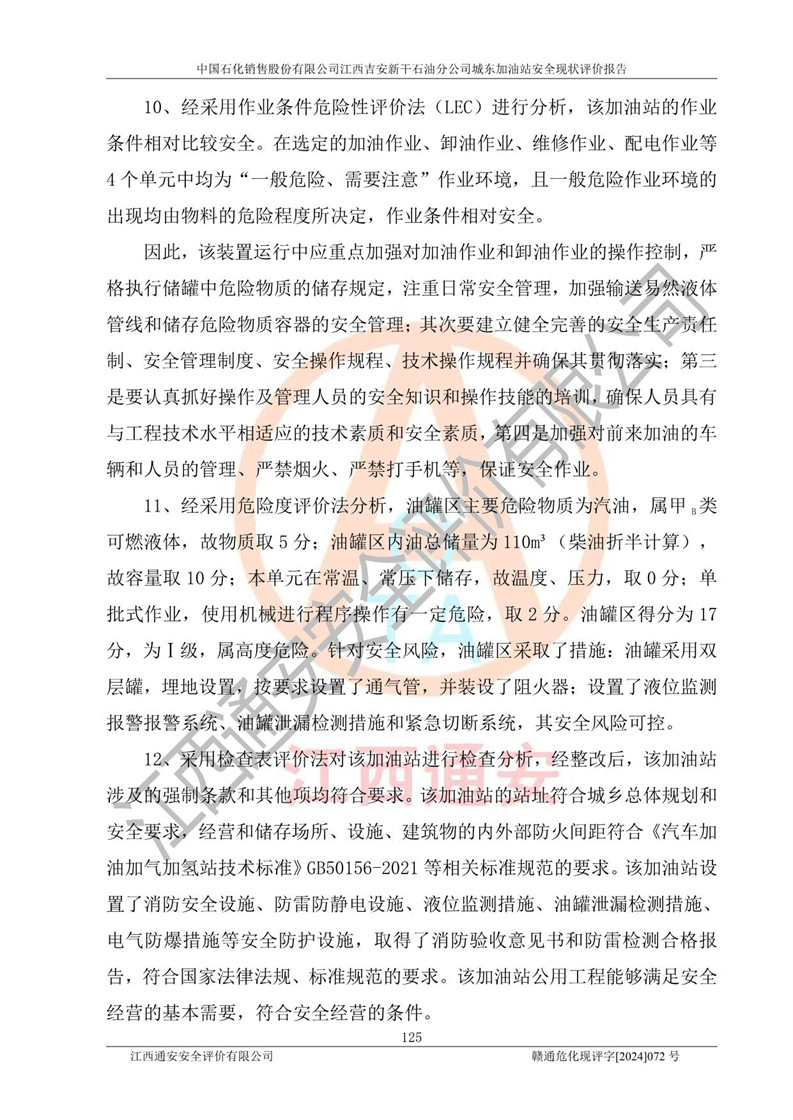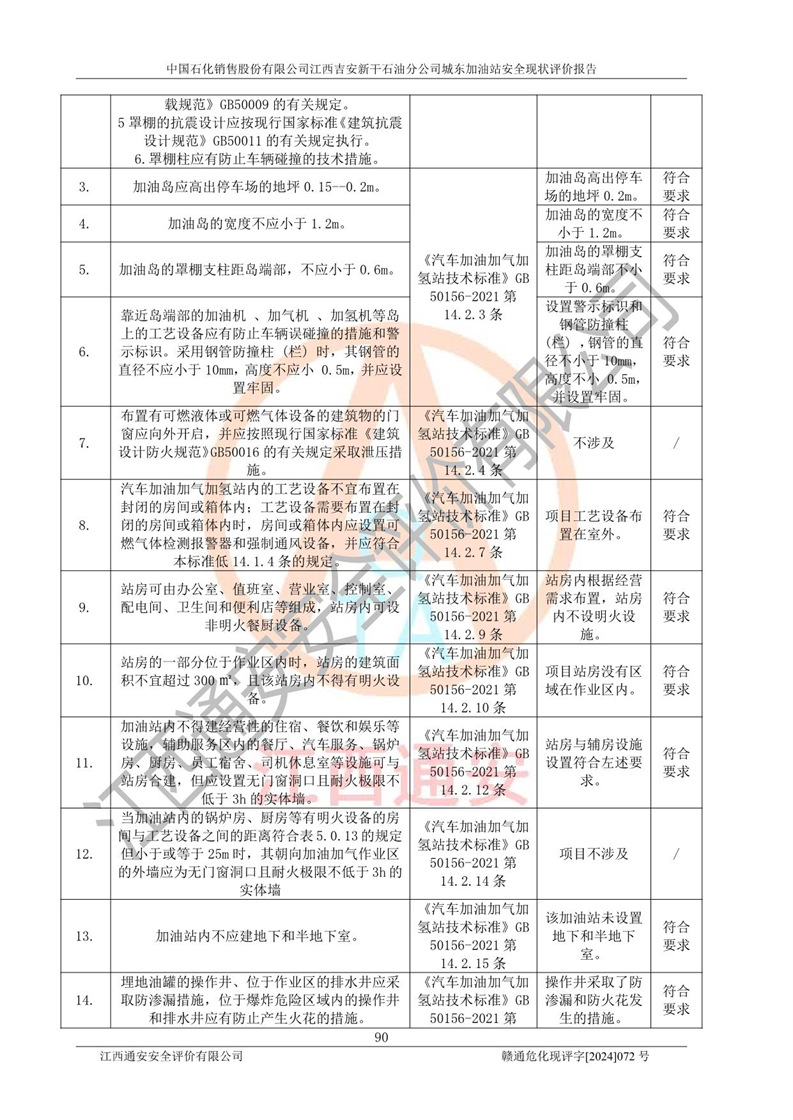 评价结论 | 中国石化销售股份有限公司江西吉安新干石油分公司城东加油站符合《汽车加油加气加氢站技术标准》GB50156-2021等标准规范的要求,安全风险可控,满足危险化学品经营的安全条件。 | |||