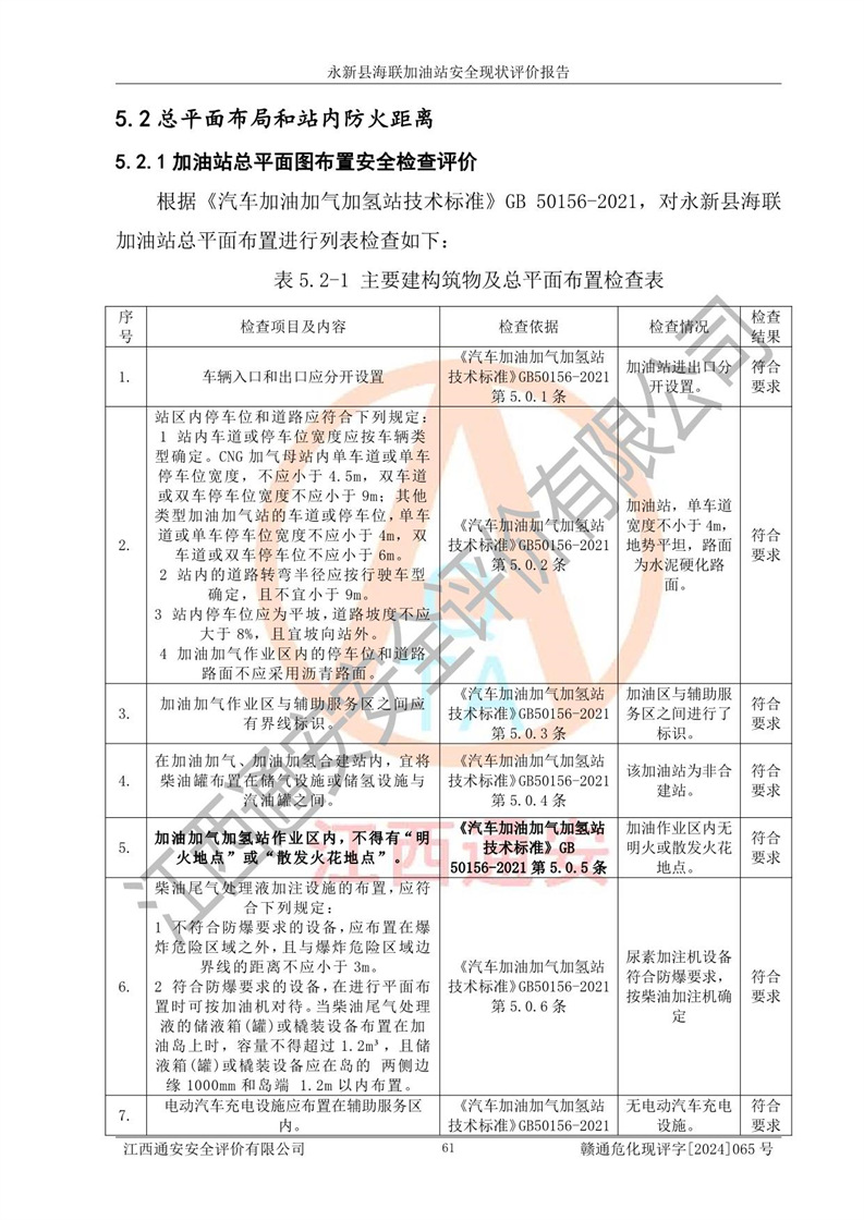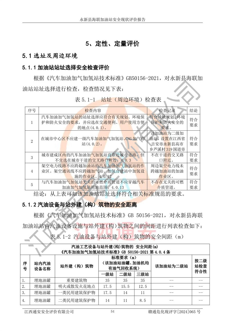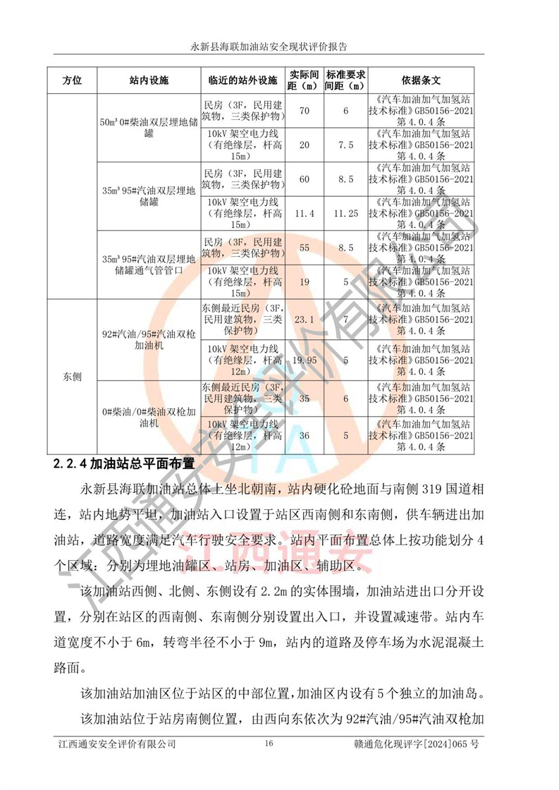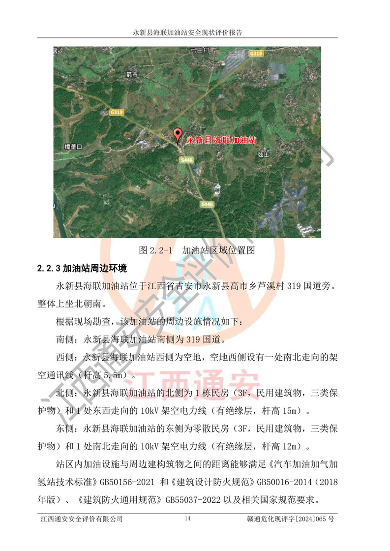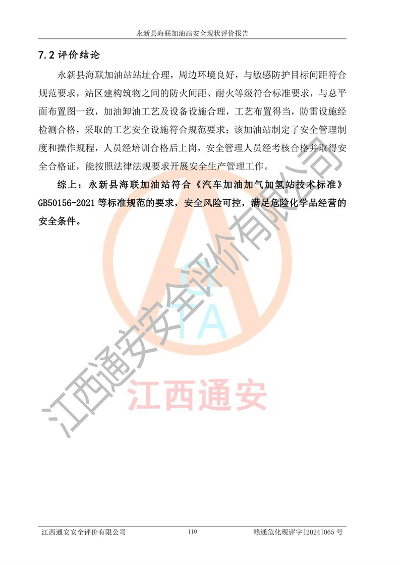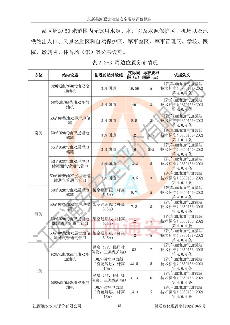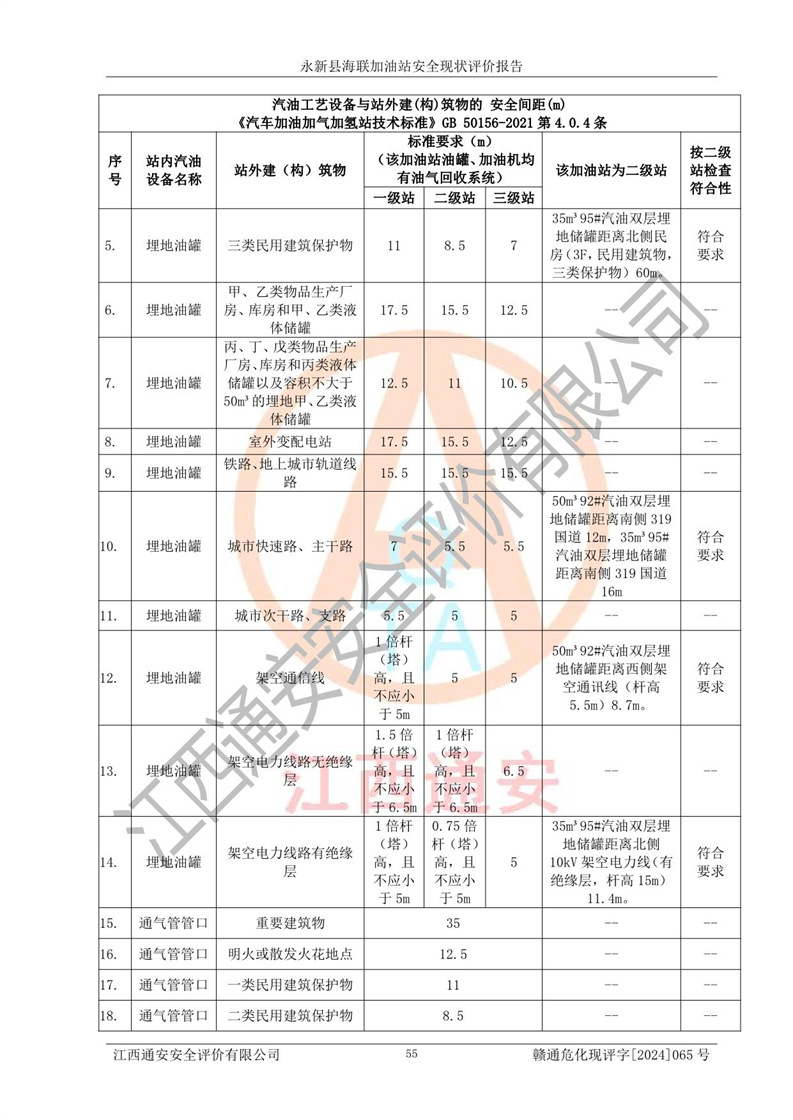 评价结论 | 永新县海联加油站站址合理,周边环境良好,与敏感防护目标间距符合规范要求,站区建构筑物之间的防火间距、耐火等级符合标准要求,与总平面布置图一致,加油卸油工艺及设备设施合理,工艺布置得当,防雷设施经检测合格,采取的工艺安全设施符合规范要求;该加油站制定了安全管理制度和操作规程,人员经培训合格后上岗,安全管理人员经考核合格并取得安全合格证,能按照法律法规要求开展安全生产管理工作。 综上:永新县海联加油站符合《汽车加油加气加氢站技术标准》GB50156-2021等标准规范的要求,安全风险可控,满足危险化学品经营的安全条件。 | |||
