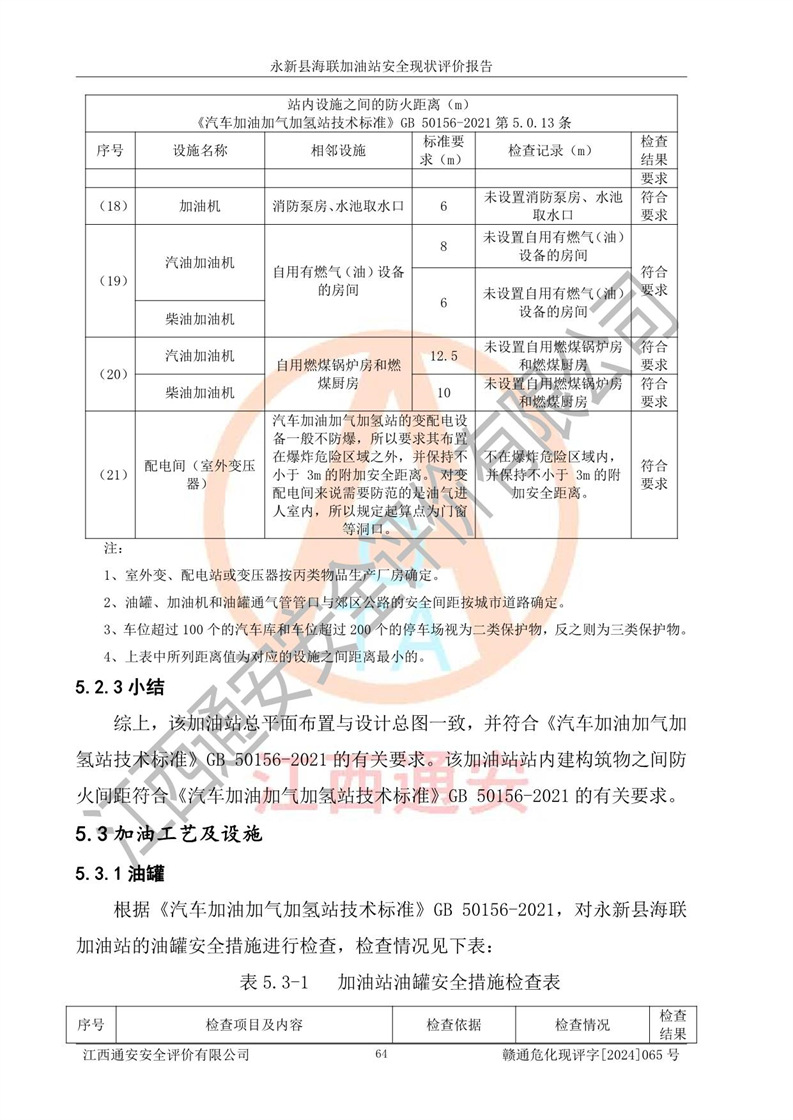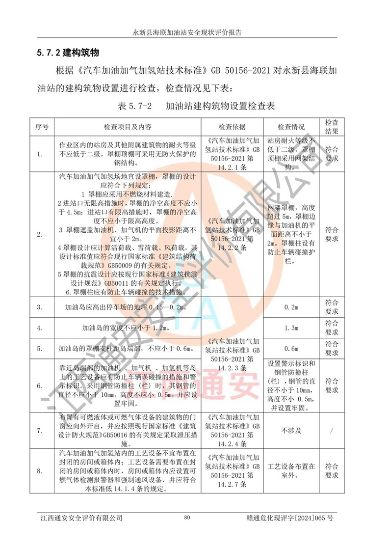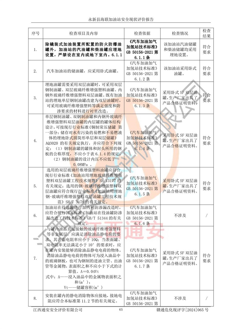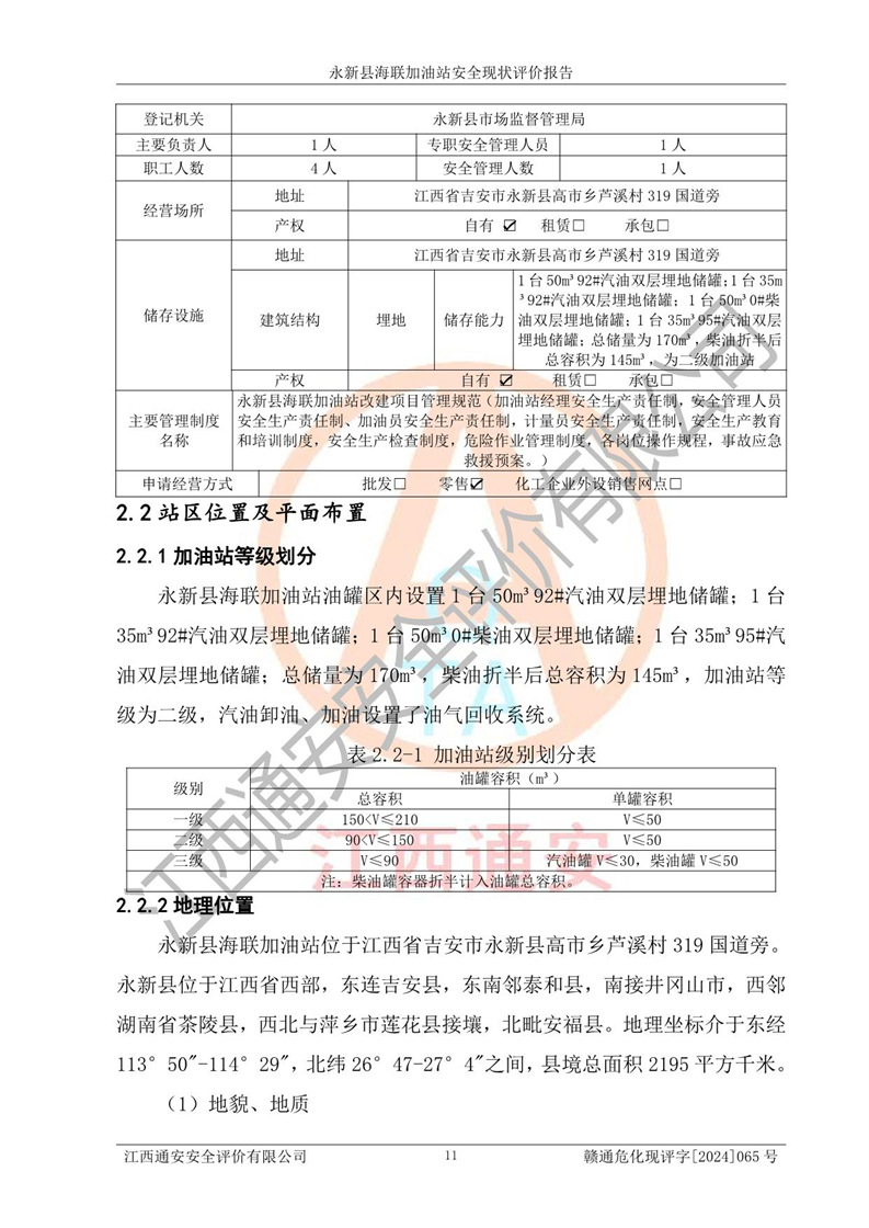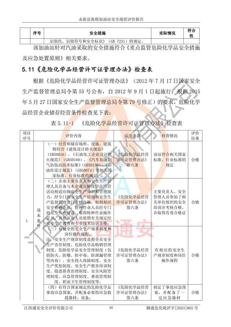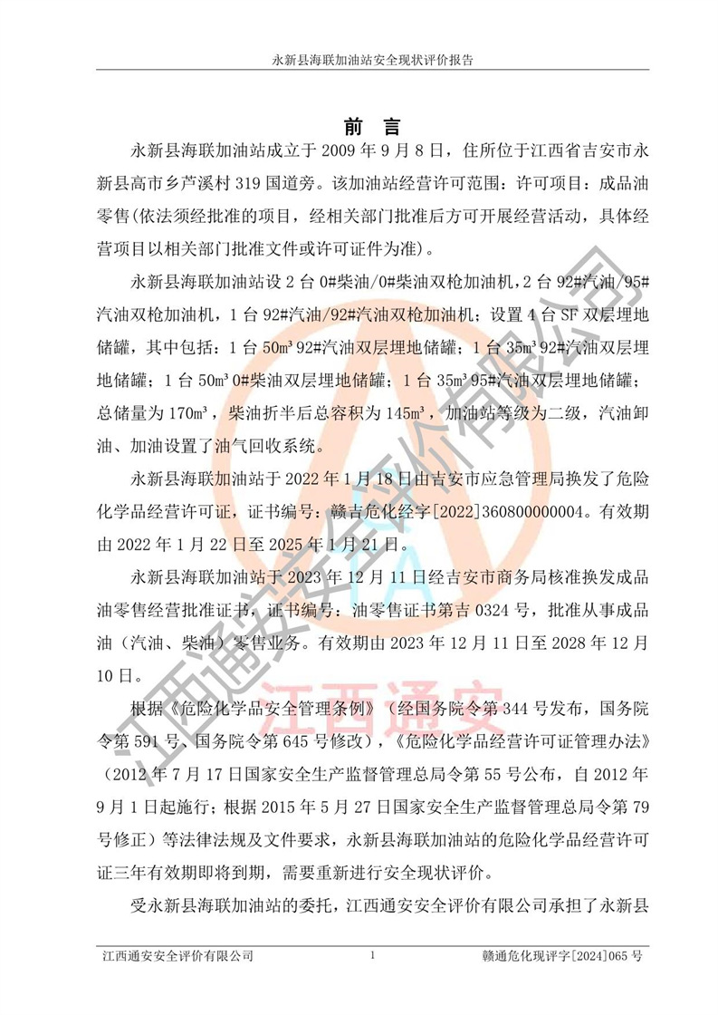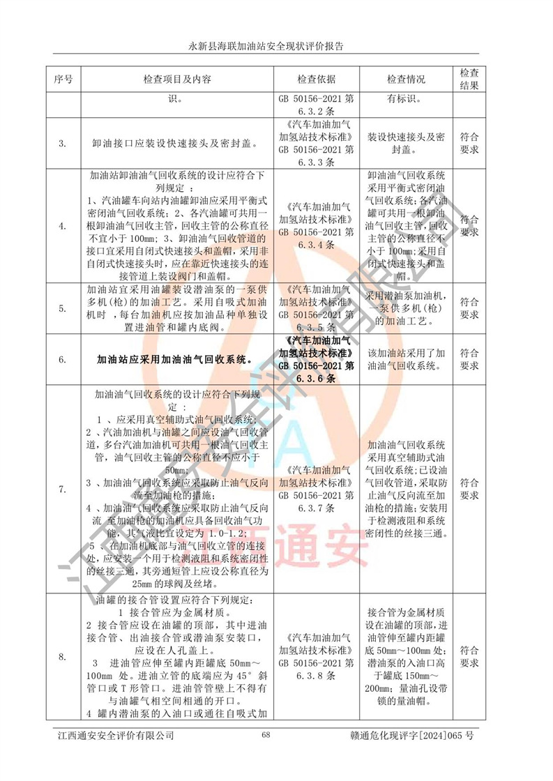 评价结论 | 永新县海联加油站站址合理,周边环境良好,与敏感防护目标间距符合规范要求,站区建构筑物之间的防火间距、耐火等级符合标准要求,与总平面布置图一致,加油卸油工艺及设备设施合理,工艺布置得当,防雷设施经检测合格,采取的工艺安全设施符合规范要求;该加油站制定了安全管理制度和操作规程,人员经培训合格后上岗,安全管理人员经考核合格并取得安全合格证,能按照法律法规要求开展安全生产管理工作。 综上:永新县海联加油站符合《汽车加油加气加氢站技术标准》GB50156-2021等标准规范的要求,安全风险可控,满足危险化学品经营的安全条件。 | |||