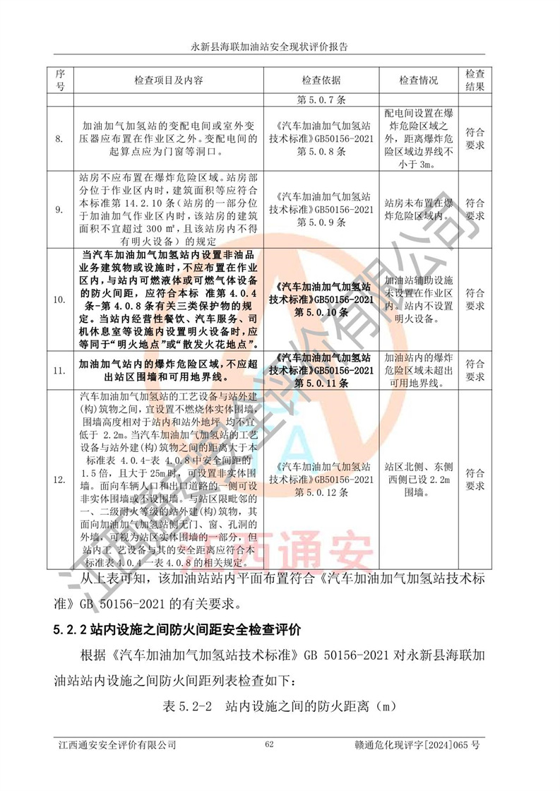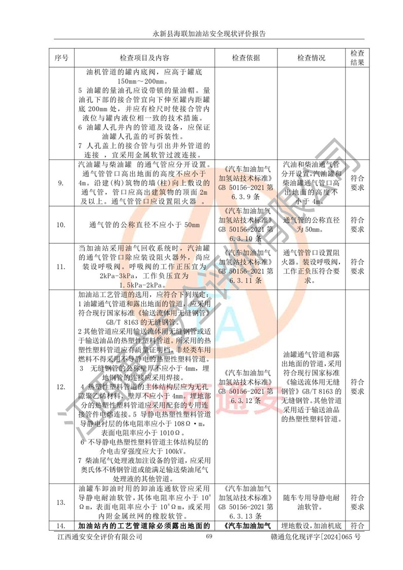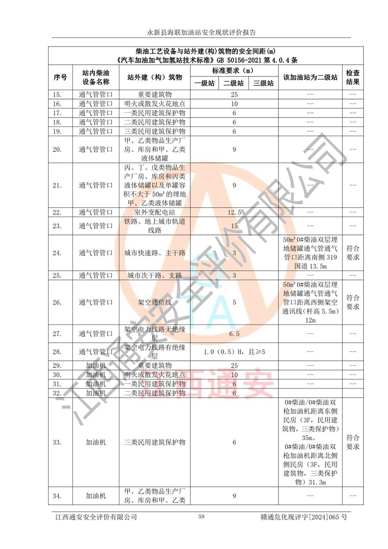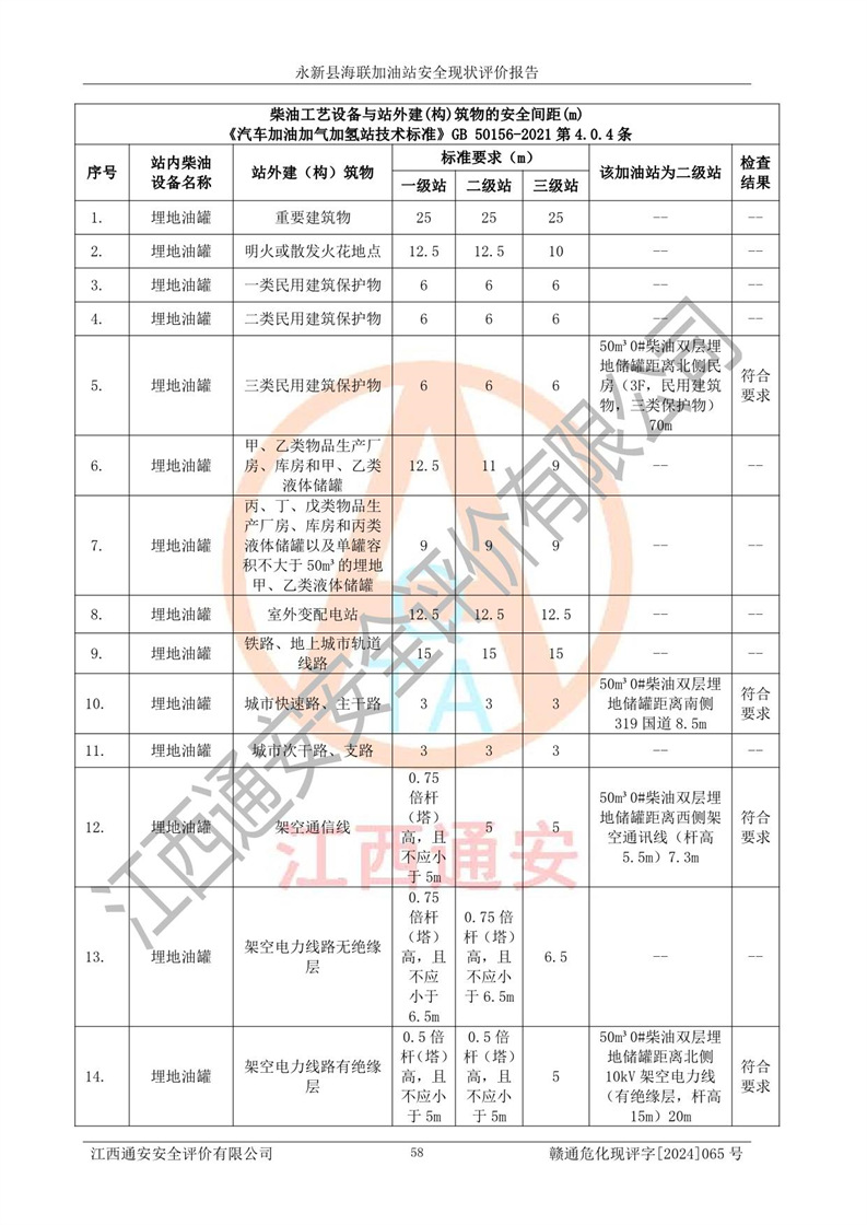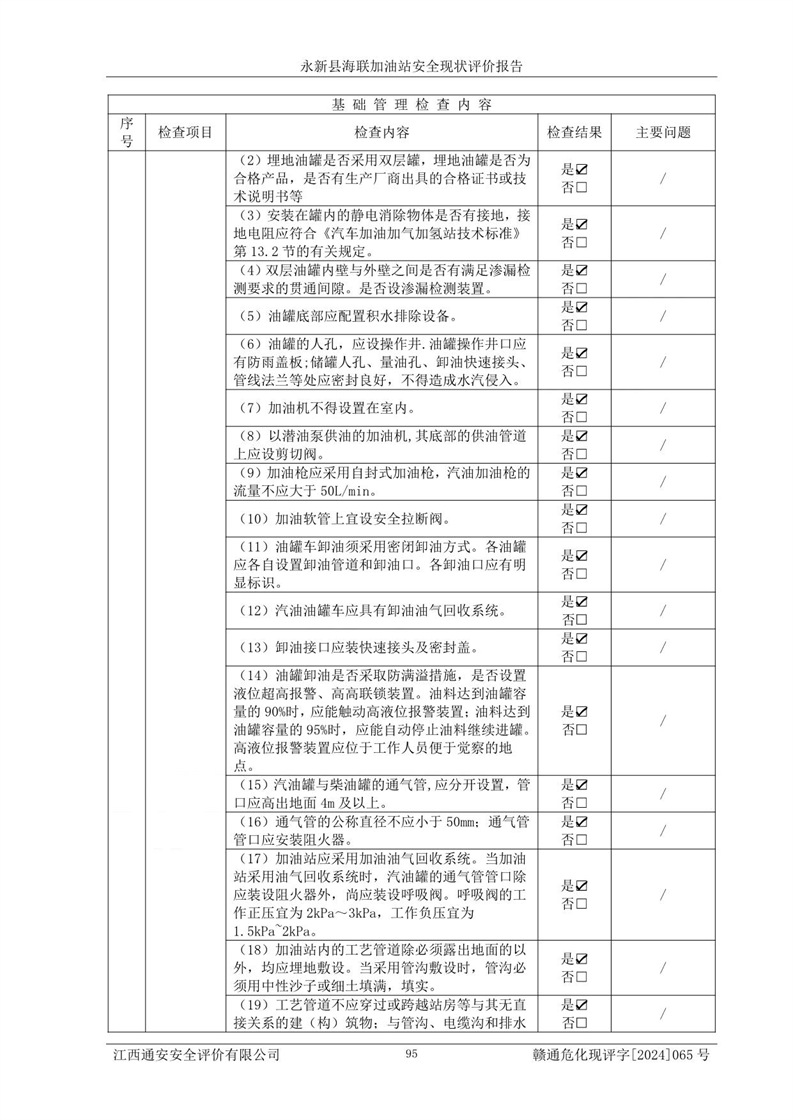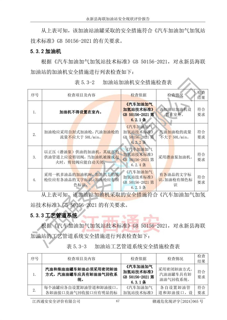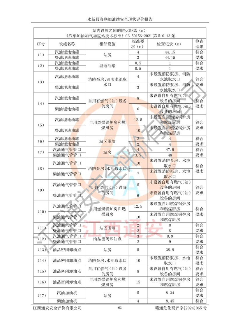 评价结论 | 永新县海联加油站站址合理,周边环境良好,与敏感防护目标间距符合规范要求,站区建构筑物之间的防火间距、耐火等级符合标准要求,与总平面布置图一致,加油卸油工艺及设备设施合理,工艺布置得当,防雷设施经检测合格,采取的工艺安全设施符合规范要求;该加油站制定了安全管理制度和操作规程,人员经培训合格后上岗,安全管理人员经考核合格并取得安全合格证,能按照法律法规要求开展安全生产管理工作。 综上:永新县海联加油站符合《汽车加油加气加氢站技术标准》GB50156-2021等标准规范的要求,安全风险可控,满足危险化学品经营的安全条件。 | |||