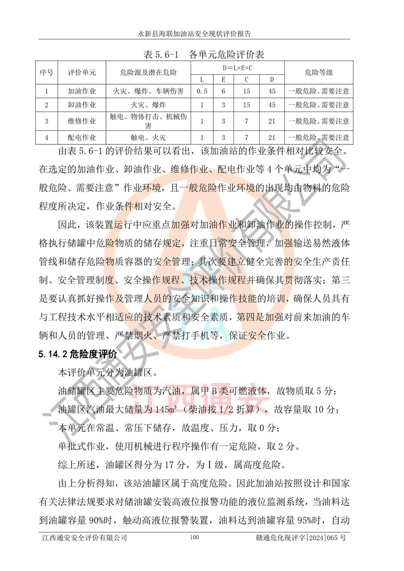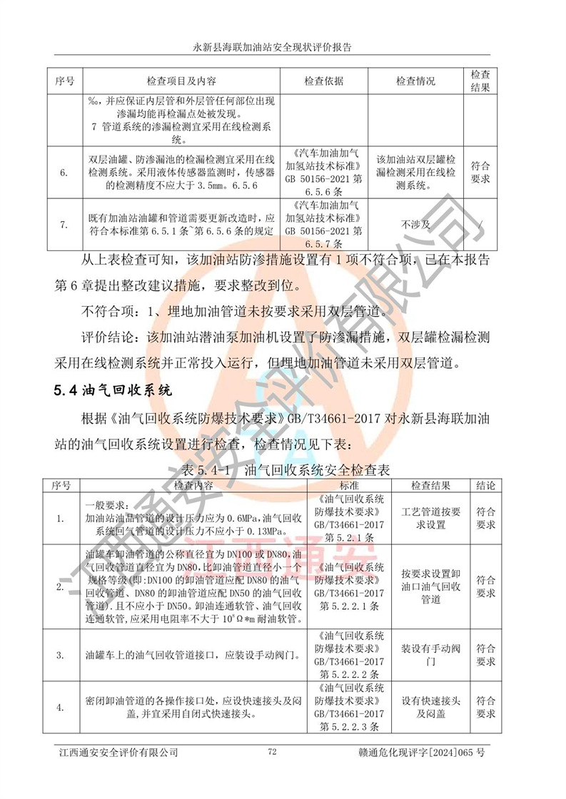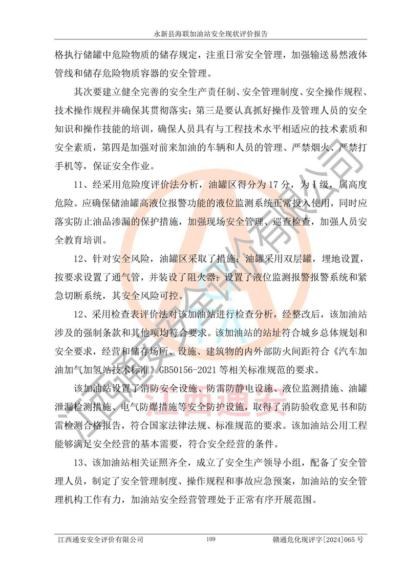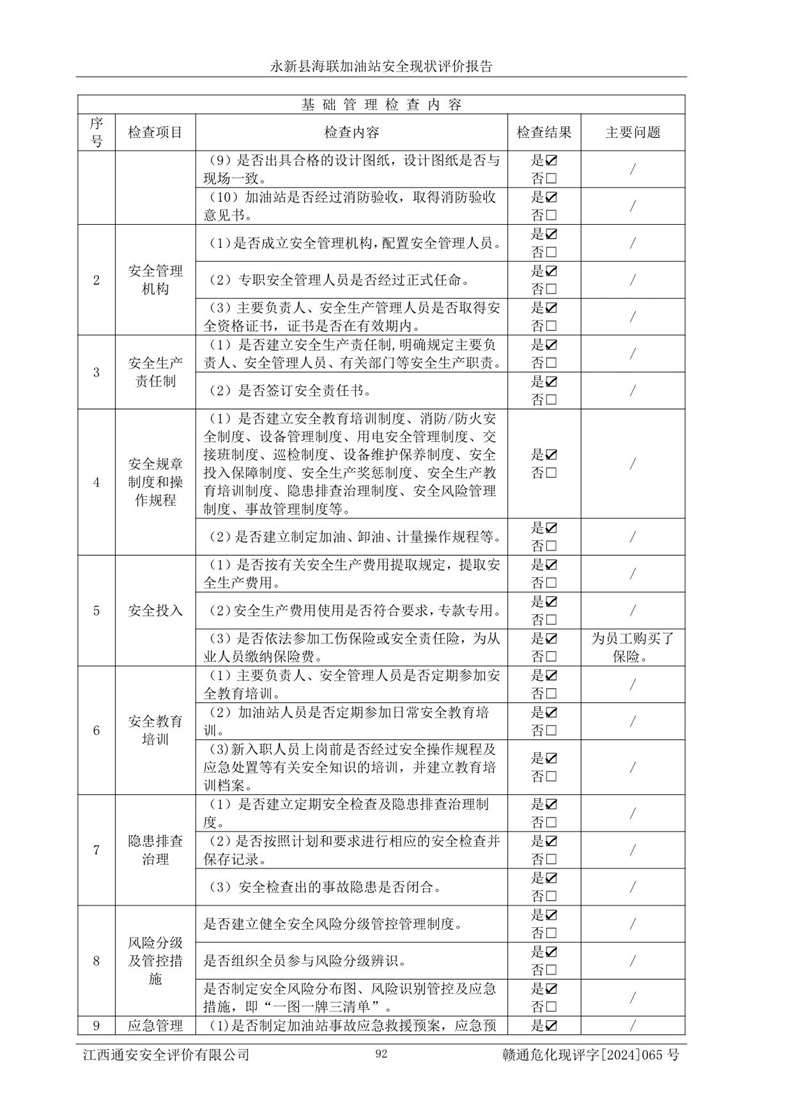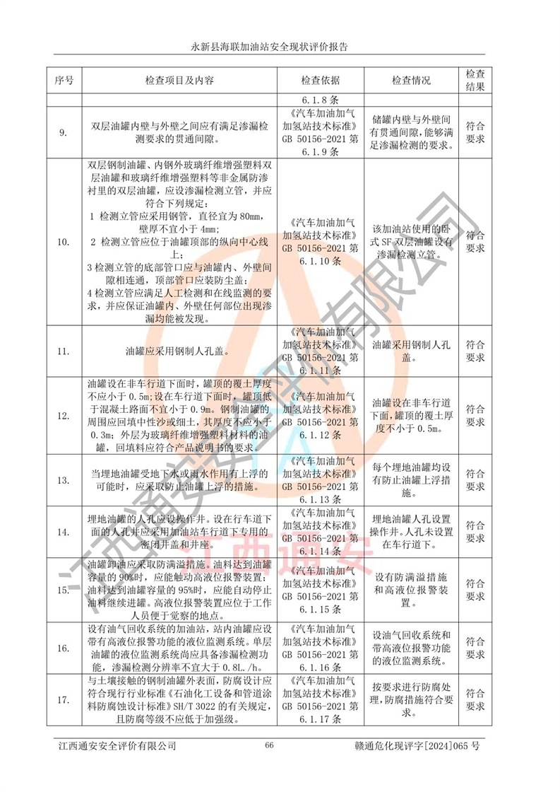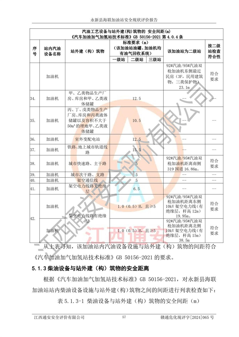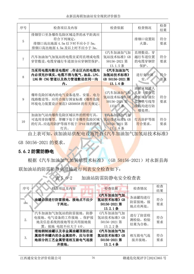 评价结论 | 永新县海联加油站站址合理,周边环境良好,与敏感防护目标间距符合规范要求,站区建构筑物之间的防火间距、耐火等级符合标准要求,与总平面布置图一致,加油卸油工艺及设备设施合理,工艺布置得当,防雷设施经检测合格,采取的工艺安全设施符合规范要求;该加油站制定了安全管理制度和操作规程,人员经培训合格后上岗,安全管理人员经考核合格并取得安全合格证,能按照法律法规要求开展安全生产管理工作。 综上:永新县海联加油站符合《汽车加油加气加氢站技术标准》GB50156-2021等标准规范的要求,安全风险可控,满足危险化学品经营的安全条件。 | |||