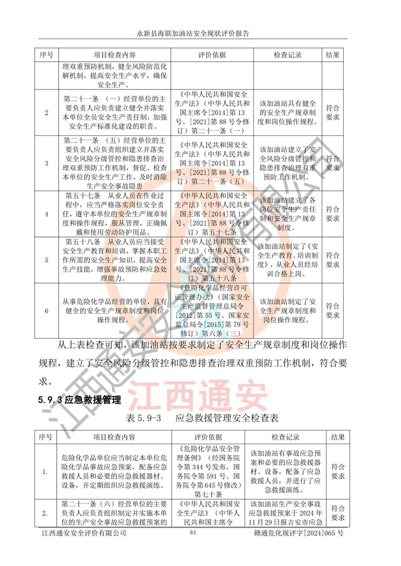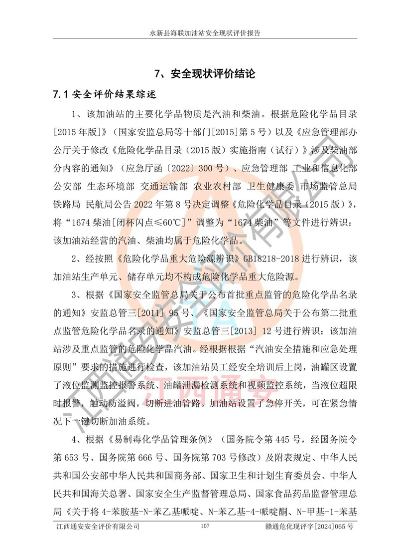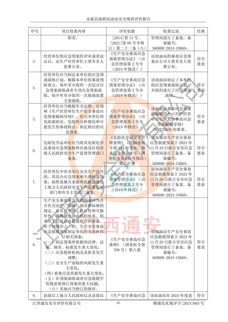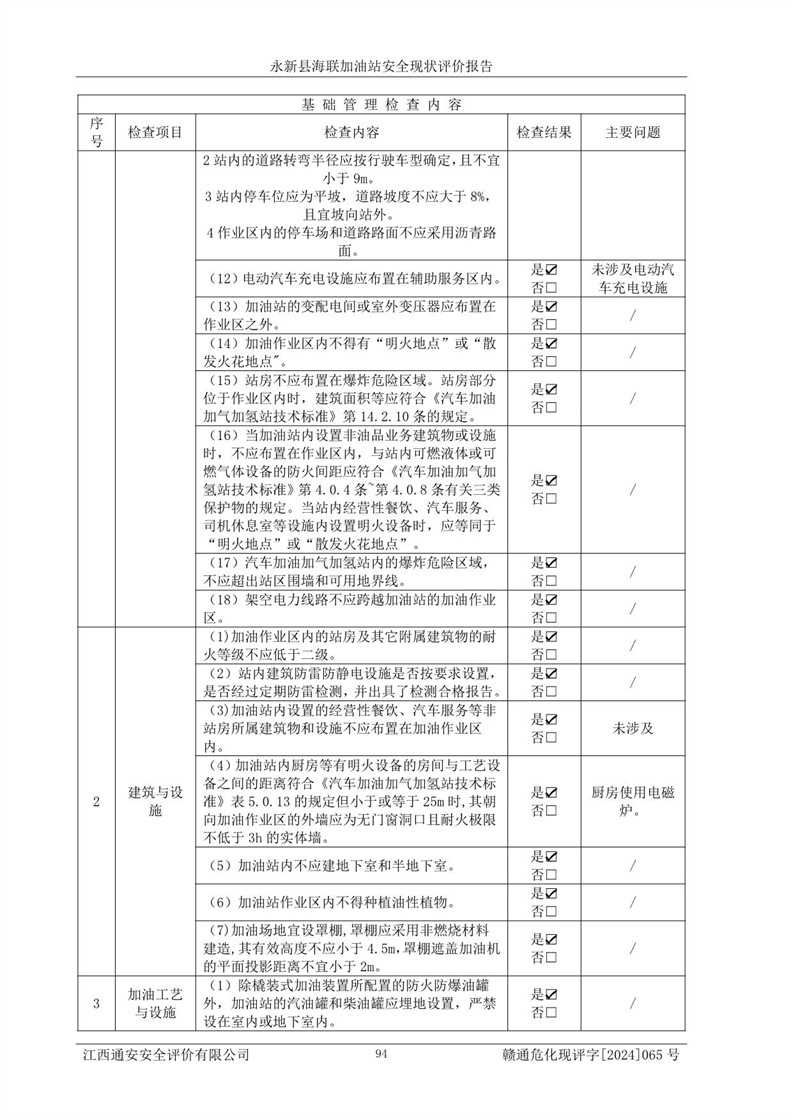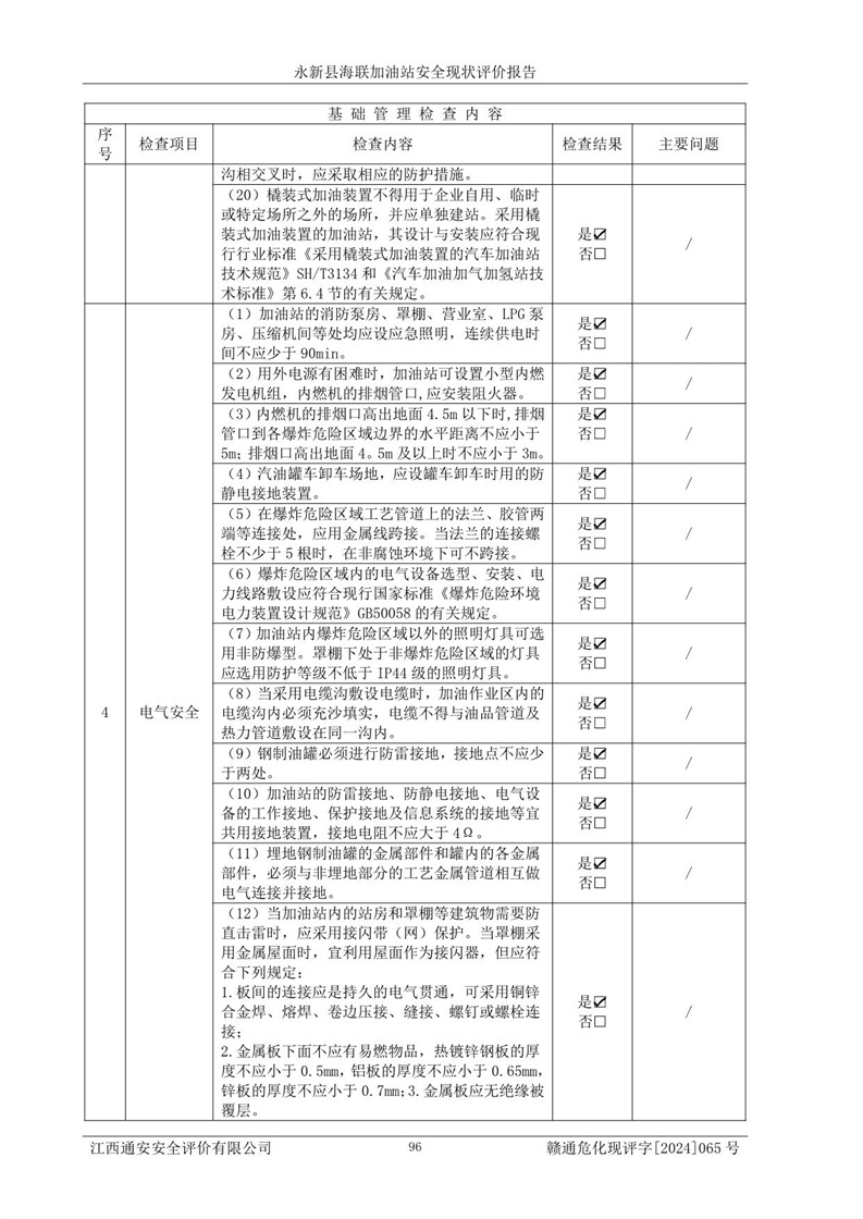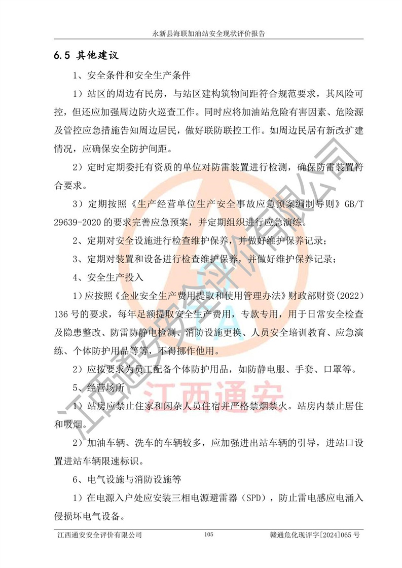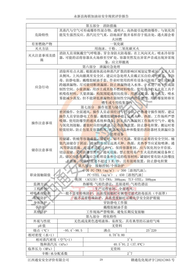评价结论 | 永新县海联加油站站址合理,周边环境良好,与敏感防护目标间距符合规范要求,站区建构筑物之间的防火间距、耐火等级符合标准要求,与总平面布置图一致,加油卸油工艺及设备设施合理,工艺布置得当,防雷设施经检测合格,采取的工艺安全设施符合规范要求;该加油站制定了安全管理制度和操作规程,人员经培训合格后上岗,安全管理人员经考核合格并取得安全合格证,能按照法律法规要求开展安全生产管理工作。 综上:永新县海联加油站符合《汽车加油加气加氢站技术标准》GB50156-2021等标准规范的要求,安全风险可控,满足危险化学品经营的安全条件。 | |||