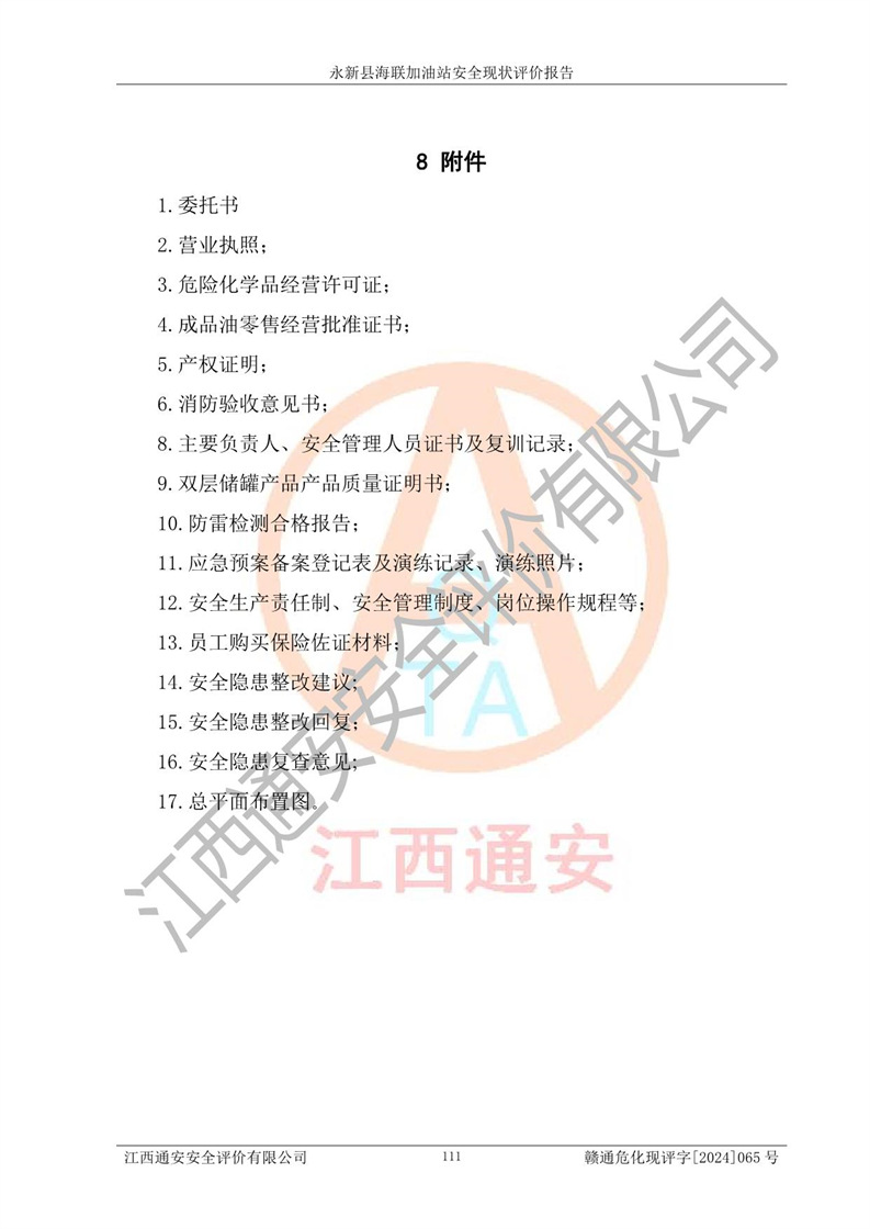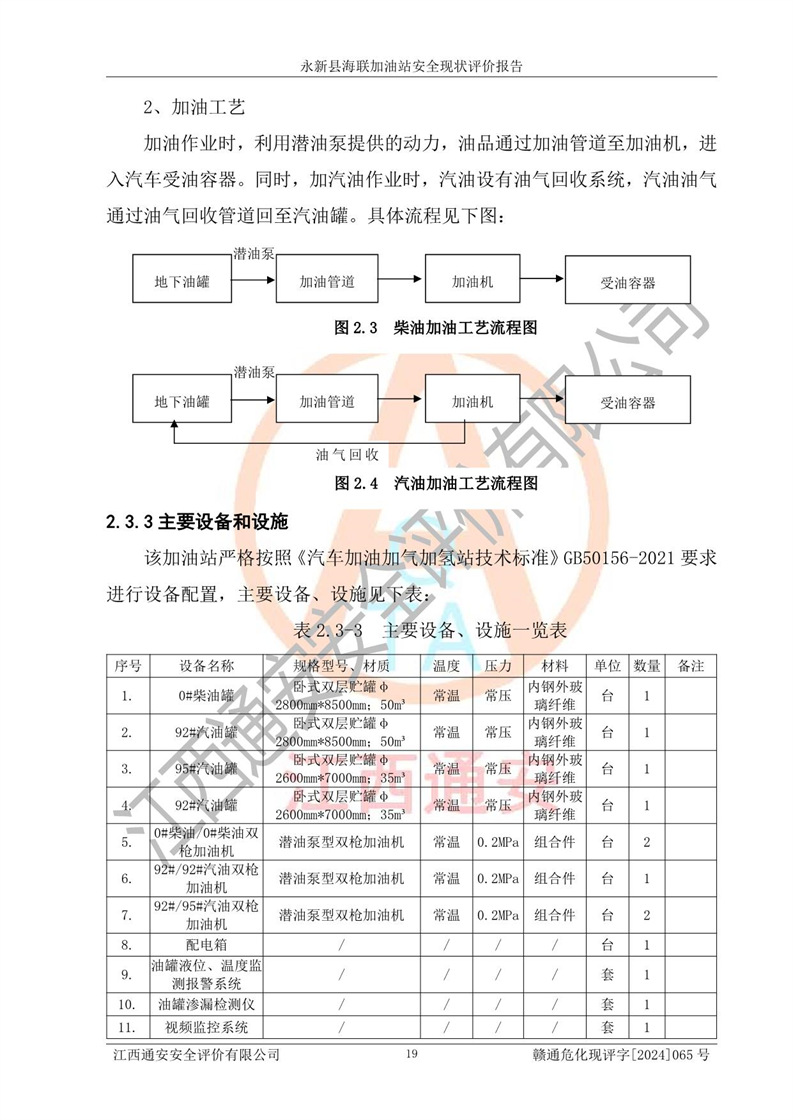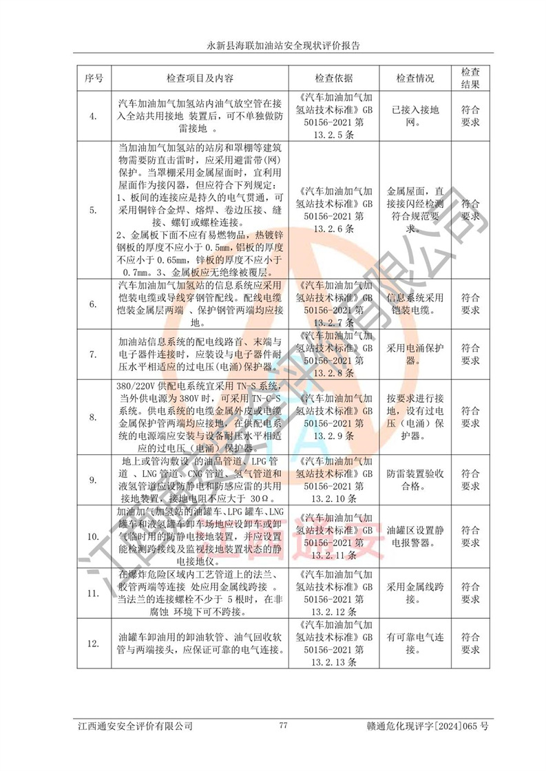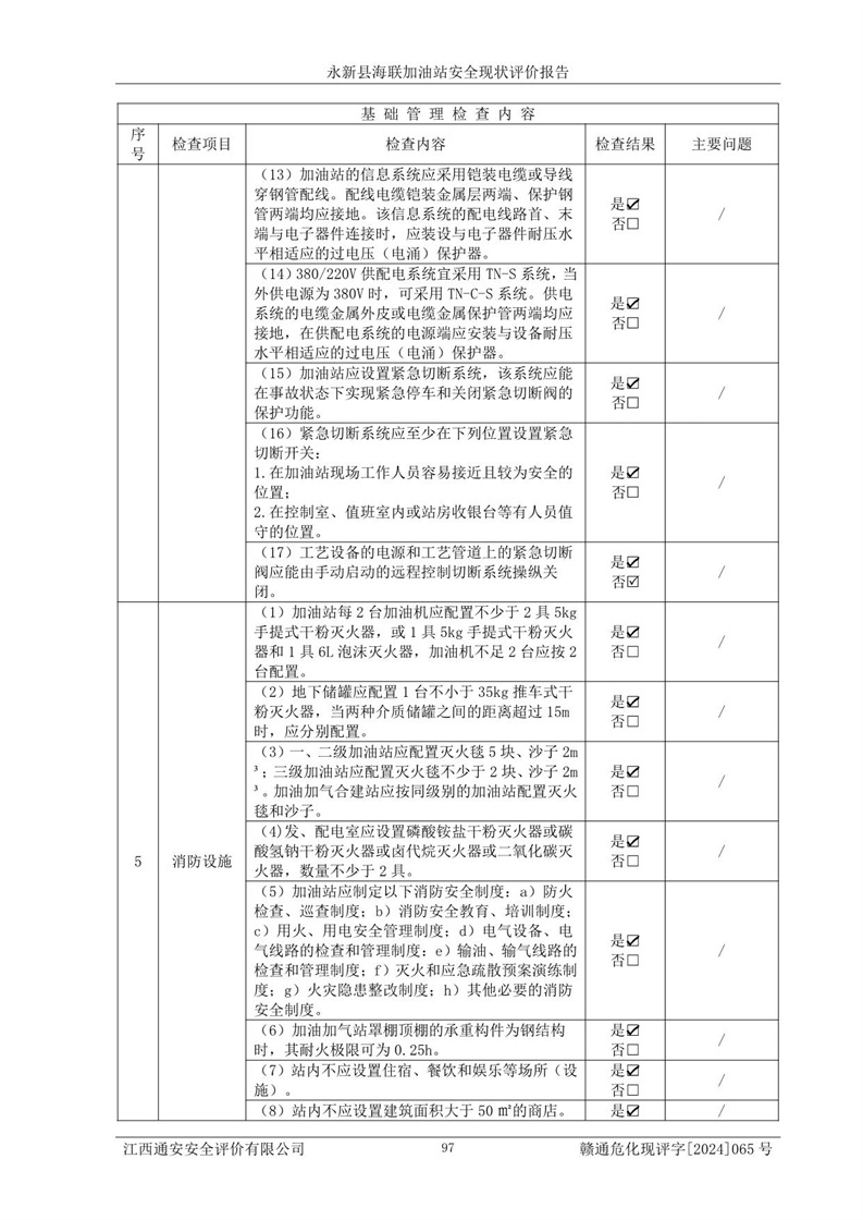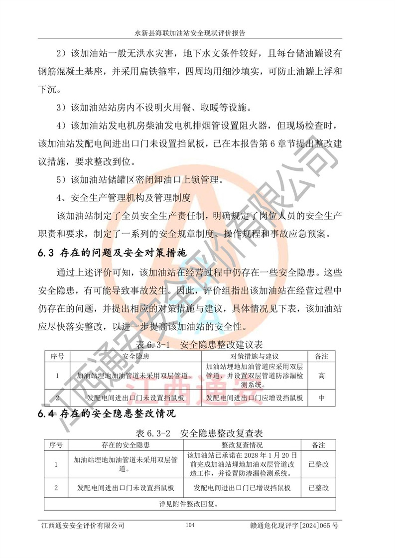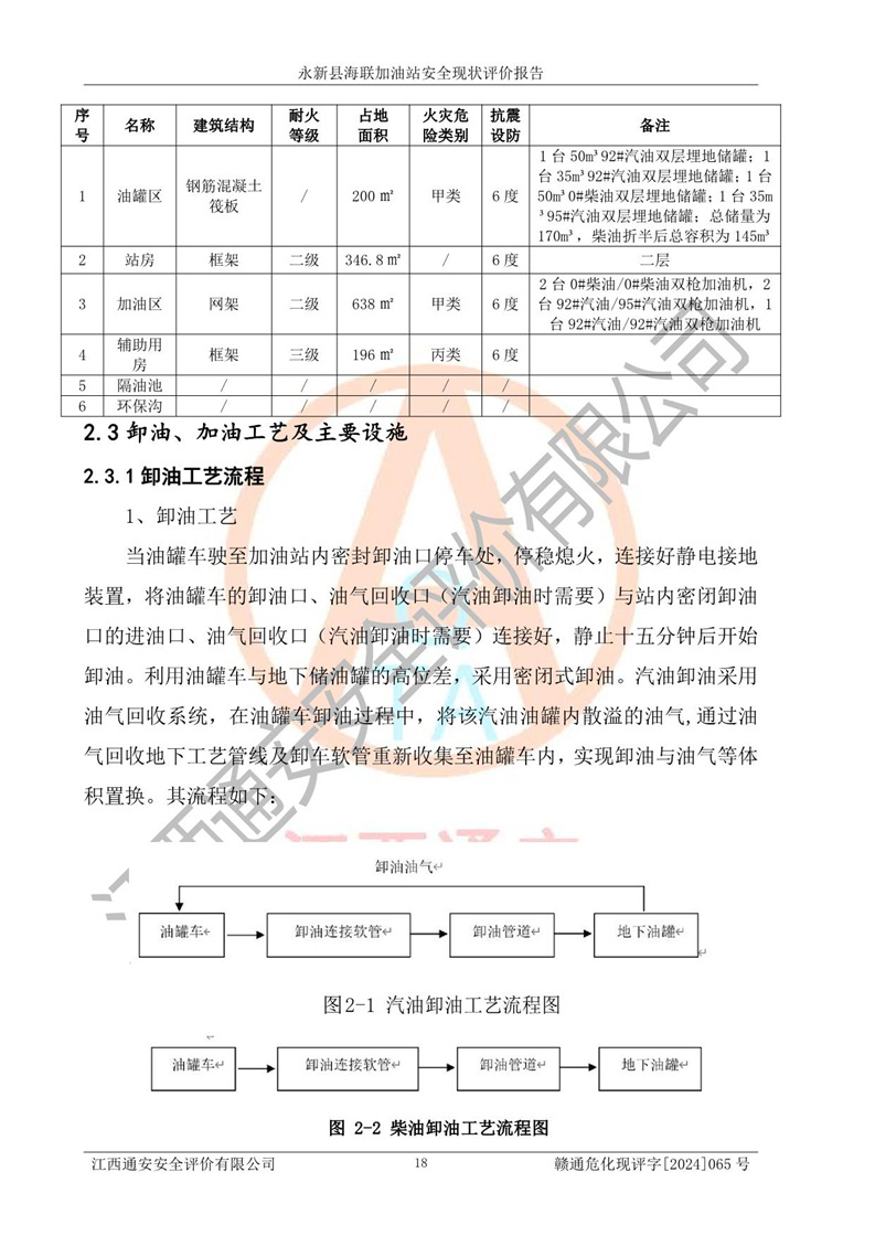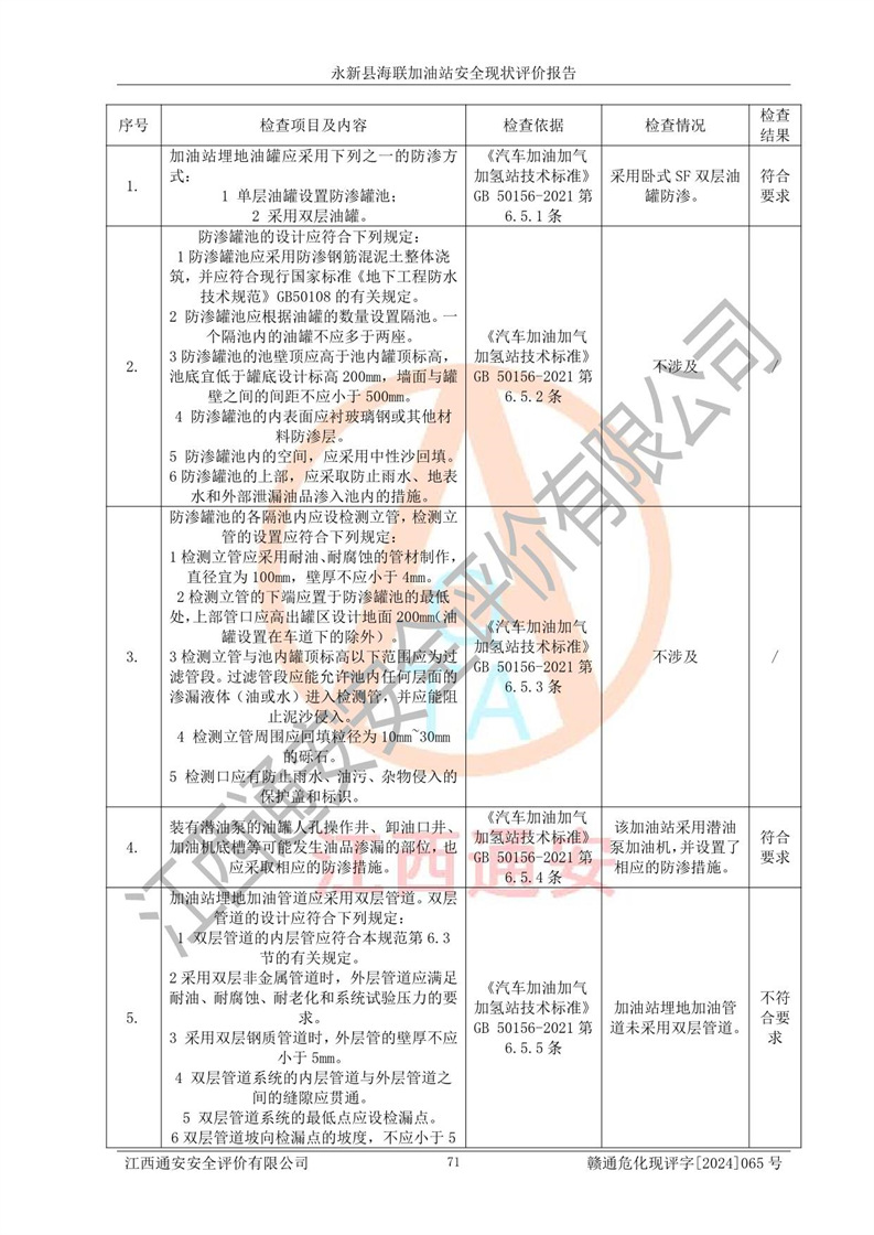评价结论 | 永新县海联加油站站址合理,周边环境良好,与敏感防护目标间距符合规范要求,站区建构筑物之间的防火间距、耐火等级符合标准要求,与总平面布置图一致,加油卸油工艺及设备设施合理,工艺布置得当,防雷设施经检测合格,采取的工艺安全设施符合规范要求;该加油站制定了安全管理制度和操作规程,人员经培训合格后上岗,安全管理人员经考核合格并取得安全合格证,能按照法律法规要求开展安全生产管理工作。 综上:永新县海联加油站符合《汽车加油加气加氢站技术标准》GB50156-2021等标准规范的要求,安全风险可控,满足危险化学品经营的安全条件。 | |||
