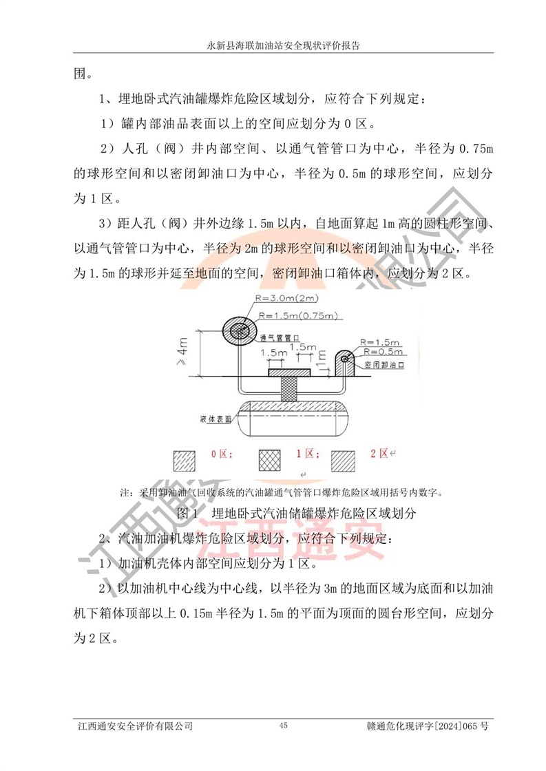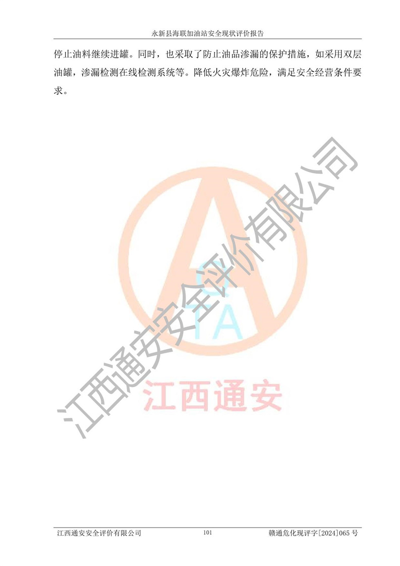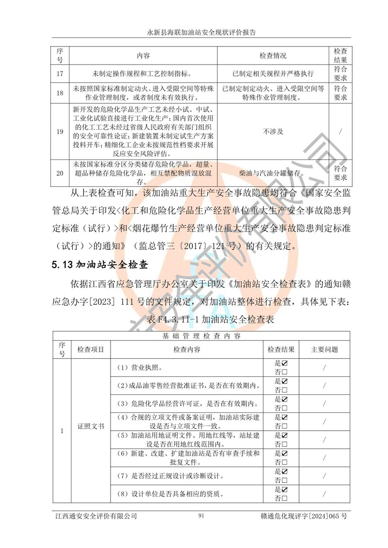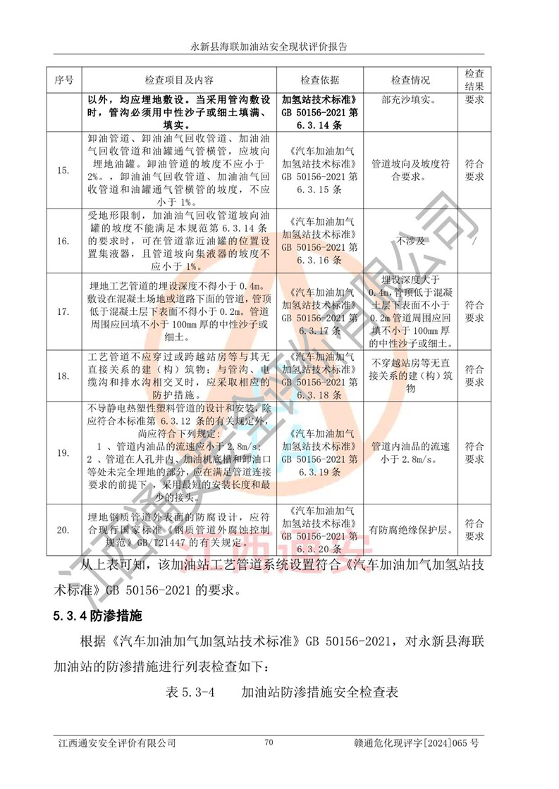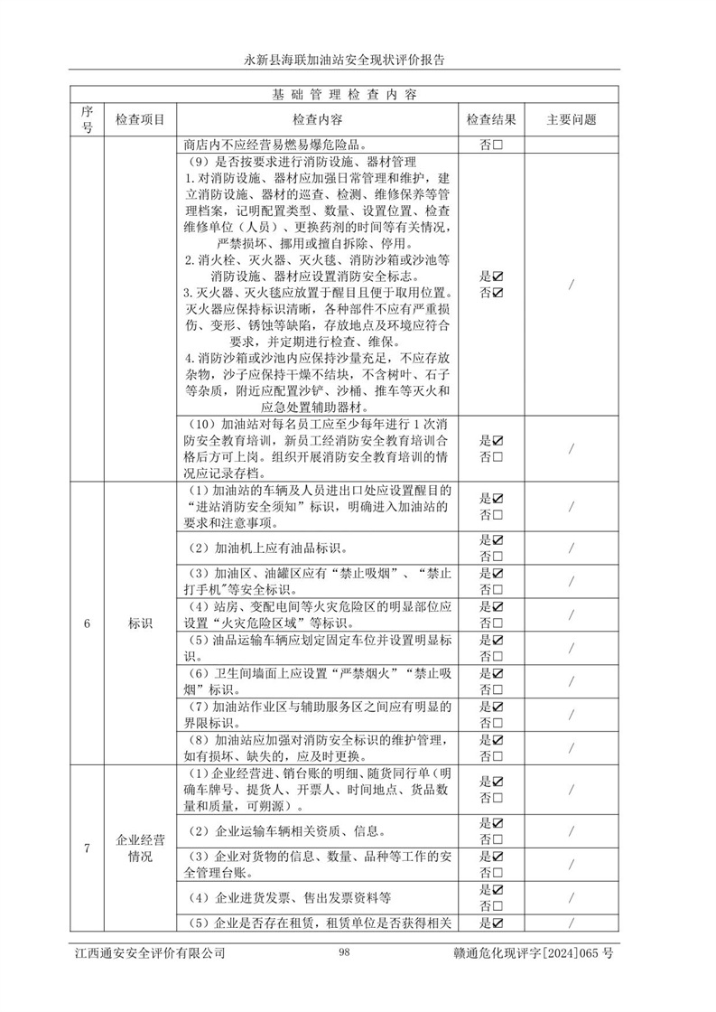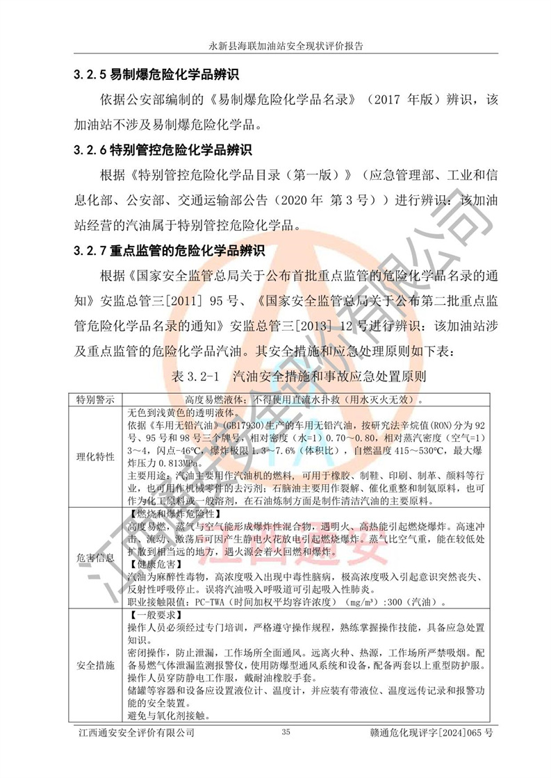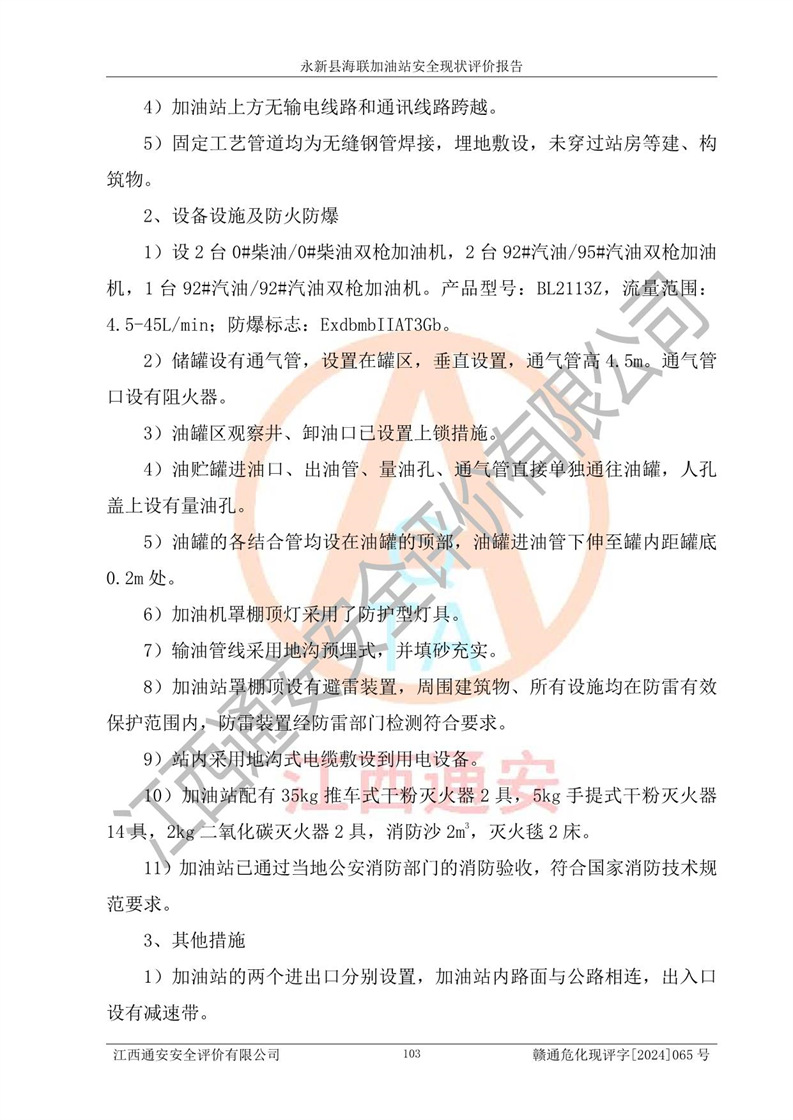 评价结论 | 永新县海联加油站站址合理,周边环境良好,与敏感防护目标间距符合规范要求,站区建构筑物之间的防火间距、耐火等级符合标准要求,与总平面布置图一致,加油卸油工艺及设备设施合理,工艺布置得当,防雷设施经检测合格,采取的工艺安全设施符合规范要求;该加油站制定了安全管理制度和操作规程,人员经培训合格后上岗,安全管理人员经考核合格并取得安全合格证,能按照法律法规要求开展安全生产管理工作。 综上:永新县海联加油站符合《汽车加油加气加氢站技术标准》GB50156-2021等标准规范的要求,安全风险可控,满足危险化学品经营的安全条件。 | |||