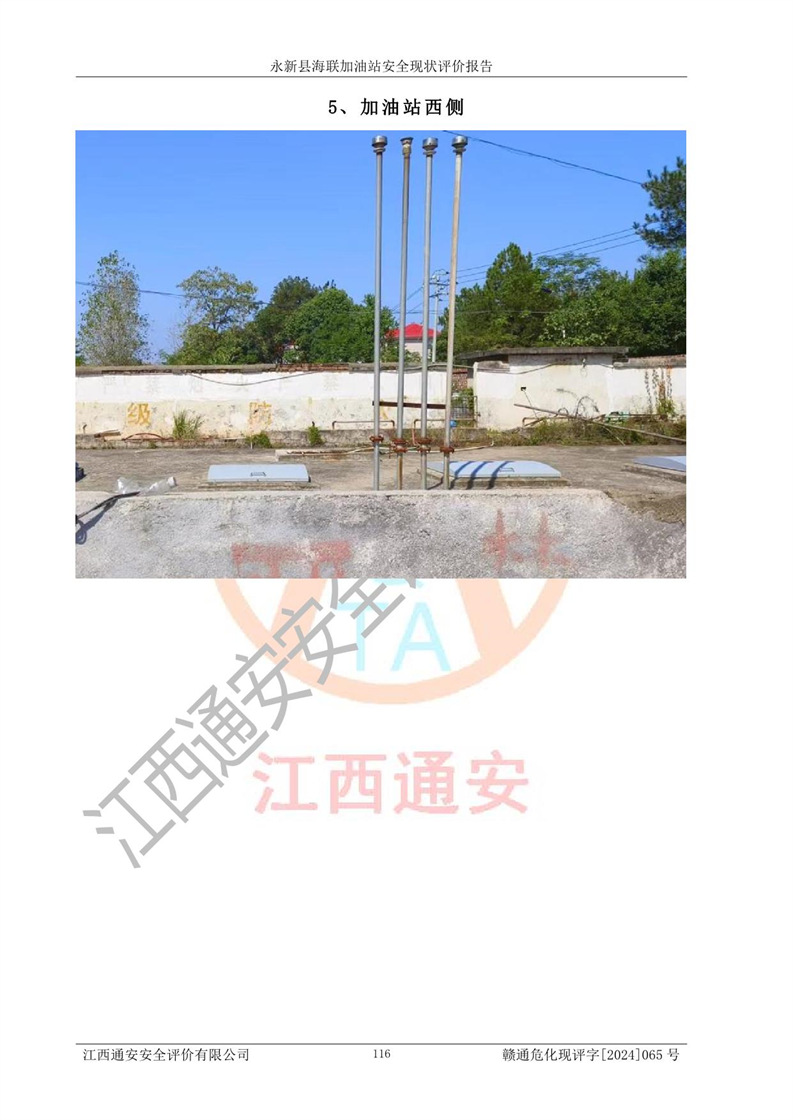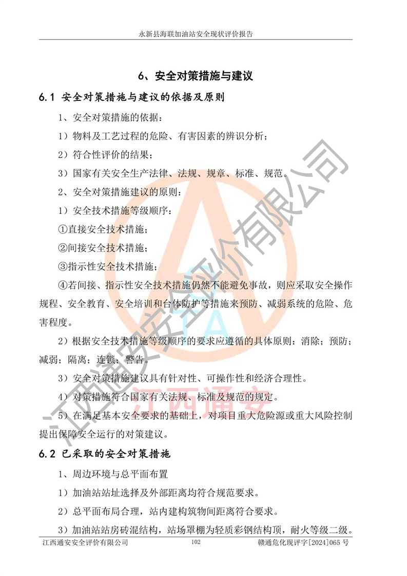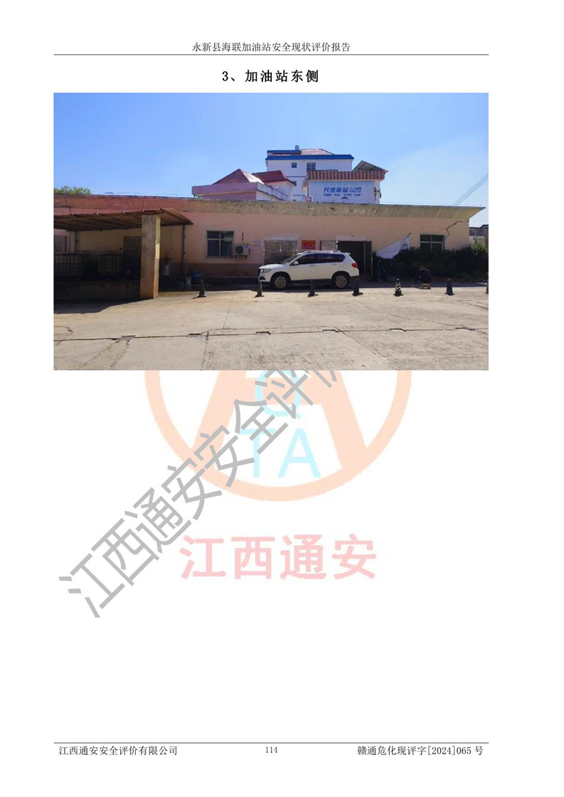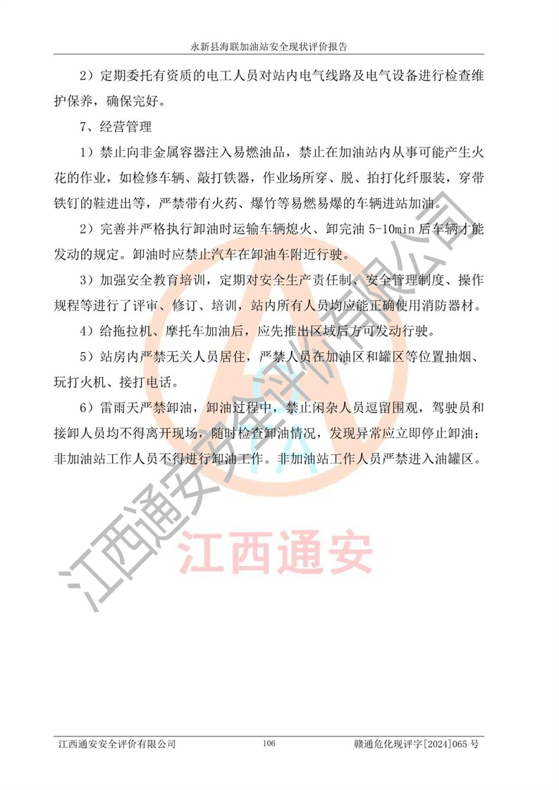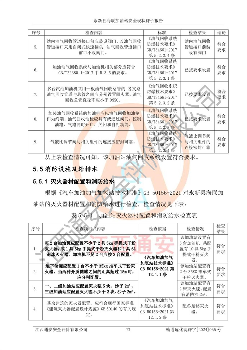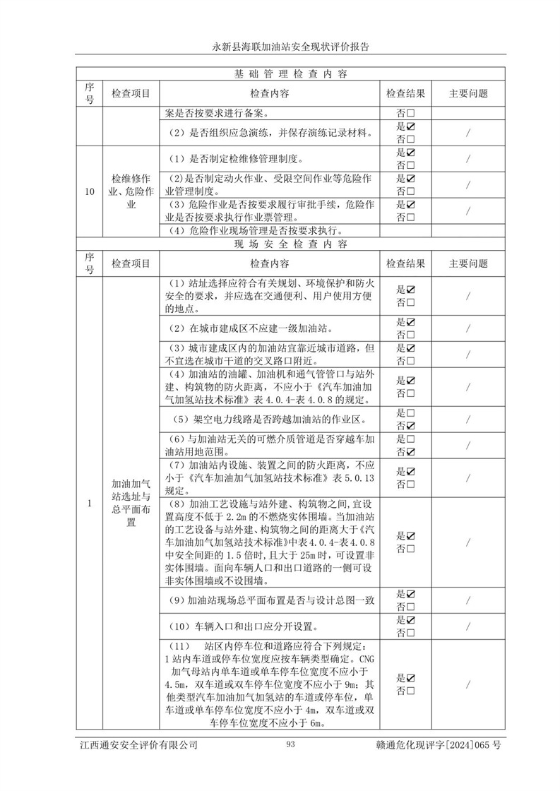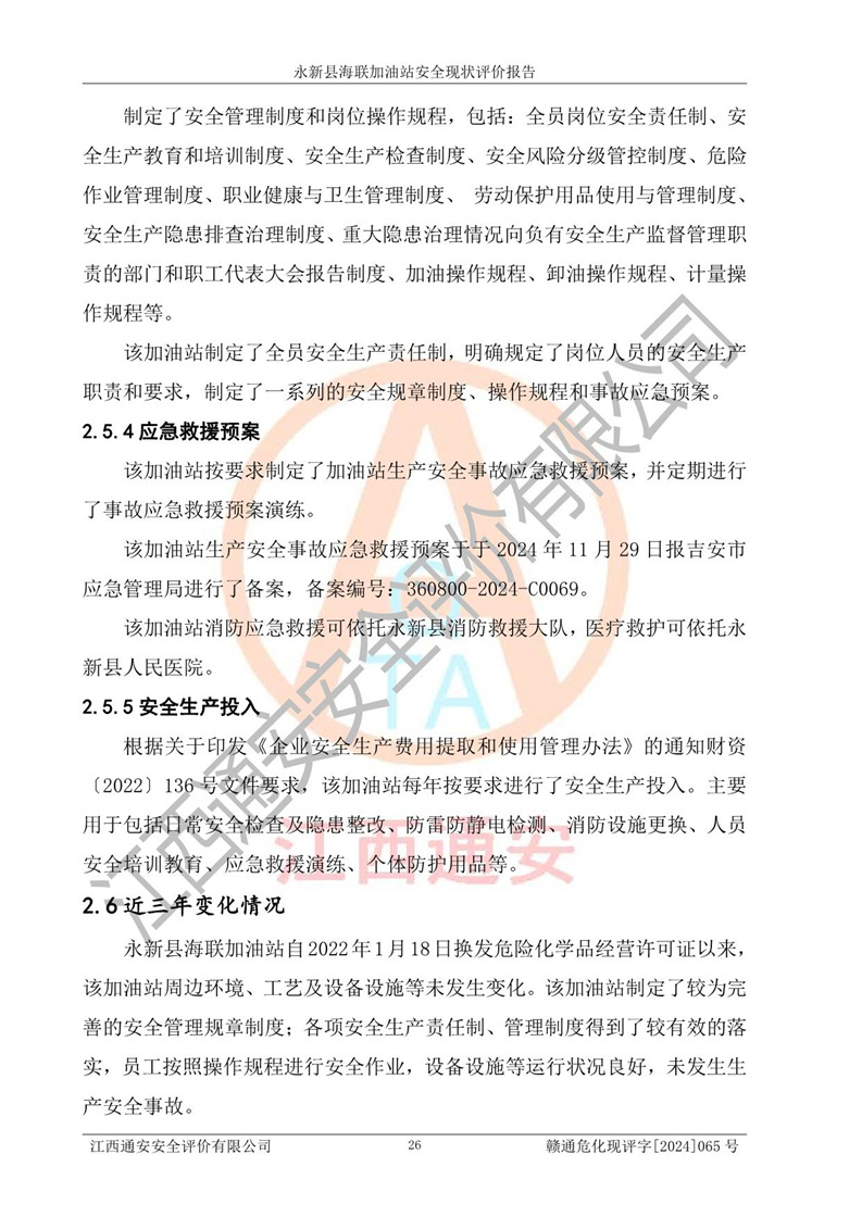 评价结论 | 永新县海联加油站站址合理,周边环境良好,与敏感防护目标间距符合规范要求,站区建构筑物之间的防火间距、耐火等级符合标准要求,与总平面布置图一致,加油卸油工艺及设备设施合理,工艺布置得当,防雷设施经检测合格,采取的工艺安全设施符合规范要求;该加油站制定了安全管理制度和操作规程,人员经培训合格后上岗,安全管理人员经考核合格并取得安全合格证,能按照法律法规要求开展安全生产管理工作。 综上:永新县海联加油站符合《汽车加油加气加氢站技术标准》GB50156-2021等标准规范的要求,安全风险可控,满足危险化学品经营的安全条件。 | |||