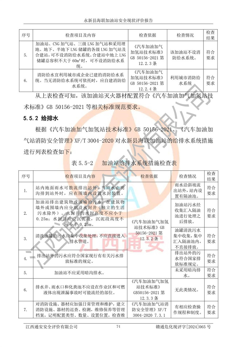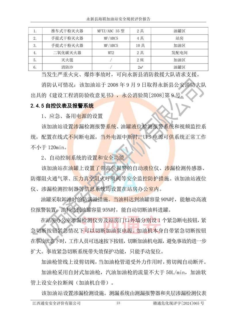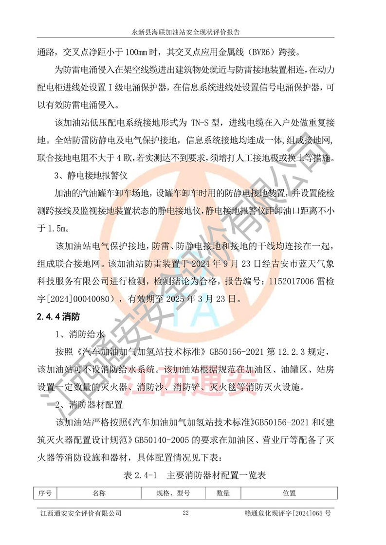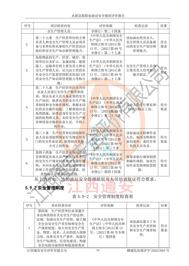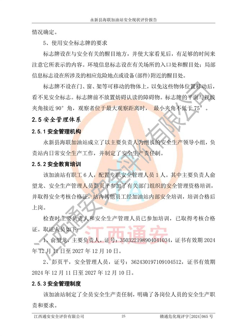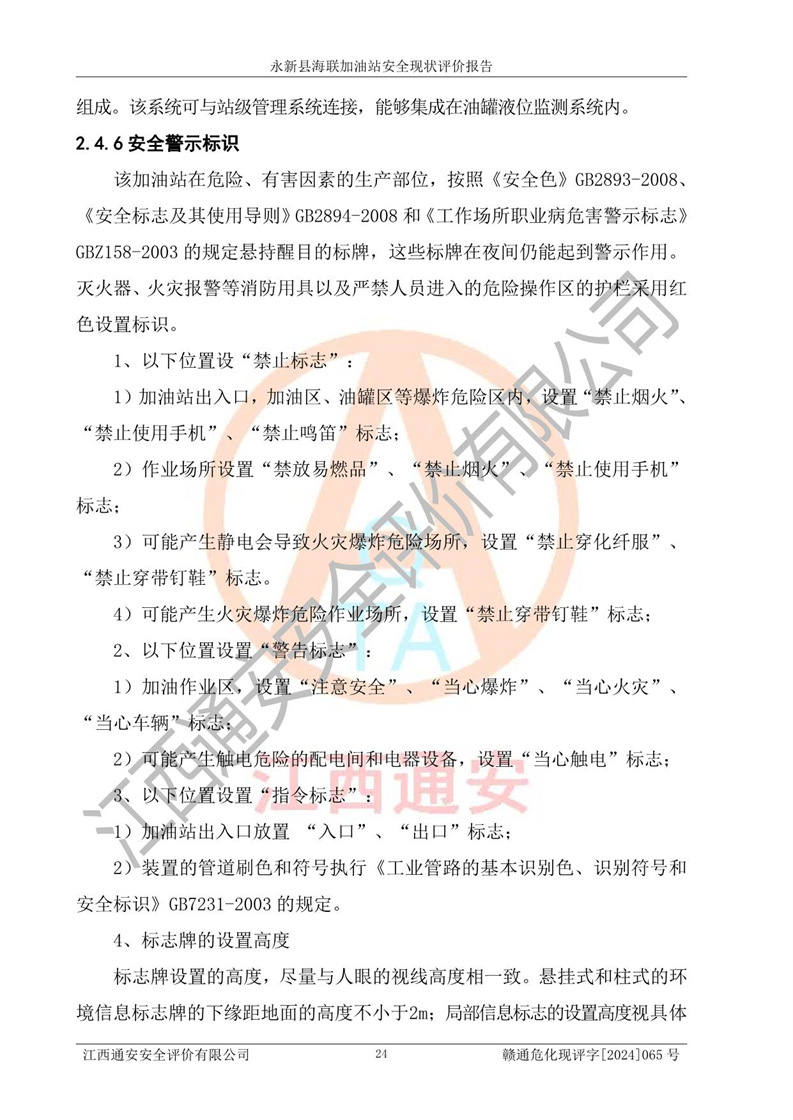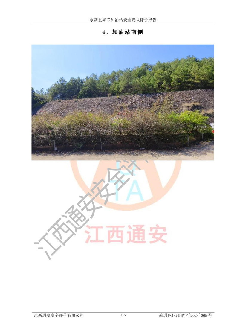 评价结论 | 永新县海联加油站站址合理,周边环境良好,与敏感防护目标间距符合规范要求,站区建构筑物之间的防火间距、耐火等级符合标准要求,与总平面布置图一致,加油卸油工艺及设备设施合理,工艺布置得当,防雷设施经检测合格,采取的工艺安全设施符合规范要求;该加油站制定了安全管理制度和操作规程,人员经培训合格后上岗,安全管理人员经考核合格并取得安全合格证,能按照法律法规要求开展安全生产管理工作。 综上:永新县海联加油站符合《汽车加油加气加氢站技术标准》GB50156-2021等标准规范的要求,安全风险可控,满足危险化学品经营的安全条件。 | |||