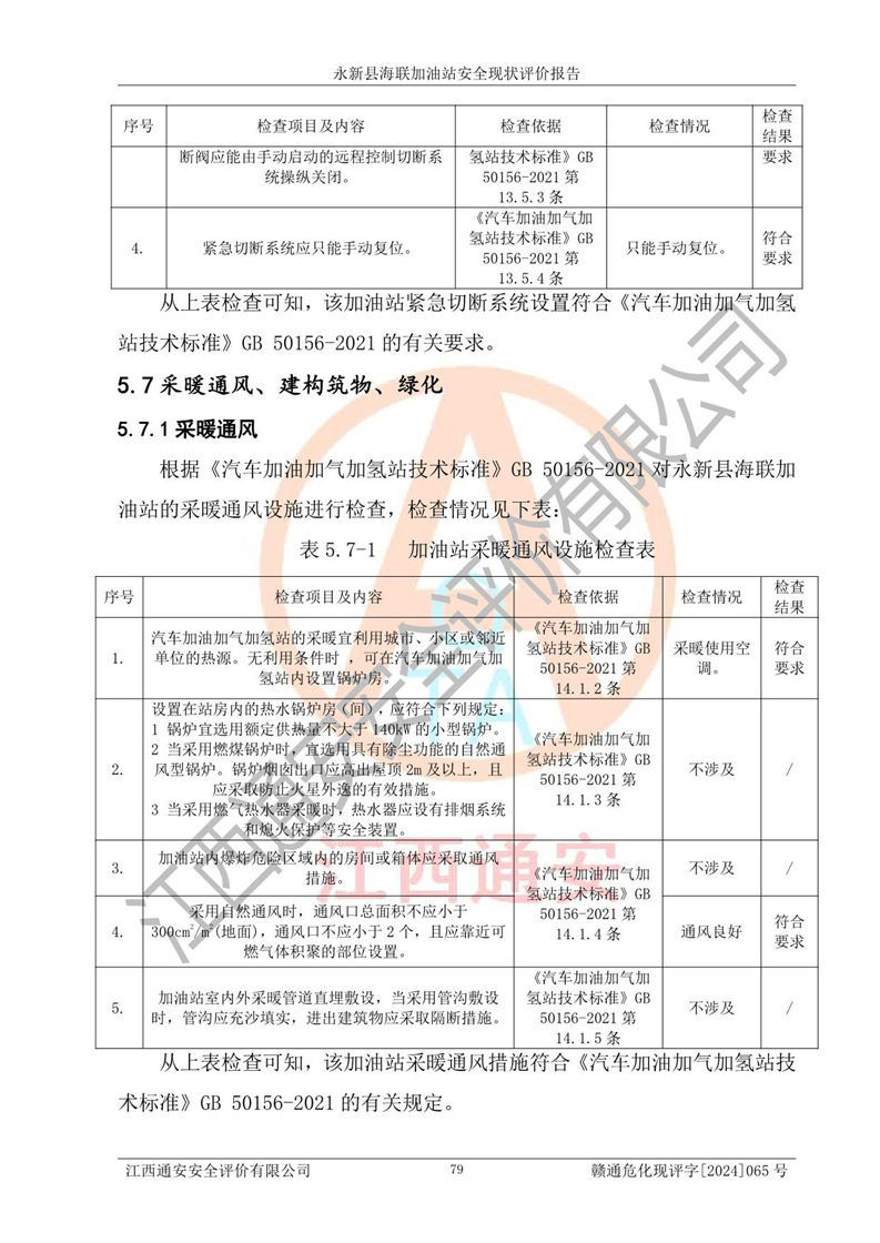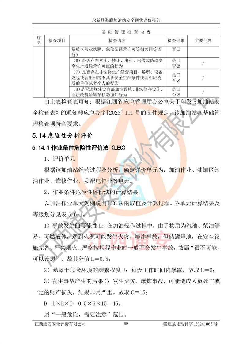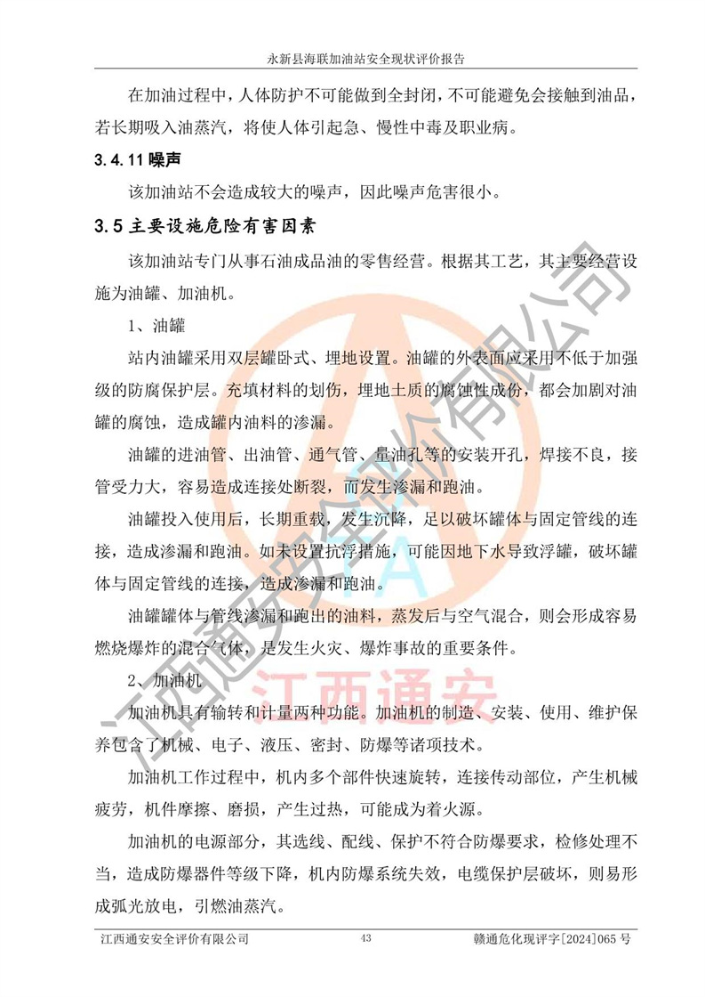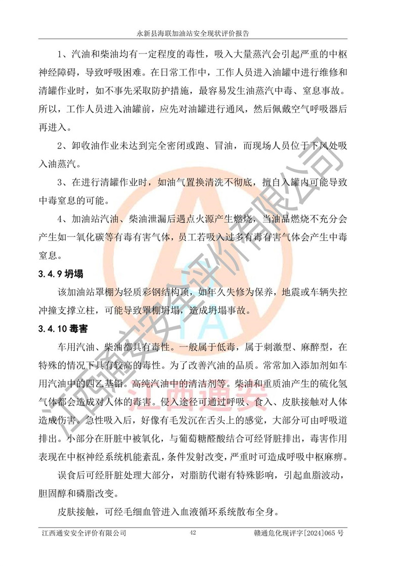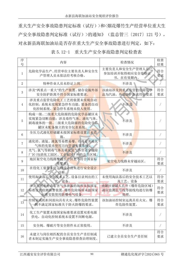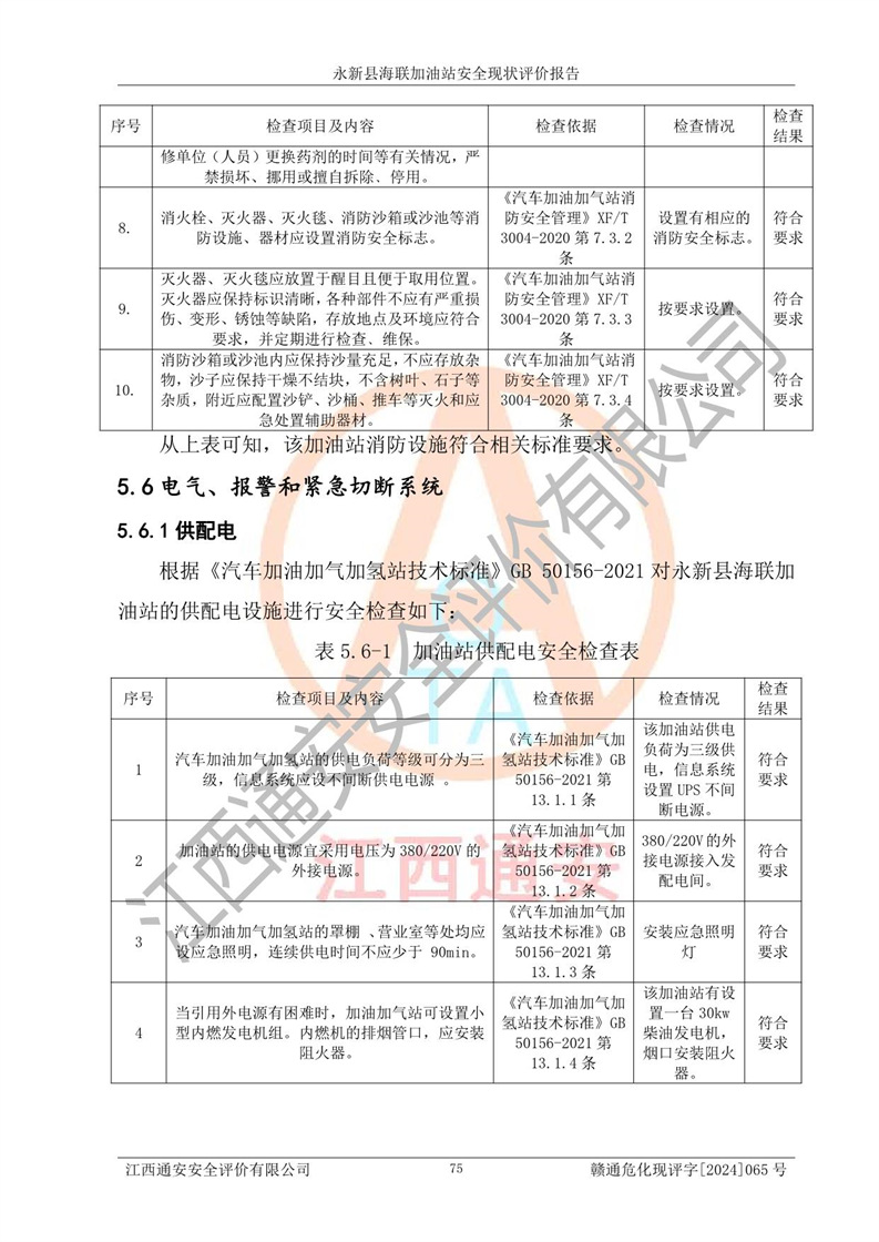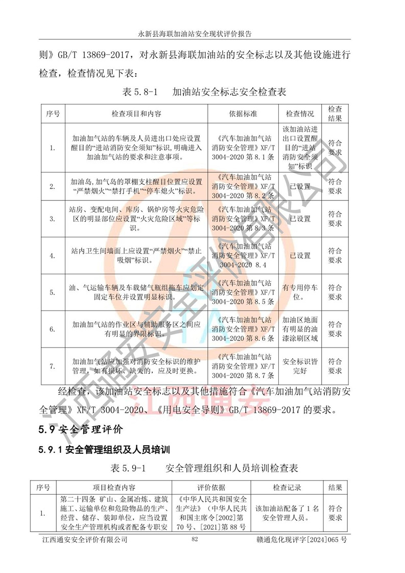 评价结论 | 永新县海联加油站站址合理,周边环境良好,与敏感防护目标间距符合规范要求,站区建构筑物之间的防火间距、耐火等级符合标准要求,与总平面布置图一致,加油卸油工艺及设备设施合理,工艺布置得当,防雷设施经检测合格,采取的工艺安全设施符合规范要求;该加油站制定了安全管理制度和操作规程,人员经培训合格后上岗,安全管理人员经考核合格并取得安全合格证,能按照法律法规要求开展安全生产管理工作。 综上:永新县海联加油站符合《汽车加油加气加氢站技术标准》GB50156-2021等标准规范的要求,安全风险可控,满足危险化学品经营的安全条件。 | |||