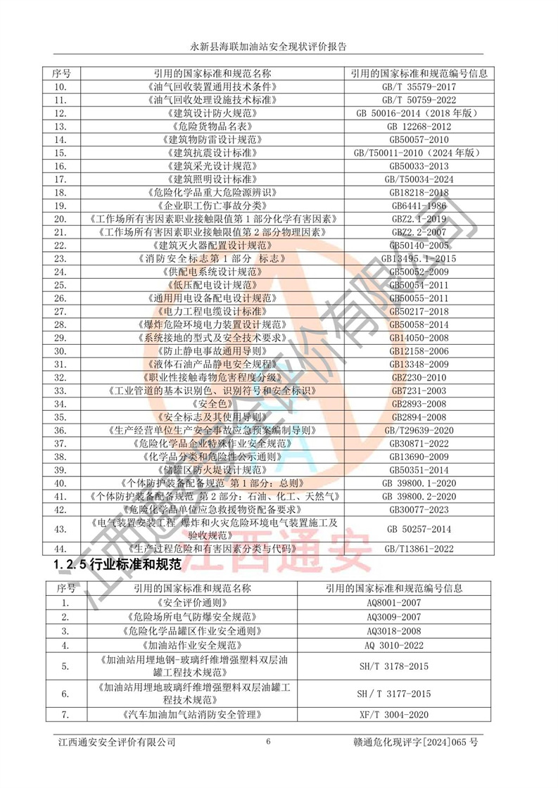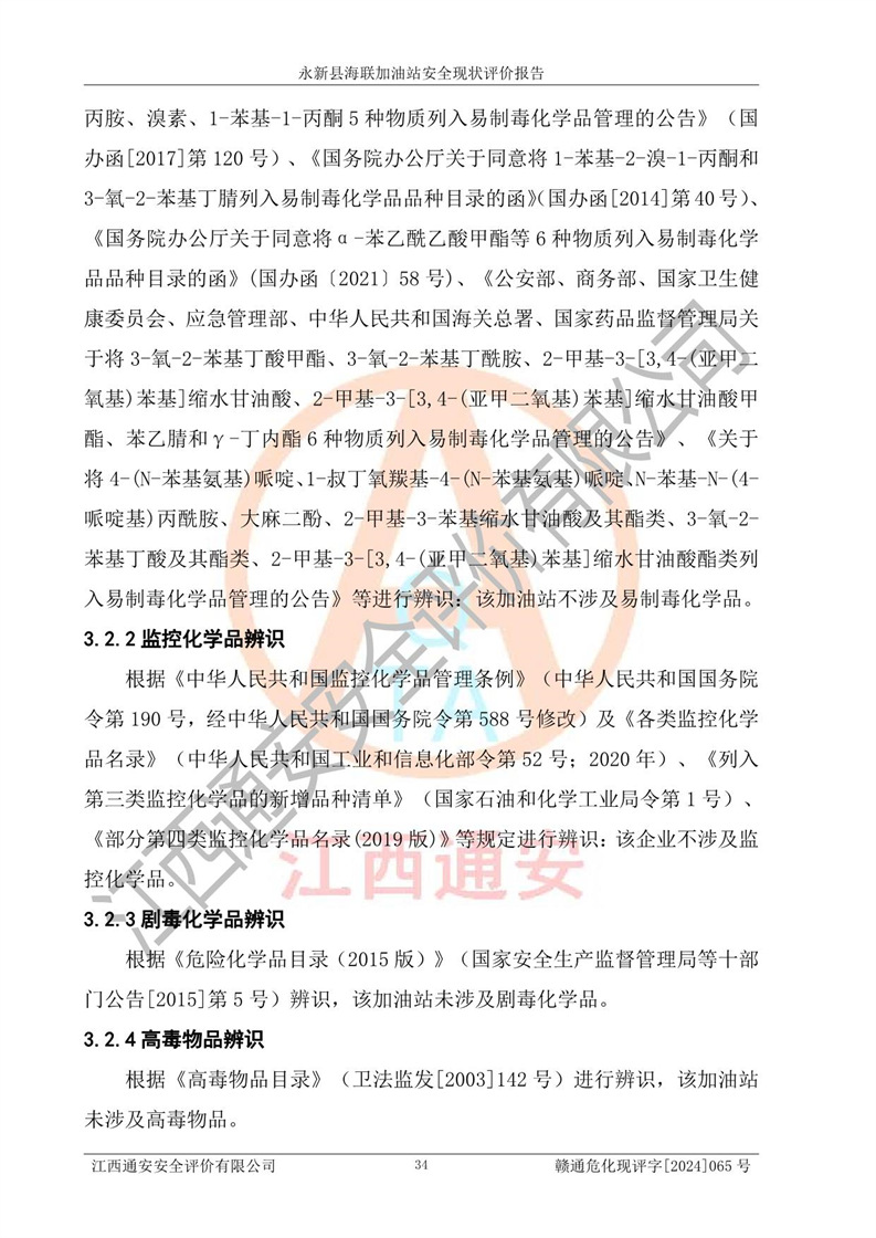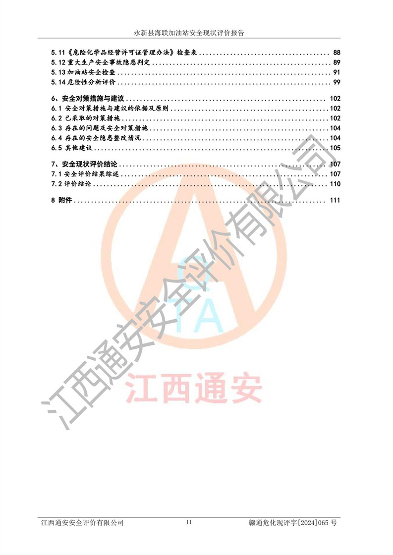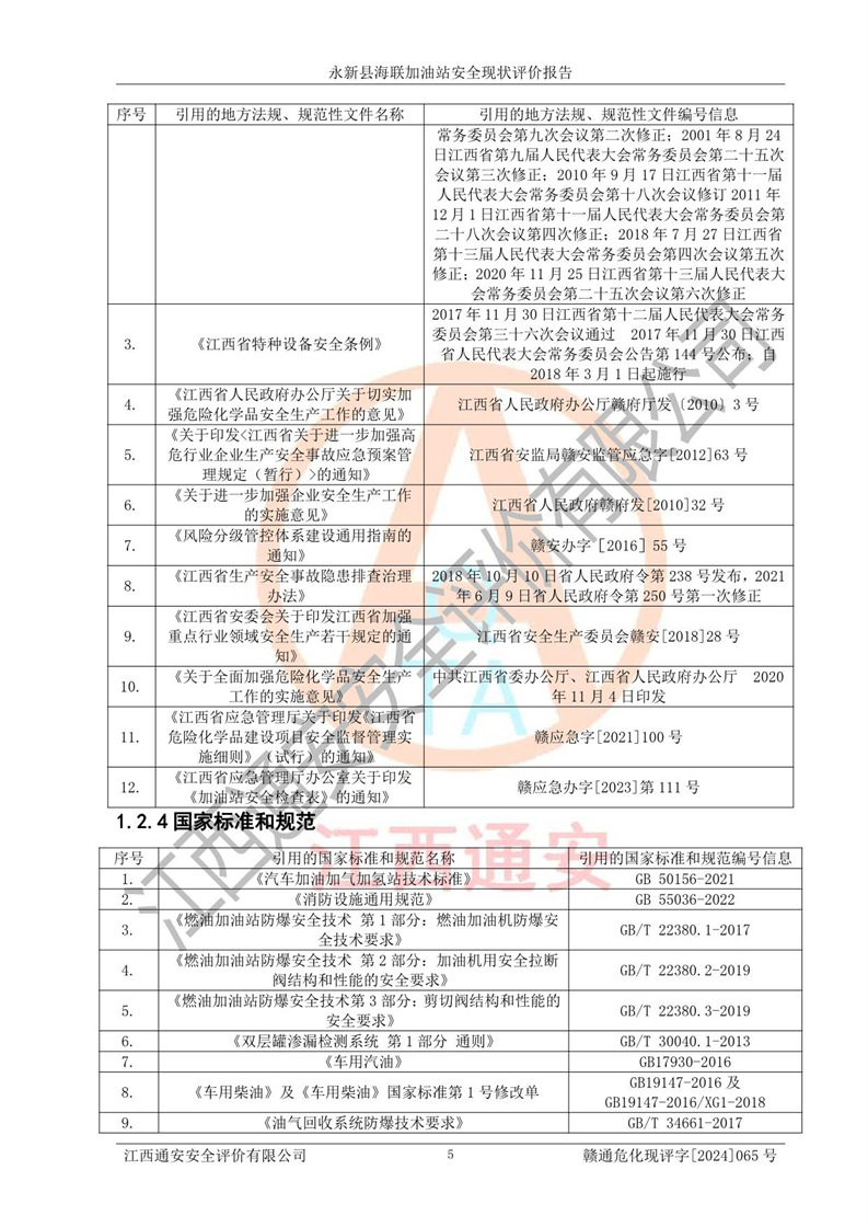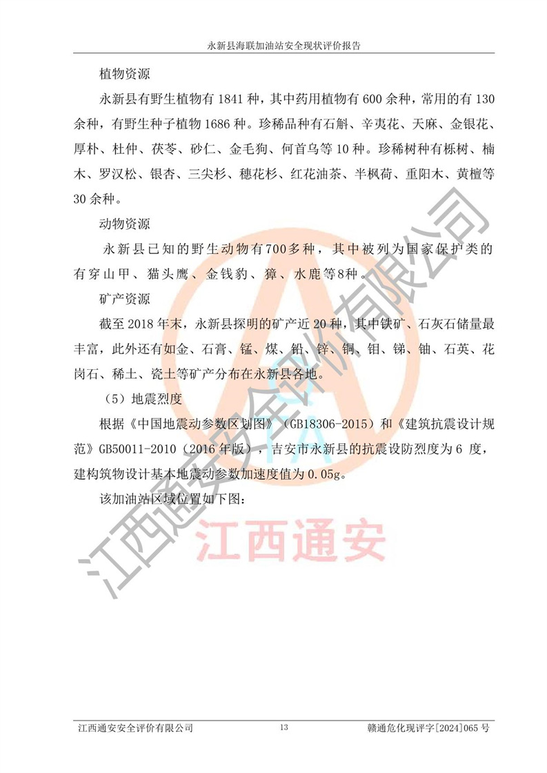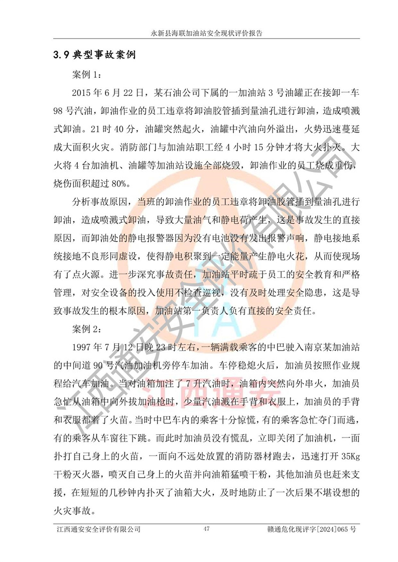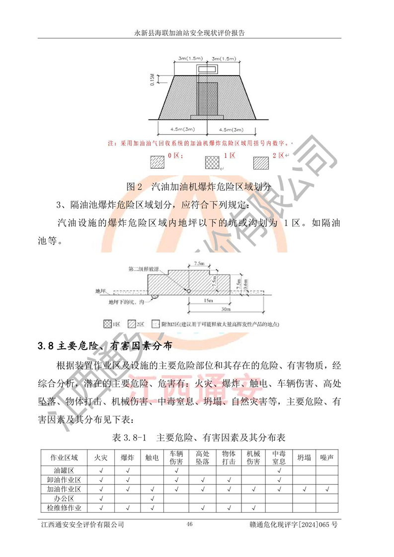 评价结论 | 永新县海联加油站站址合理,周边环境良好,与敏感防护目标间距符合规范要求,站区建构筑物之间的防火间距、耐火等级符合标准要求,与总平面布置图一致,加油卸油工艺及设备设施合理,工艺布置得当,防雷设施经检测合格,采取的工艺安全设施符合规范要求;该加油站制定了安全管理制度和操作规程,人员经培训合格后上岗,安全管理人员经考核合格并取得安全合格证,能按照法律法规要求开展安全生产管理工作。 综上:永新县海联加油站符合《汽车加油加气加氢站技术标准》GB50156-2021等标准规范的要求,安全风险可控,满足危险化学品经营的安全条件。 | |||