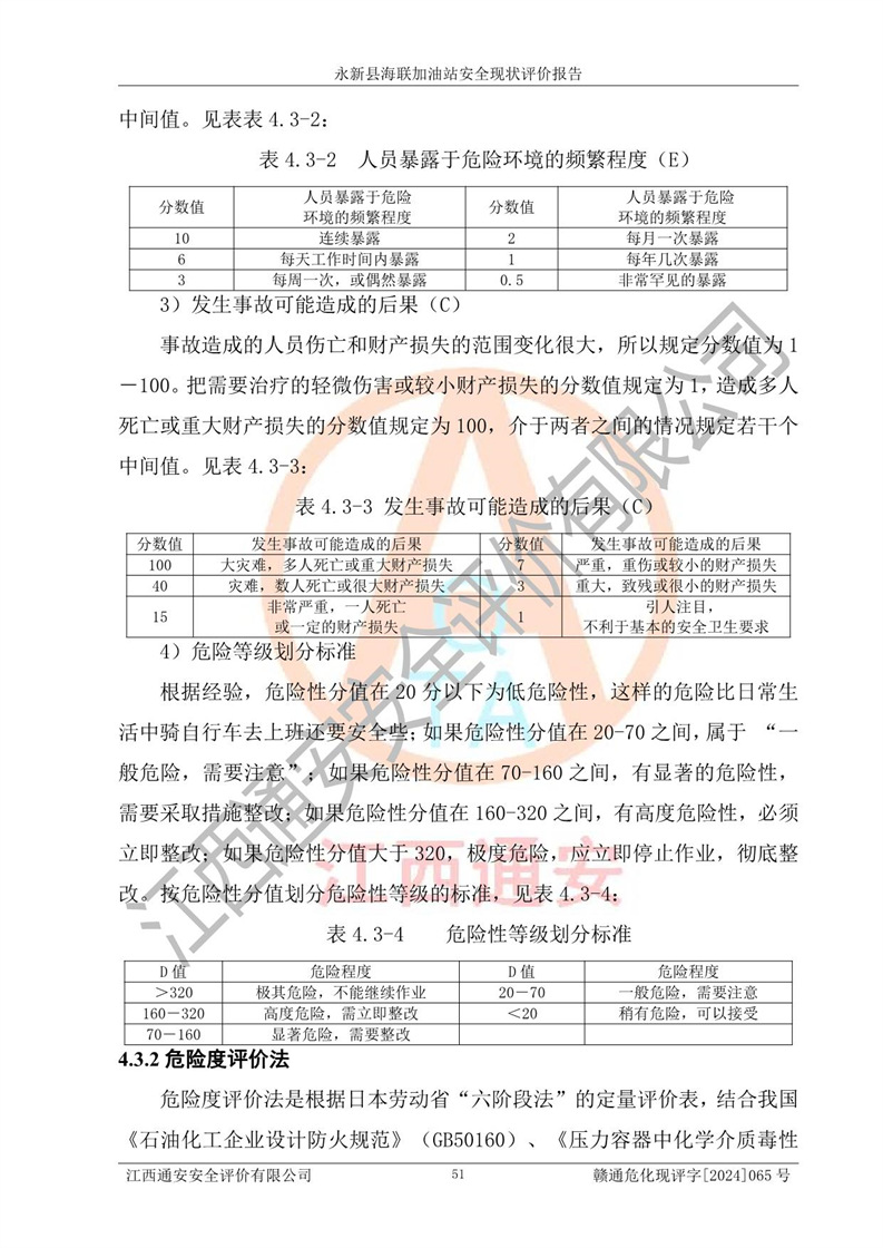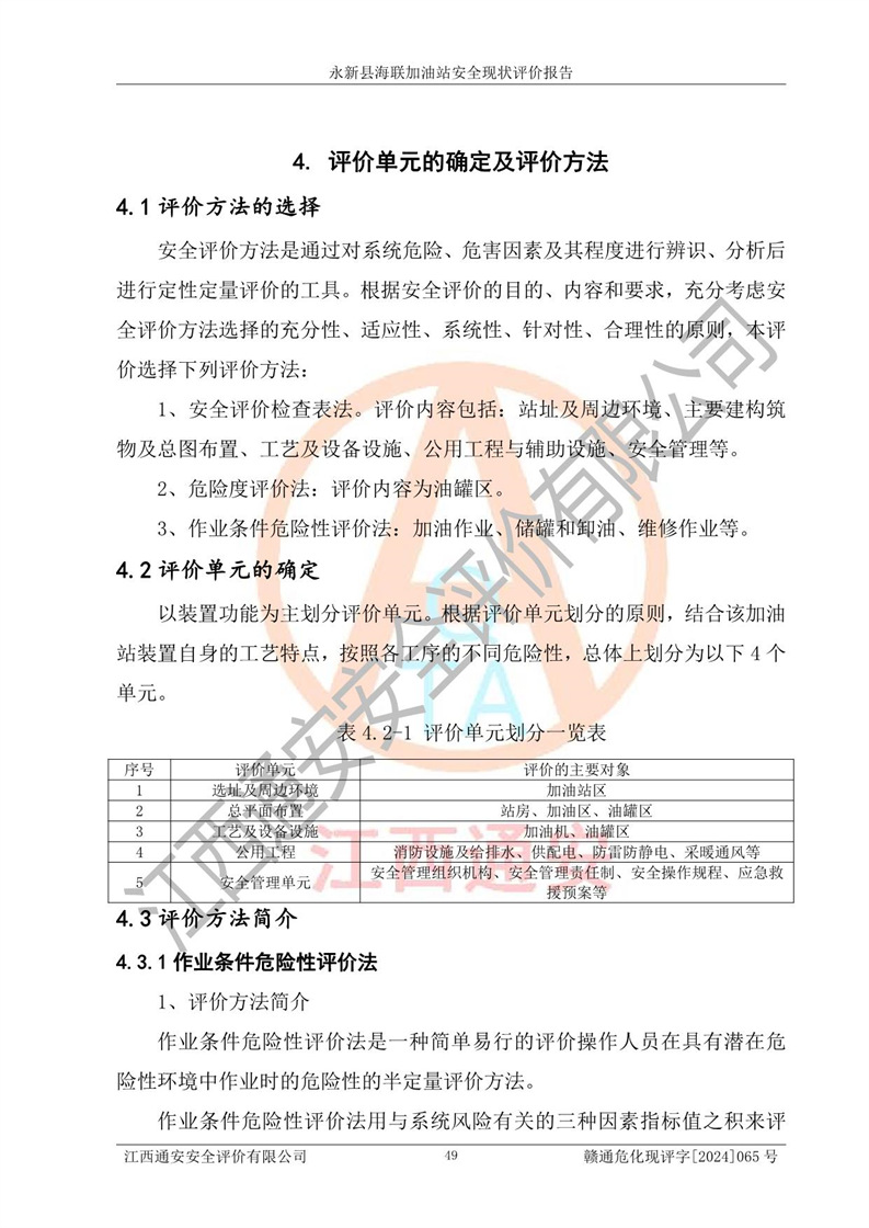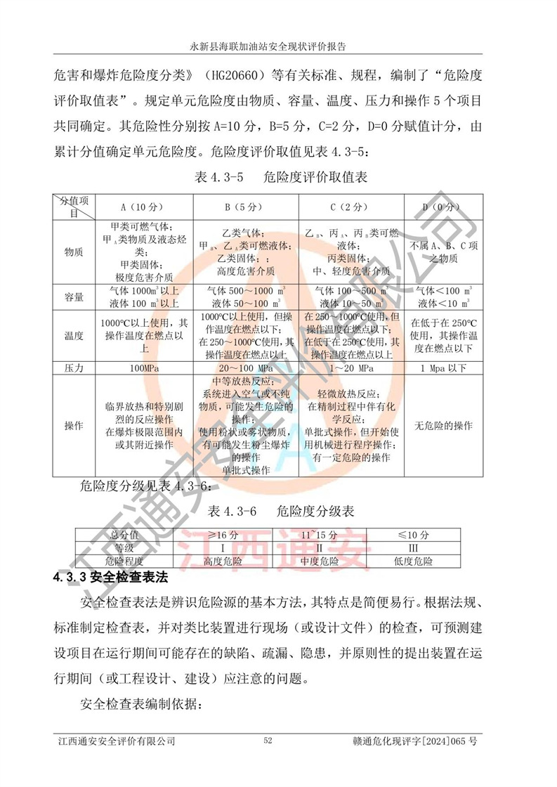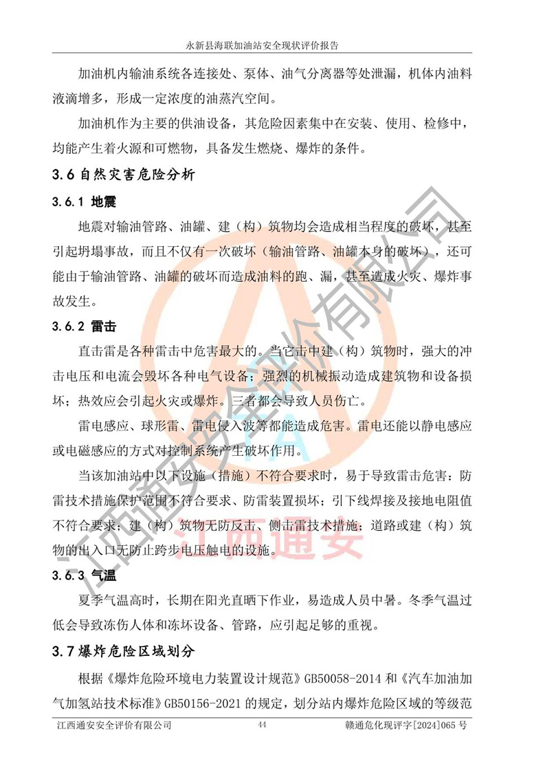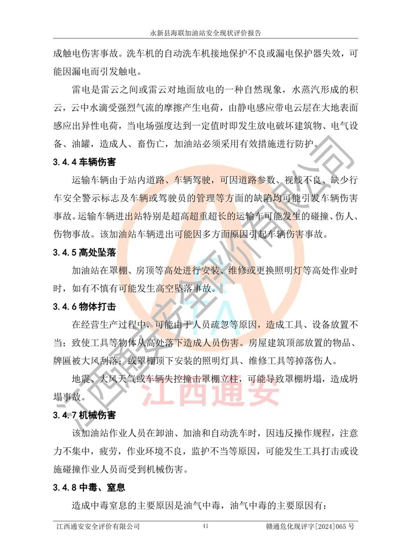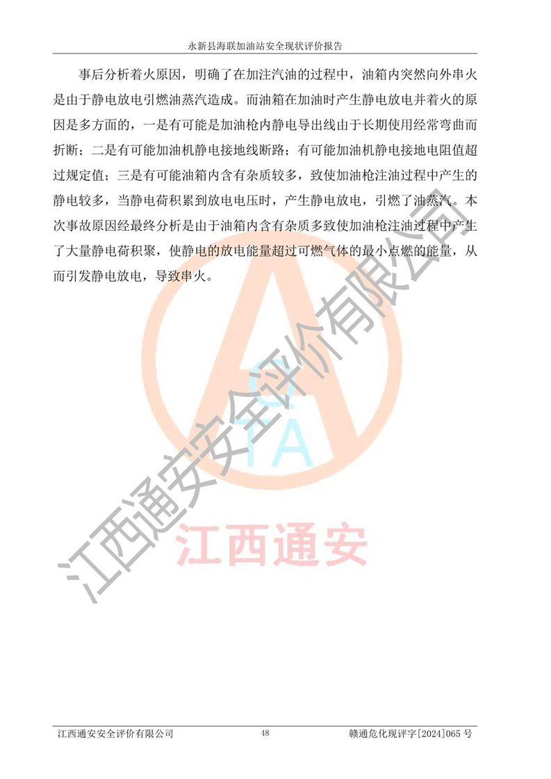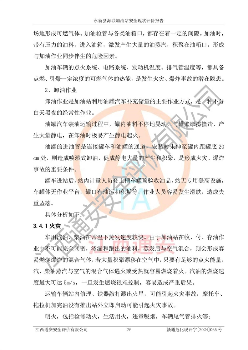 评价结论 | 永新县海联加油站站址合理,周边环境良好,与敏感防护目标间距符合规范要求,站区建构筑物之间的防火间距、耐火等级符合标准要求,与总平面布置图一致,加油卸油工艺及设备设施合理,工艺布置得当,防雷设施经检测合格,采取的工艺安全设施符合规范要求;该加油站制定了安全管理制度和操作规程,人员经培训合格后上岗,安全管理人员经考核合格并取得安全合格证,能按照法律法规要求开展安全生产管理工作。 综上:永新县海联加油站符合《汽车加油加气加氢站技术标准》GB50156-2021等标准规范的要求,安全风险可控,满足危险化学品经营的安全条件。 | |||