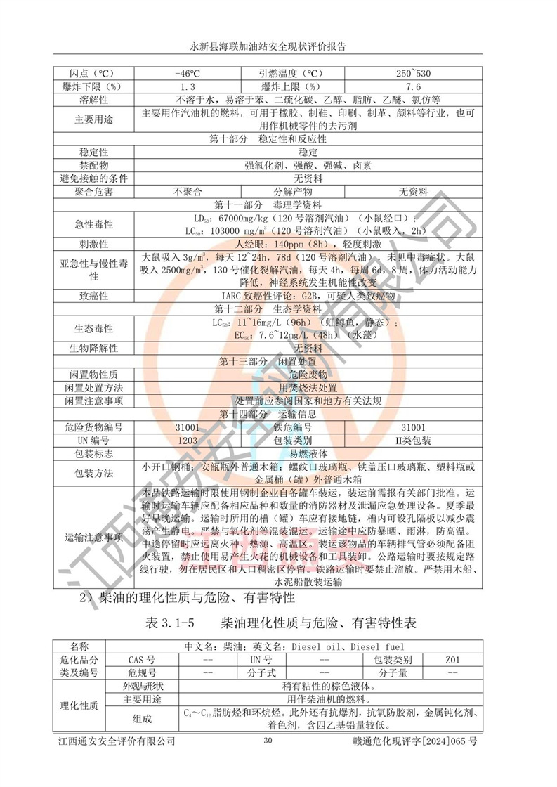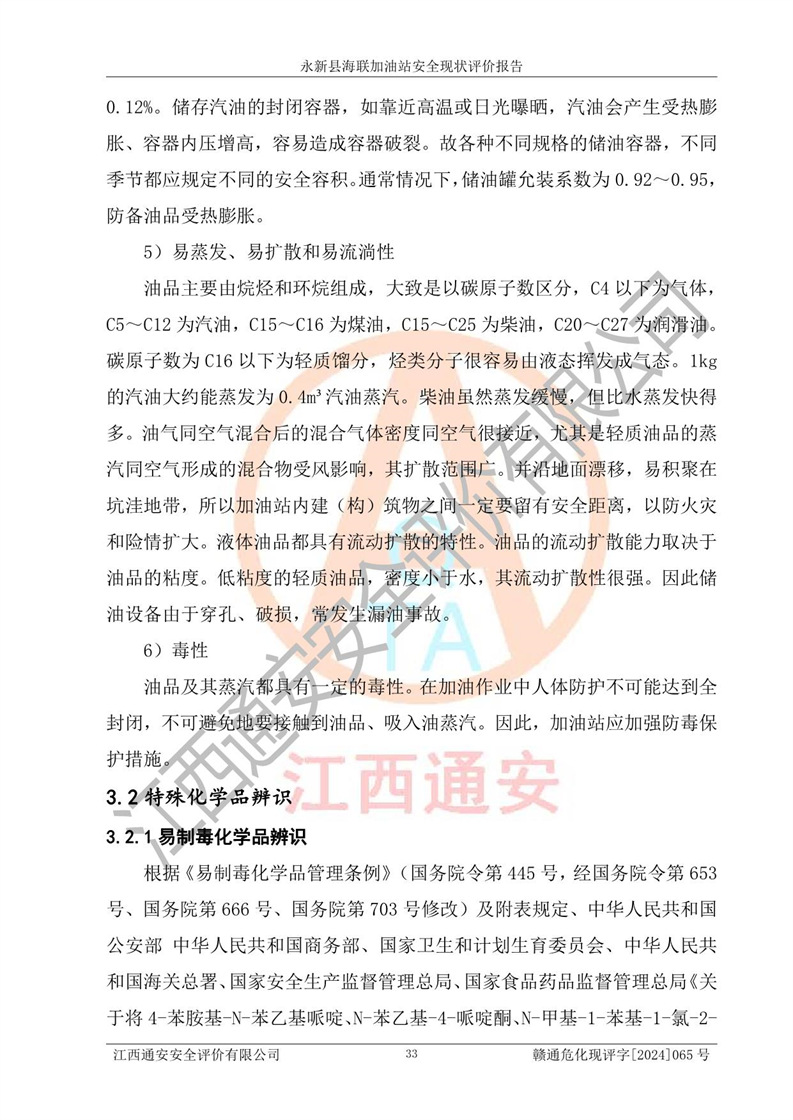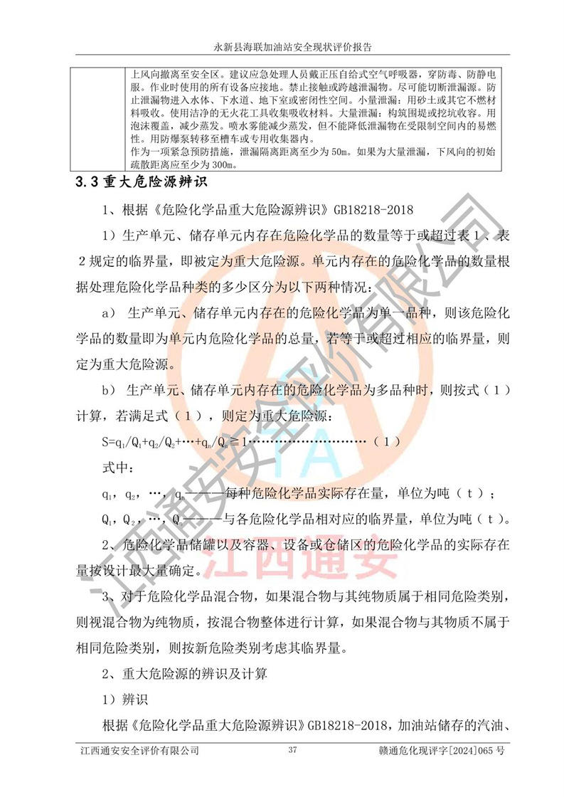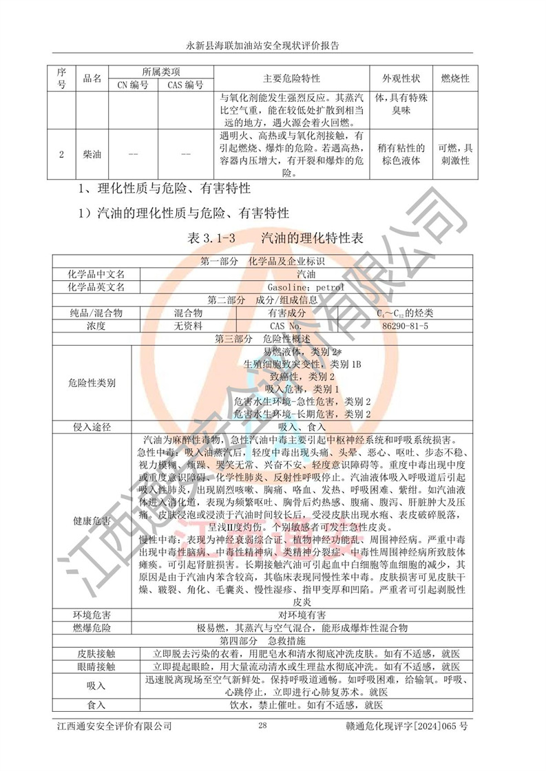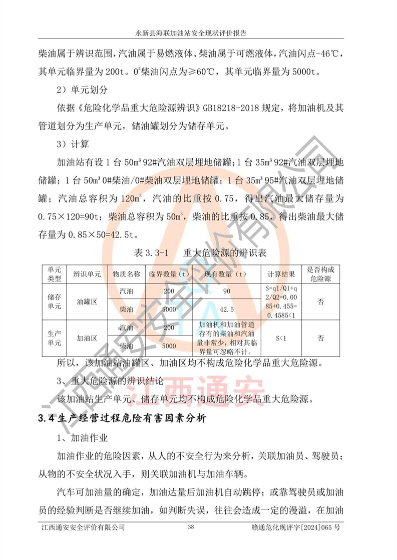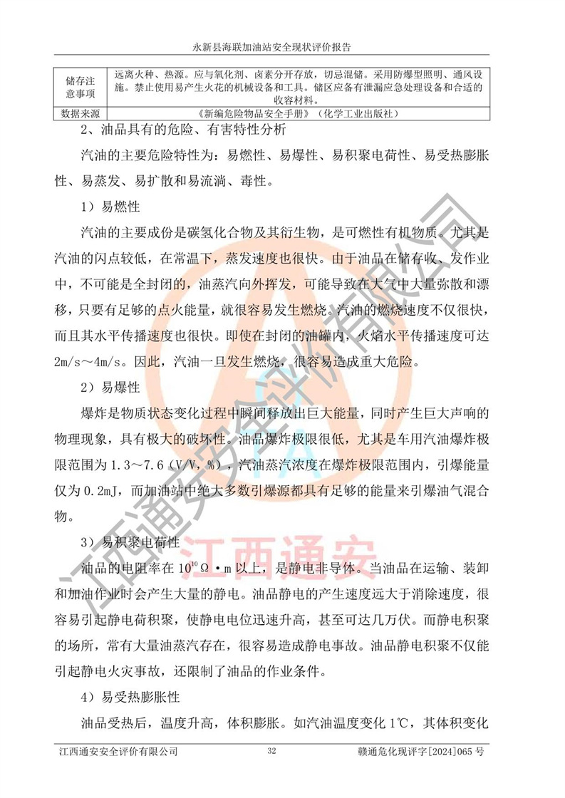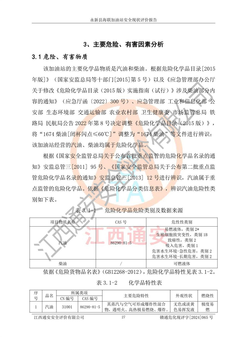 项目简介 | 永新县海联加油站成立于2009年9月8日,住所位于江西省吉安市永新县高市乡芦溪村319国道旁。该加油站经营许可范围:许可项目:成品油零售(依法须经批准的项目,经相关部门批准后方可开展经营活动,具体经营项目以相关部门批准文件或许可证件为准)。 永新县海联加油站设2台0#柴油/0#柴油双枪加油机,2台92#汽油/95#汽油双枪加油机,1台92#汽油/92#汽油双枪加油机;设置4台SF双层埋地储罐,其中包括:1台50m³92#汽油双层埋地储罐;1台35m³92#汽油双层埋地储罐;1台50m³0#柴油双层埋地储罐;1台35m³95#汽油双层埋地储罐;总储量为170m³,柴油折半后总容积为145m³,加油站等级为二级,汽油卸油、加油设置了油气回收系统。 该加油站的主要化学品物质是汽油和柴油。根据危险化学品目录[2015年版]》(**安监总局等十部门[2015]第5号)以及《应急管理部办公厅关于修改《危险化学品目录(2015版)实施指南(试行)》涉及柴油部分内容的通知》(应急厅函〔2022〕300号)、应急管理部 工业和信息化部 公安部 生态环境部 交通运输部 农业农村部 卫生健康委 市场监管总局 铁路局 民航局公告2022年第8号决定调整《危险化学品目录(2015版)》,将“1674柴油[闭杯闪点≤60℃]”调整为“1674柴油”等文件进行辨识:该加油站经营的汽油、柴油均属于危险化学品。 | |||