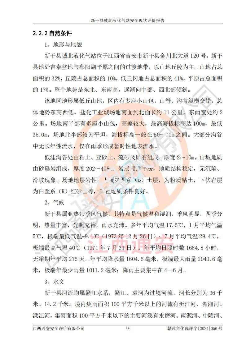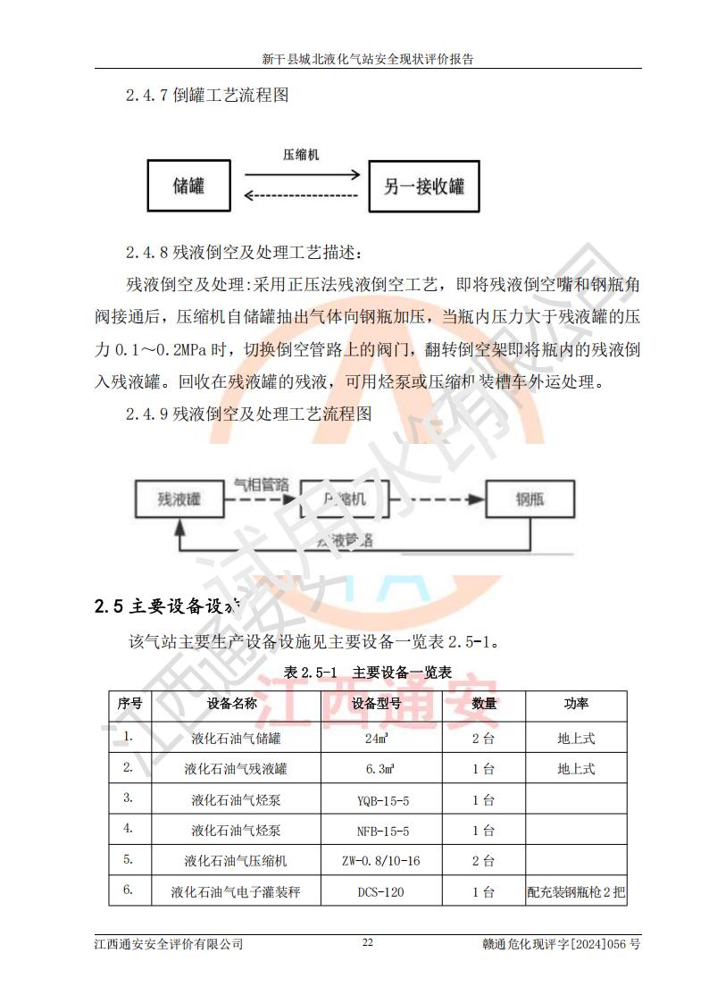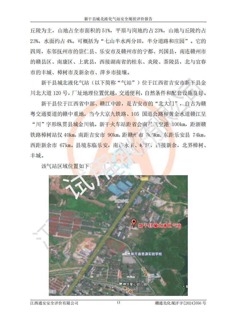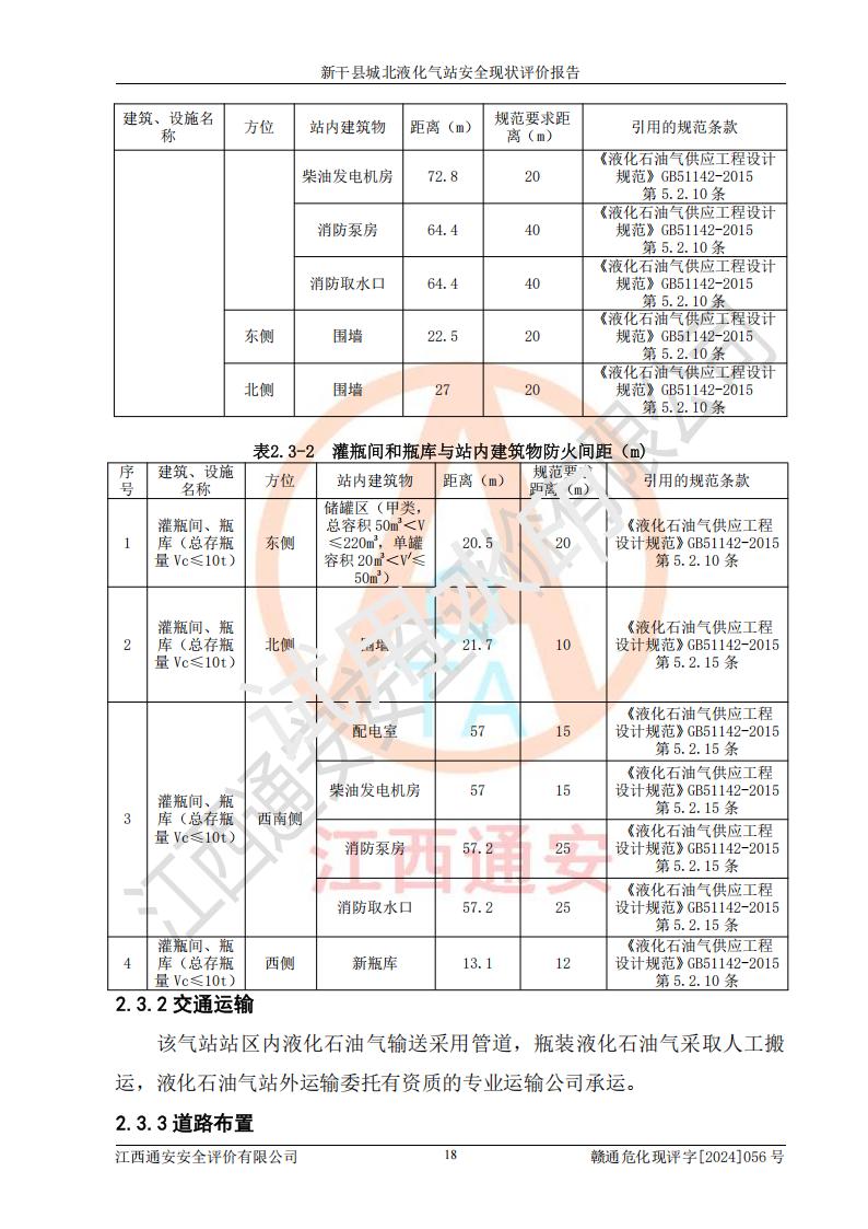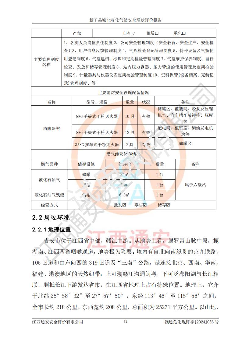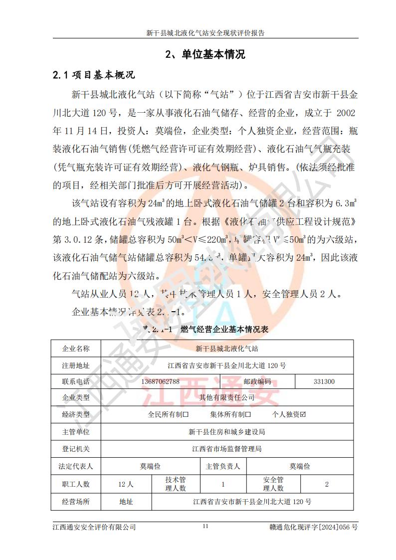 项目简介 | 新干县城北液化气站(以下简称“气站”)位于江西省吉安市新干县金川北大道120号,是一家从事液化石油气储存、经营的企业,成立于 2002年11月14日,投资人:莫端俭,企业类型:个人独资企业,经营范围:瓶装液化石油气销售(凭燃气经营许可证**期经营)、液化石油气气瓶充装(凭气瓶充装许可证**期经营)、液化气钢瓶、炉具销售。(依法须经批准的项目,经相关部门批准后方可开展经营活动)。 该气站于2021年10月26日换得新干县住房和城乡建设局颁发的燃气经营许可证,许可证编号:赣201307050005P,**期至2024年10月25日,经营类别:瓶装液化石油气,主要储存、充装、经营液化石油气。2024年8月23日经新干县住房和城乡建设局同意,该站完成场站整改后,申请续证。 该气站于2023年6月27日换得江西省市场监督管理局颁发的气瓶充装许可证,编号:TS4236060-2027,获准从事液化石油气气瓶充装,**期至2027年8月25日。 该气站设有容积为24m3的地上卧式液化石油气储罐2台和容积为6.3m3的地上卧式液化石油气残液罐1台。根据《液化石油气供应工程设计规范》GB51142-2015对液化石油气供应站等级划分,该站属于六级液化石油气供应站。 | ||||