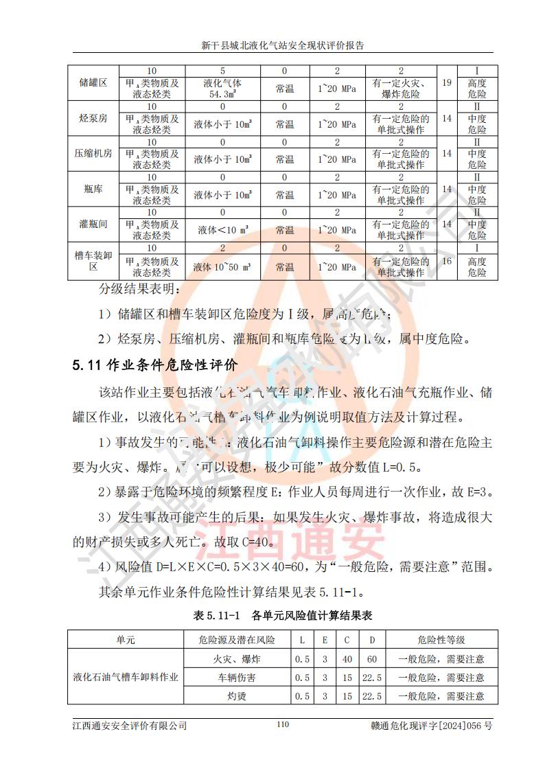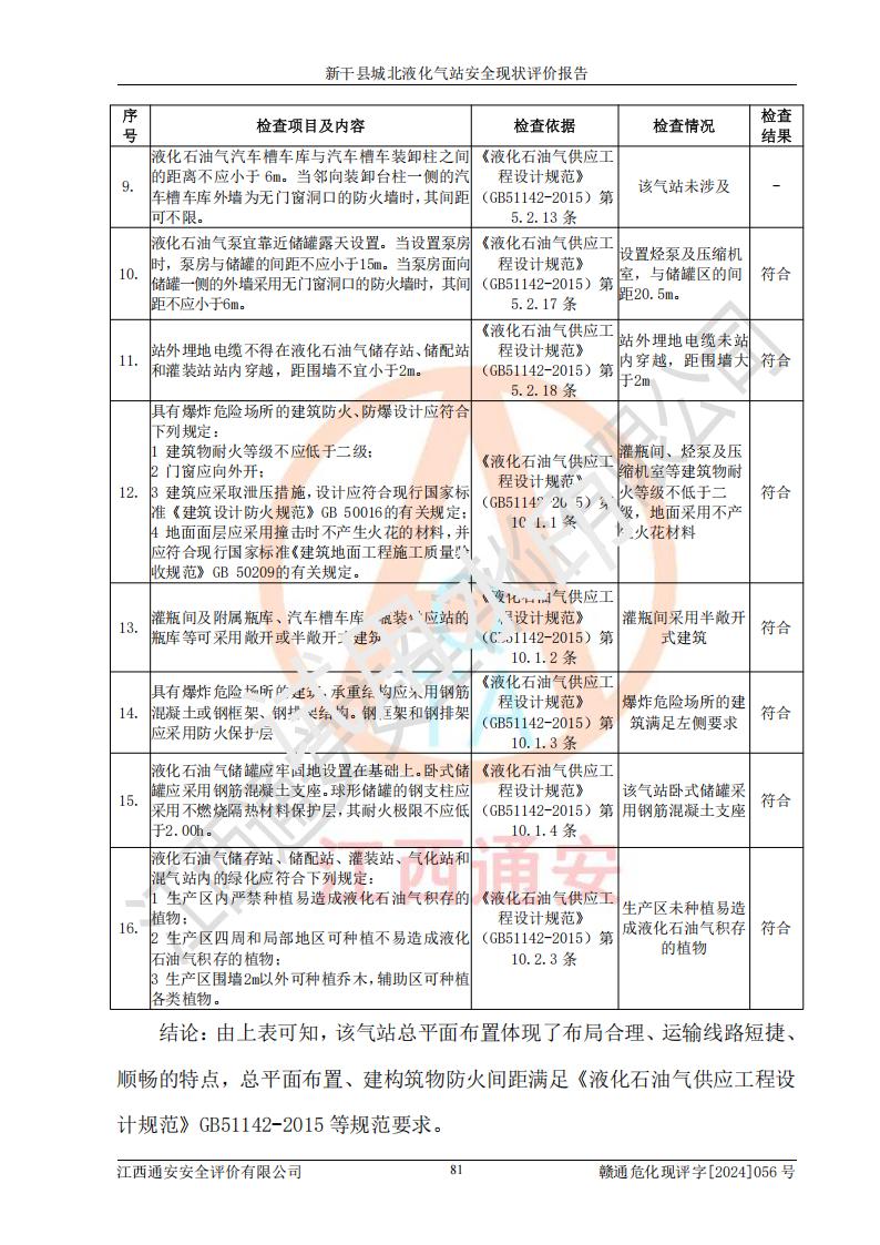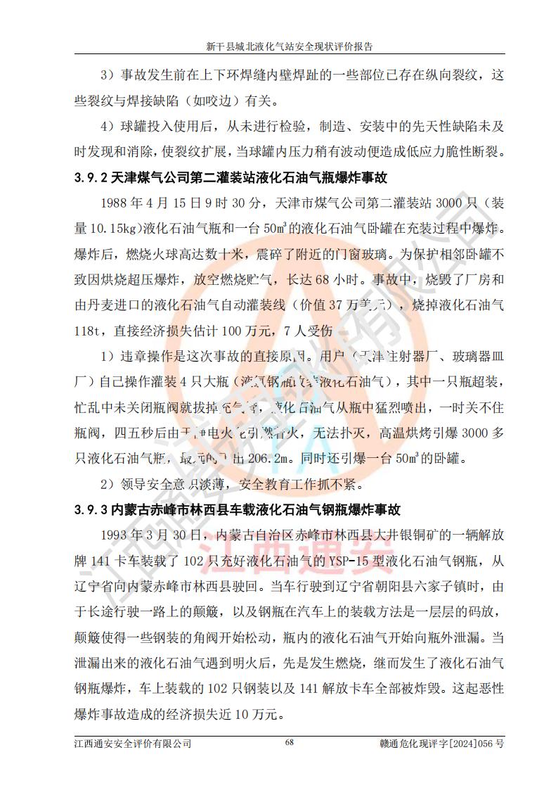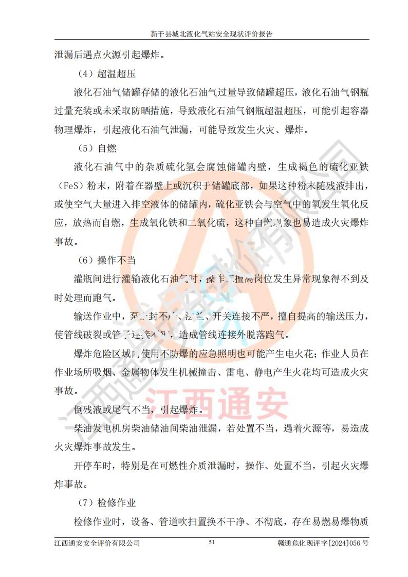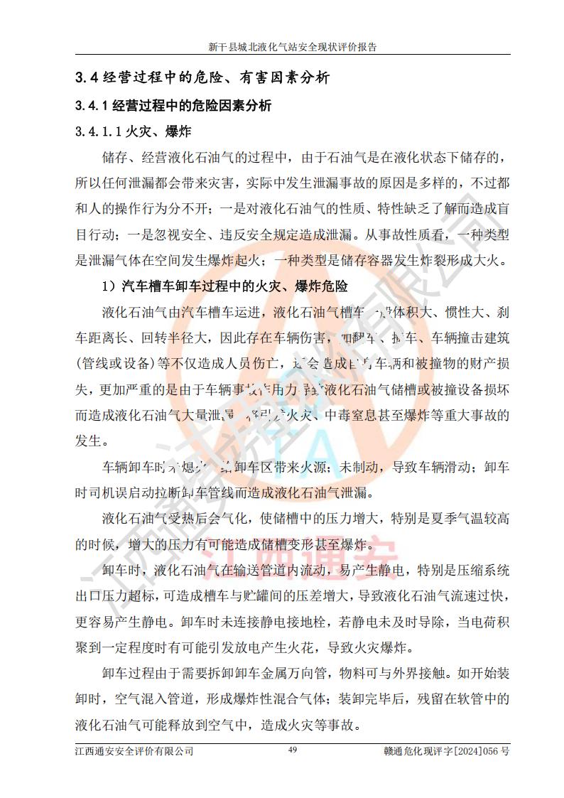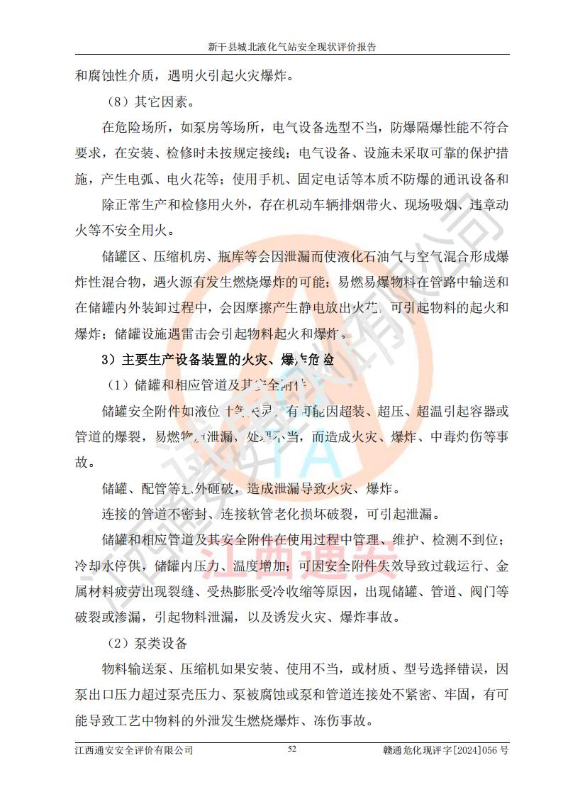 其它 | 在对该项目危险、有害因素辨识分析的基础上,运用安全检查表、预作业条件危险性分析法、危险度评价、重大事故后果分析结果等评价方法对该项目进行了分析评价,评价结果如下: 1、该项目位于江西省吉安市新干县金川北大道120号,符合当地规划,与周边环境的距离符合有关标准、规范的要求。 2、总图布置分区明确,布局合理,各建构筑物的防火间距满足规范要求。 3、该项目无**明令淘汰的工艺,设备、设施与工艺条件、内部介质相适应,特种设备及设施较齐全,按规定设置防雷、防静电接地,爆炸危险环境加油机按要求采用防爆型,符合相关标准规范要求。 5、企业设置了安全生产管理机构,配备了专职安全生产管理人员,建立了安全生产责任制和安全生产管理制度,编制了岗位操作规程,编制了生产安全事故应急预案,人员经过相应的培训,企业的安全生产管理正常。 6、作业条件危险性评价结果:在选定的评价单元中,作业危险程度均为“一般危险,需要注意”,作业条件相对安全。 7、危险度评价结果:储罐区和槽车装卸区危险度为Ⅰ级,属**危险;烃泵房、压缩机房、灌瓶间和瓶库危险度为Ⅱ级,属中度危险。 评价结论: 新干县城北液化气站的安全设施、公用工程、辅助设施以及安全管理等符合**及有关部门关于安全生产法律、法规、标准的要求,安全风险是受控制的,其风险程度是可以接受的,符合安全生产条件,能够满足安全生产的要求。 | ||||