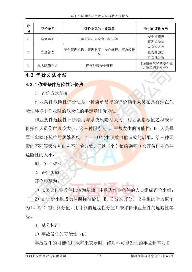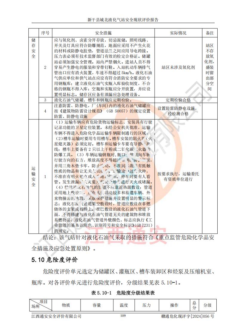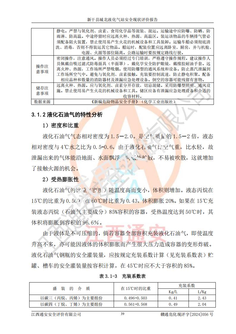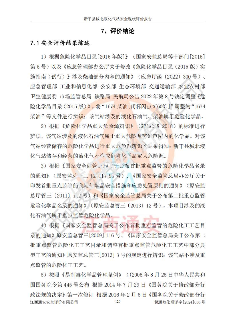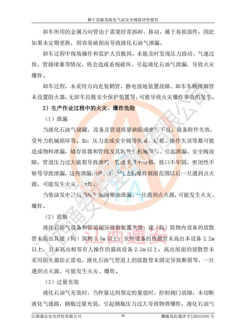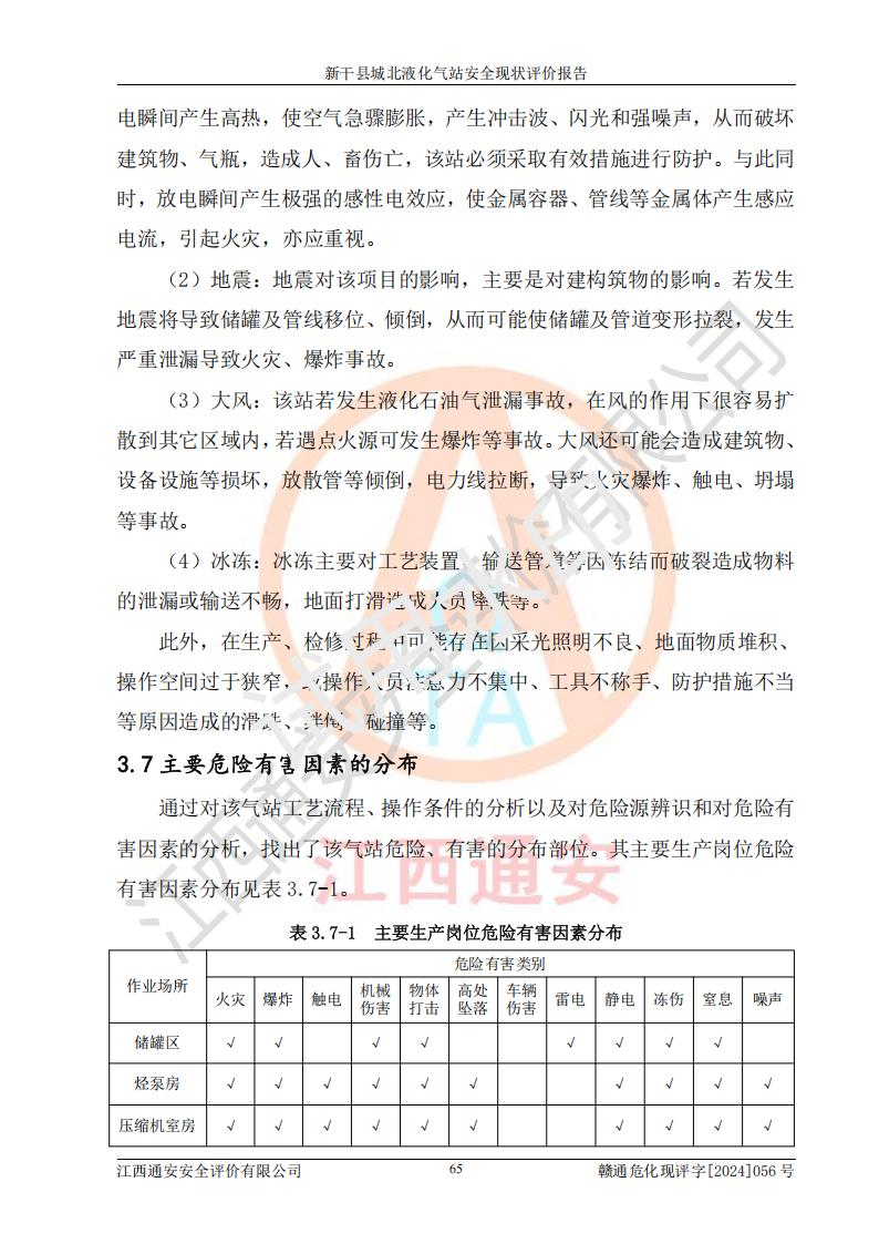 其它 | 在对该项目危险、有害因素辨识分析的基础上,运用安全检查表、预作业条件危险性分析法、危险度评价、重大事故后果分析结果等评价方法对该项目进行了分析评价,评价结果如下: 1、该项目位于江西省吉安市新干县金川北大道120号,符合当地规划,与周边环境的距离符合有关标准、规范的要求。 2、总图布置分区明确,布局合理,各建构筑物的防火间距满足规范要求。 3、该项目无**明令淘汰的工艺,设备、设施与工艺条件、内部介质相适应,特种设备及设施较齐全,按规定设置防雷、防静电接地,爆炸危险环境加油机按要求采用防爆型,符合相关标准规范要求。 5、企业设置了安全生产管理机构,配备了专职安全生产管理人员,建立了安全生产责任制和安全生产管理制度,编制了岗位操作规程,编制了生产安全事故应急预案,人员经过相应的培训,企业的安全生产管理正常。 6、作业条件危险性评价结果:在选定的评价单元中,作业危险程度均为“一般危险,需要注意”,作业条件相对安全。 7、危险度评价结果:储罐区和槽车装卸区危险度为Ⅰ级,属**危险;烃泵房、压缩机房、灌瓶间和瓶库危险度为Ⅱ级,属中度危险。 评价结论: 新干县城北液化气站的安全设施、公用工程、辅助设施以及安全管理等符合**及有关部门关于安全生产法律、法规、标准的要求,安全风险是受控制的,其风险程度是可以接受的,符合安全生产条件,能够满足安全生产的要求。 | ||||