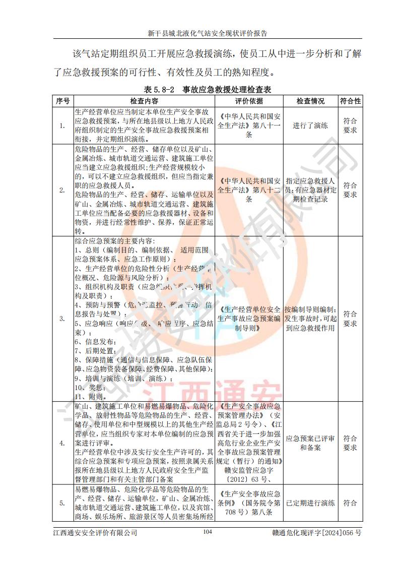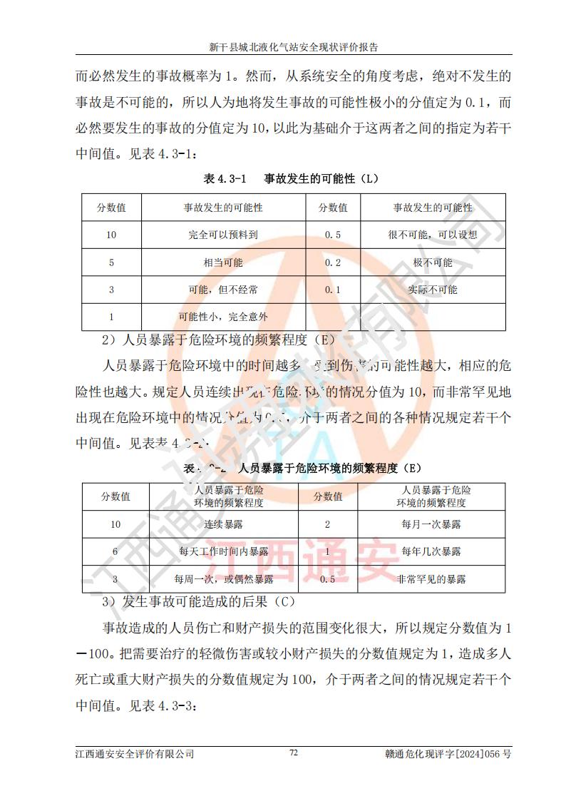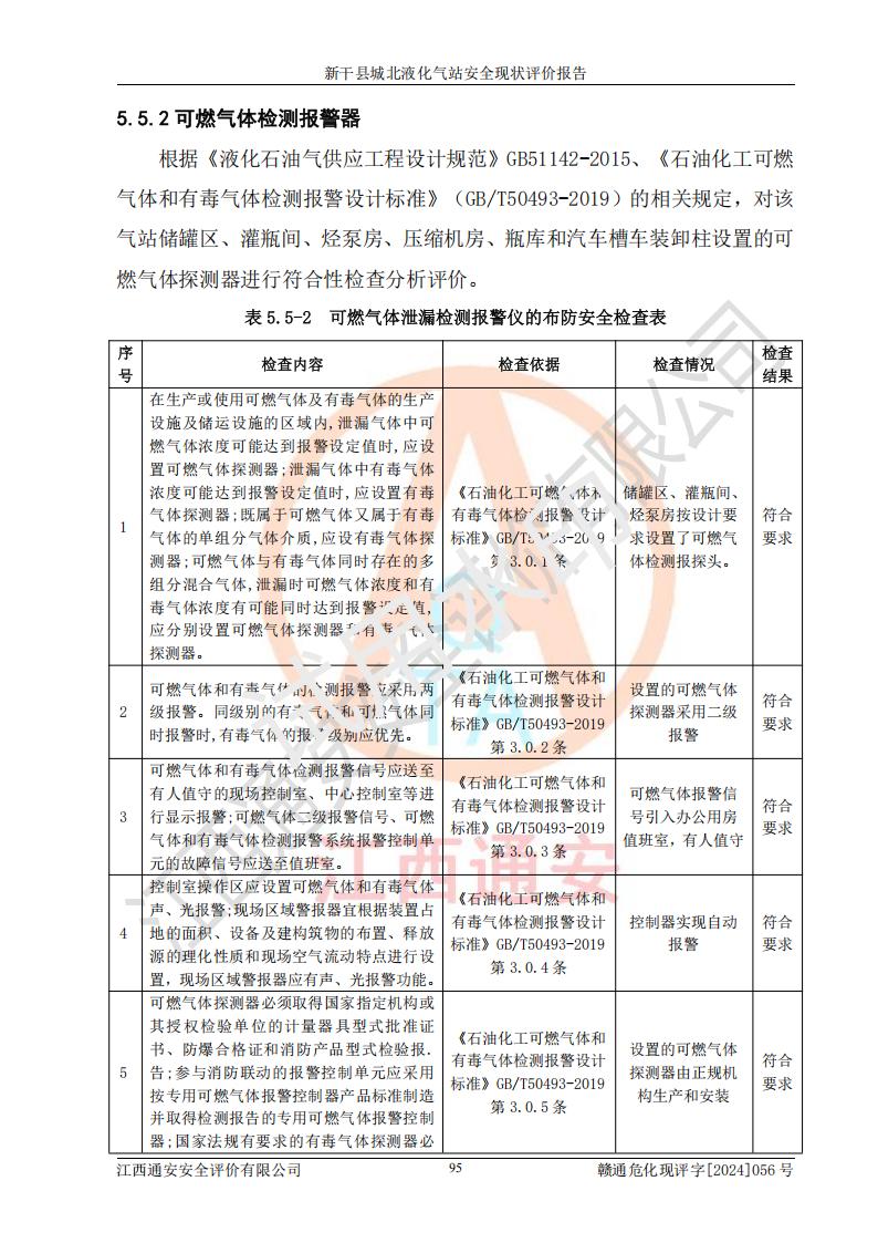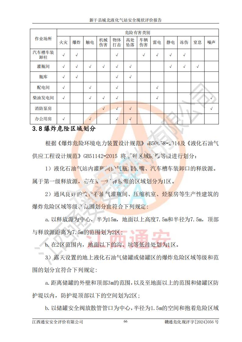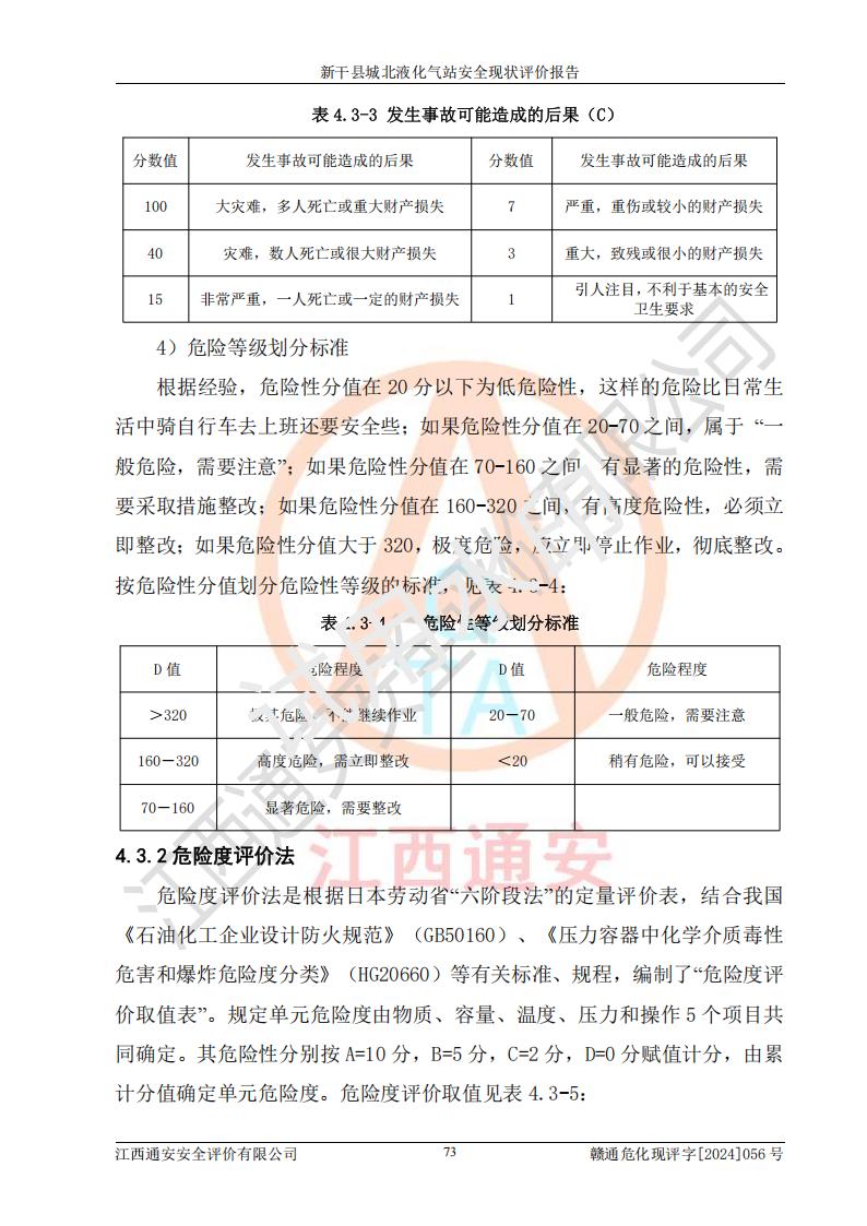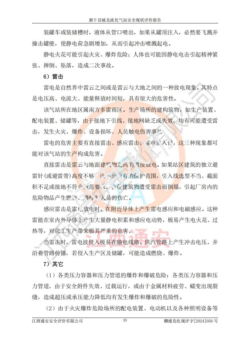 其它 | 在对该项目危险、有害因素辨识分析的基础上,运用安全检查表、预作业条件危险性分析法、危险度评价、重大事故后果分析结果等评价方法对该项目进行了分析评价,评价结果如下: 1、该项目位于江西省吉安市新干县金川北大道120号,符合当地规划,与周边环境的距离符合有关标准、规范的要求。 2、总图布置分区明确,布局合理,各建构筑物的防火间距满足规范要求。 3、该项目无**明令淘汰的工艺,设备、设施与工艺条件、内部介质相适应,特种设备及设施较齐全,按规定设置防雷、防静电接地,爆炸危险环境加油机按要求采用防爆型,符合相关标准规范要求。 5、企业设置了安全生产管理机构,配备了专职安全生产管理人员,建立了安全生产责任制和安全生产管理制度,编制了岗位操作规程,编制了生产安全事故应急预案,人员经过相应的培训,企业的安全生产管理正常。 6、作业条件危险性评价结果:在选定的评价单元中,作业危险程度均为“一般危险,需要注意”,作业条件相对安全。 7、危险度评价结果:储罐区和槽车装卸区危险度为Ⅰ级,属**危险;烃泵房、压缩机房、灌瓶间和瓶库危险度为Ⅱ级,属中度危险。 评价结论: 新干县城北液化气站的安全设施、公用工程、辅助设施以及安全管理等符合**及有关部门关于安全生产法律、法规、标准的要求,安全风险是受控制的,其风险程度是可以接受的,符合安全生产条件,能够满足安全生产的要求。 | ||||