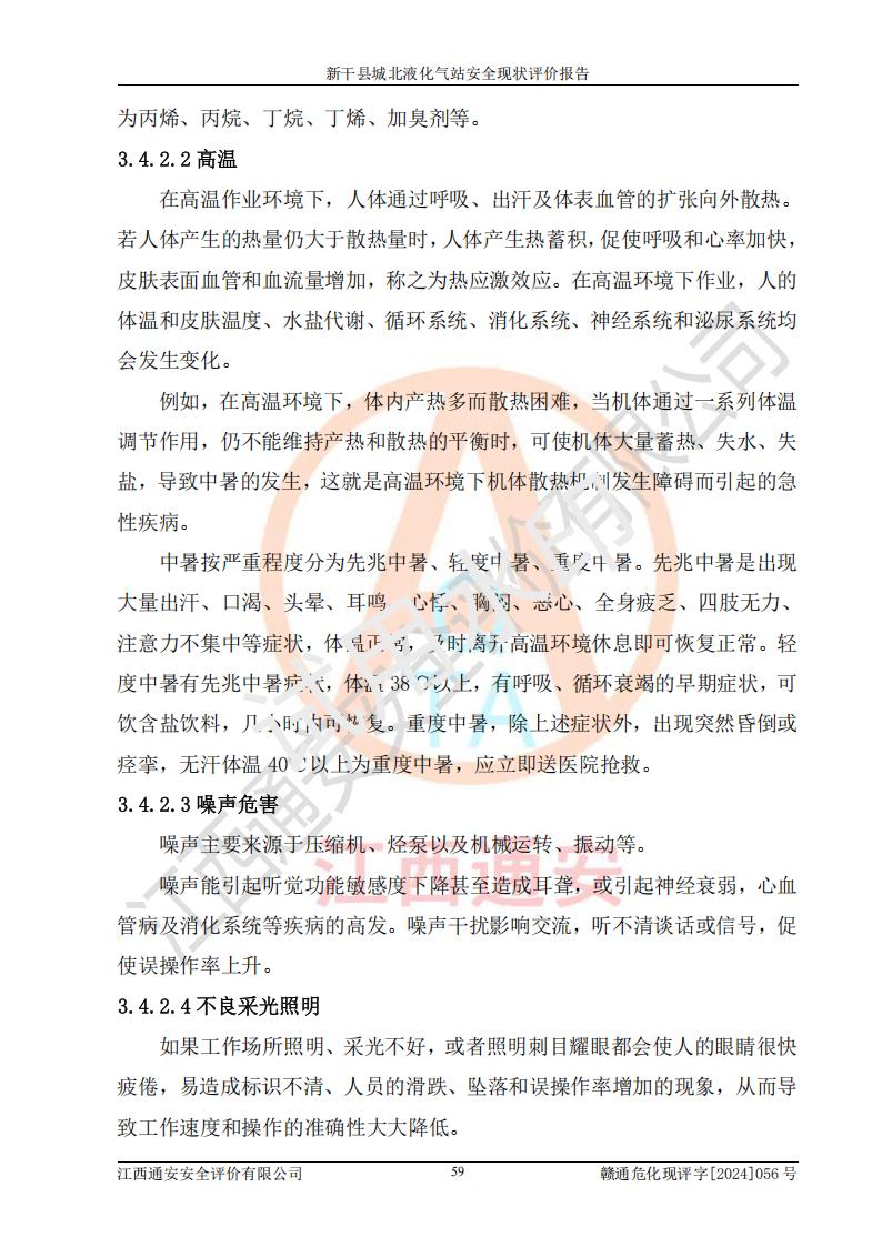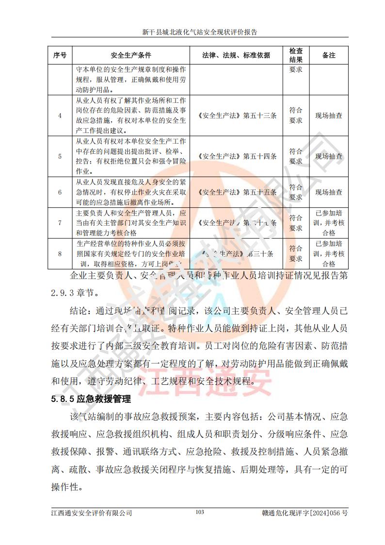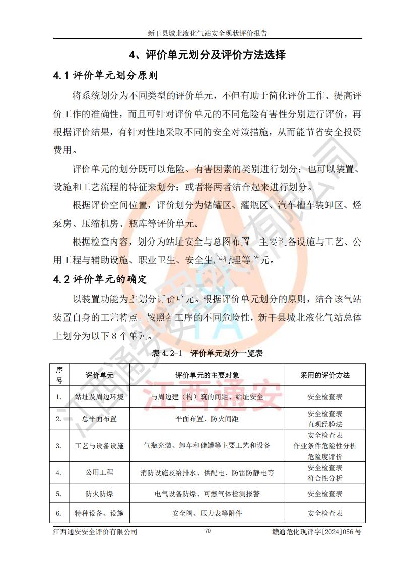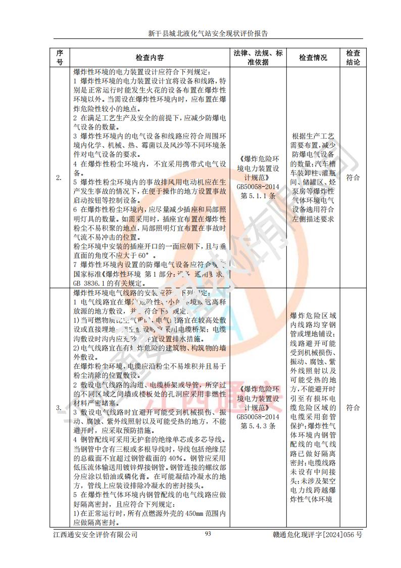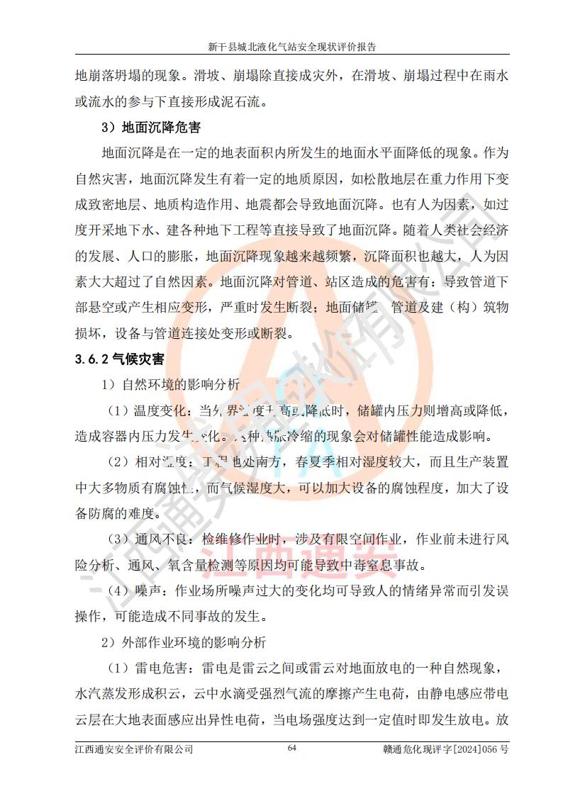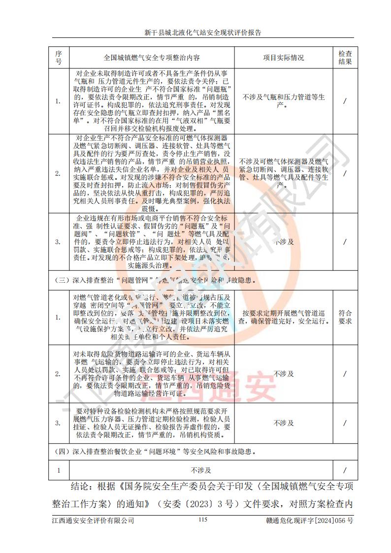 其它 | 在对该项目危险、有害因素辨识分析的基础上,运用安全检查表、预作业条件危险性分析法、危险度评价、重大事故后果分析结果等评价方法对该项目进行了分析评价,评价结果如下: 1、该项目位于江西省吉安市新干县金川北大道120号,符合当地规划,与周边环境的距离符合有关标准、规范的要求。 2、总图布置分区明确,布局合理,各建构筑物的防火间距满足规范要求。 3、该项目无**明令淘汰的工艺,设备、设施与工艺条件、内部介质相适应,特种设备及设施较齐全,按规定设置防雷、防静电接地,爆炸危险环境加油机按要求采用防爆型,符合相关标准规范要求。 5、企业设置了安全生产管理机构,配备了专职安全生产管理人员,建立了安全生产责任制和安全生产管理制度,编制了岗位操作规程,编制了生产安全事故应急预案,人员经过相应的培训,企业的安全生产管理正常。 6、作业条件危险性评价结果:在选定的评价单元中,作业危险程度均为“一般危险,需要注意”,作业条件相对安全。 7、危险度评价结果:储罐区和槽车装卸区危险度为Ⅰ级,属**危险;烃泵房、压缩机房、灌瓶间和瓶库危险度为Ⅱ级,属中度危险。 评价结论: 新干县城北液化气站的安全设施、公用工程、辅助设施以及安全管理等符合**及有关部门关于安全生产法律、法规、标准的要求,安全风险是受控制的,其风险程度是可以接受的,符合安全生产条件,能够满足安全生产的要求。 | ||||