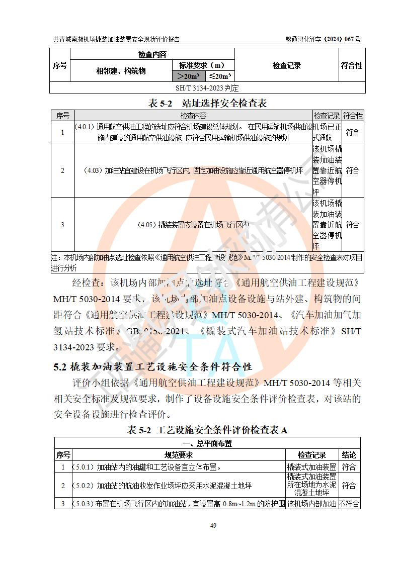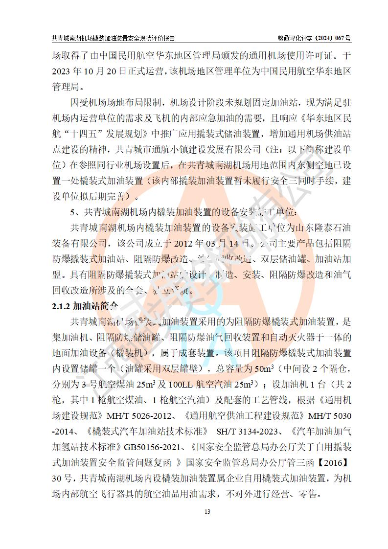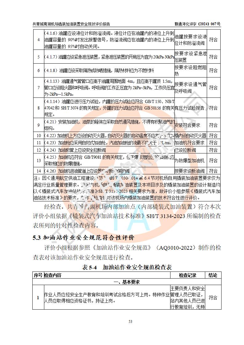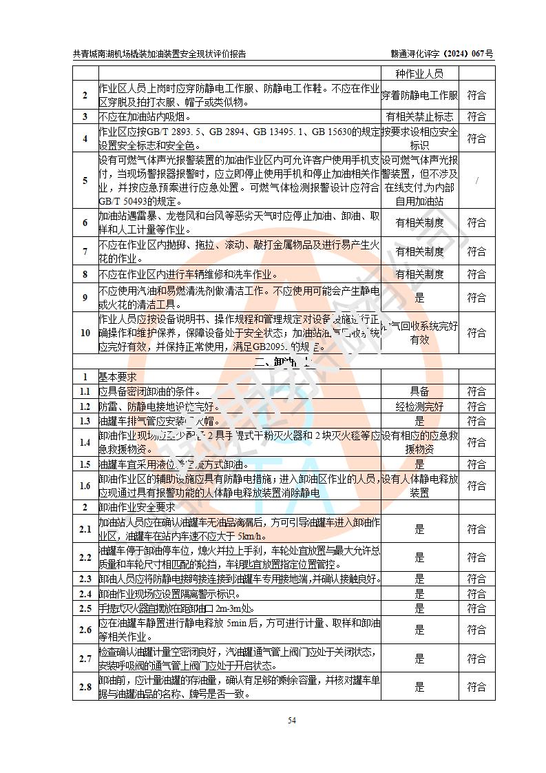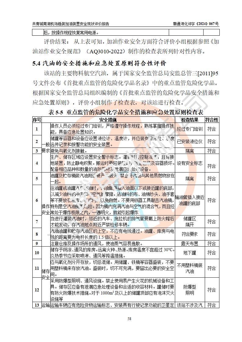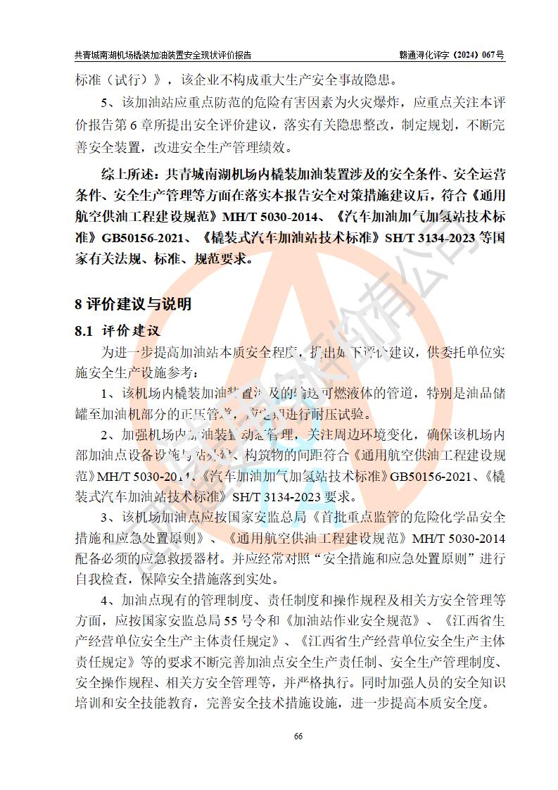 评价结论 | 九共青城南湖机场内橇装加油装置涉及的安全条件、安全运营条件、安全生产管理等方面在落实本报告安全对策措施建议后,符合《通用航空供油工程建设规范》MH/T 5030-2014、《汽车加油加气加氢站技术标准》GB50156-2021、《橇装式汽车加油站技术标准》SH/T 3134-2023等**有关法规、标准、规范要求。 | |||